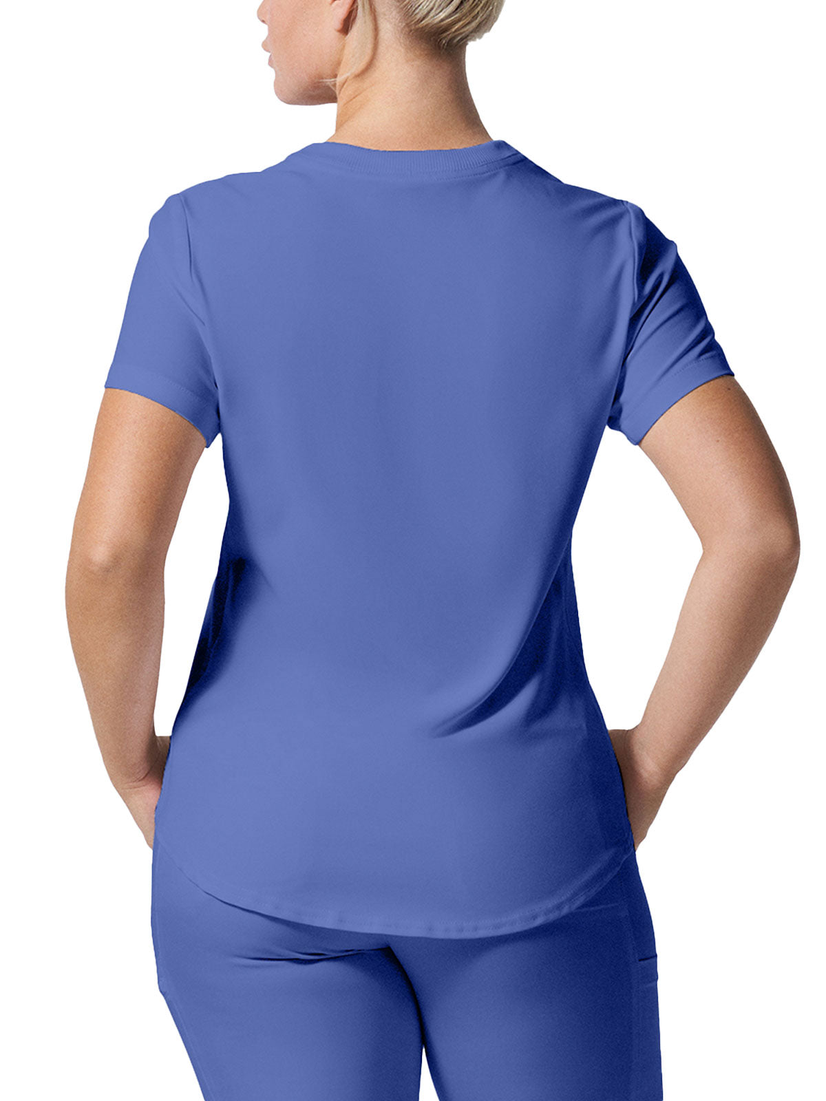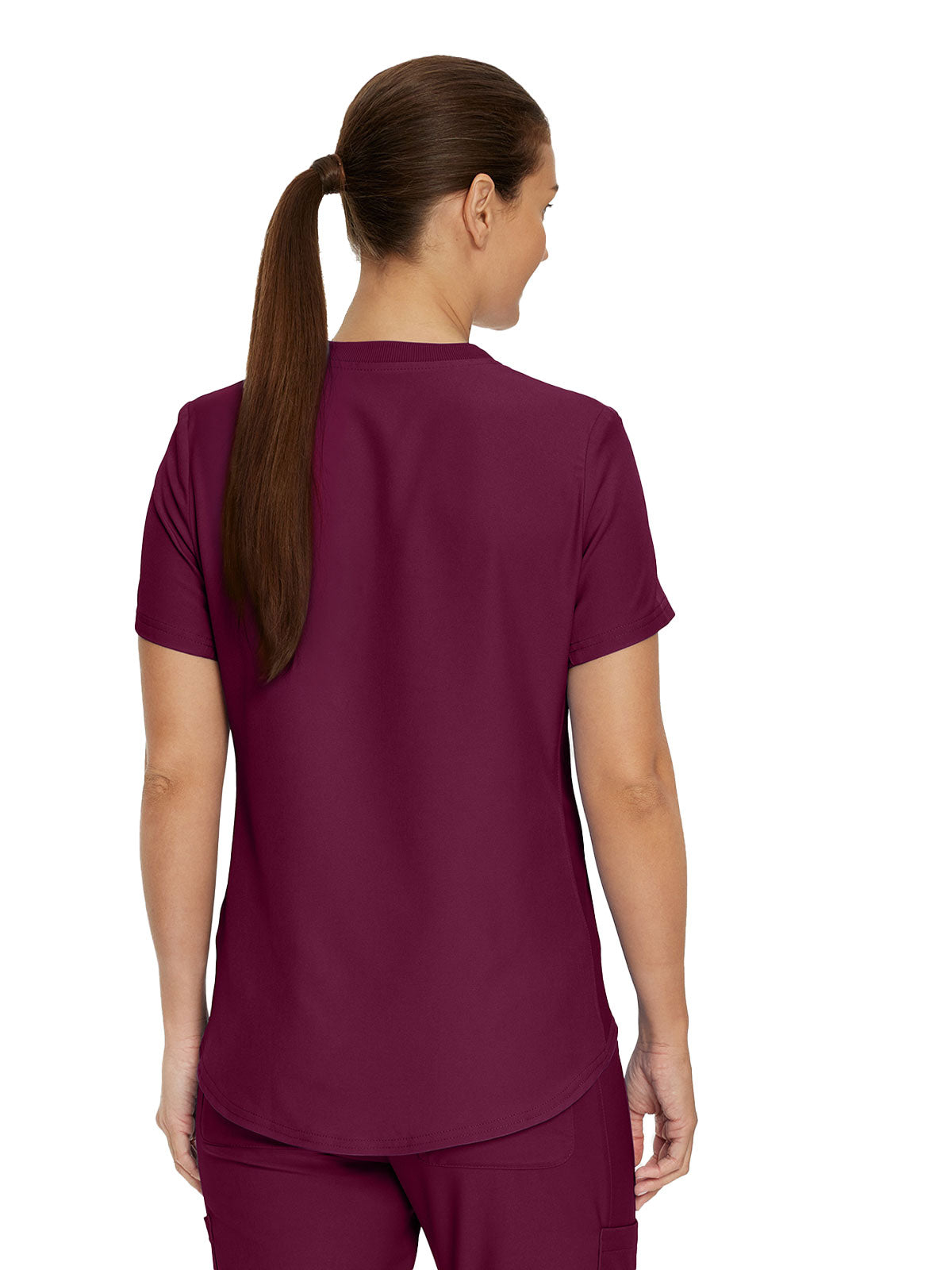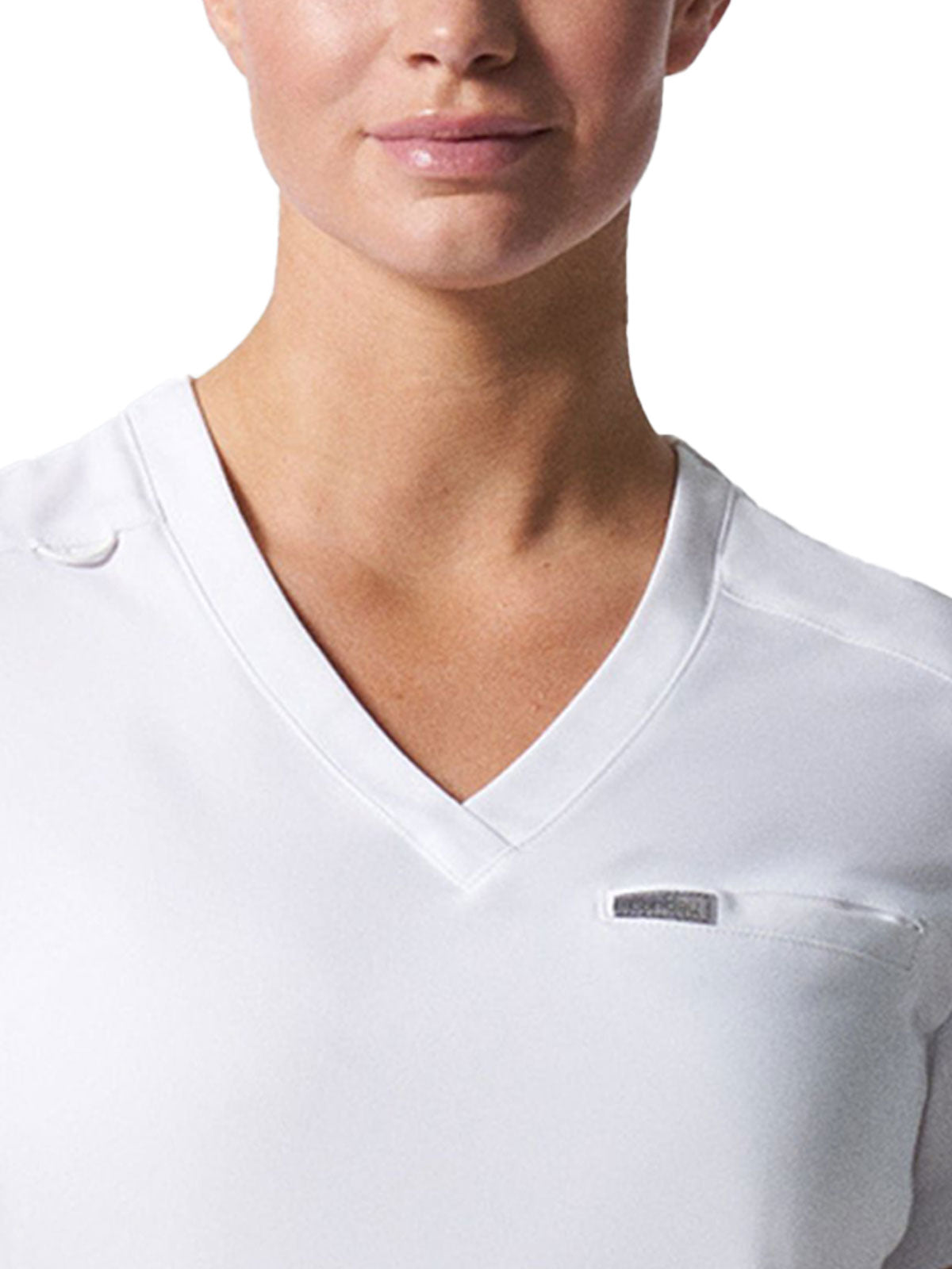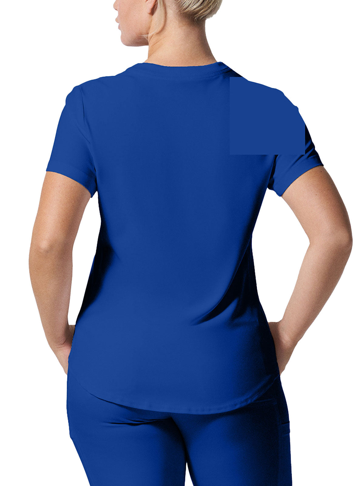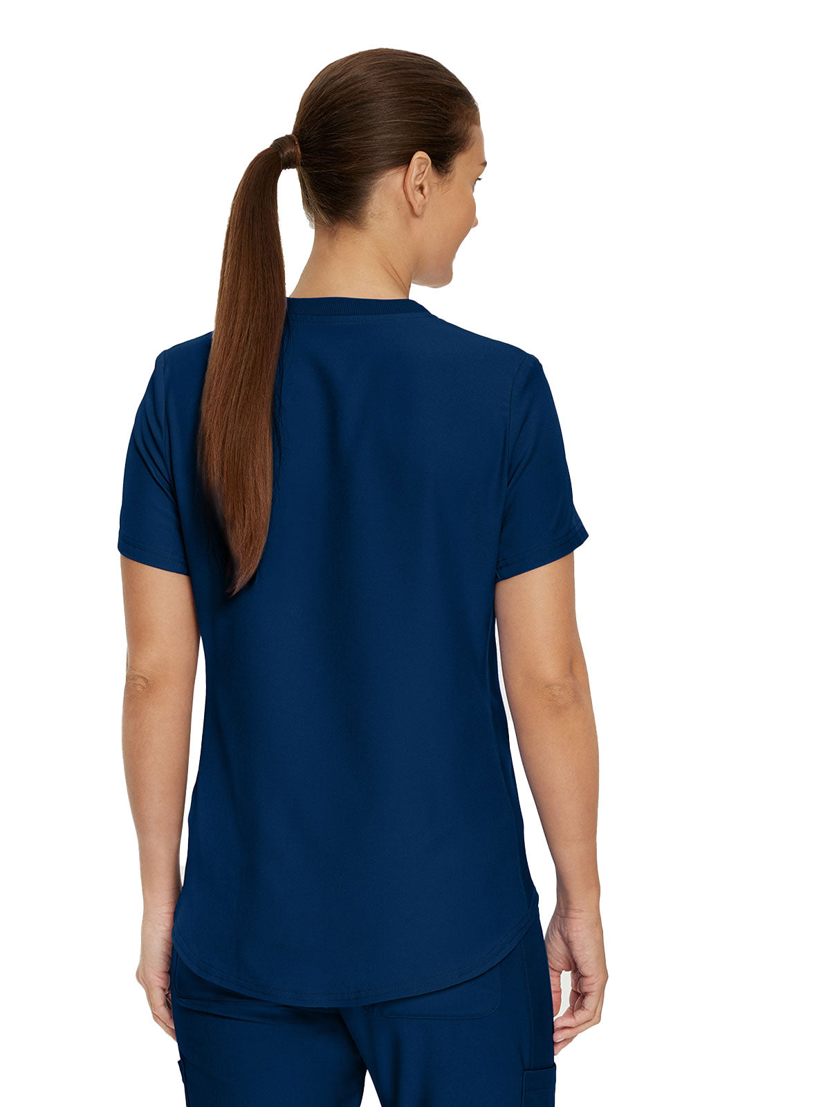 This modern fit scrub top features a soft rib-knit back neckband and rib-knit side panels for a comfortable and sleek fit. With a front welt chest pocket and right front zip security pocket, this top is the definition of a high-functioning style. Our modern tailored fit flatters your shape, while our moisture-wicking super stretch fabric provides the comfort and flexibility your work requires throughout the day.