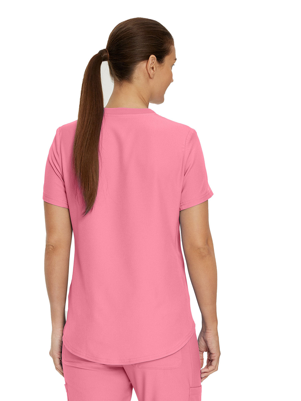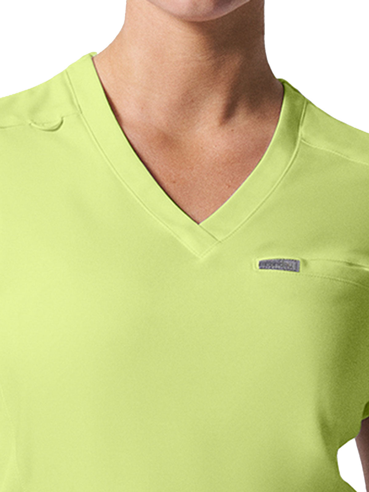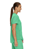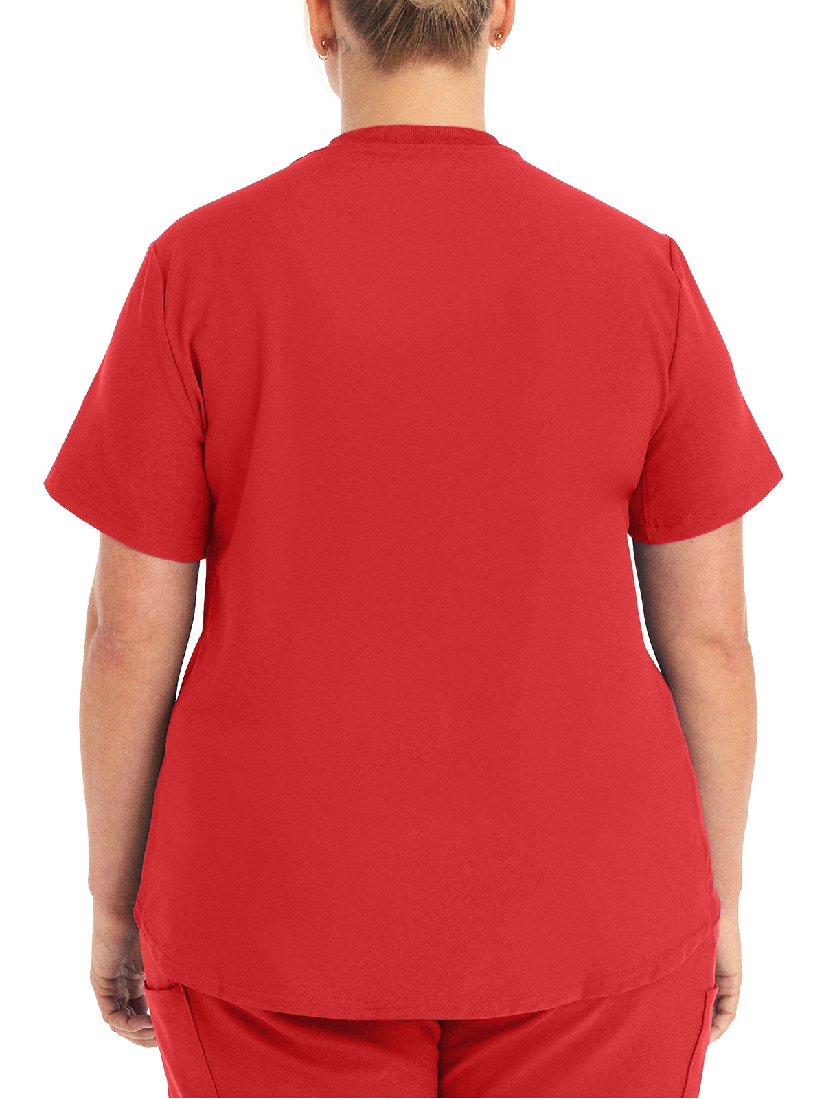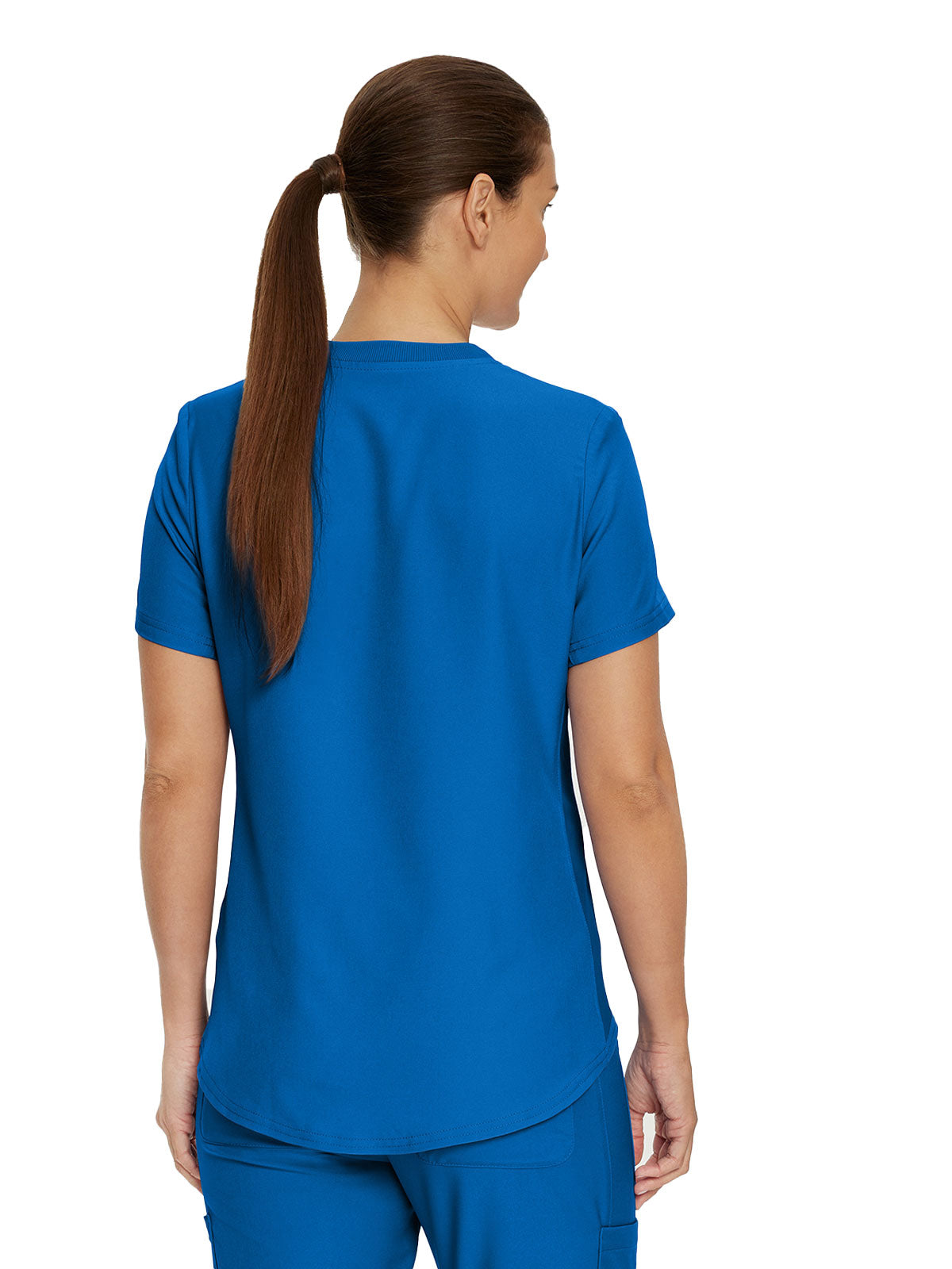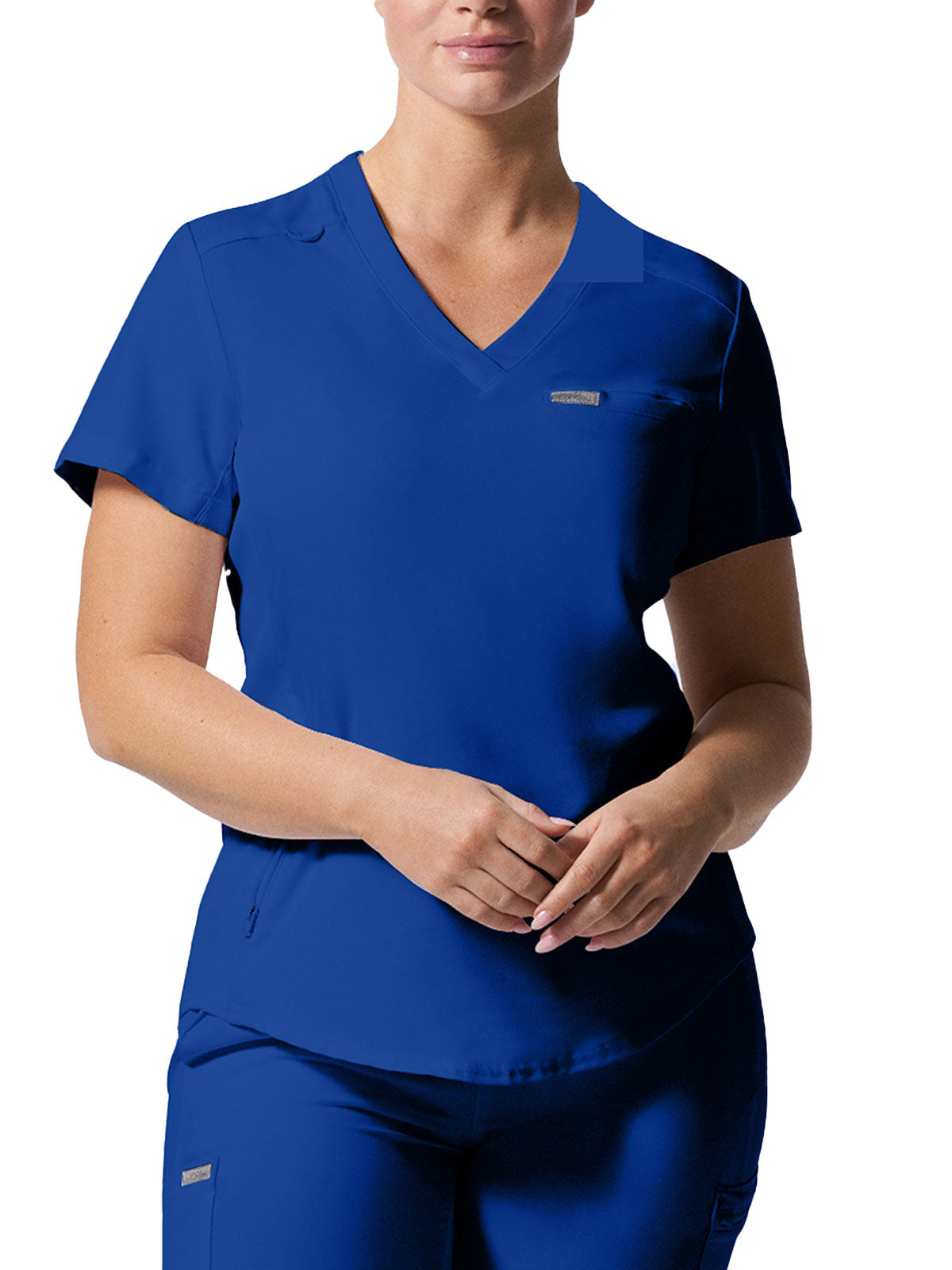 This modern fit scrub top features a soft rib-knit back neckband and rib-knit side panels for a comfortable and sleek fit. With a front welt chest pocket and right front zip security pocket, this top is the definition of a high-functioning style. Our modern tailored fit flatters your shape, while our moisture-wicking super stretch fabric provides the comfort and flexibility your work requires throughout the day.