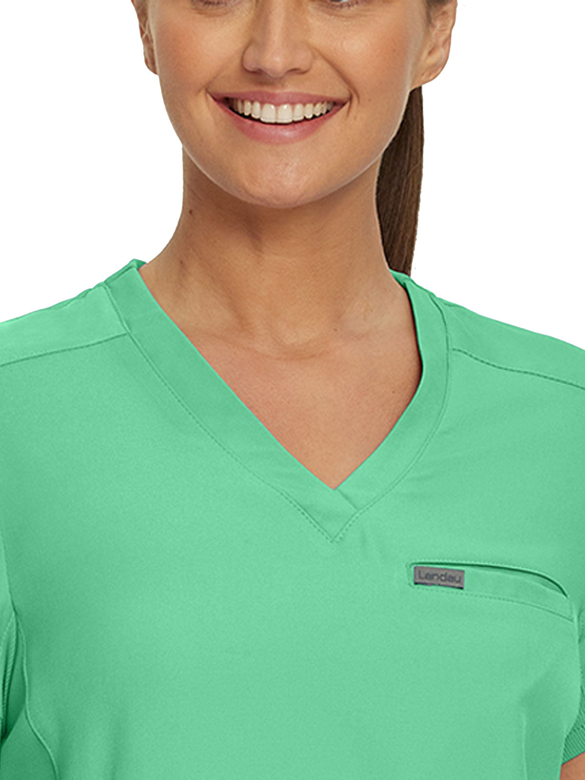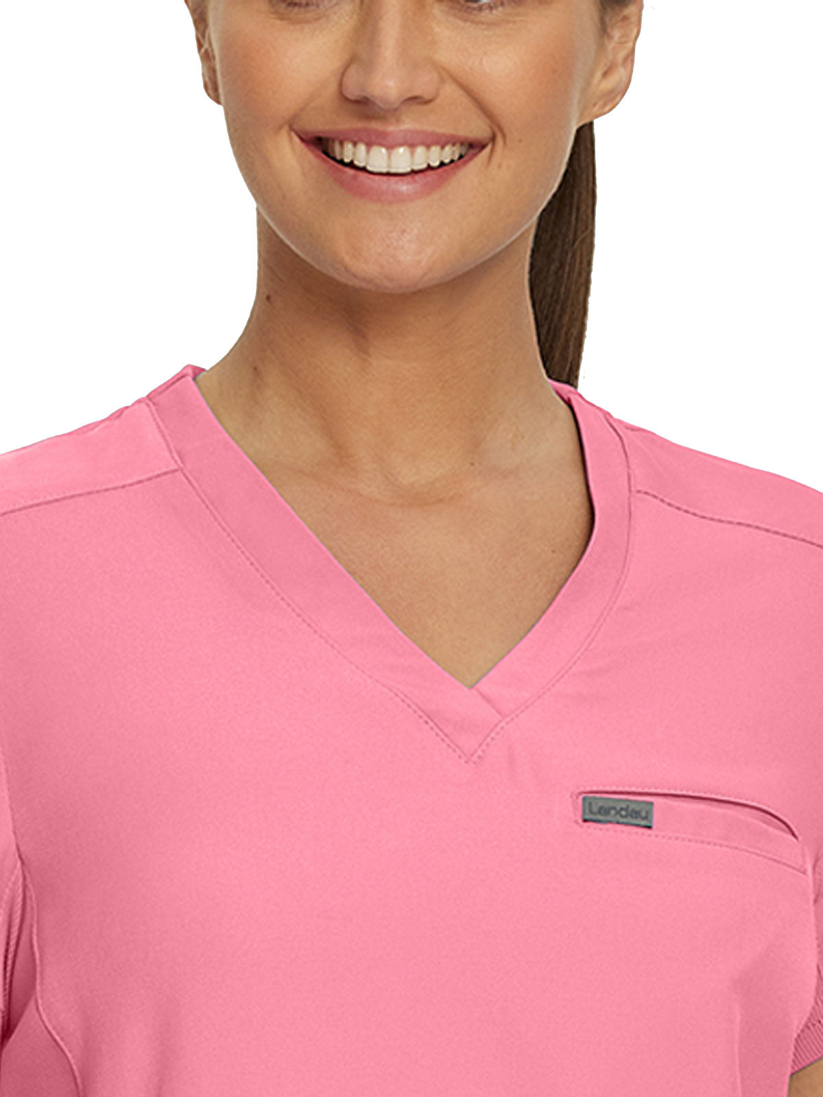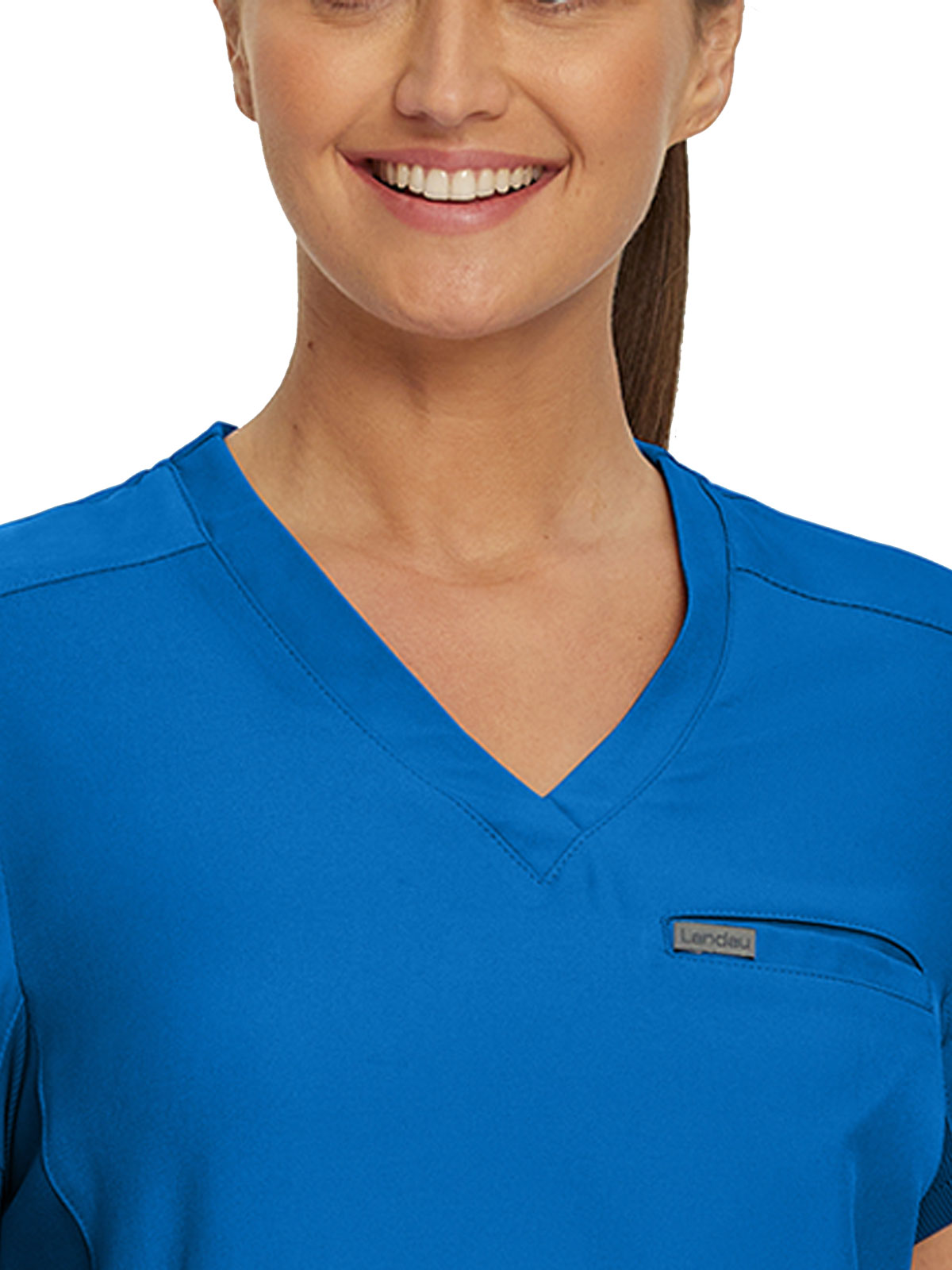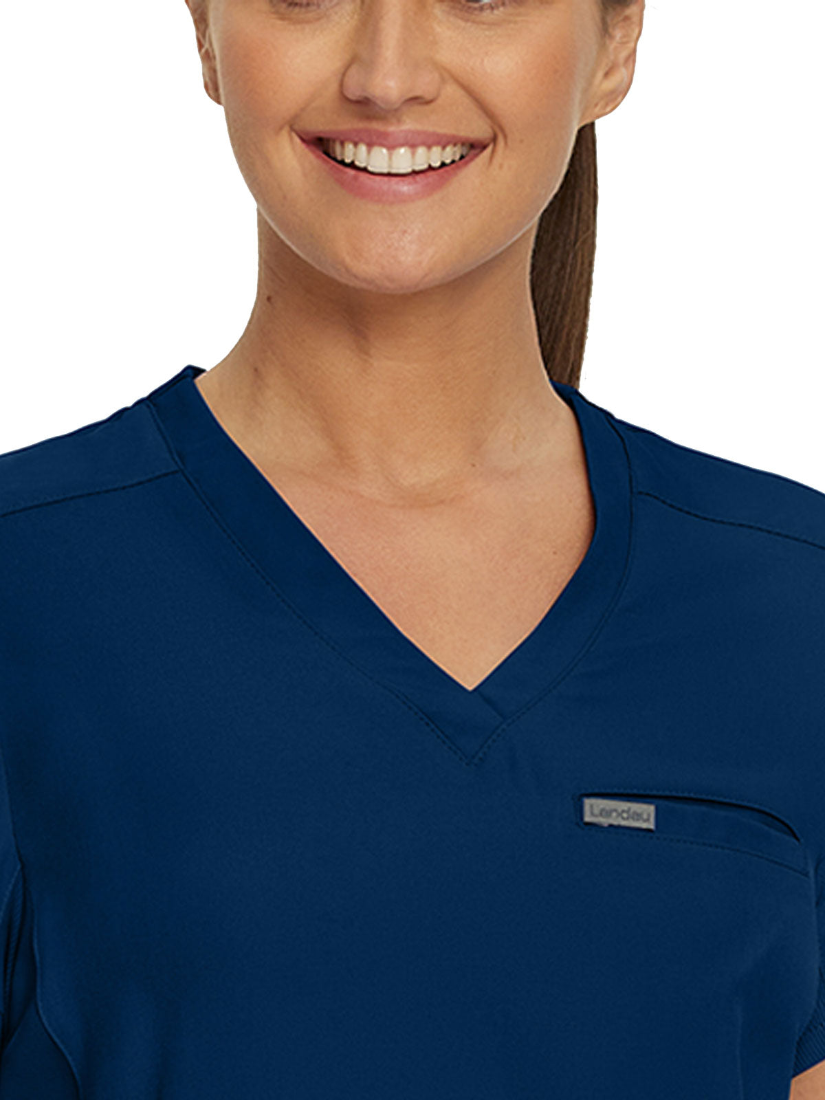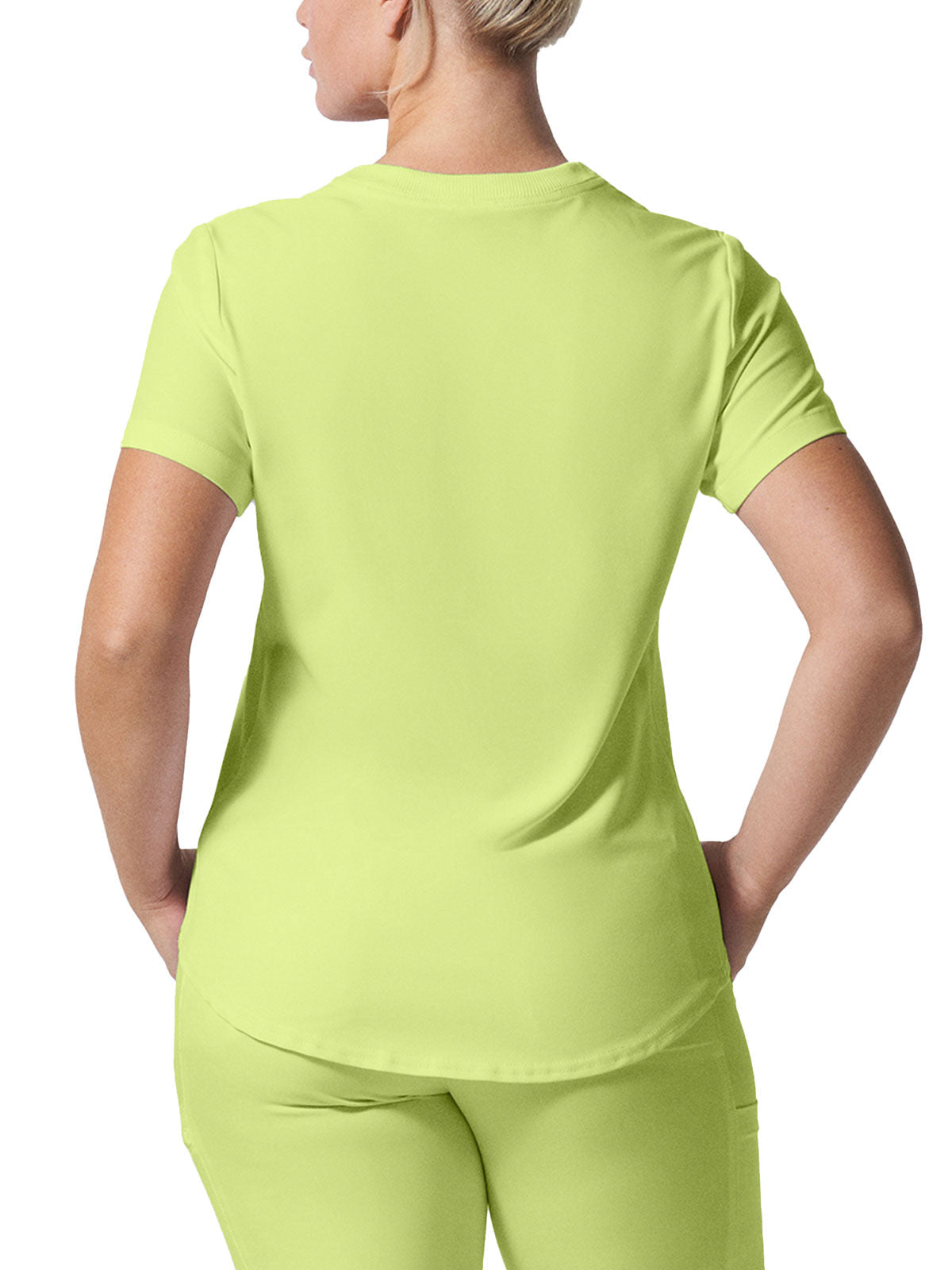 This modern fit scrub top features a soft rib-knit back neckband and rib-knit side panels for a comfortable and sleek fit. With a front welt chest pocket and right front zip security pocket, this top is the definition of a high-functioning style. Our modern tailored fit flatters your shape, while our moisture-wicking super stretch fabric provides the comfort and flexibility your work requires throughout the day.