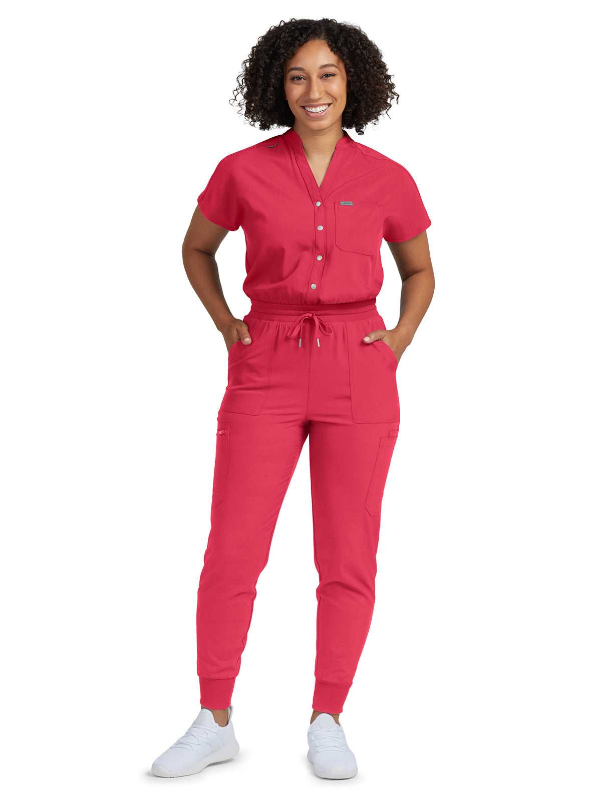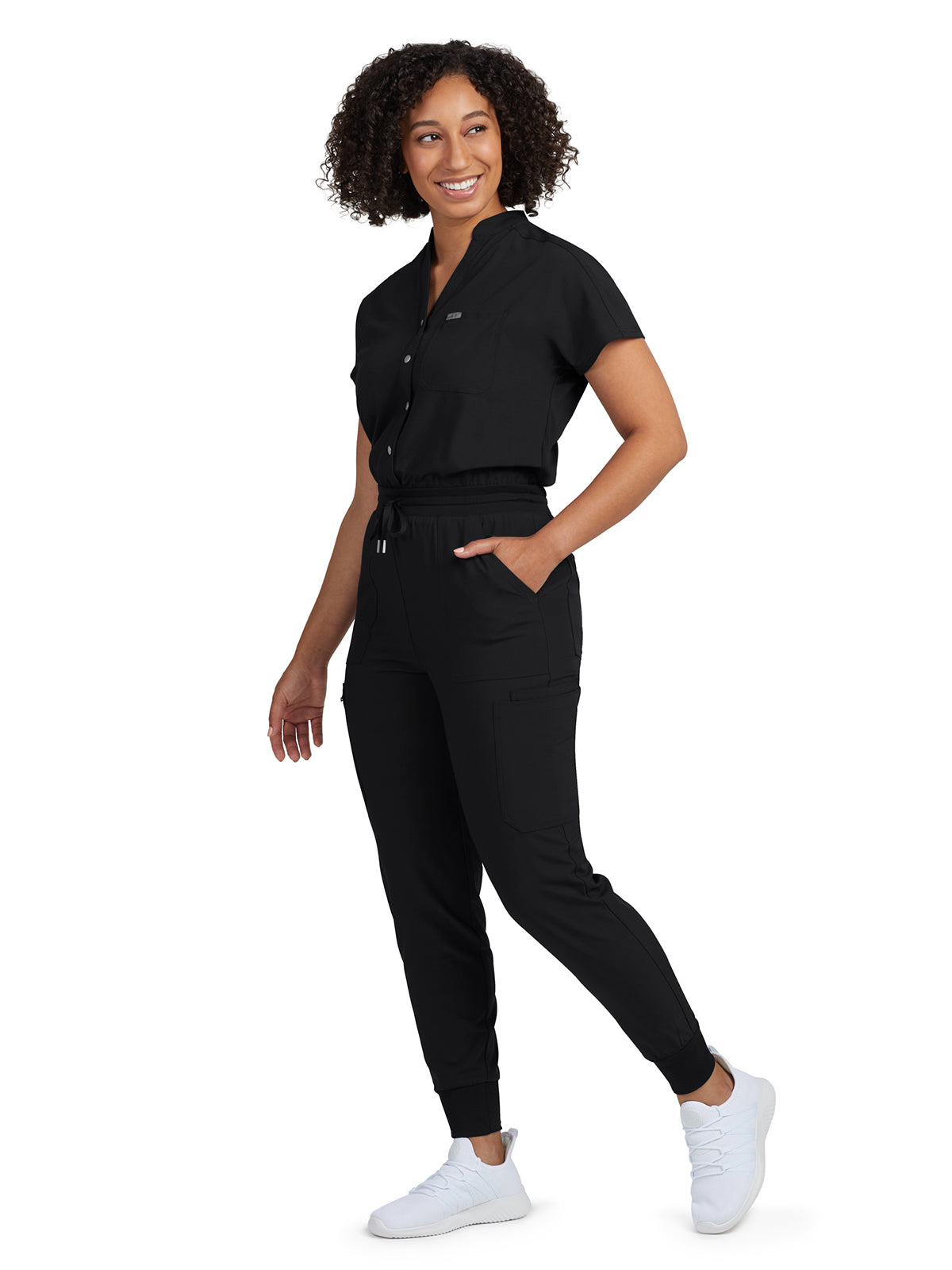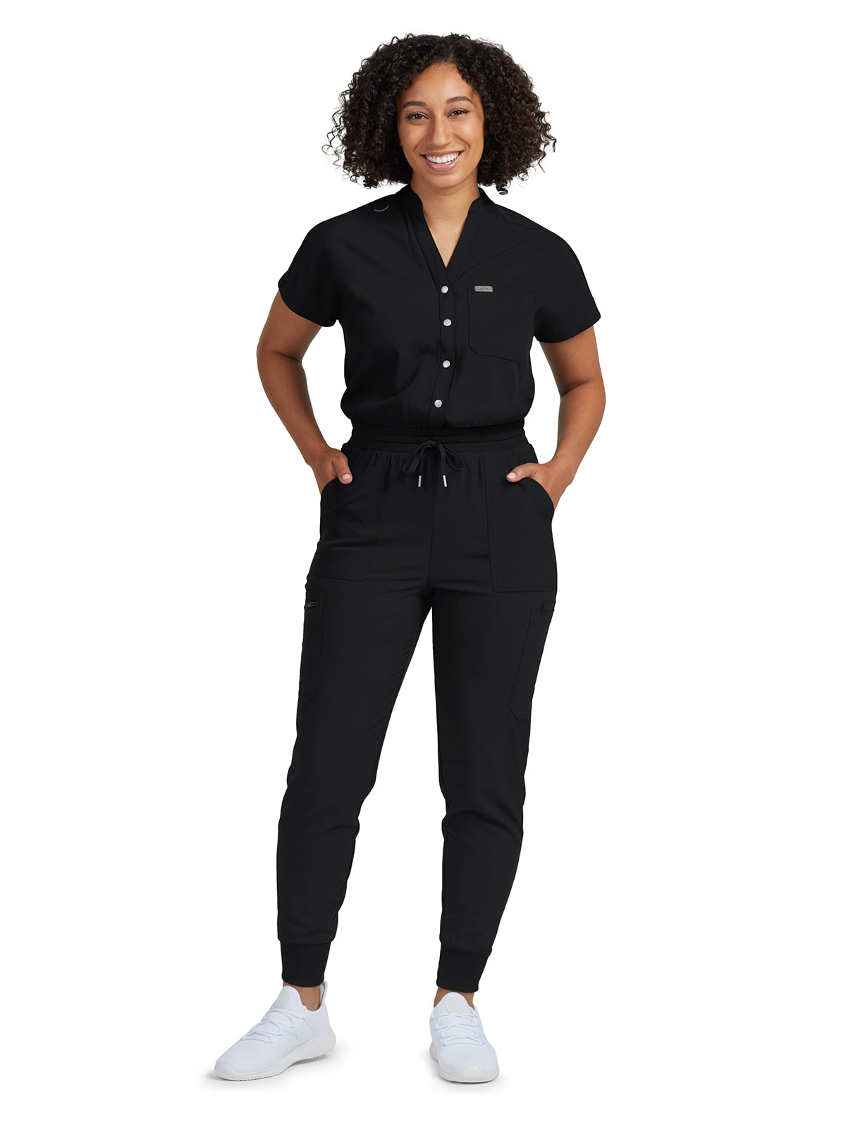 Check out this contemporary jumpsuit that offers maximum comfort and functionality. It features a mix of media, with a snap front opening and soft rib-knit back panel, waistband, and cuffs, along with eight pockets to keep all your essentials handy. Plus, there's even a badge loop on the right shoulder for easy ID access. Perfect for upgrading your work wardrobe in style.