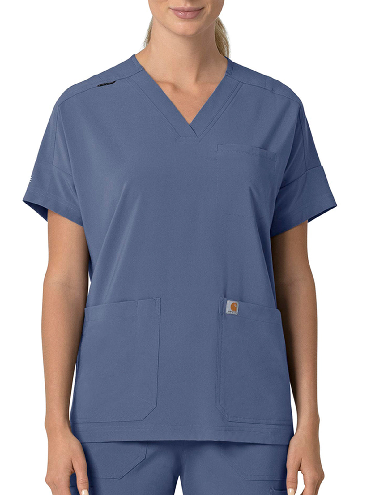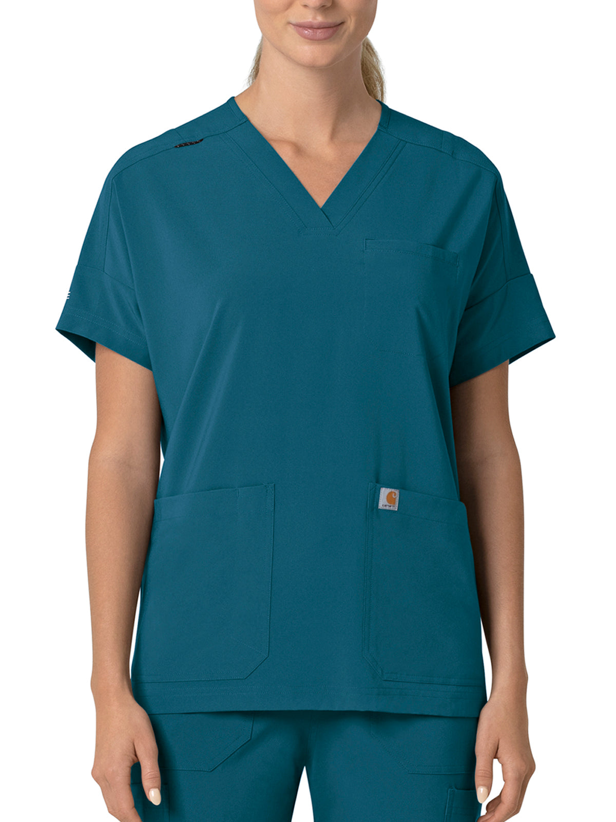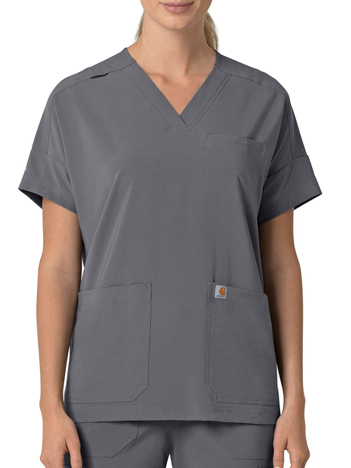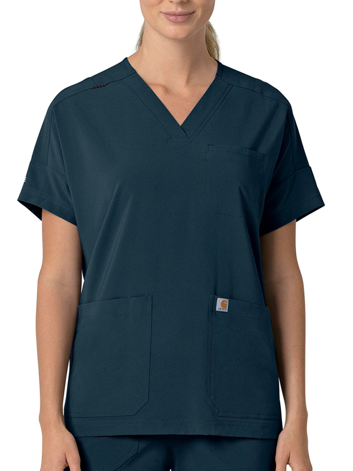 Upgrade your wardrobe with Carhartt's Women's Oversized V-Neck Scrub Top. It features pockets for functionality and moisture-wicking fabric that keeps you cool and dry all day long.