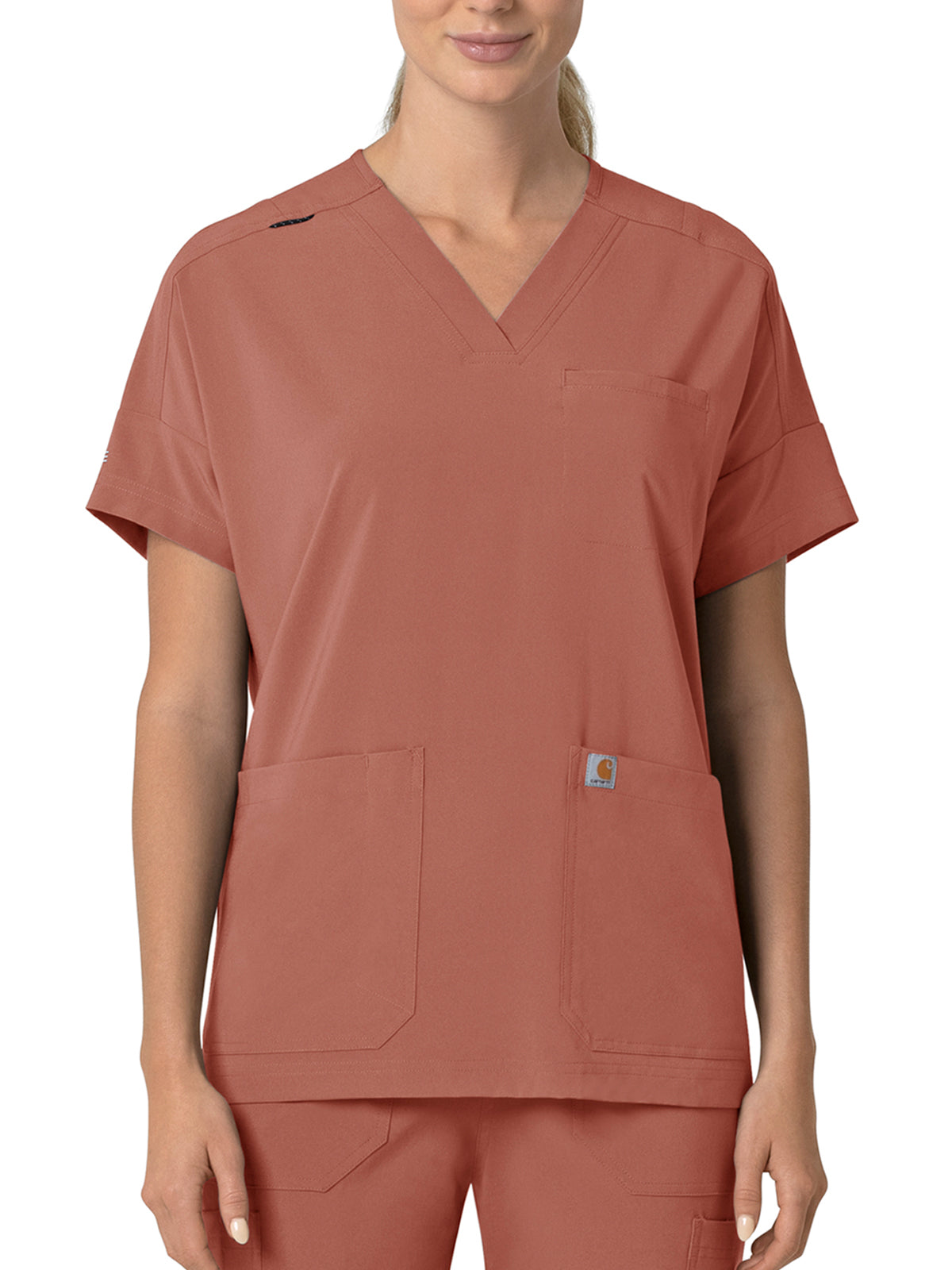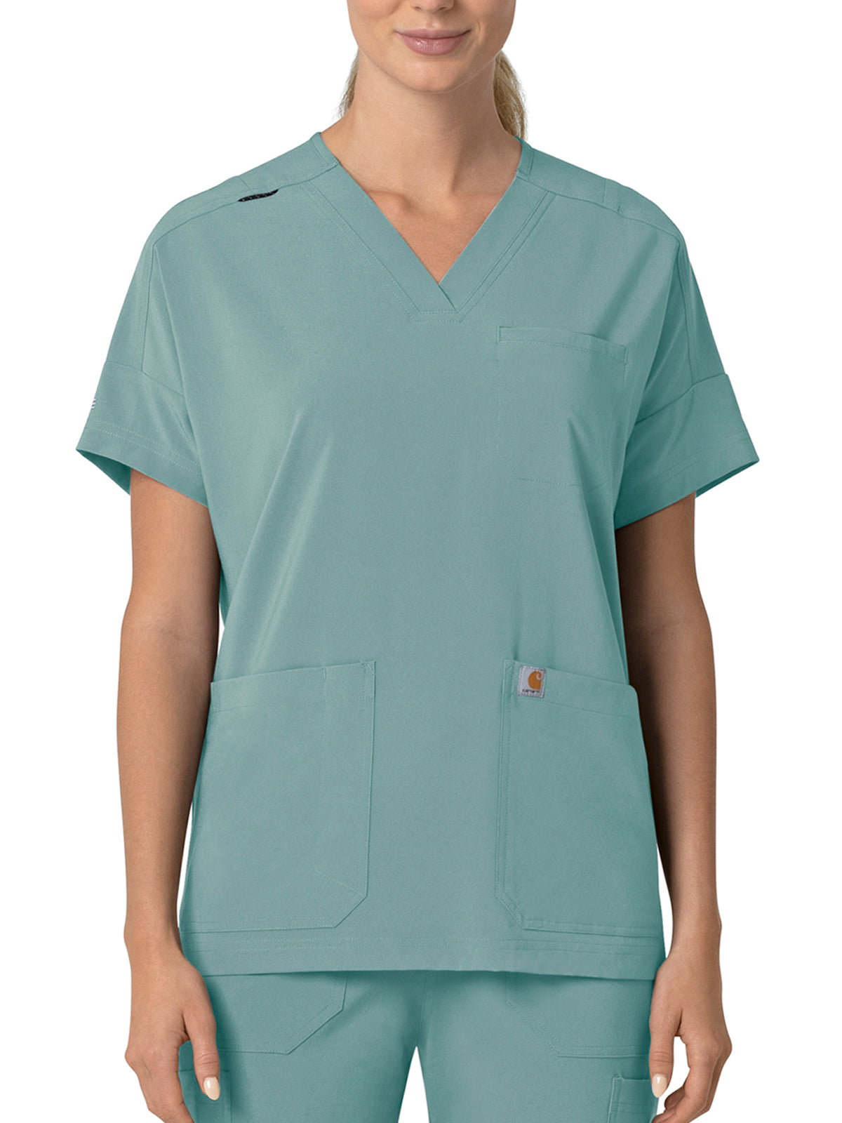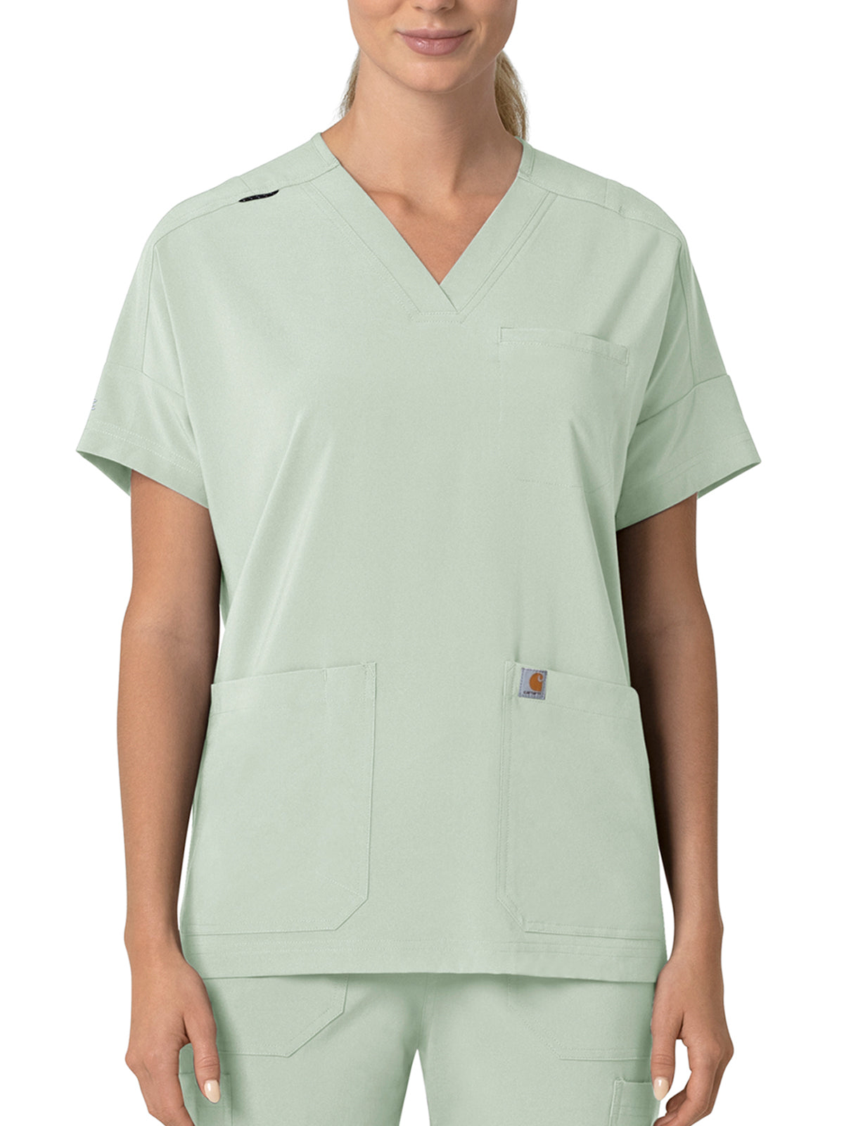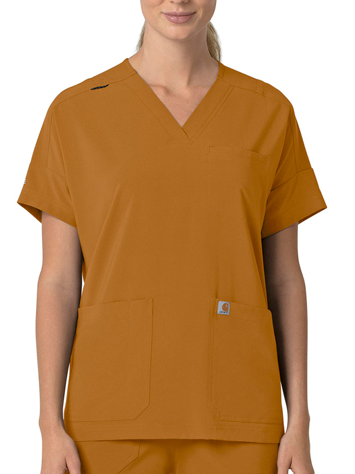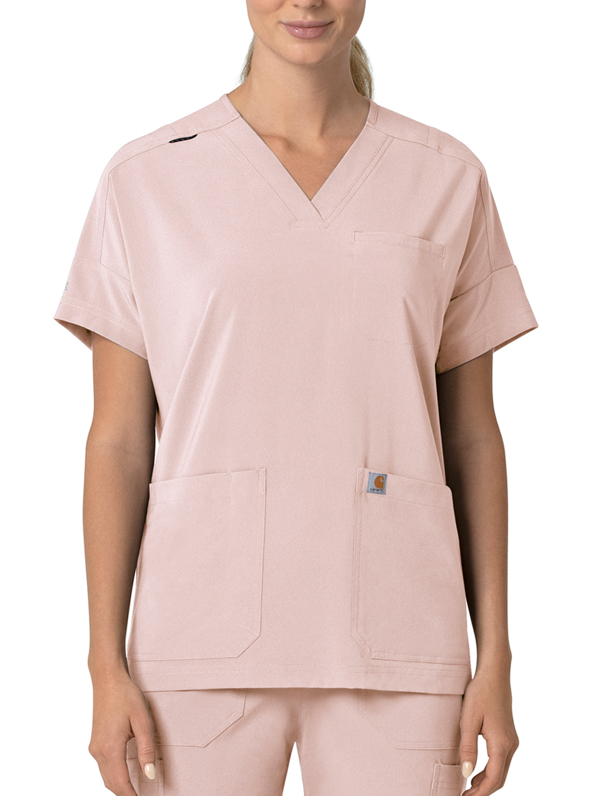 Upgrade your wardrobe with Carhartt's Women's Oversized V-Neck Scrub Top. It features pockets for functionality and moisture-wicking fabric that keeps you cool and dry all day long.