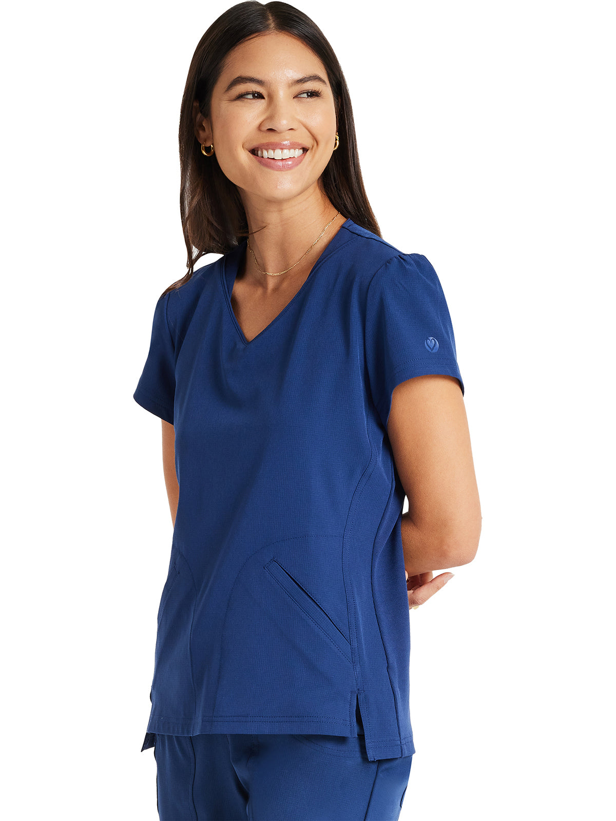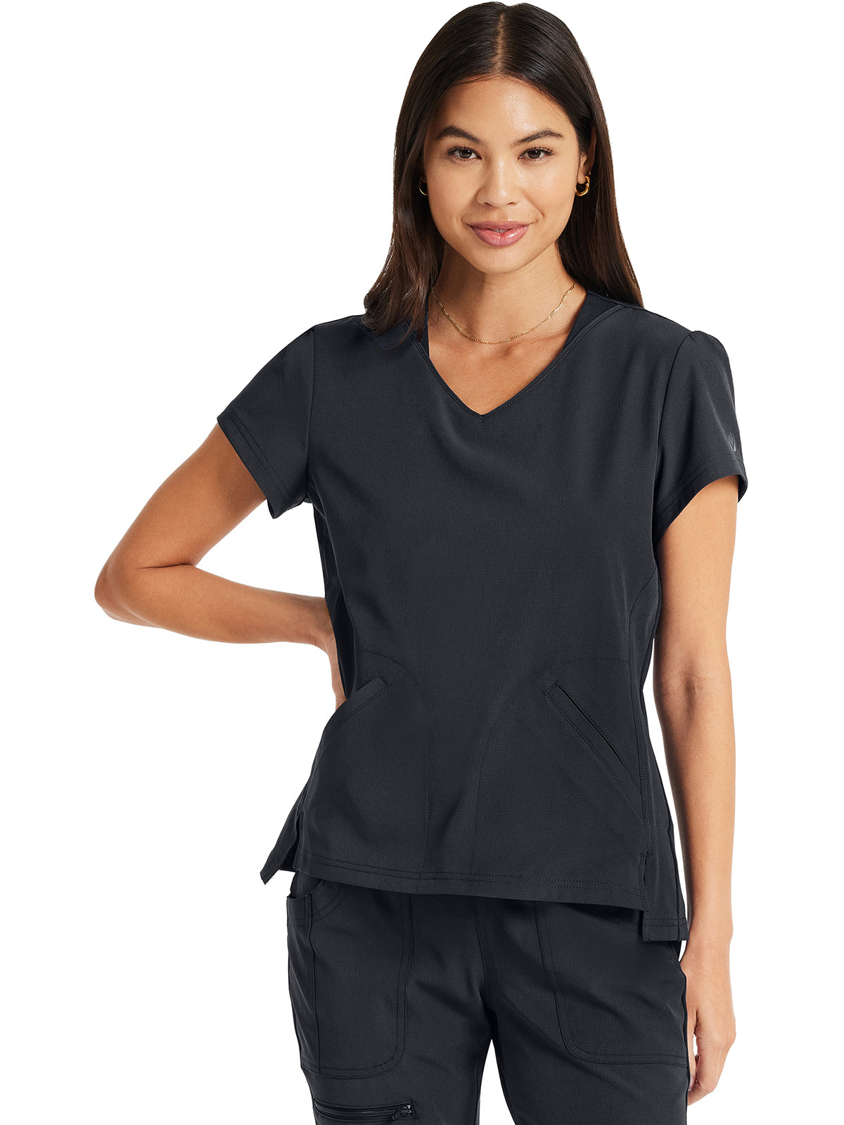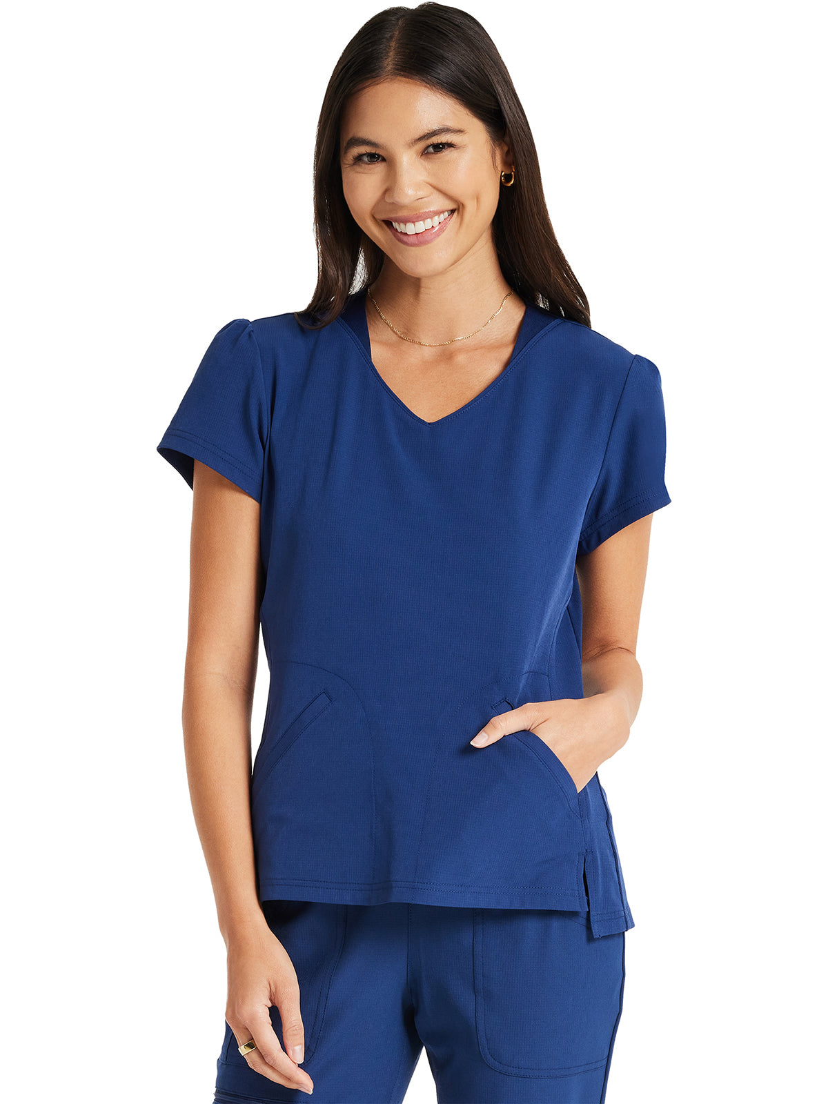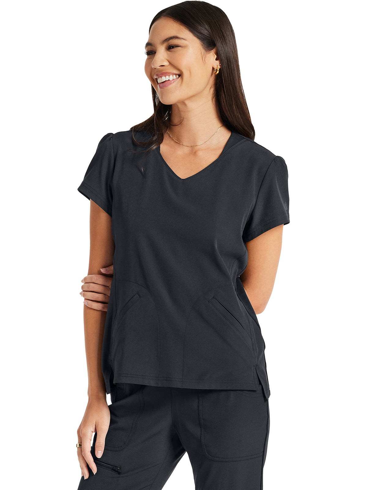Pretty and feminine, this scrub top has a rounded v-shaped neckline with tonal rib-knit trim, puff sleeves, and a high-low hem. Front and back princess seams provide fit and shaping while tonal rib-knit back panels add stretch. There are two welt pockets with angled entry for storage. Front vents for ease of movement. Junior fit. Center back length: 25"