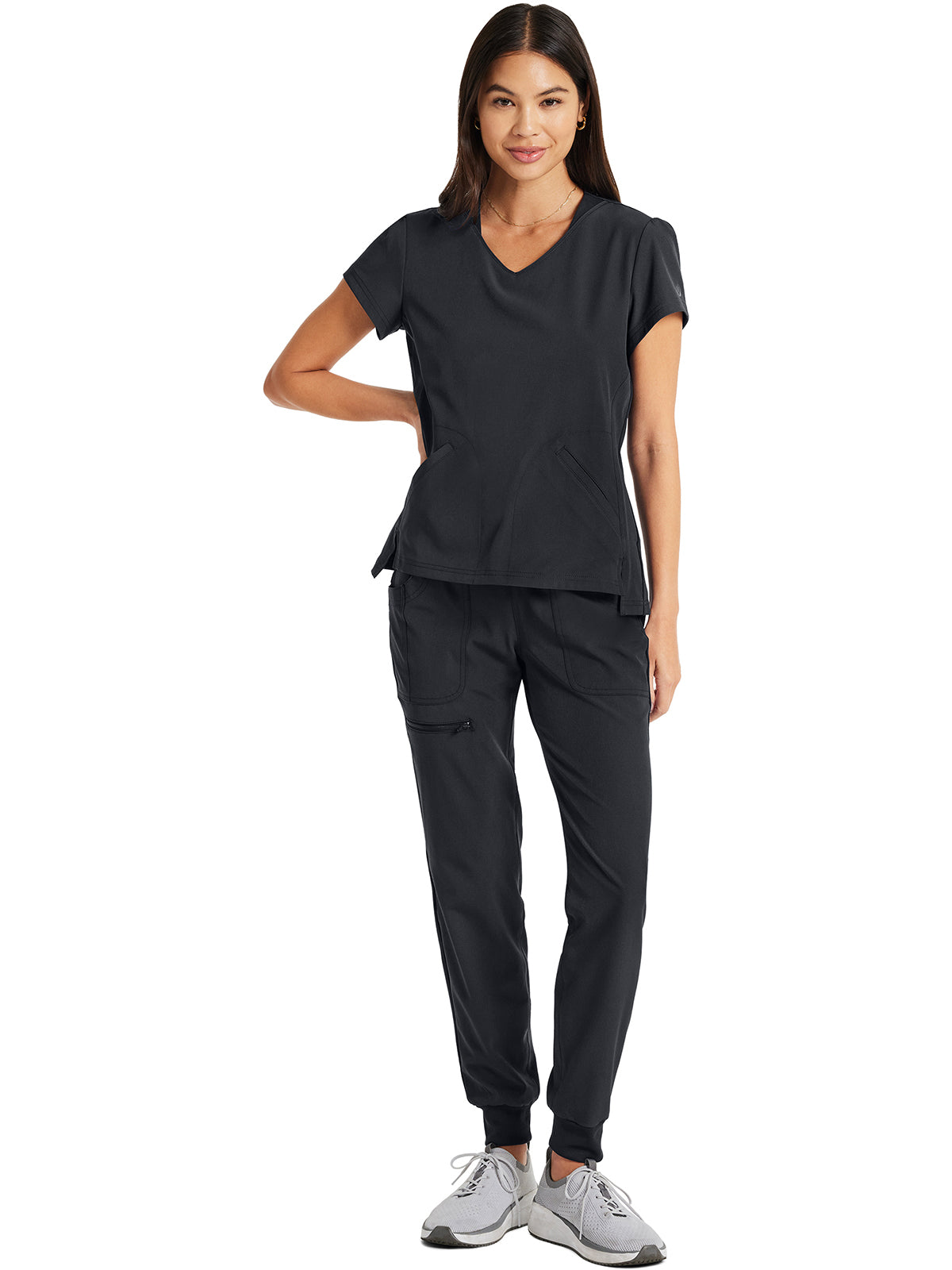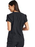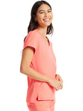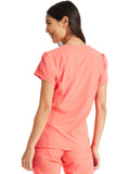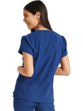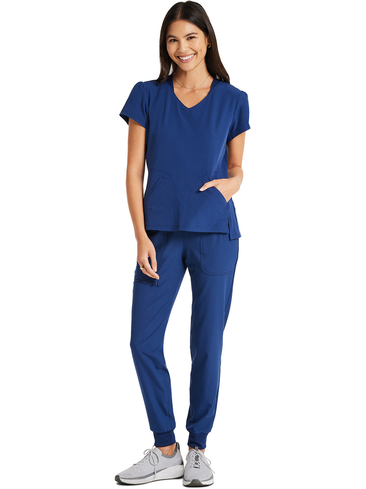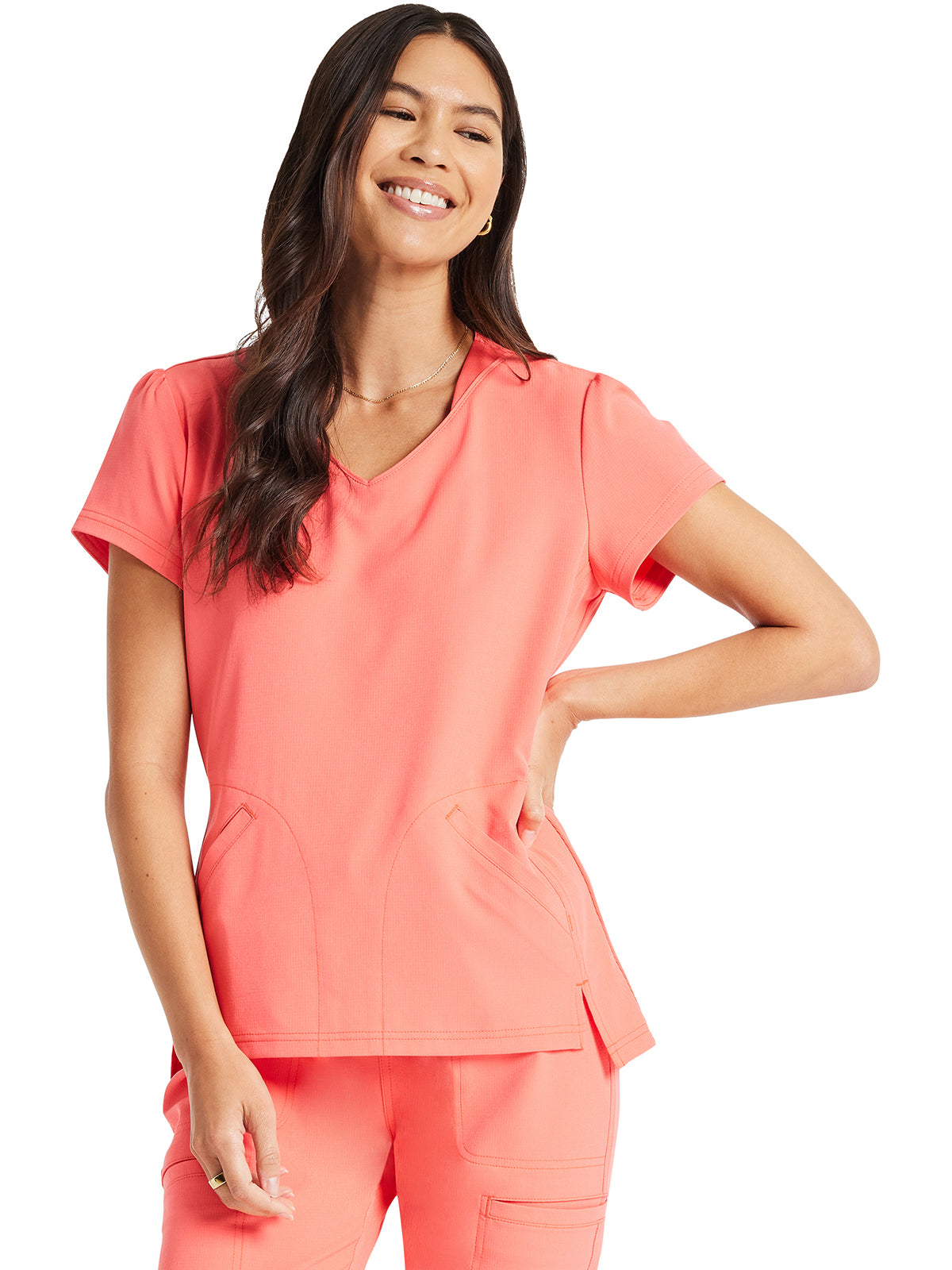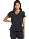 Pretty and feminine, this scrub top has a rounded v-shaped neckline with tonal rib-knit trim, puff sleeves, and a high-low hem. Front and back princess seams provide fit and shaping while tonal rib-knit back panels add stretch. There are two welt pockets with angled entry for storage. Front vents for ease of movement. Junior fit. Center back length: 25"