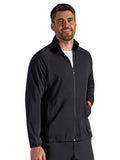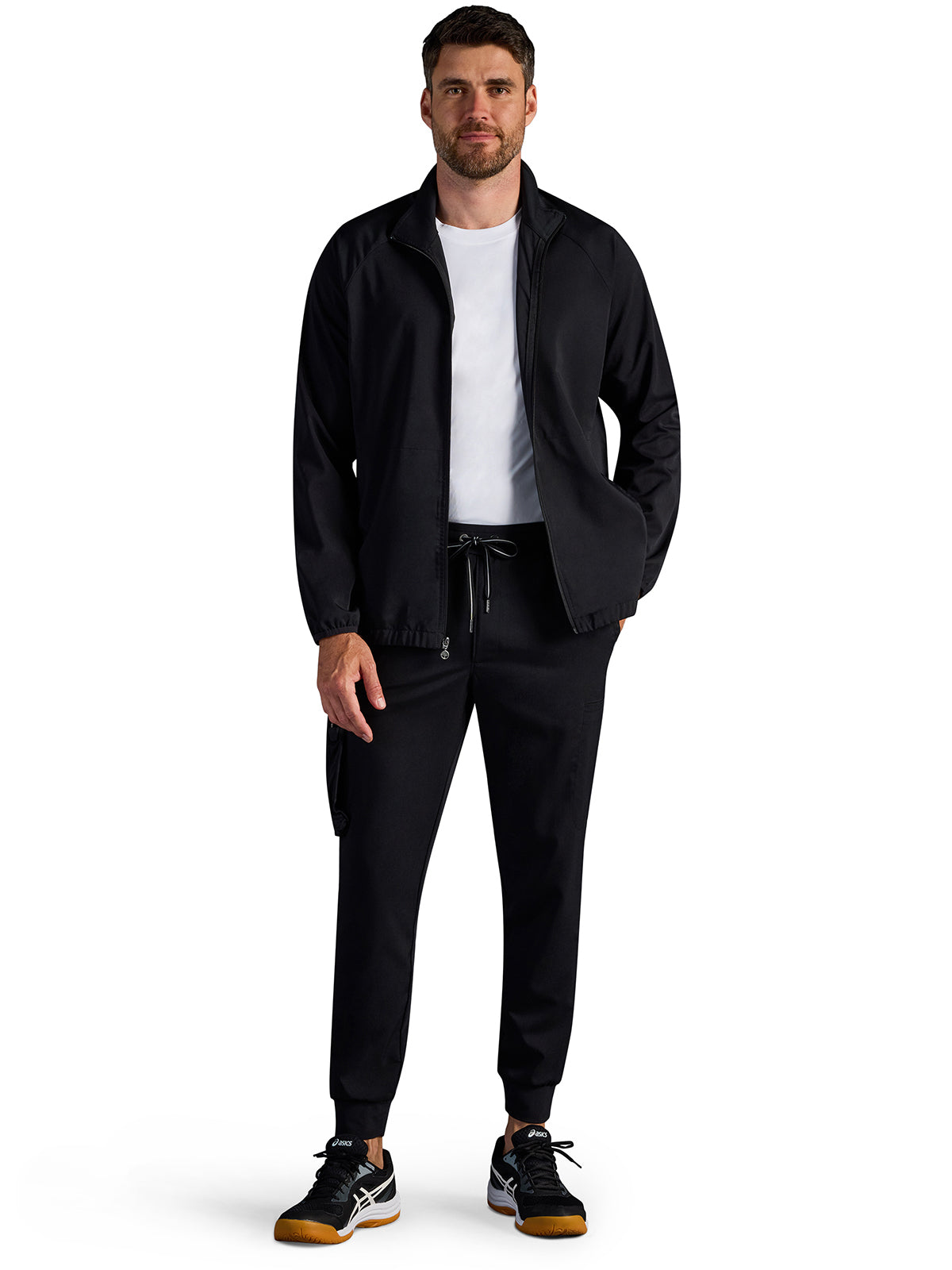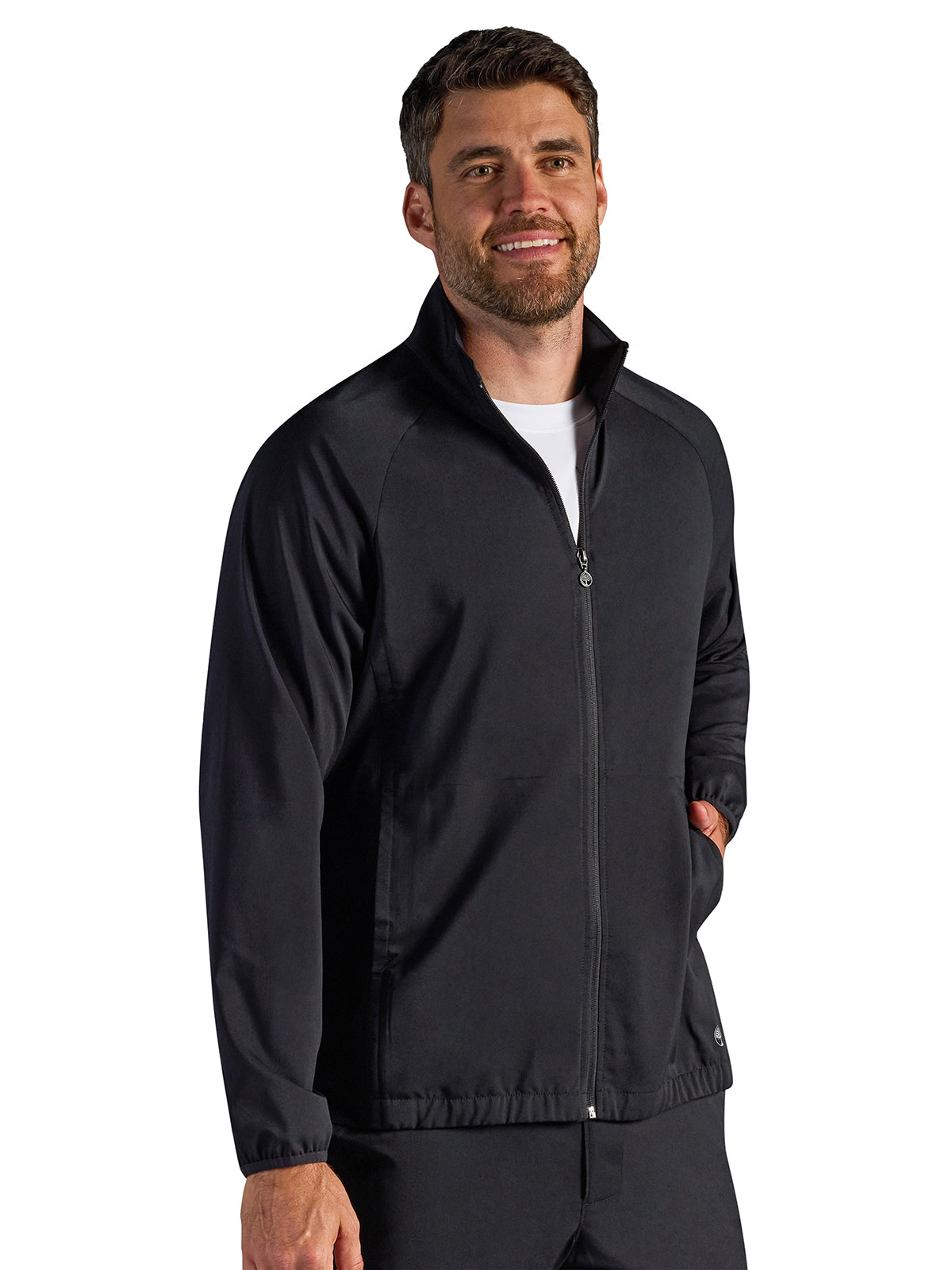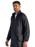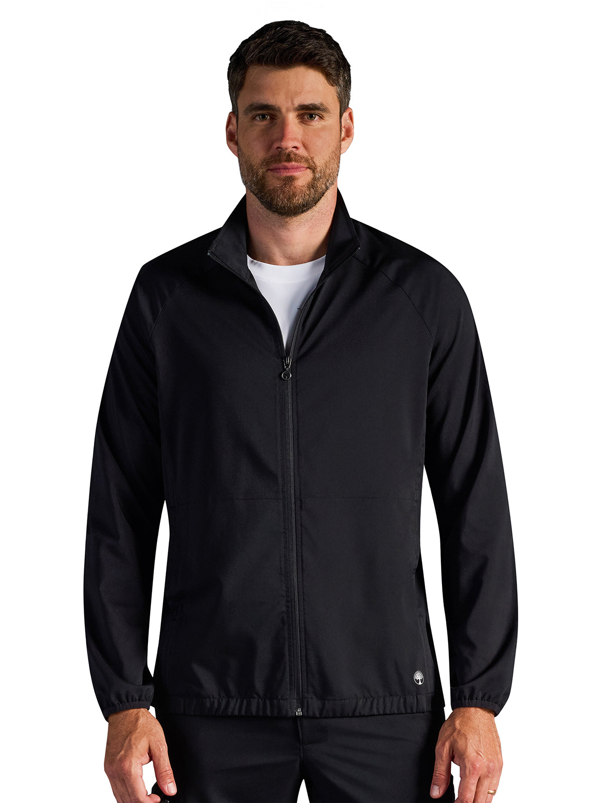The Men's Van zip front jacket from Healing Hands x Dr. Kwane is packable for on-the-go style and convenience. Open the back zipper pocket to reveal the bag handles and then pack the jacket into the pocket producing a bag. The jacket has a stand-up collar, raglan sleeves, plus front and back seams for fit and shaping. There are four pockets for organized storage: two side entrance pockets, one back zipper pocket, and one interior pocket that functions as a side pocket on the bag. Elastic cuffs on sleeve hems and front hem. Modern fit. Center back length: 29"