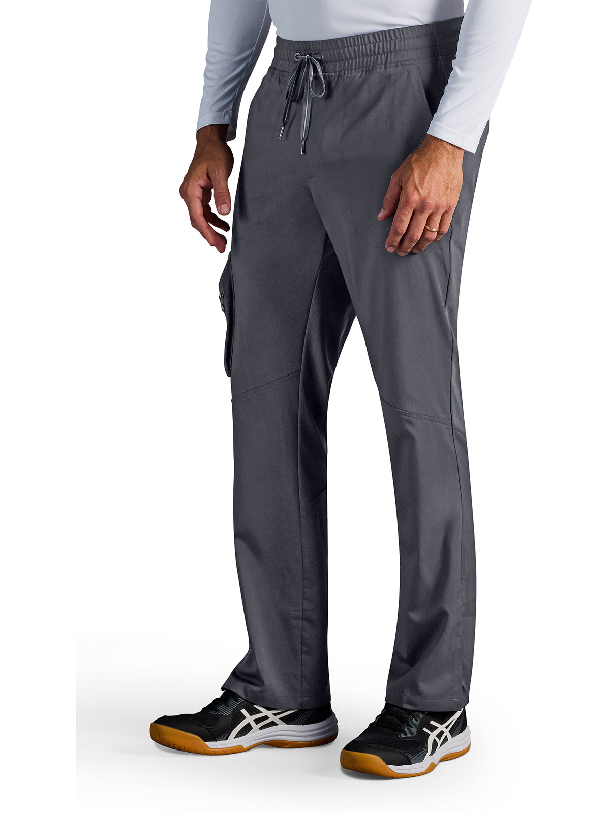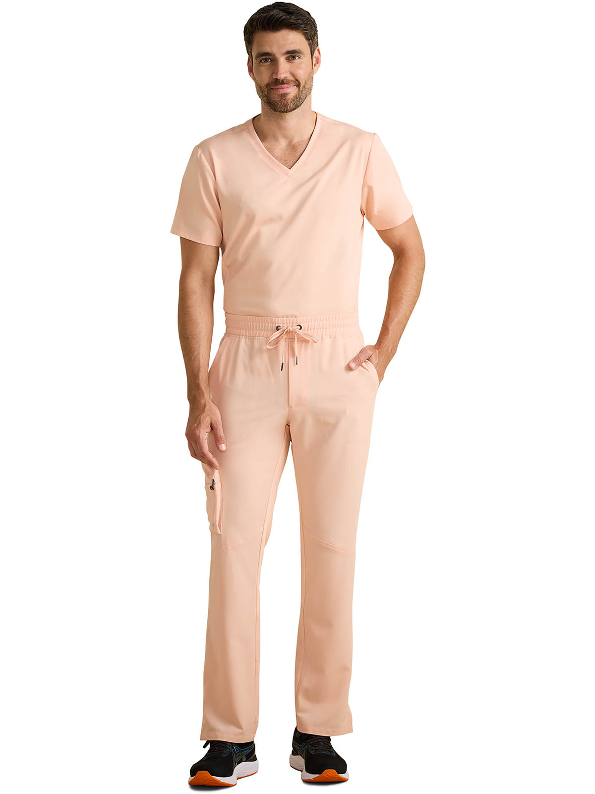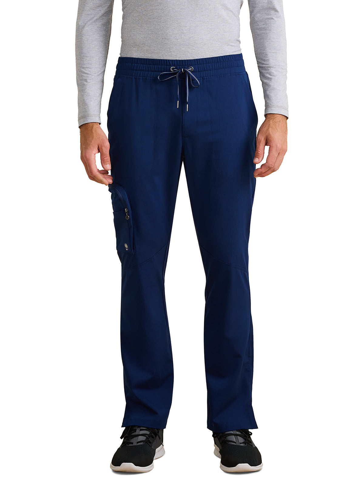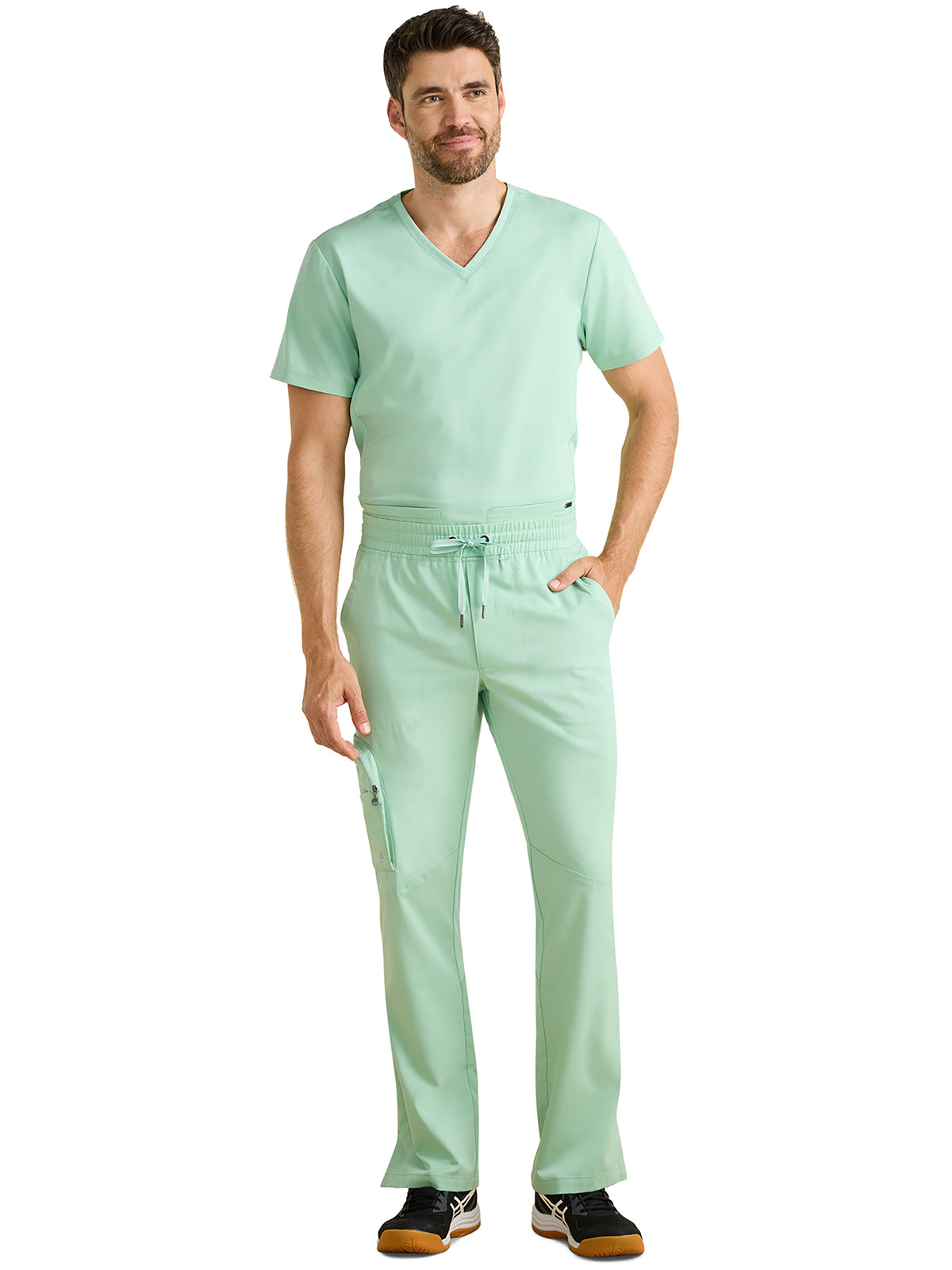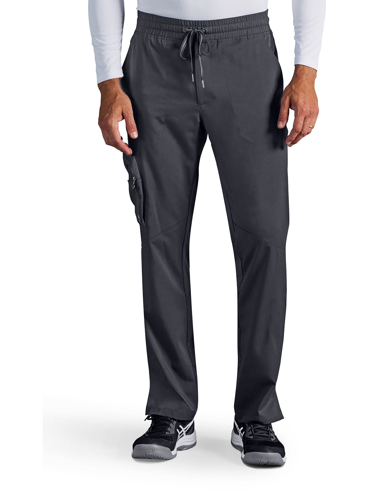 Soft woven scrub fabric on the front plus a stretchy full knit back equals one very stylish Men's scrub jogger. This pant also has a unique detail: a detachable pocket for on-the-go storage. The Healing Hands x Dr. Kwane Men's Vernon mid rise zip fly scrub jogger features an elasticized waistband with a drawstring for adjustability and security. There are seven pockets for organized storage: two front slant pockets, two welt cargo pockets, and two back welt pockets. Detachable pocket on wearer's right side converts into a bag. A back yoke provides a better fit. The mixed media design continues with dyed-to-match knit back panels and knit cuffs. Modern fit. Tapered jogger leg, 10" leg opening. Inseam: 29"