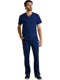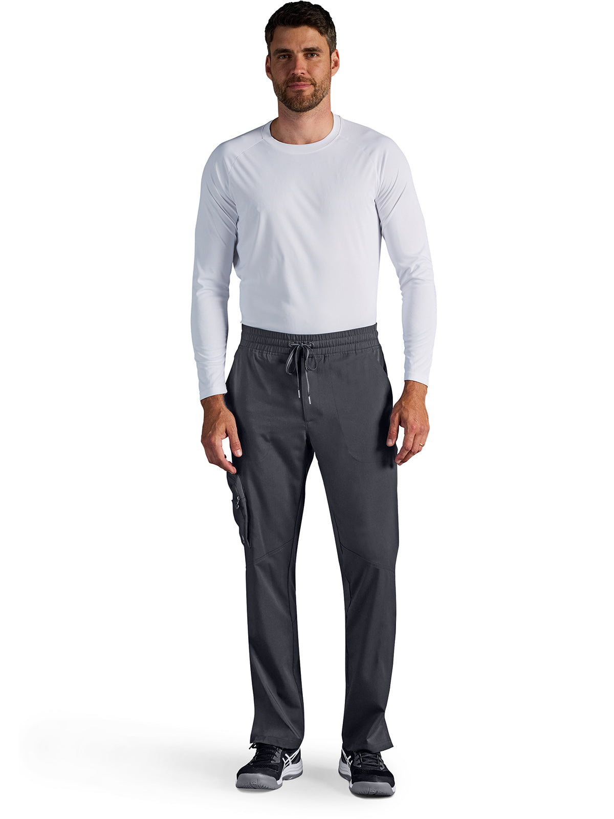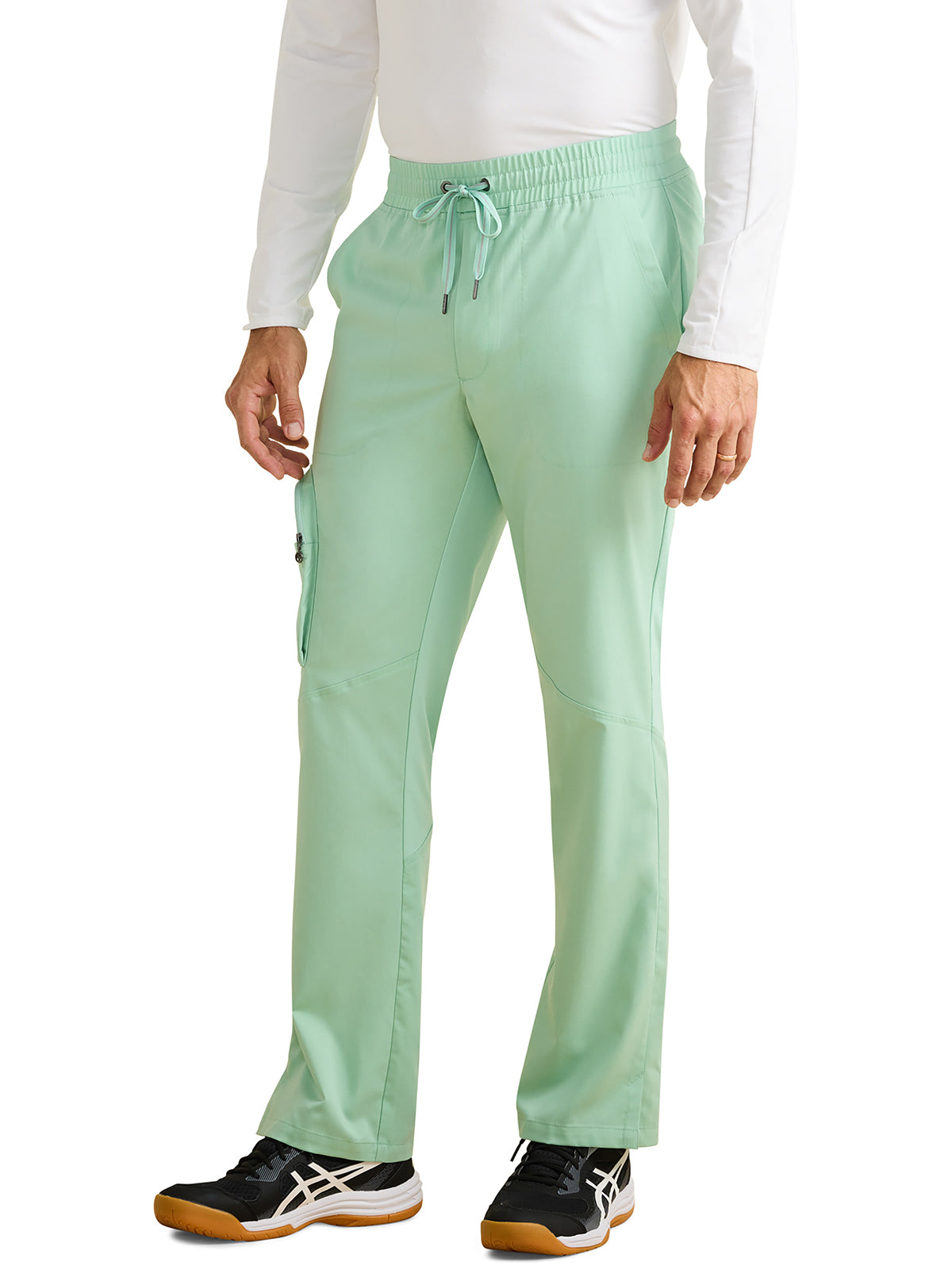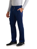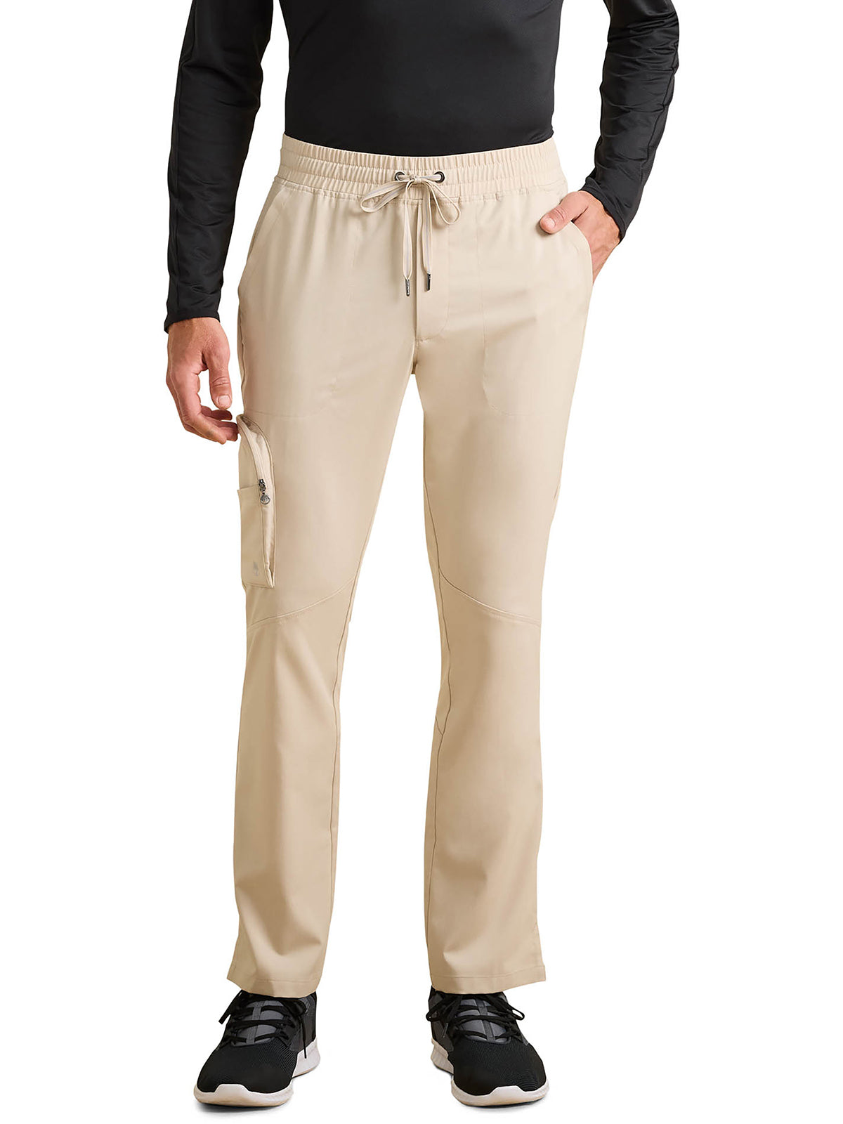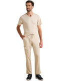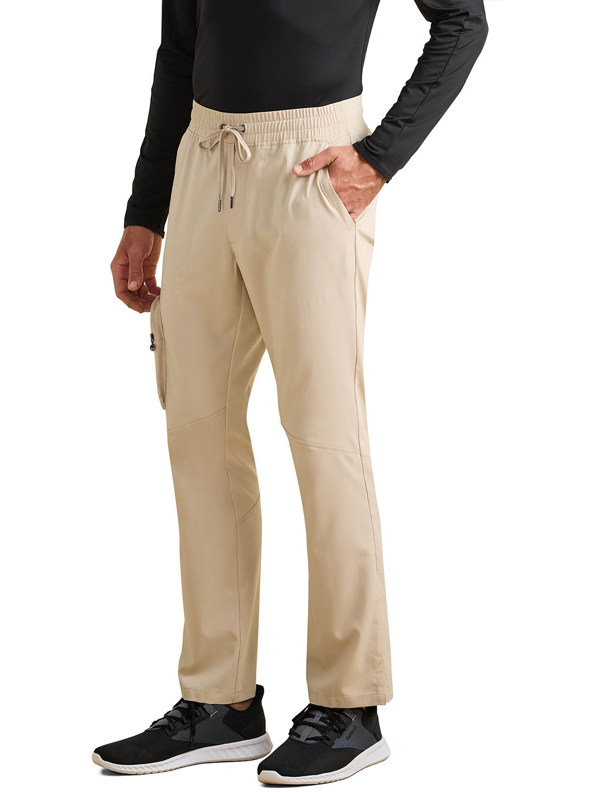 Soft woven scrub fabric on the front plus a stretchy full knit back equals one very stylish Men's scrub jogger. This pant also has a unique detail: a detachable pocket for on-the-go storage. The Healing Hands x Dr. Kwane Men's Vernon mid rise zip fly scrub jogger features an elasticized waistband with a drawstring for adjustability and security. There are seven pockets for organized storage: two front slant pockets, two welt cargo pockets, and two back welt pockets. Detachable pocket on wearer's right side converts into a bag. A back yoke provides a better fit. The mixed media design continues with dyed-to-match knit back panels and knit cuffs. Modern fit. Tapered jogger leg, 10" leg opening. Inseam: 29"