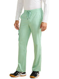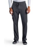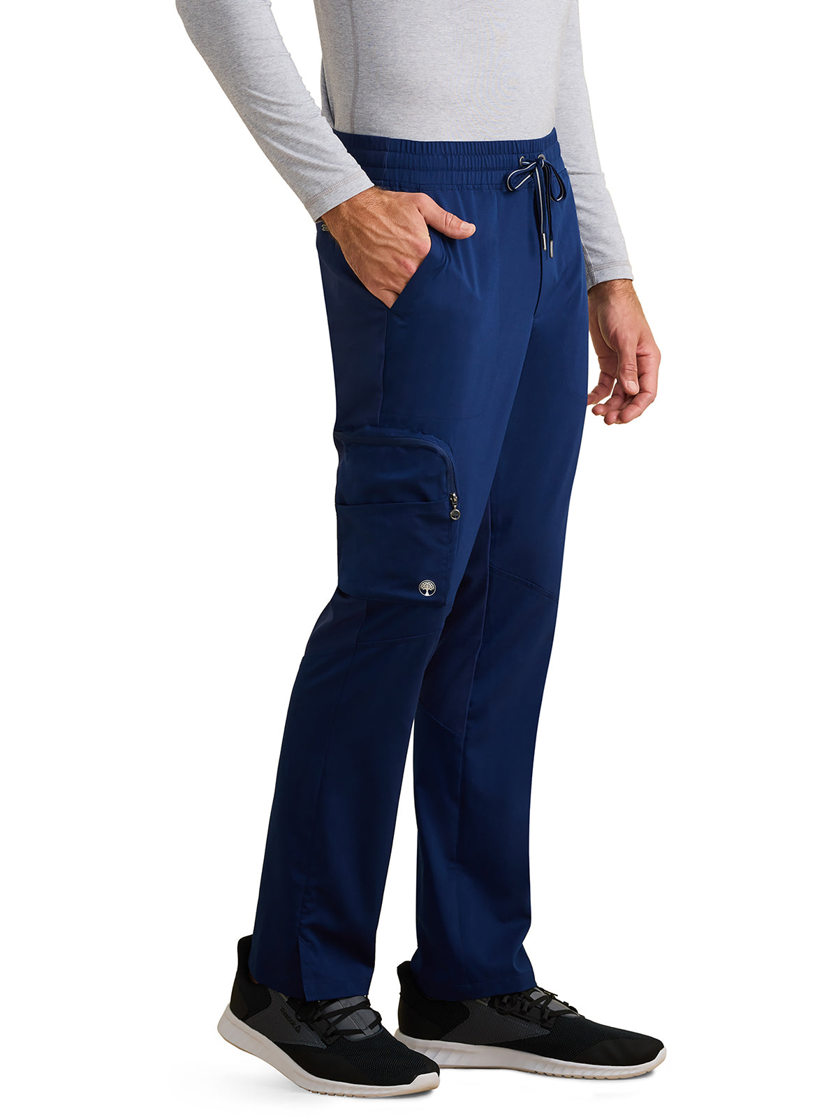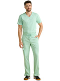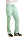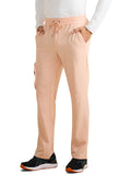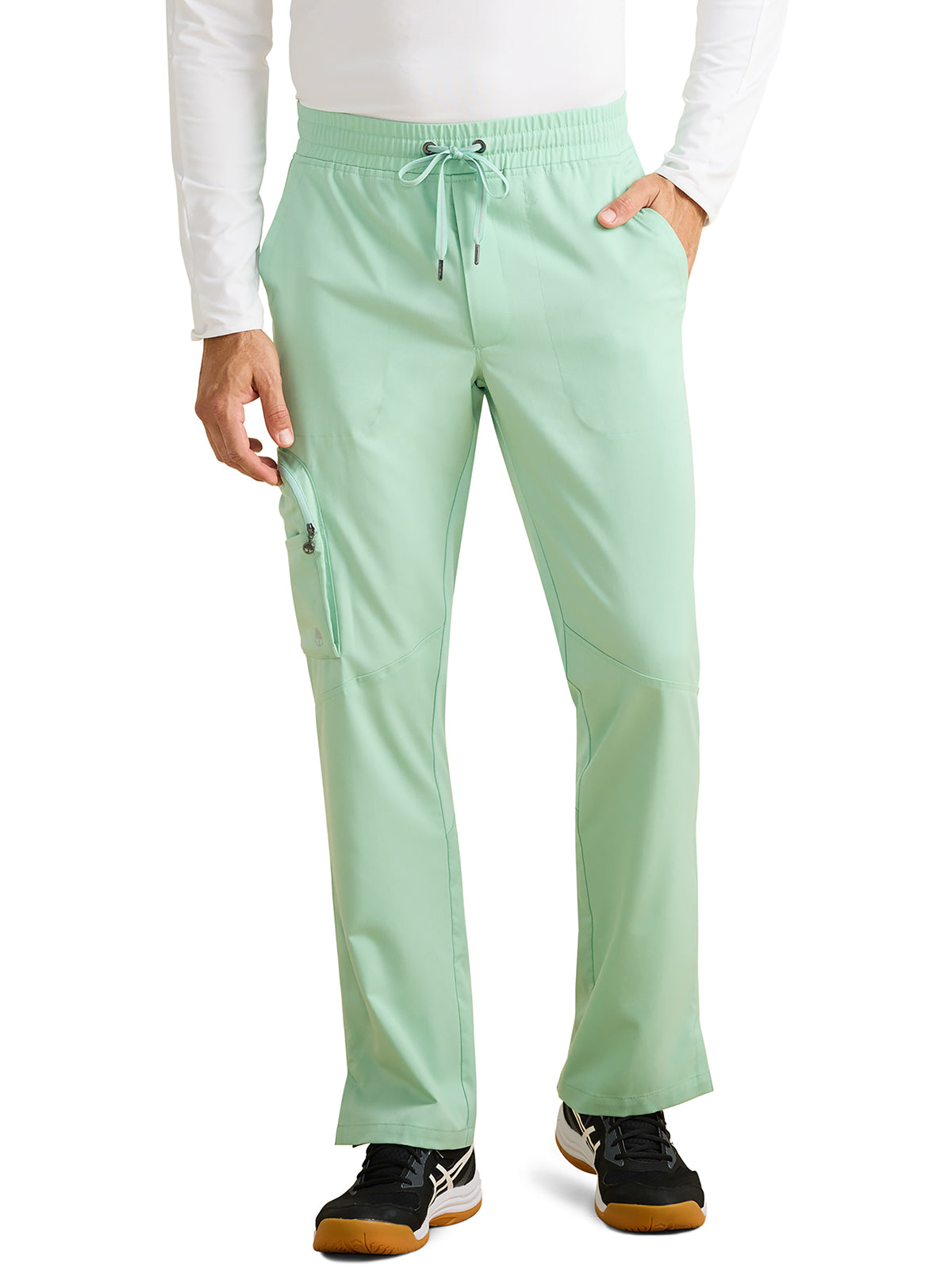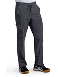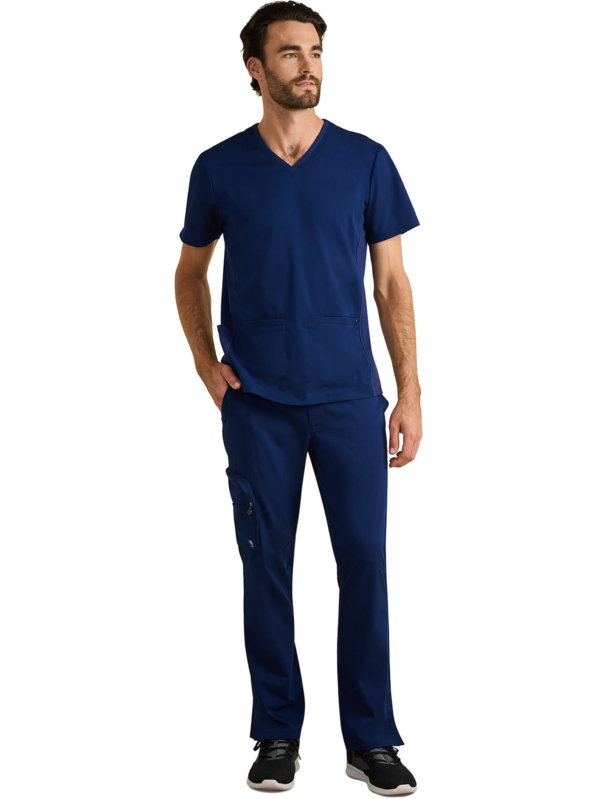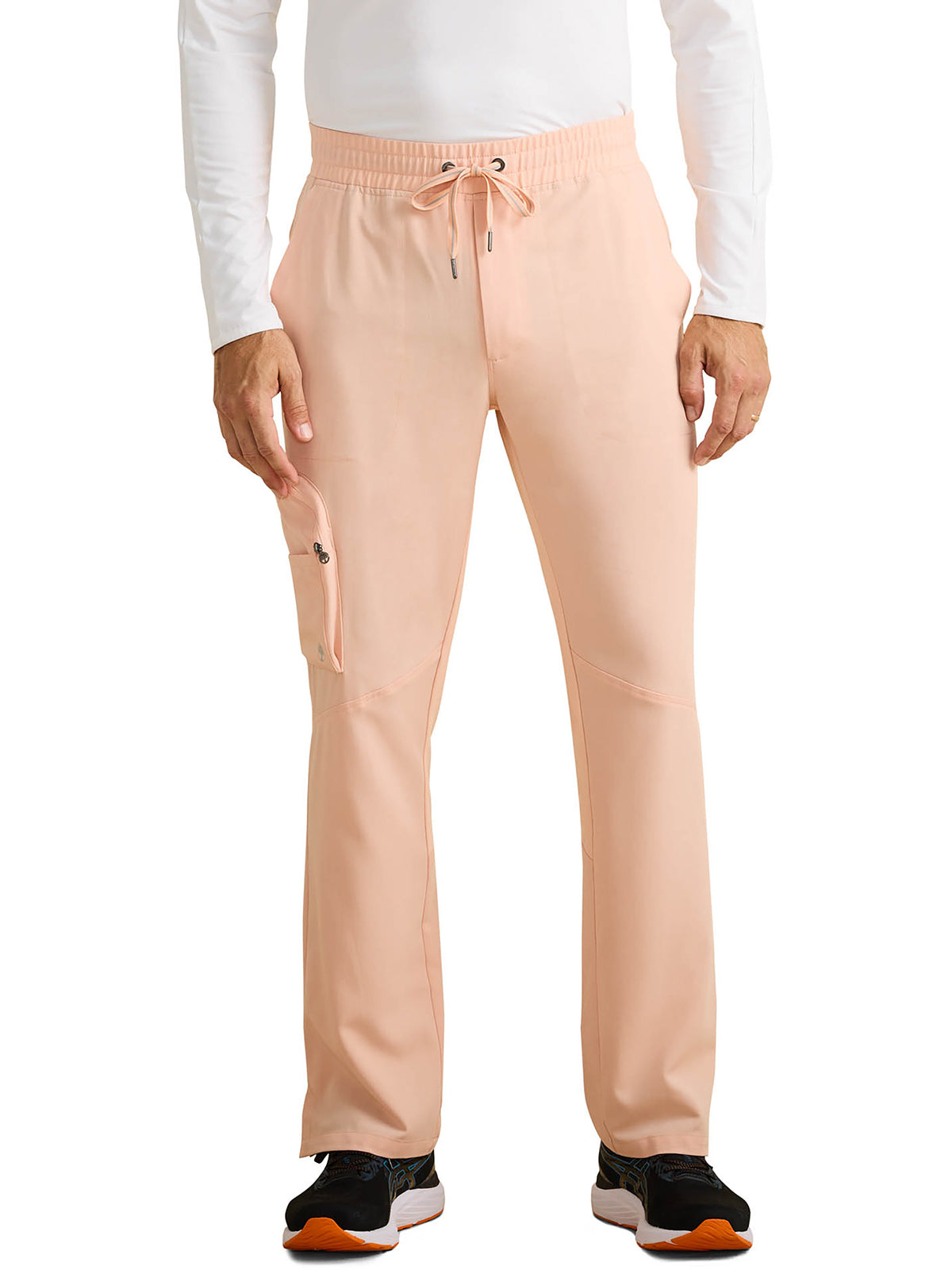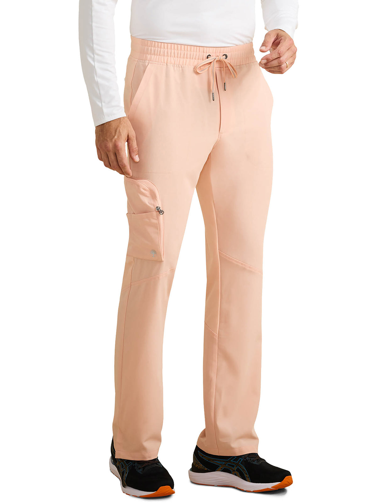 Soft woven scrub fabric on the front plus a stretchy full knit back equals one very stylish Men's scrub jogger. This pant also has a unique detail: a detachable pocket for on-the-go storage. The Healing Hands x Dr. Kwane Men's Vernon mid rise zip fly scrub jogger features an elasticized waistband with a drawstring for adjustability and security. There are seven pockets for organized storage: two front slant pockets, two welt cargo pockets, and two back welt pockets. Detachable pocket on wearer's right side converts into a bag. A back yoke provides a better fit. The mixed media design continues with dyed-to-match knit back panels and knit cuffs. Modern fit. Tapered jogger leg, 10" leg opening. Inseam: 29"