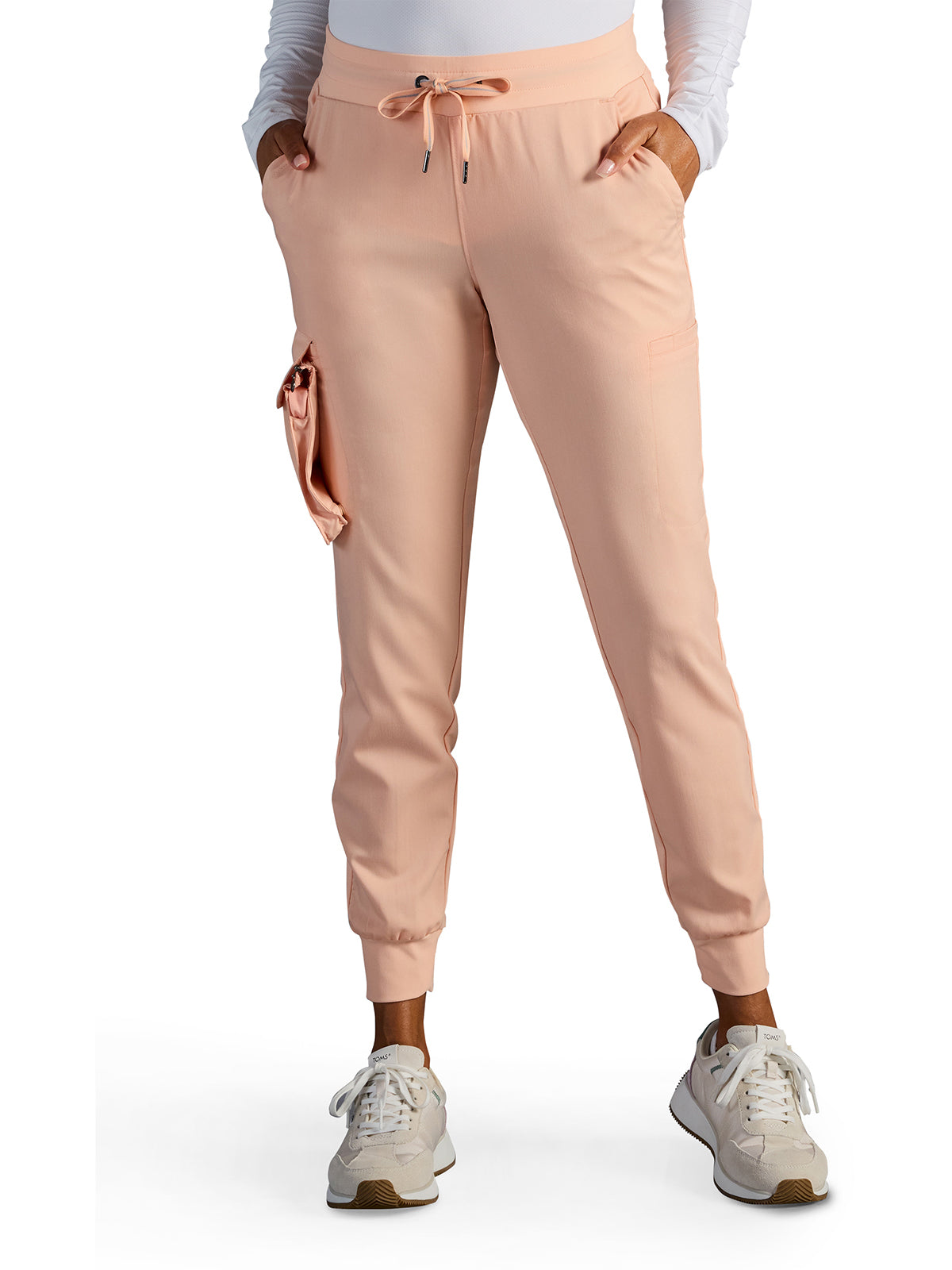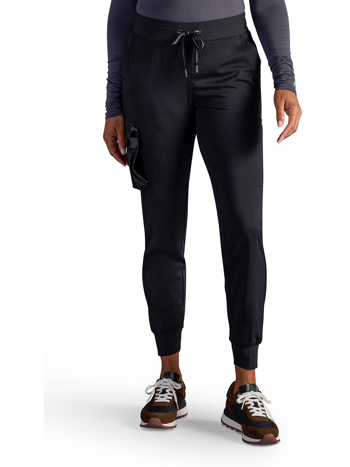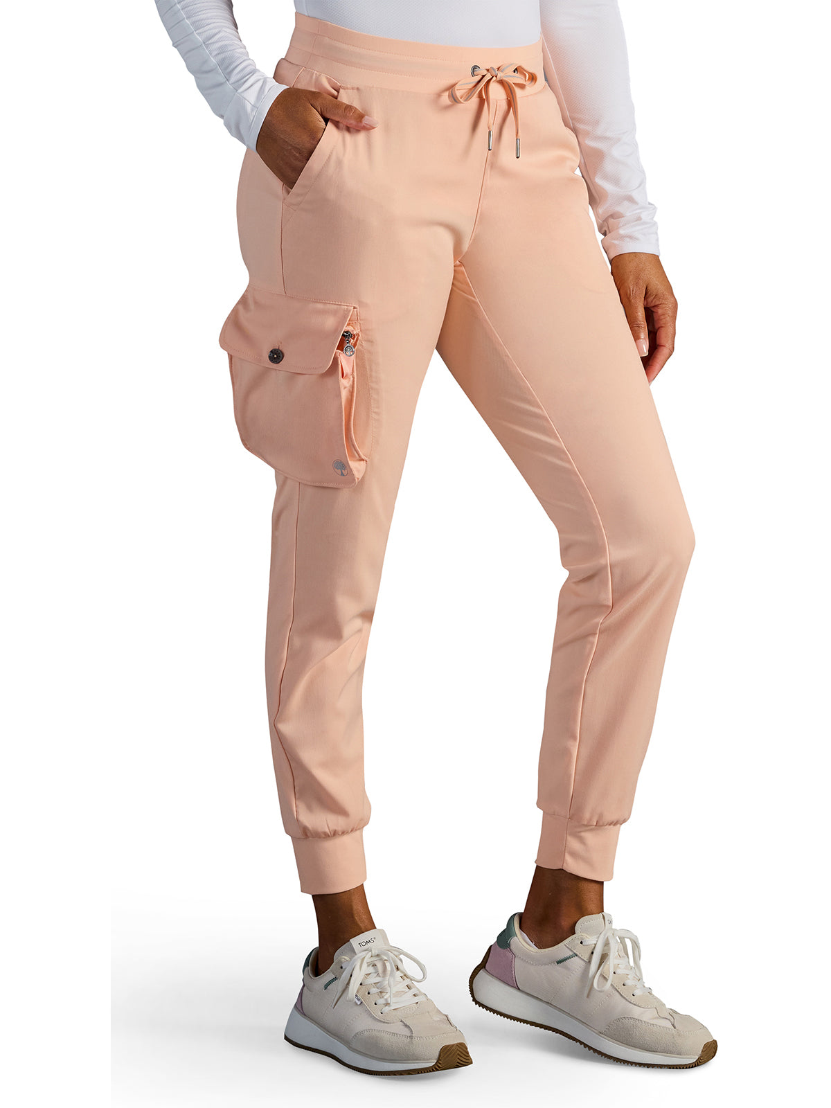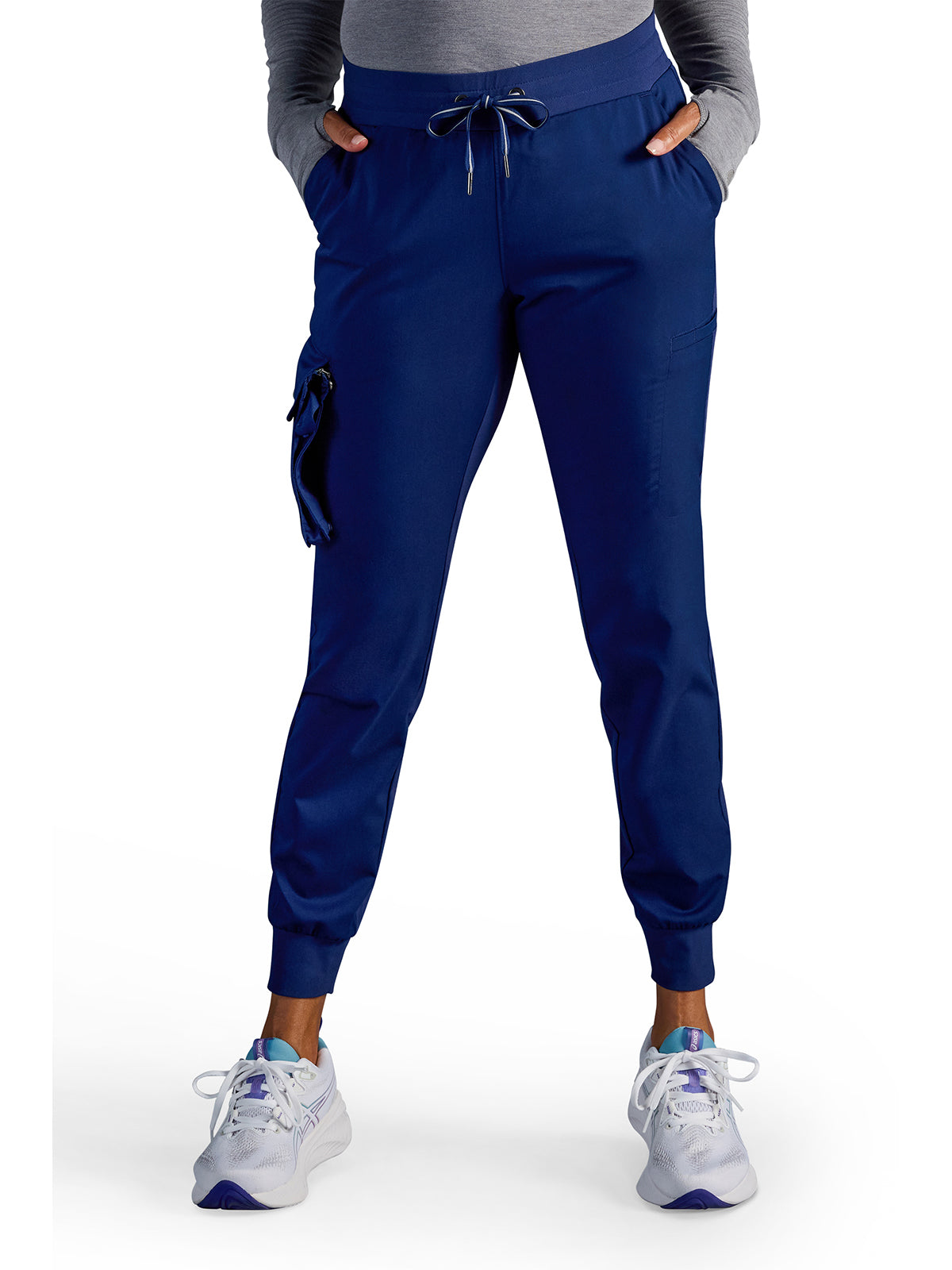 Soft woven scrub fabric on the front plus a stretchy full knit back equals one very fashionable scrub jogger. This pant also has a unique detail: a detachable pocket for on-the-go storage. The Healing Hands x Dr. Kwane Vanessa mid rise scrub jogger features a mock fly plus an elasticized waistband with a drawstring for adjustability and security. There are seven pockets for organized storage: two front slant pockets, two welt cargo pockets, and two back welt pockets. Detachable pocket on wearer's right side converts into a bag. A back yoke provides a better fit. The mixed media styling continues with dyed-to-match knit back panels and knit cuffs. Modern fit. Tapered jogger leg, 8 3/4" leg opening. Inseam: 28 1/2"
