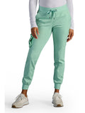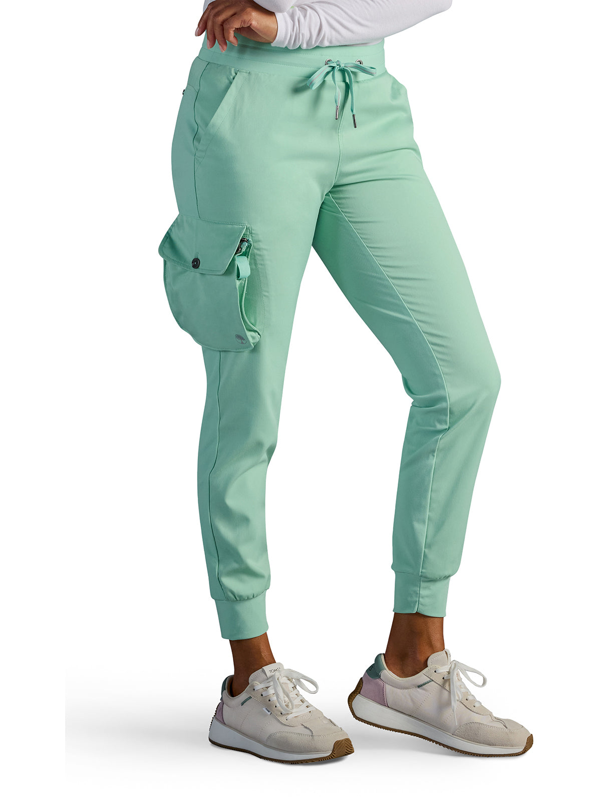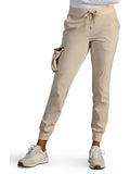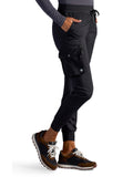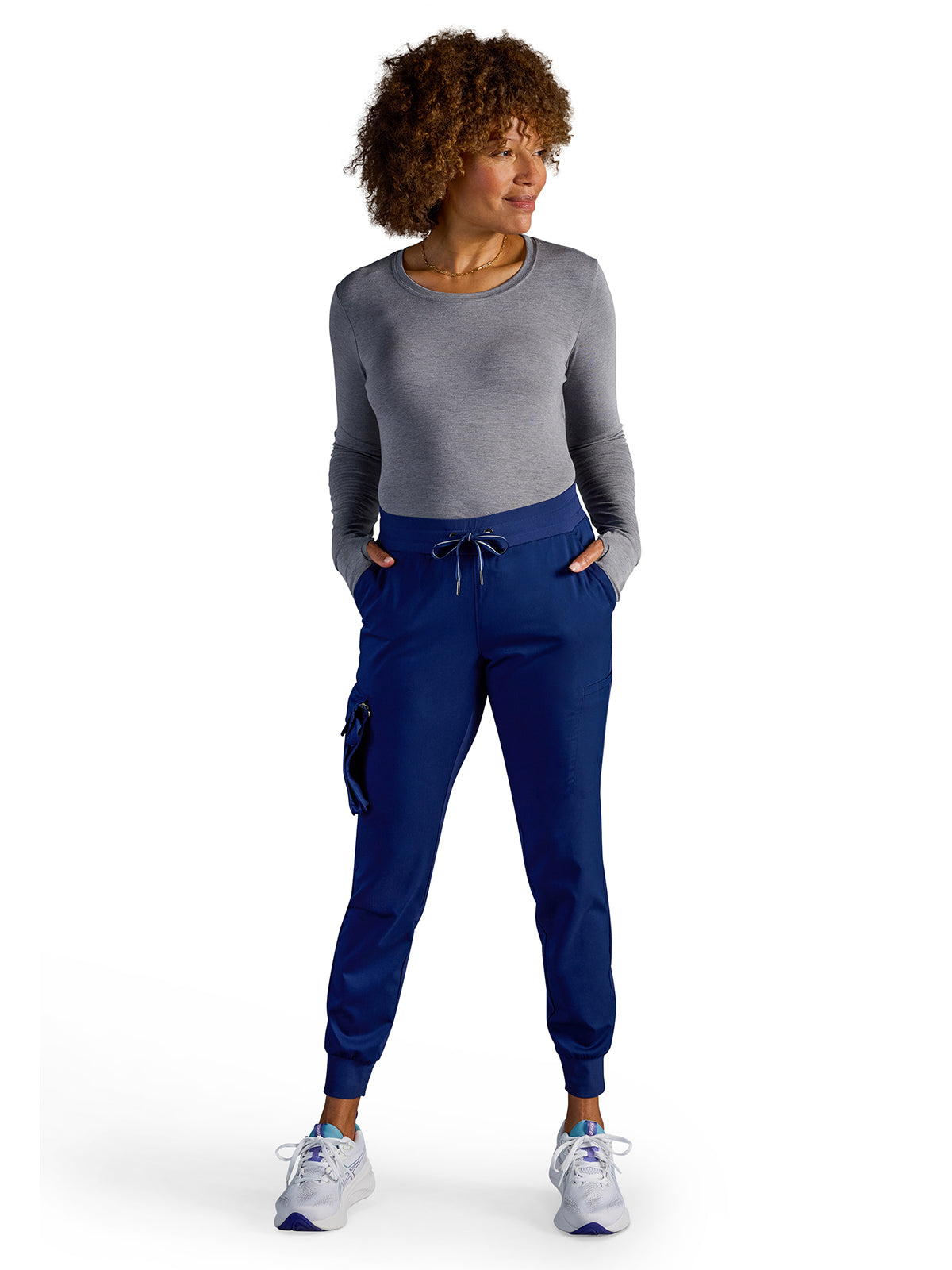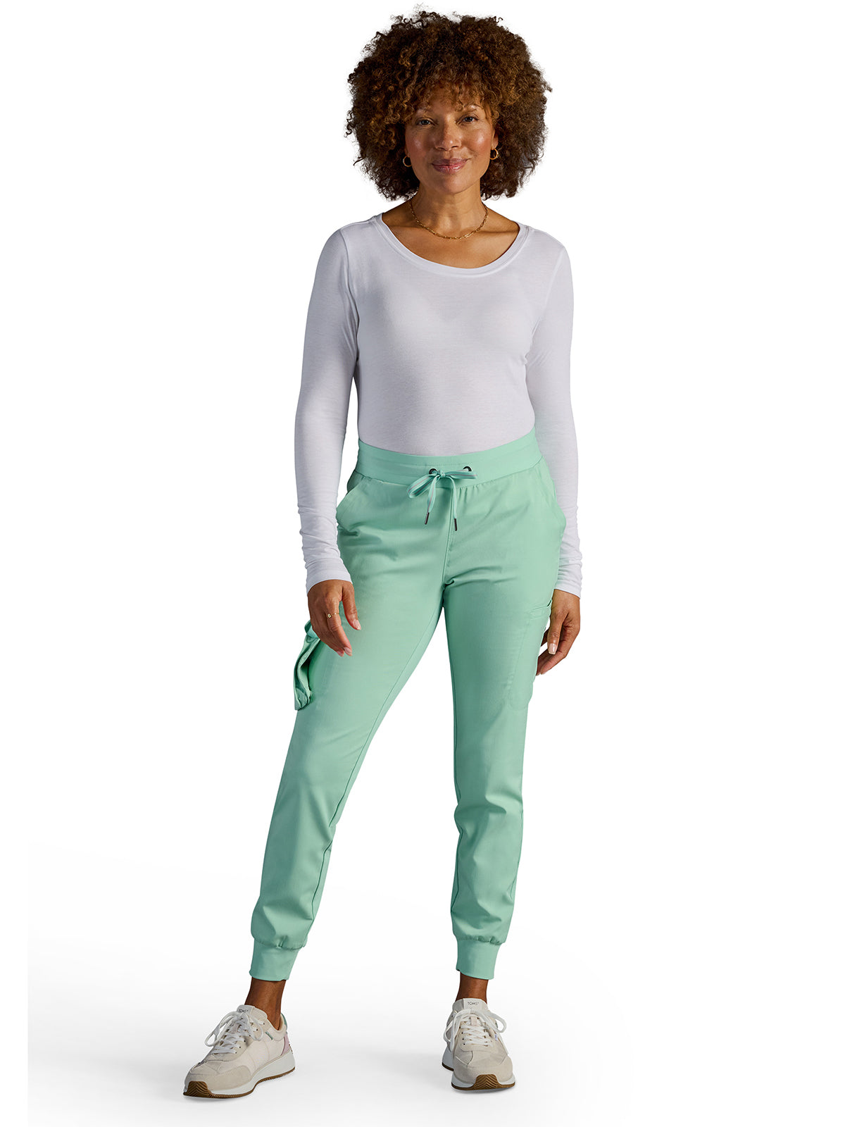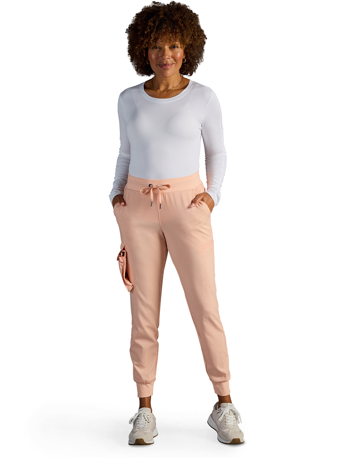 Soft woven scrub fabric on the front plus a stretchy full knit back equals one very fashionable scrub jogger. This pant also has a unique detail: a detachable pocket for on-the-go storage. The Healing Hands x Dr. Kwane Vanessa mid rise scrub jogger features a mock fly plus an elasticized waistband with a drawstring for adjustability and security. There are seven pockets for organized storage: two front slant pockets, two welt cargo pockets, and two back welt pockets. Detachable pocket on wearer's right side converts into a bag. A back yoke provides a better fit. The mixed media styling continues with dyed-to-match knit back panels and knit cuffs. Modern fit. Tapered jogger leg, 8 3/4" leg opening. Inseam: 28 1/2"