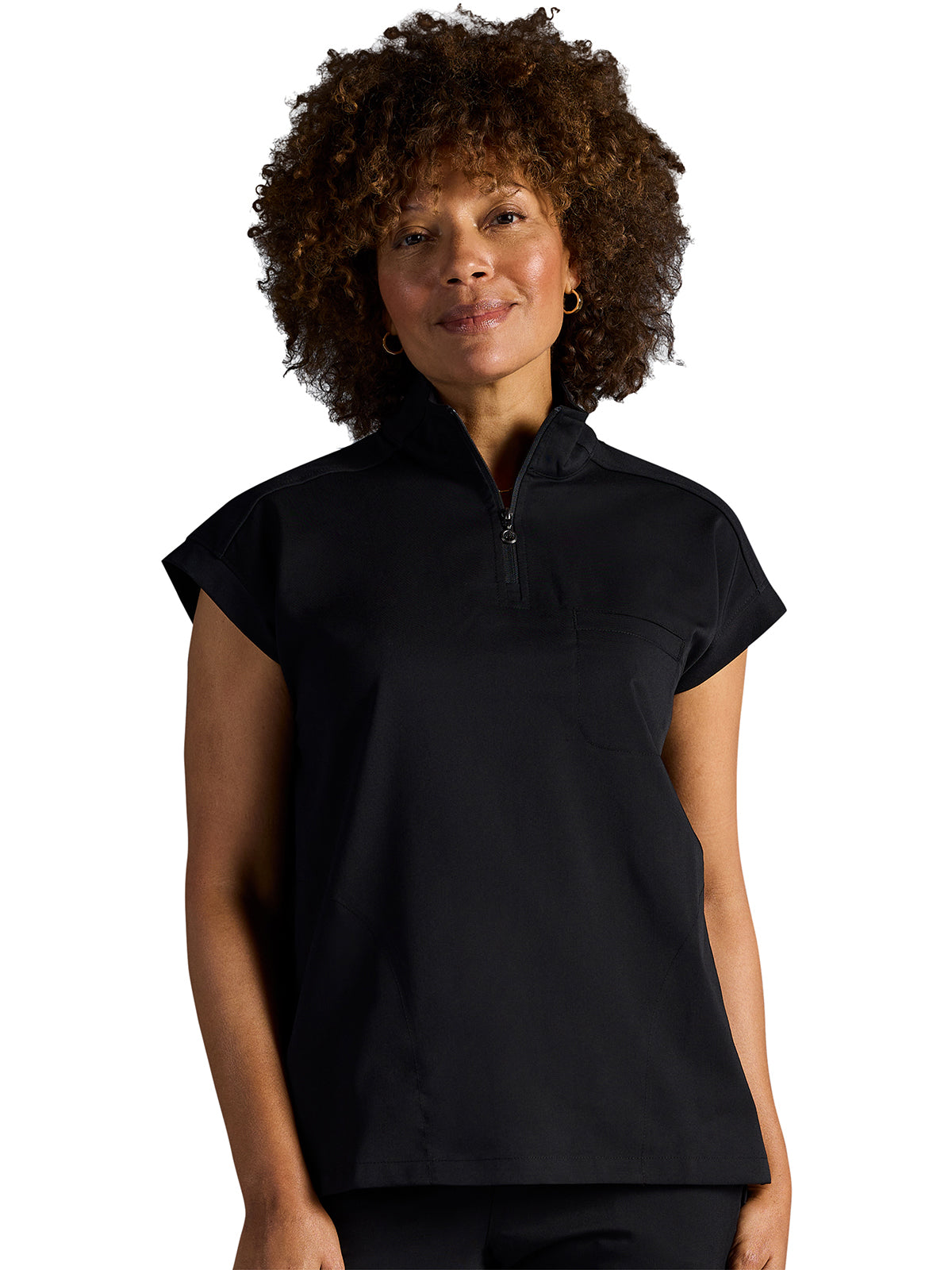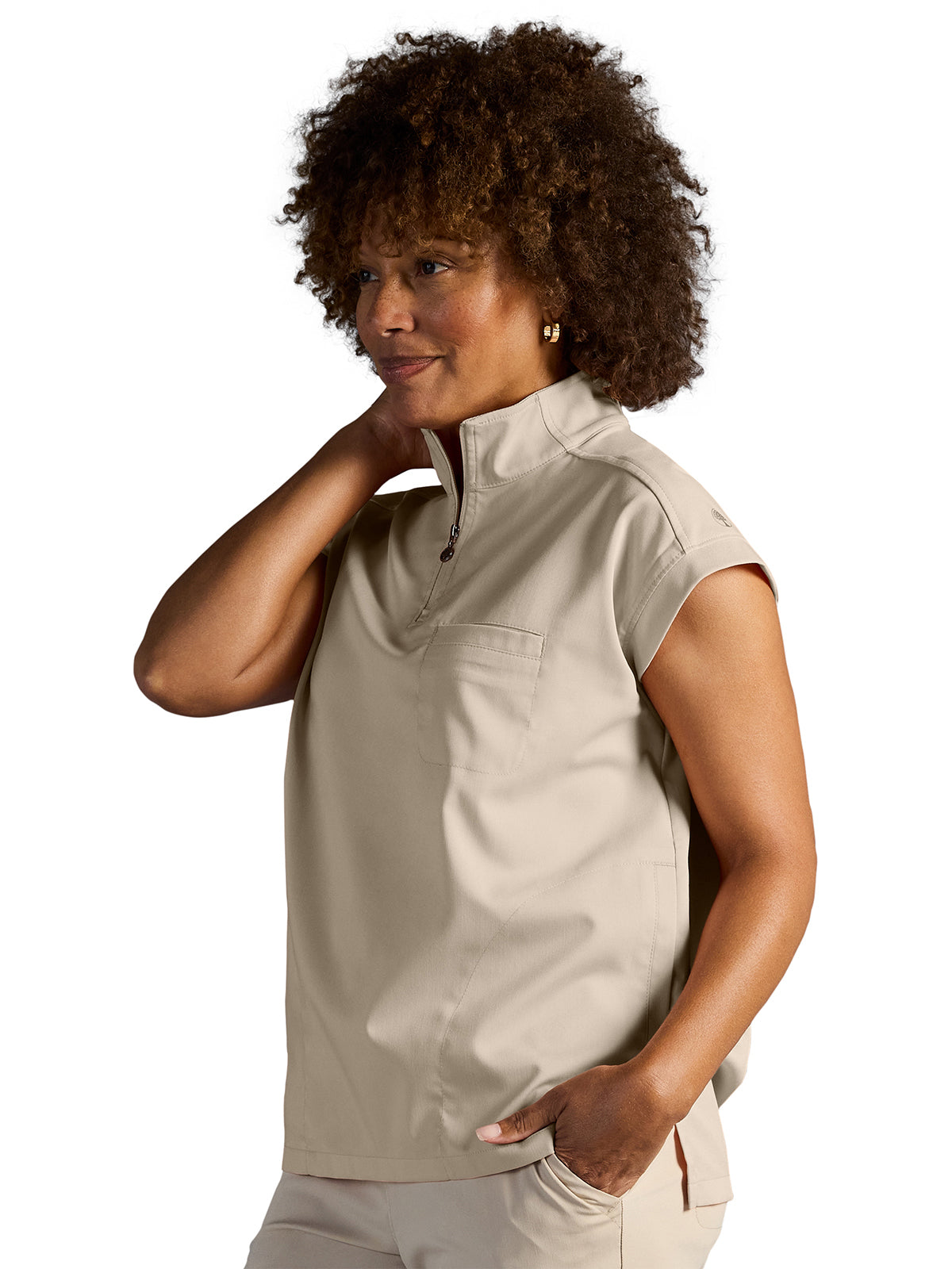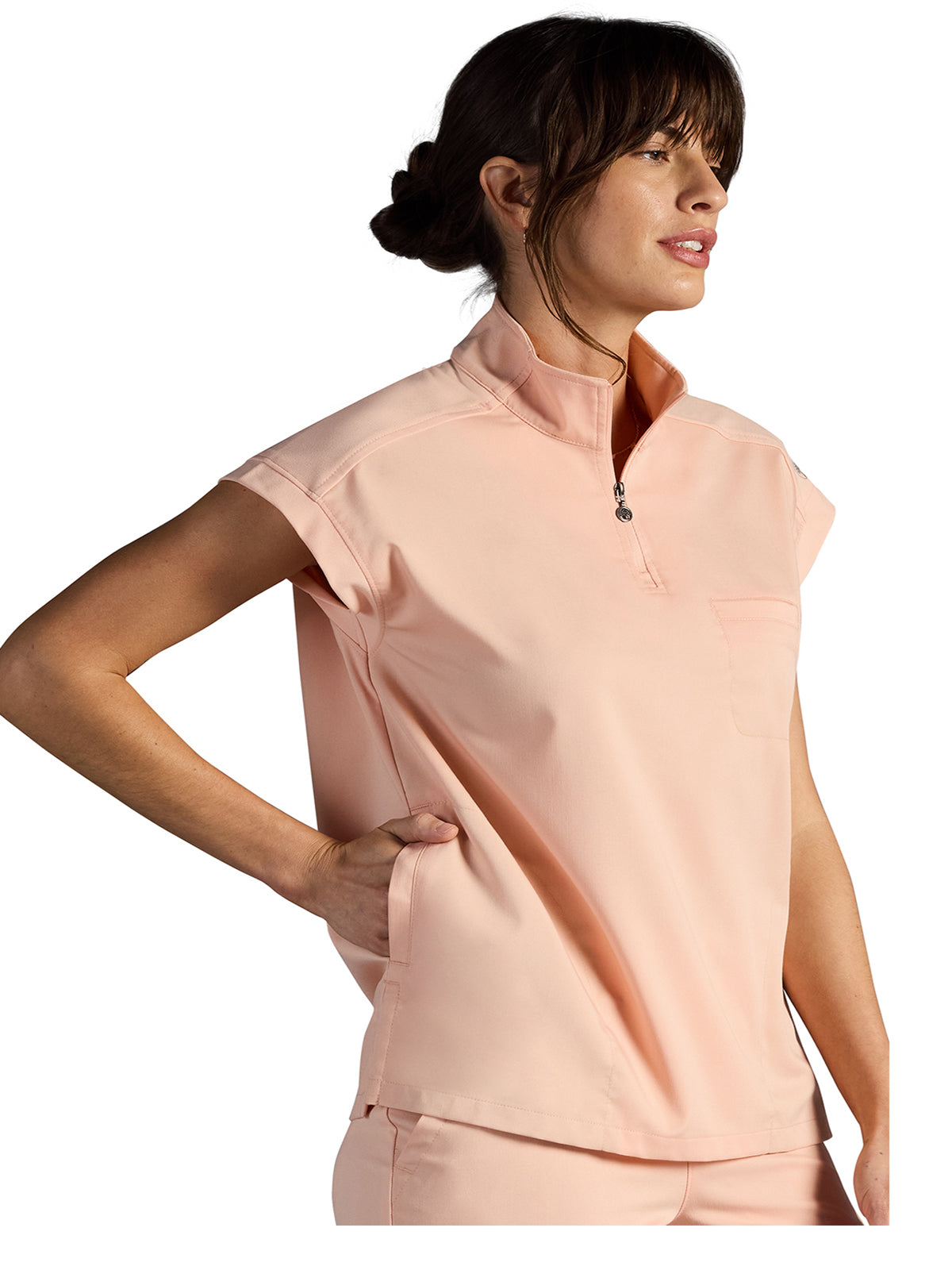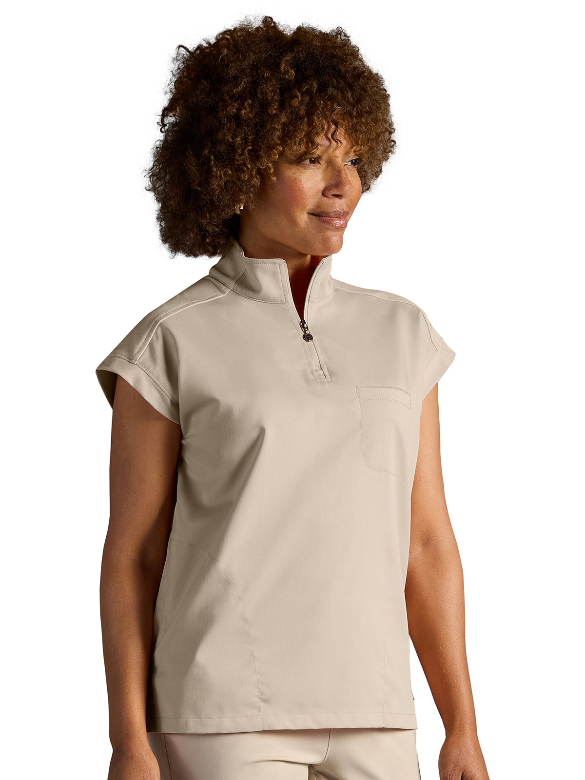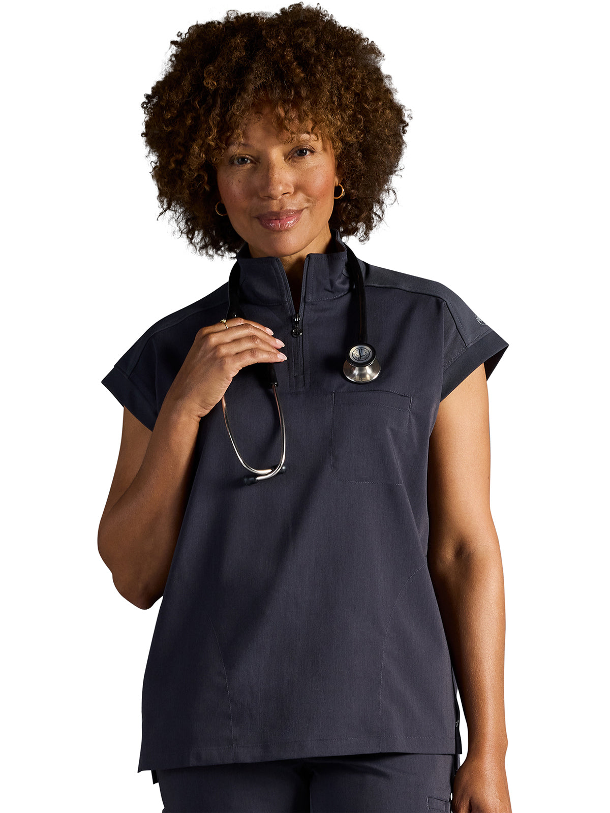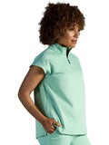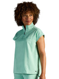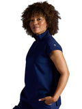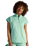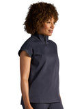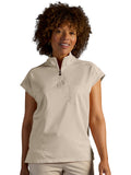 The Healing Hands x Dr. Kwane Vienna top features a stand-up collar, quarter-zip opening, and short dolman sleeves. Dyed-to-match knit sleeves on the collar, shoulder panels, sleeve hems, and back yoke add style. There are three pockets for storage: one welt chest pocket and two welt side entry pockets. A high-low hem with side vents completes the look. Modern fit. Center back length: 26"