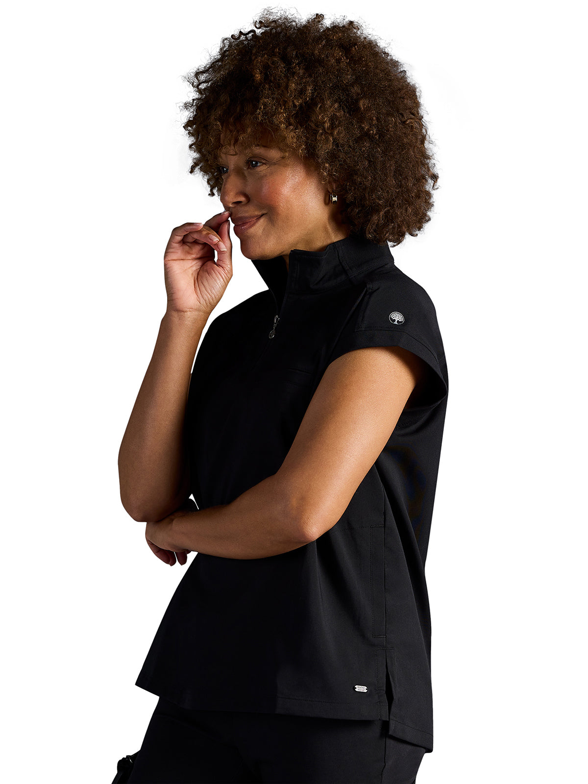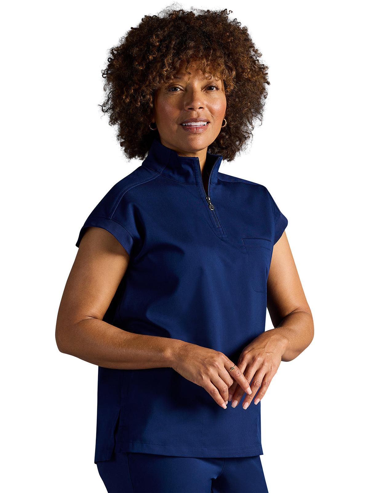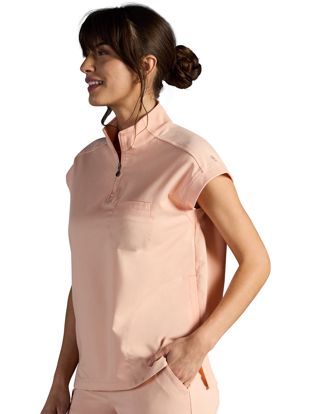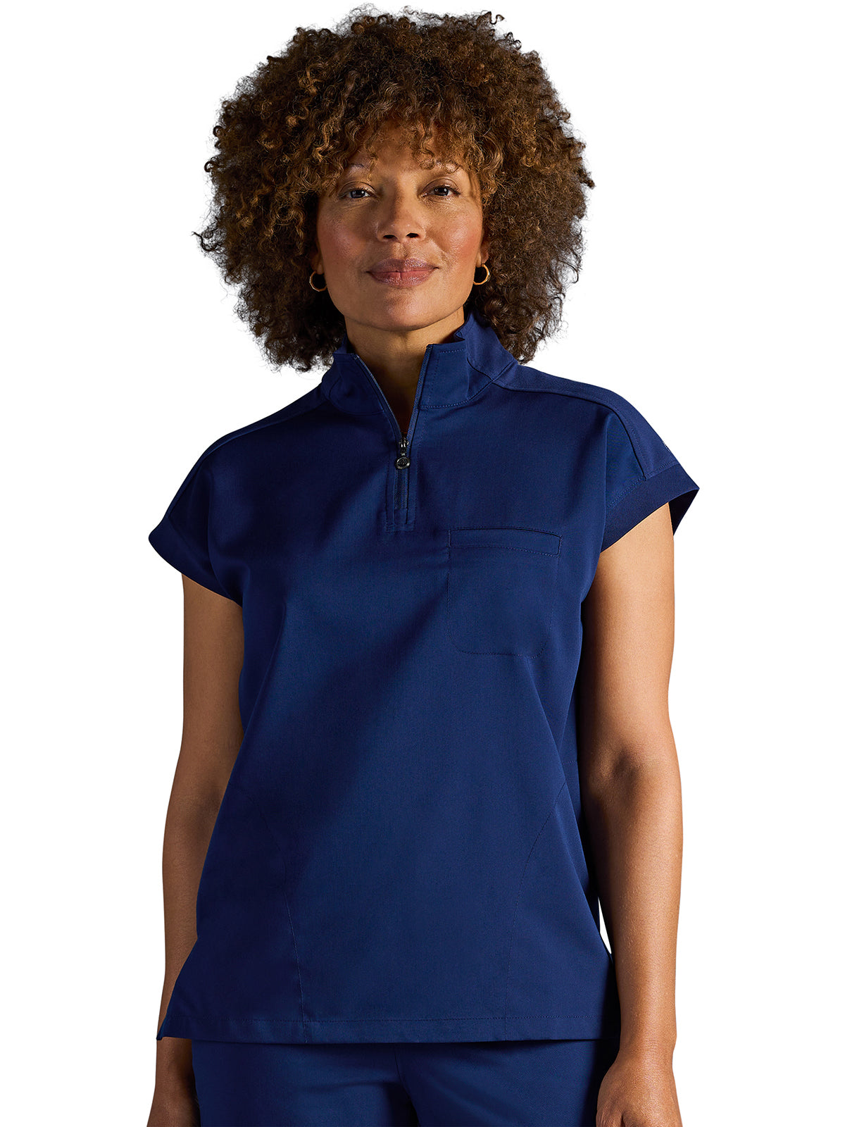 The Healing Hands x Dr. Kwane Vienna top features a stand-up collar, quarter-zip opening, and short dolman sleeves. Dyed-to-match knit sleeves on the collar, shoulder panels, sleeve hems, and back yoke add style. There are three pockets for storage: one welt chest pocket and two welt side entry pockets. A high-low hem with side vents completes the look. Modern fit. Center back length: 26"