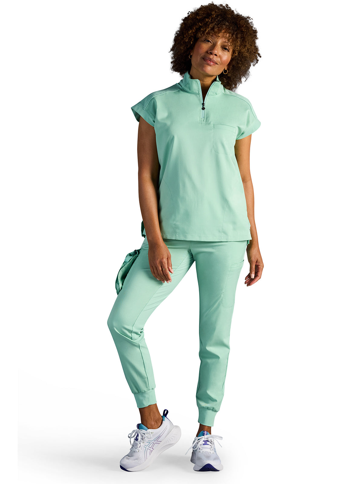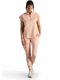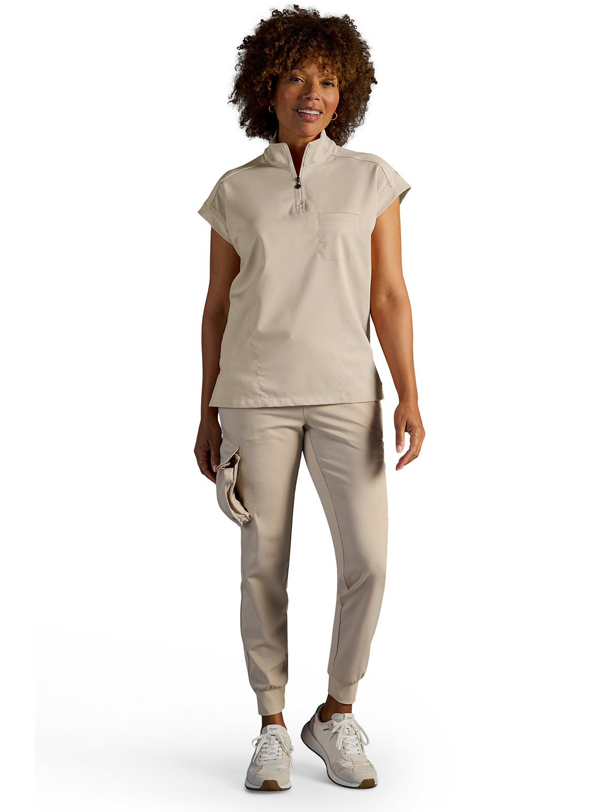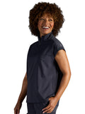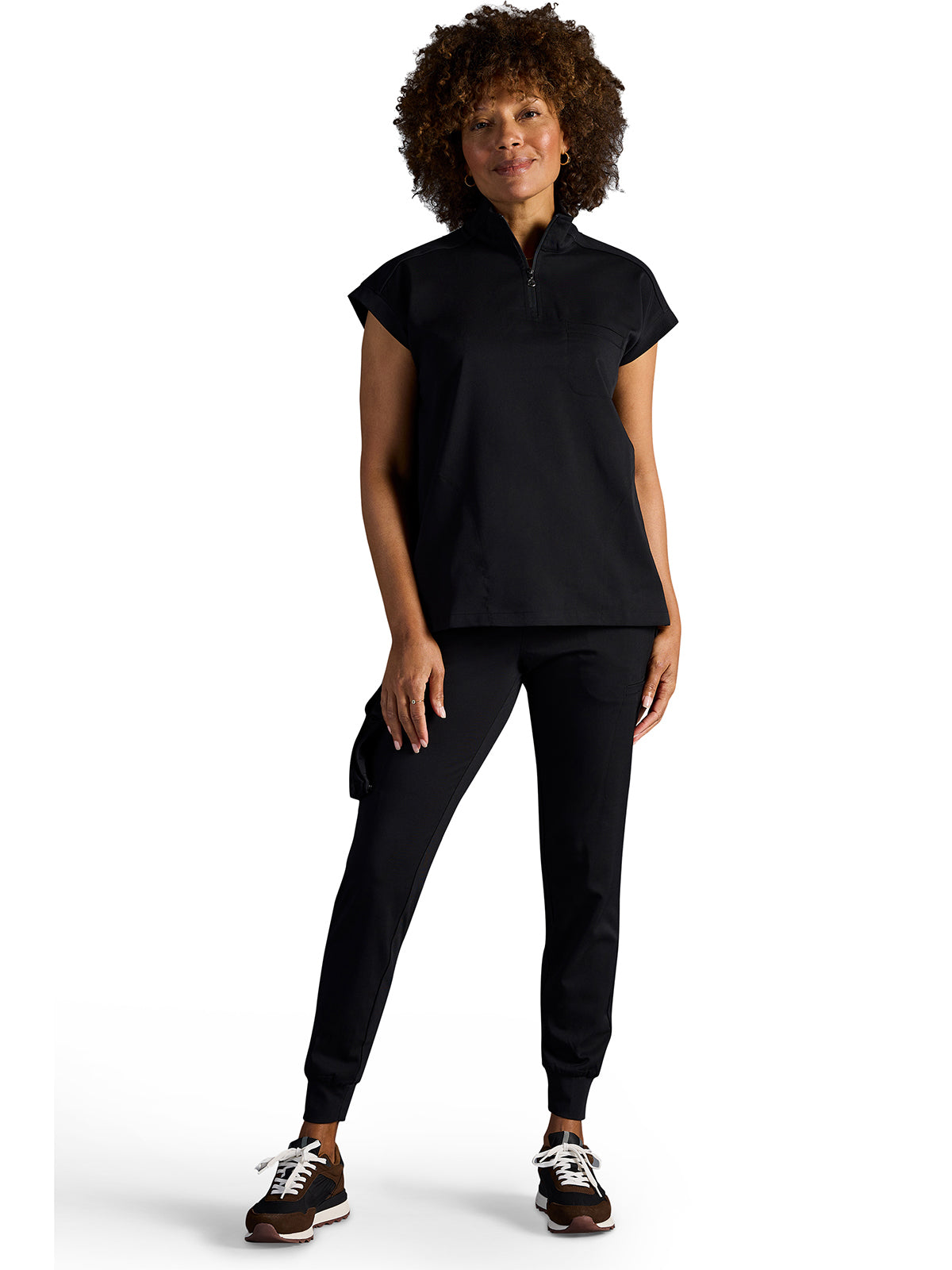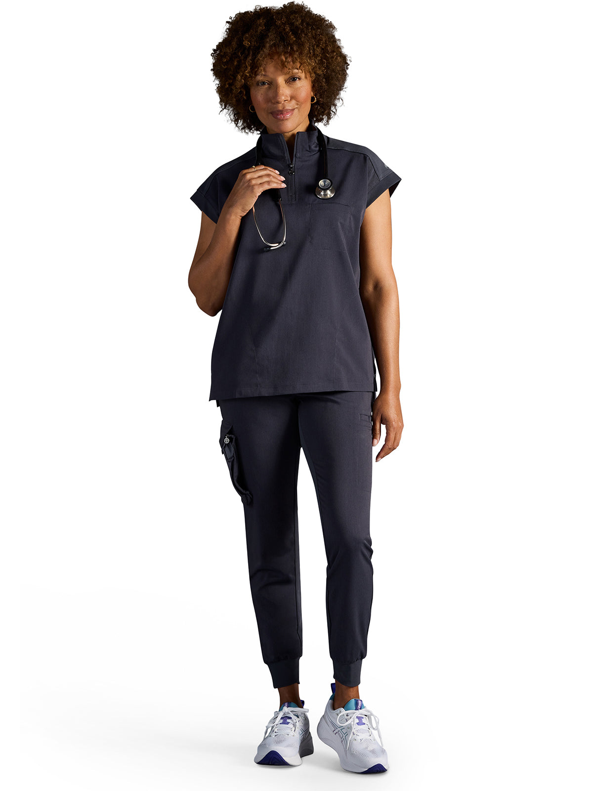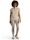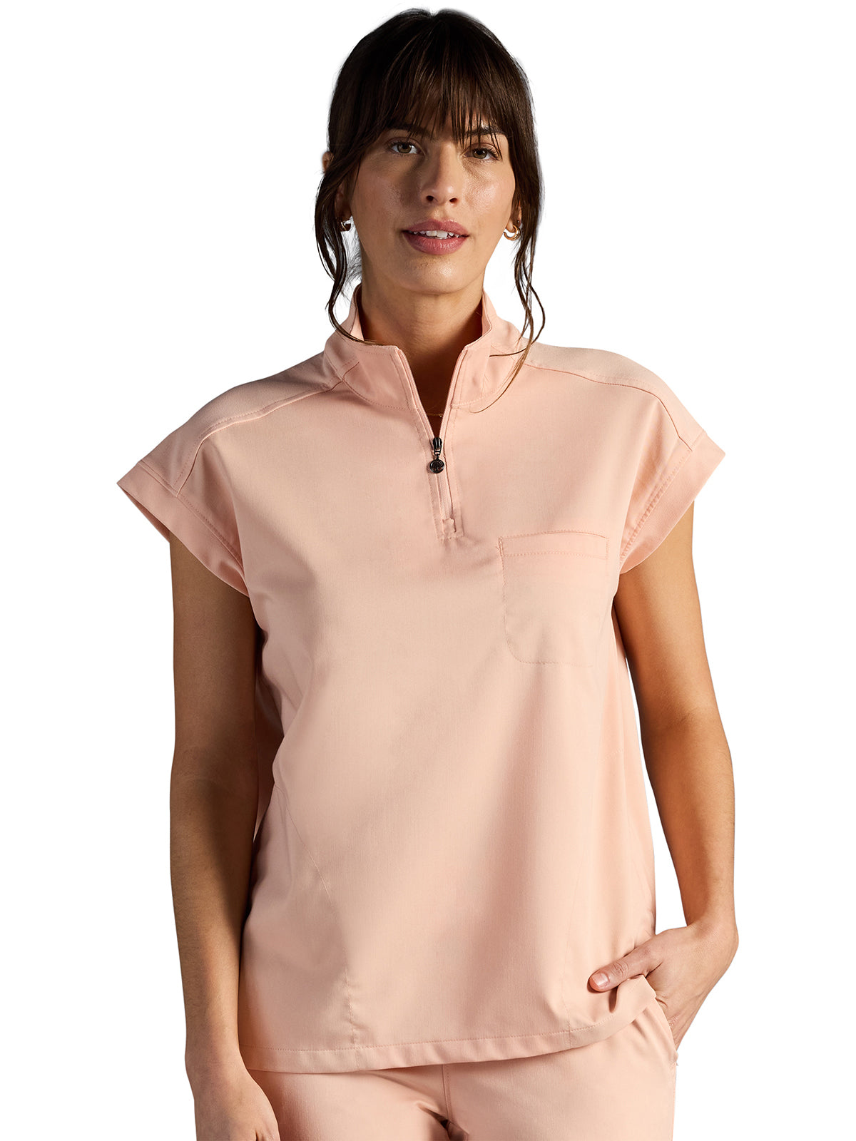 The Healing Hands x Dr. Kwane Vienna top features a stand-up collar, quarter-zip opening, and short dolman sleeves. Dyed-to-match knit sleeves on the collar, shoulder panels, sleeve hems, and back yoke add style. There are three pockets for storage: one welt chest pocket and two welt side entry pockets. A high-low hem with side vents completes the look. Modern fit. Center back length: 26"