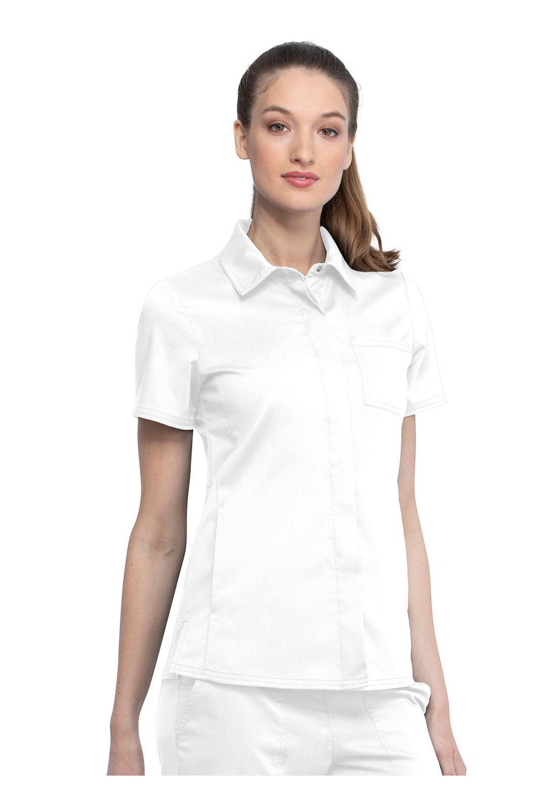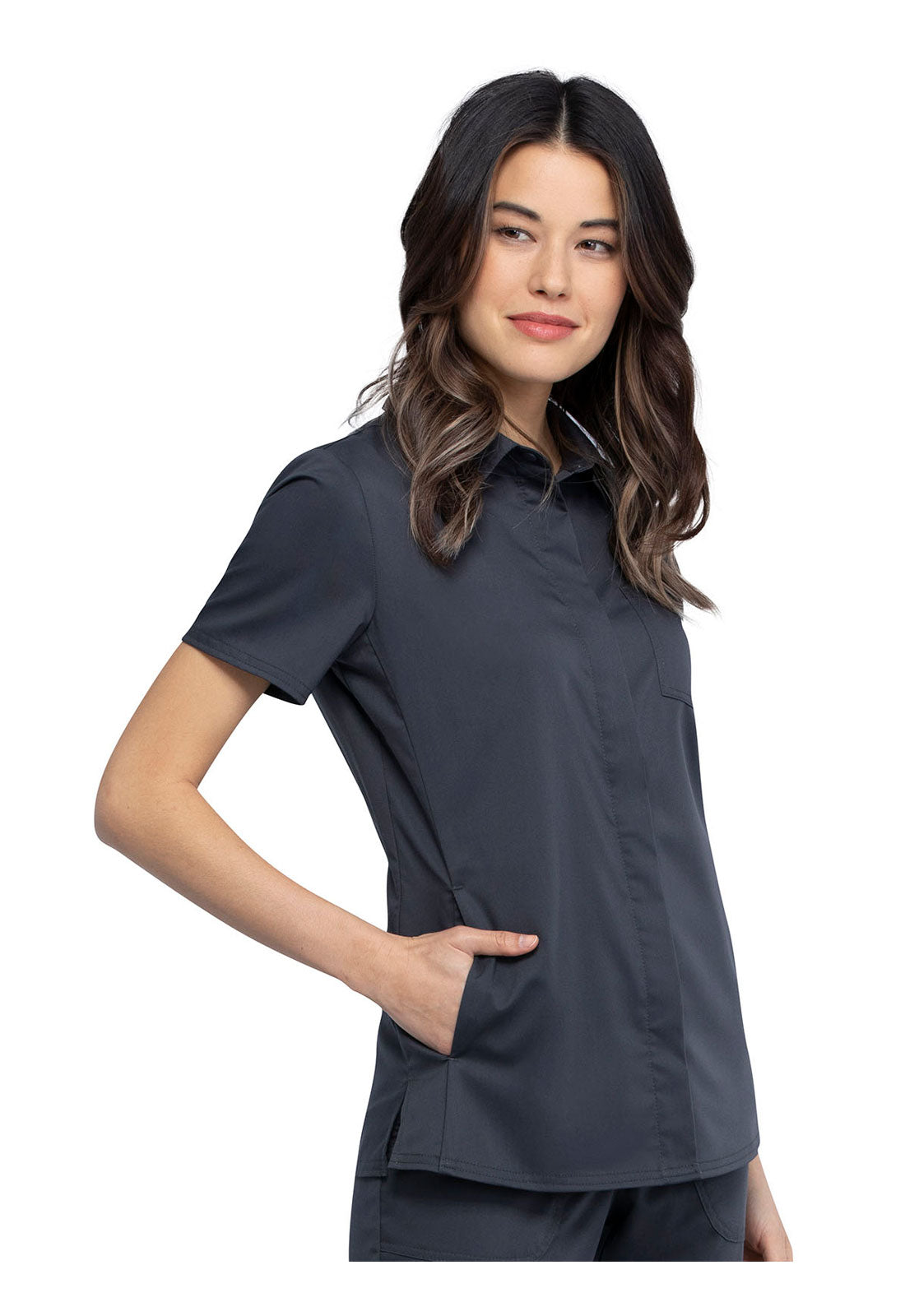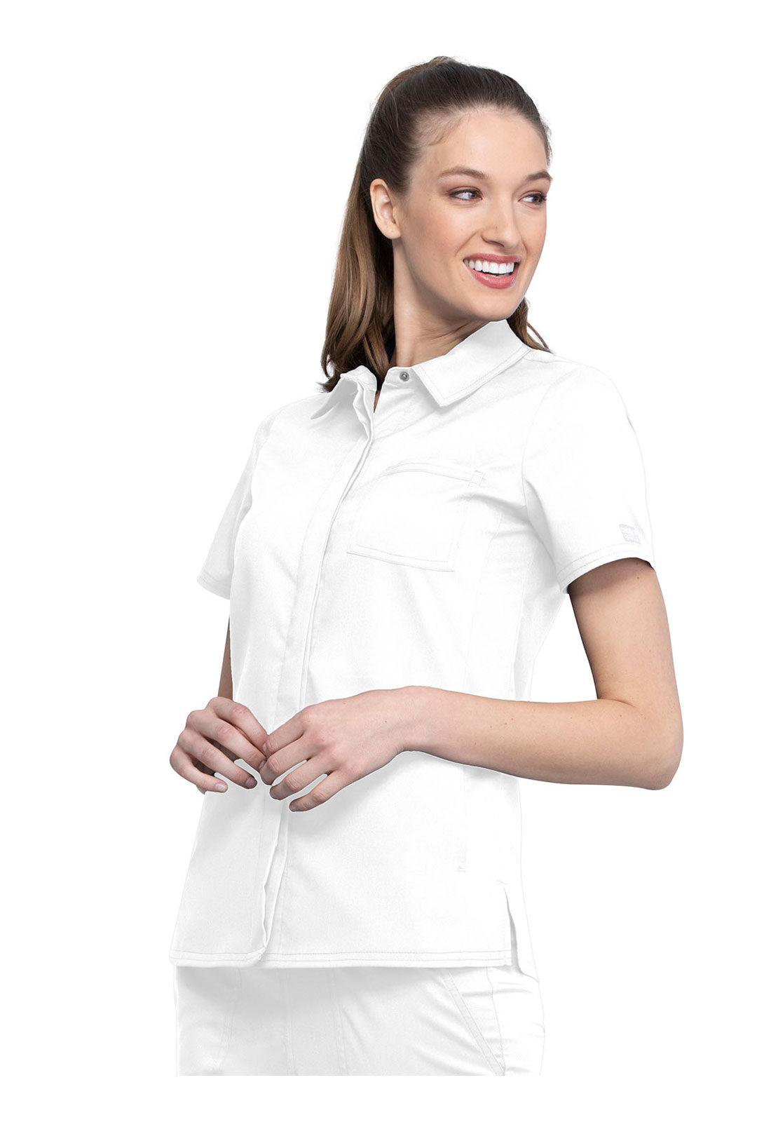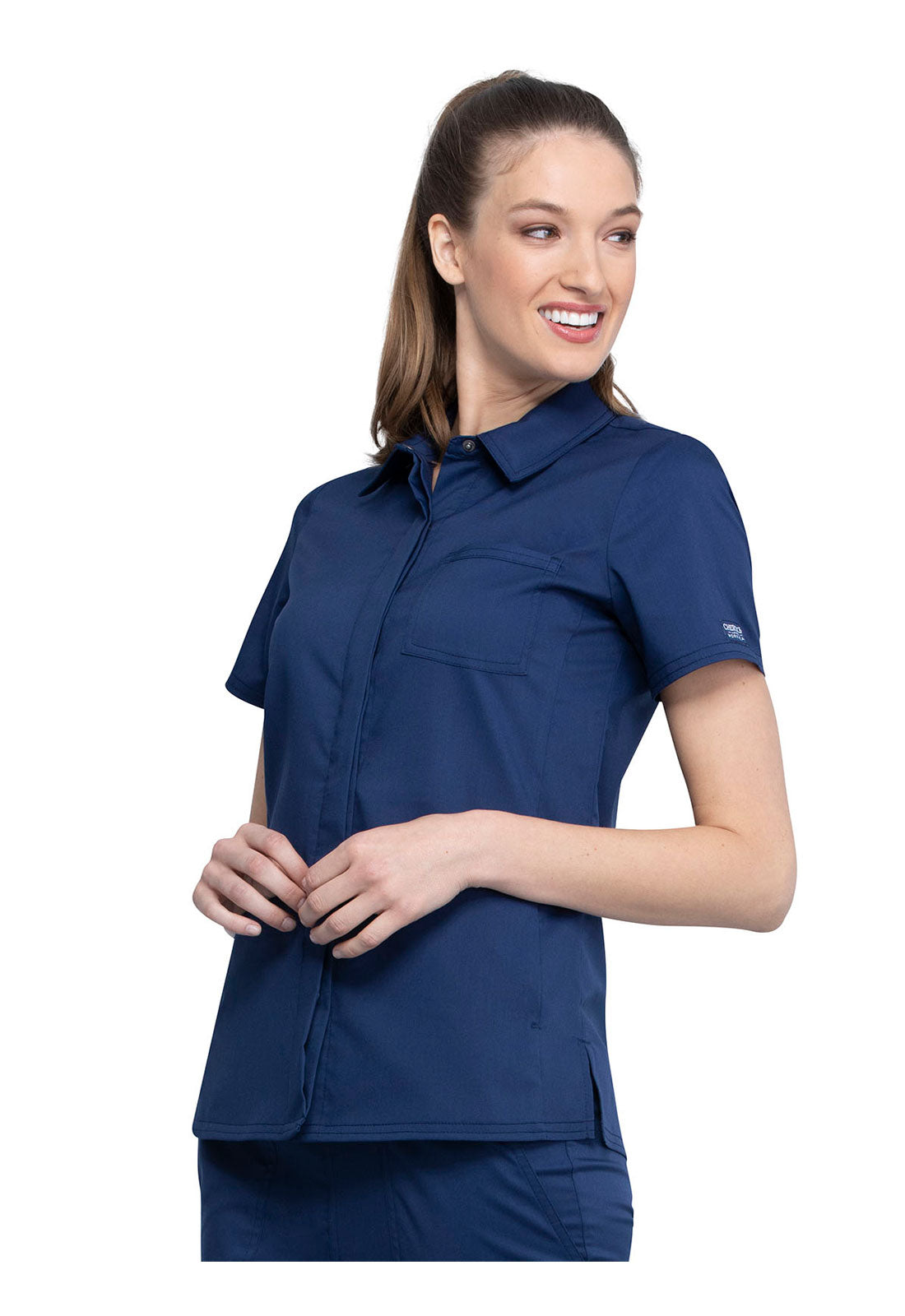 This Modern Classic Fit collared shirt is clean, chic and offers a lot of storage space. Two deep side seam pockets allow easy access to your belongings and a chest pocket adds to the tailored look. An added back pleat and hidden snap front placket create an effortlessly classic top. Center back length: 26"