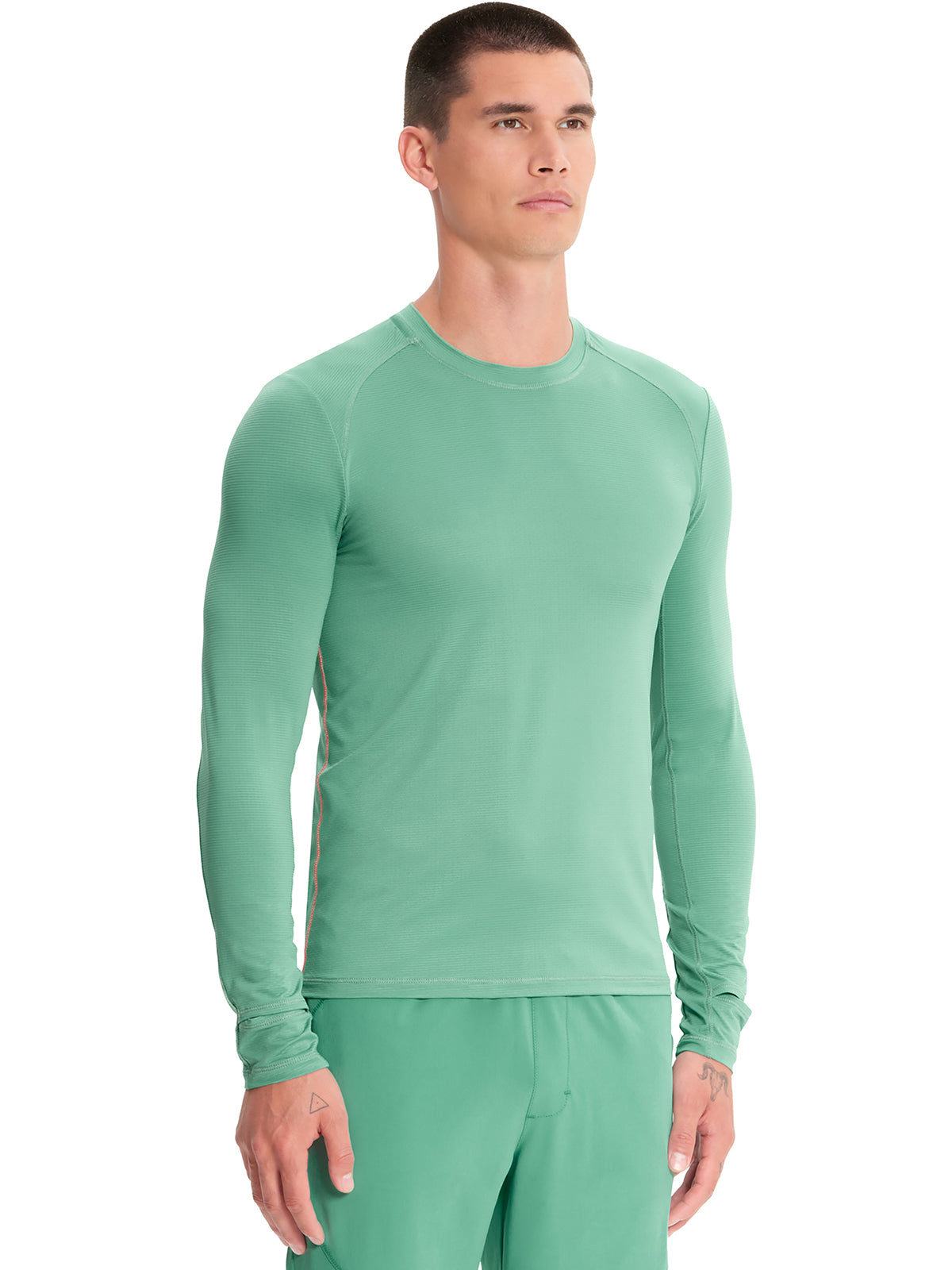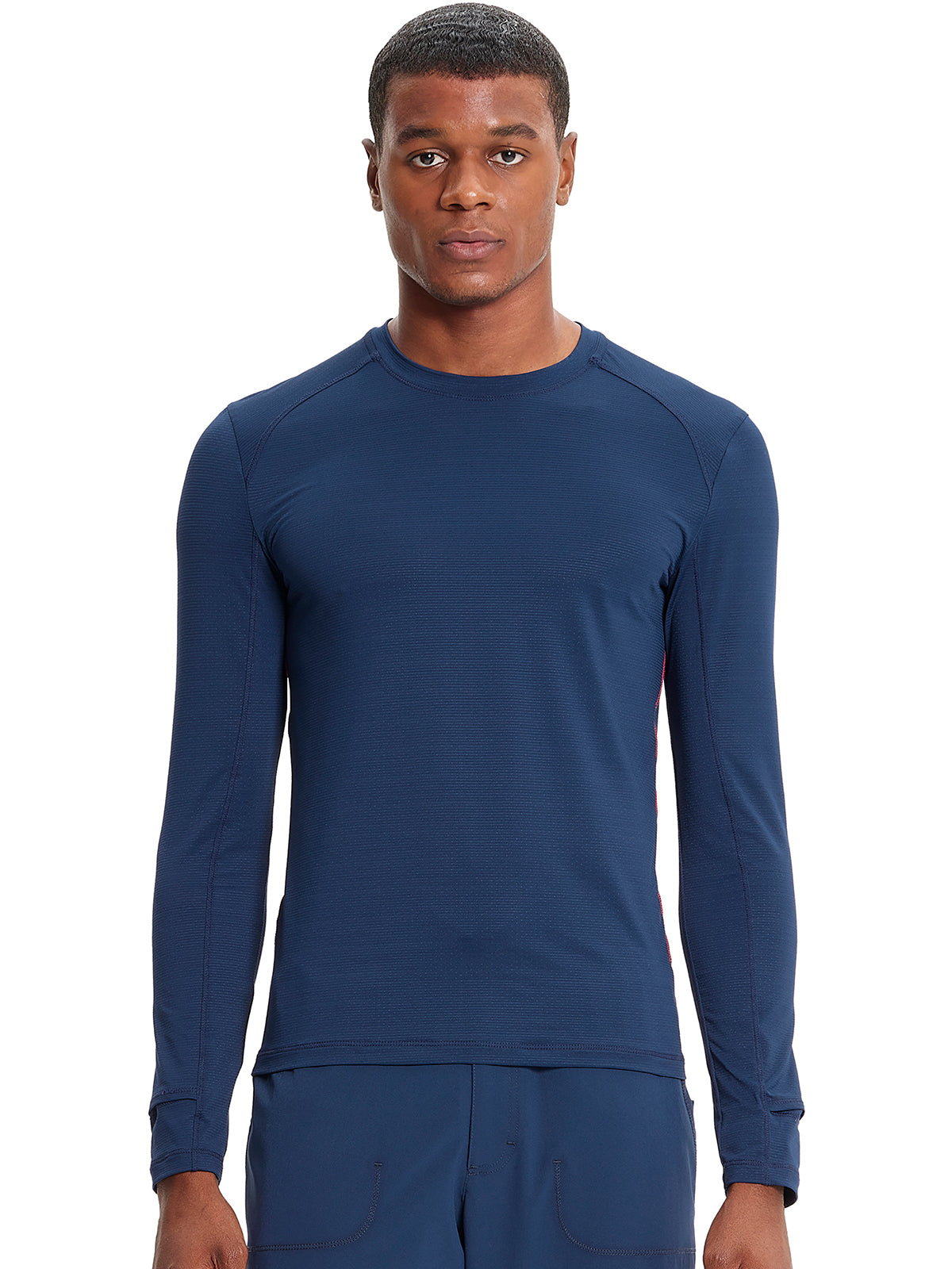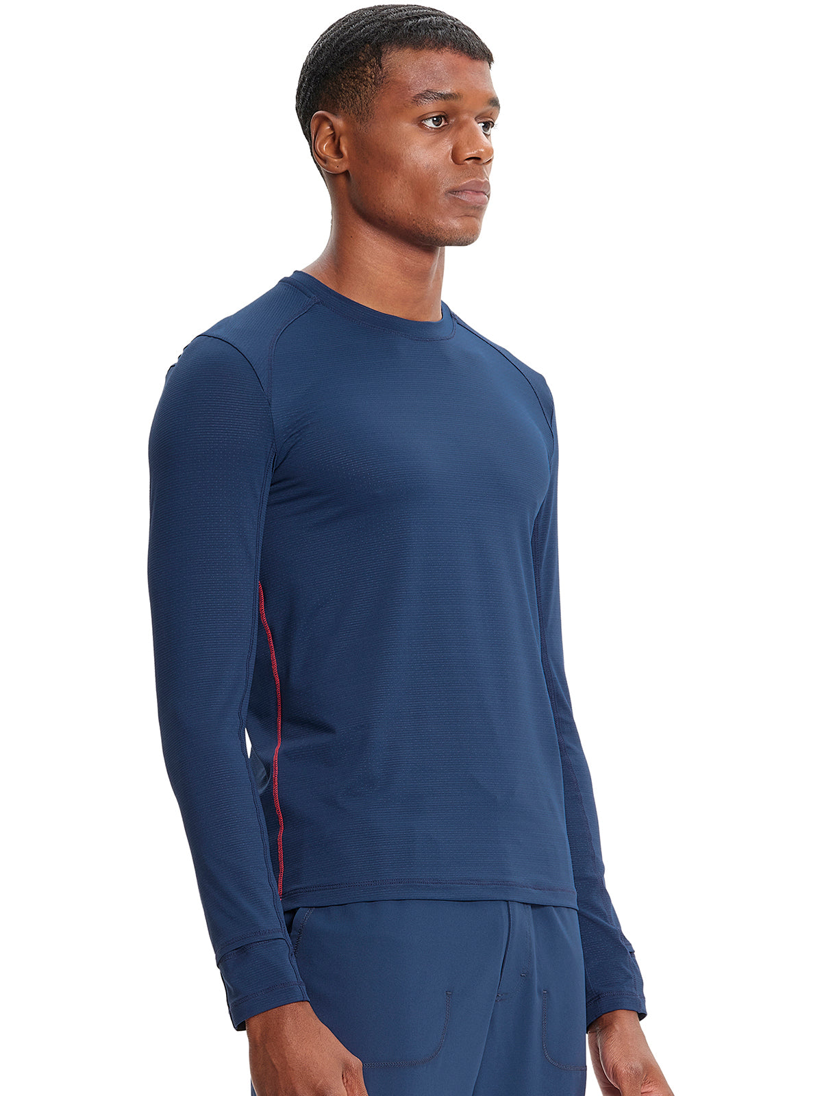 This Men's fit performance underscrub has a round neck and long sleeves with a watch slot on the cuffs. There are stylized seams with coverstitching throughout. Contrast stitching on side seams adds extra detailing. Moisture wicking technology moves perspiration away from the body to keep wearer feeling cool, dry, and more comfortable. Center back length: 26 ½"