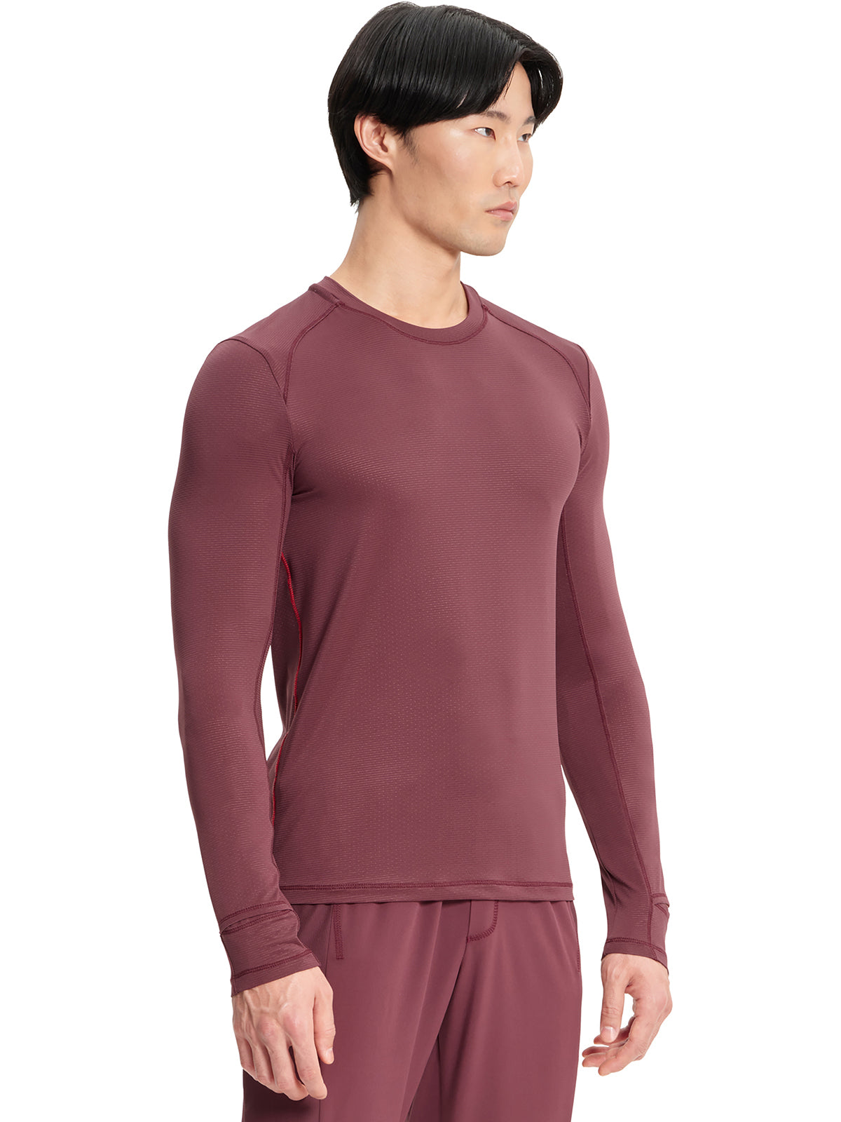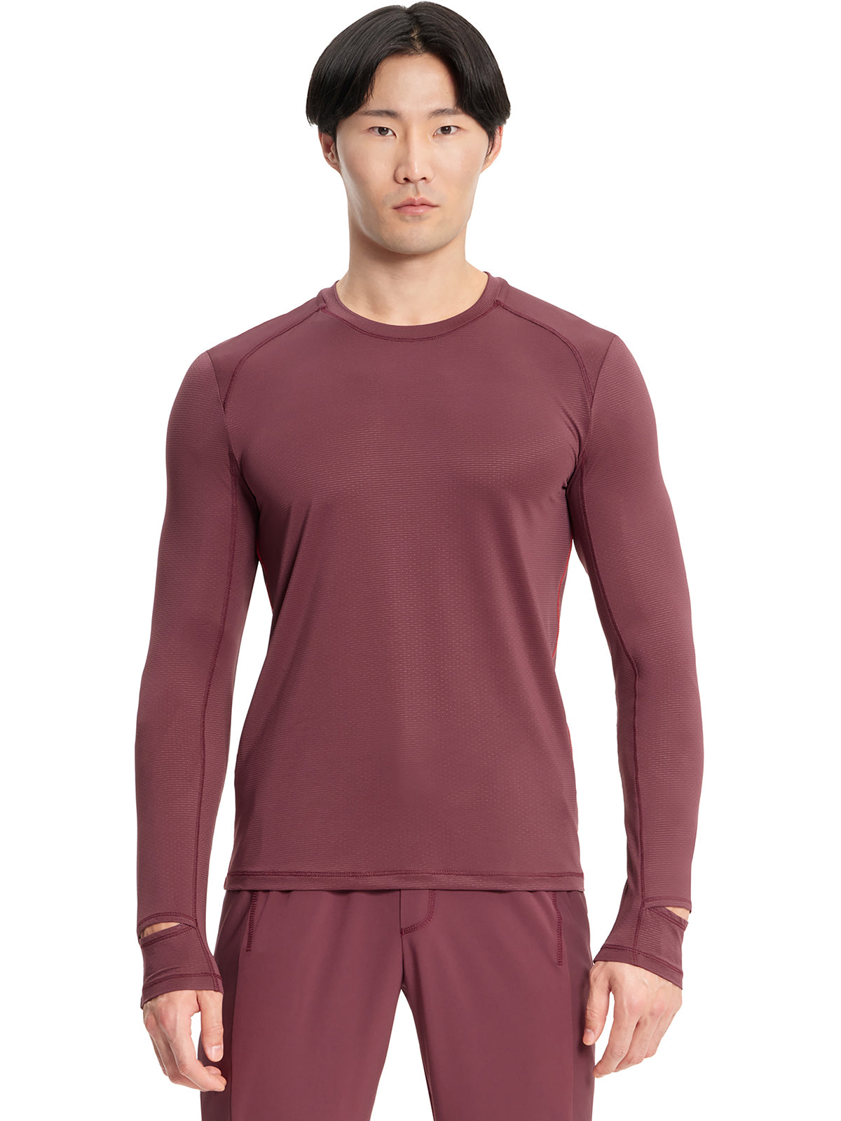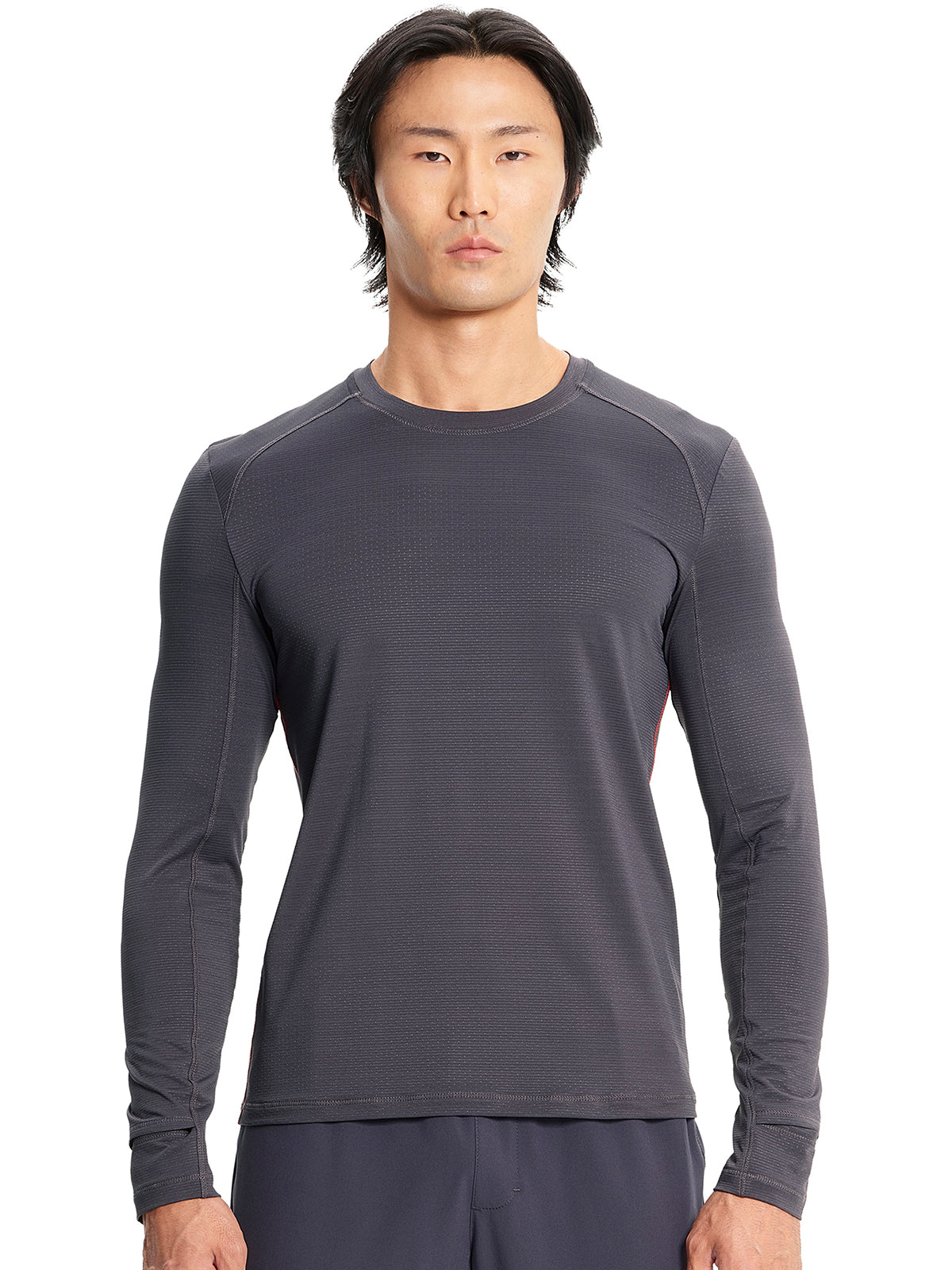 This Men's fit performance underscrub has a round neck and long sleeves with a watch slot on the cuffs. There are stylized seams with coverstitching throughout. Contrast stitching on side seams adds extra detailing. Moisture wicking technology moves perspiration away from the body to keep wearer feeling cool, dry, and more comfortable. Center back length: 26 ½"