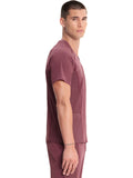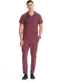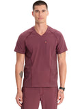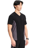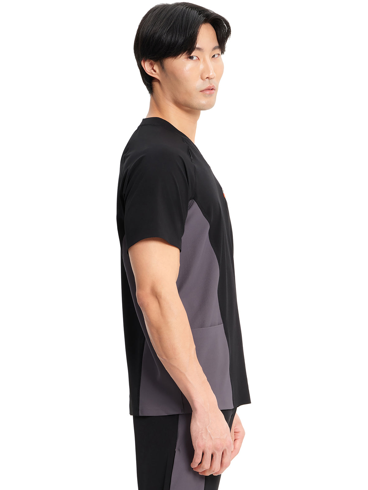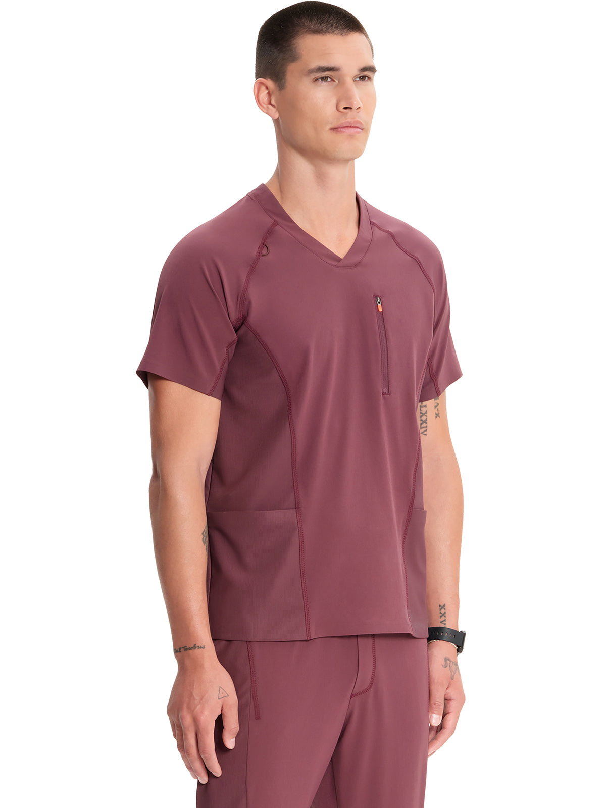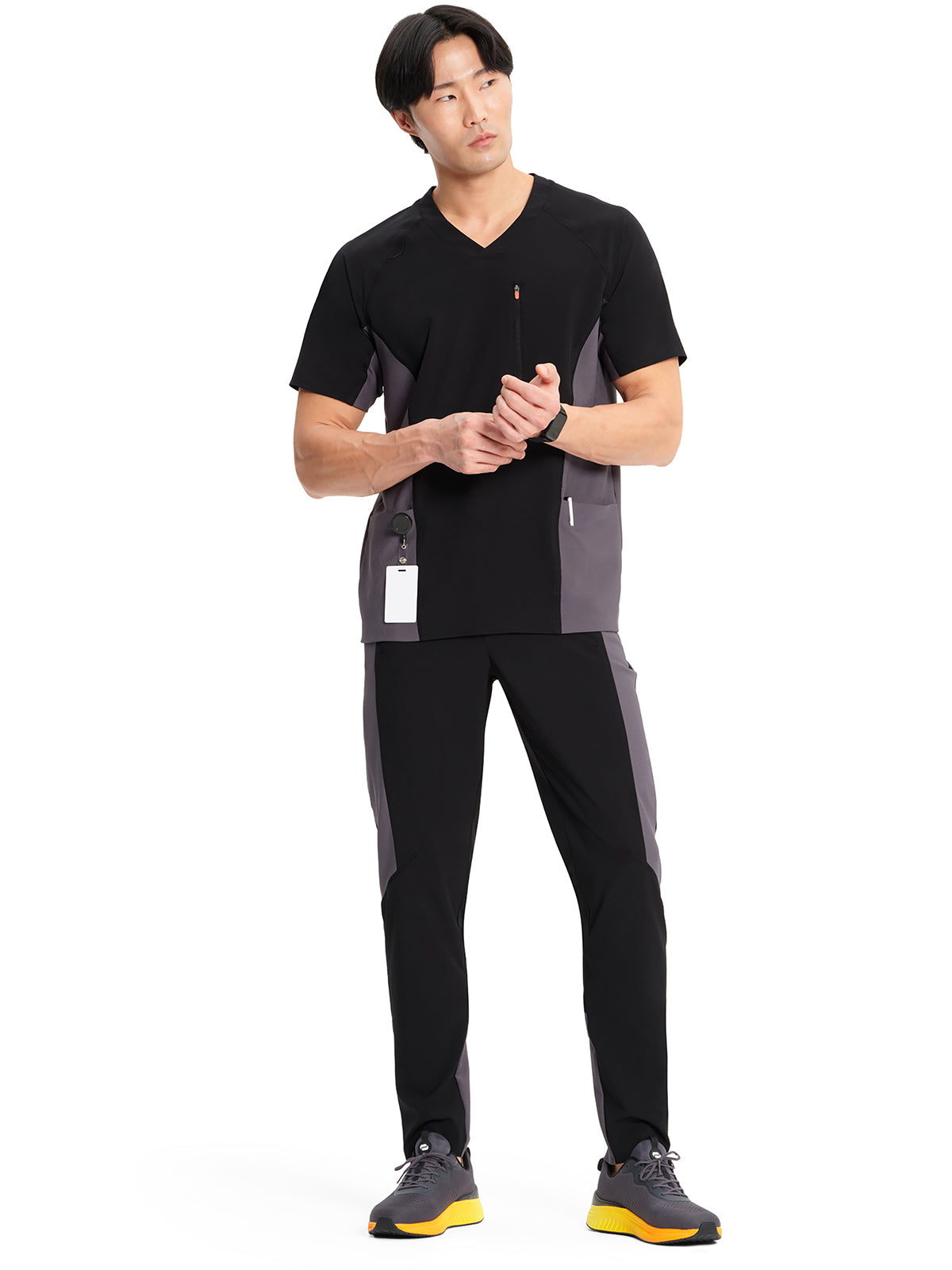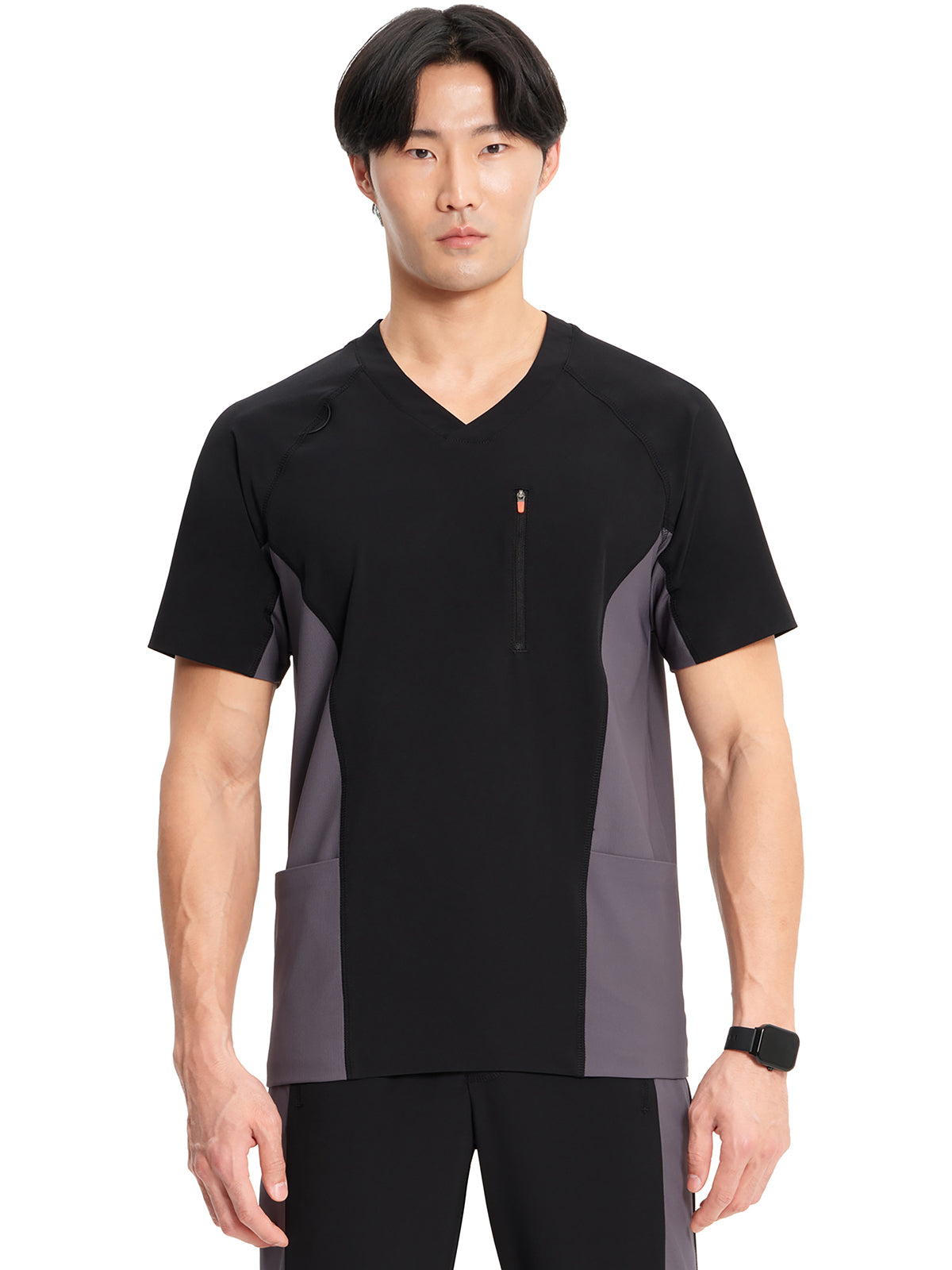 With athletic-inspired fabric and trim, this Men's v-neck scrub top includes a bungee ID badge loop on the wearer's right shoulder. Raglan sleeves for a sporty look. Rib-knit panels sleeve and side panels for style and stretch. There are three pockets to store supplies: one zipper chest pocket with contrast colored rubber-tipped zipper pull and two lower pockets. Front and back seams provide a better fit. Bonded sleeve and bottom hems for a cleaner look. Coverstitched seams for added detailing. Men's Contemporary fit. Center back length (size Medium): 27 ½"