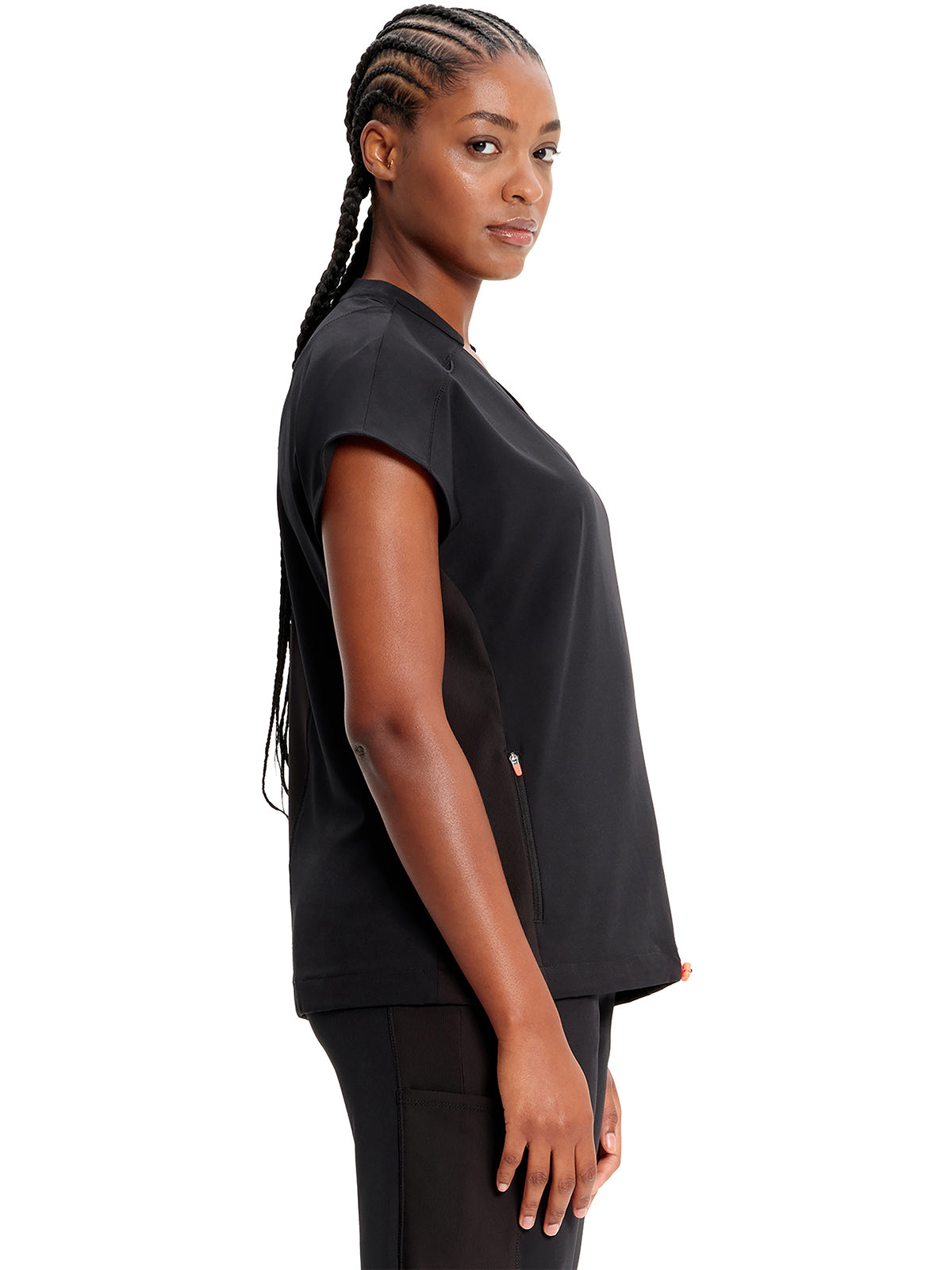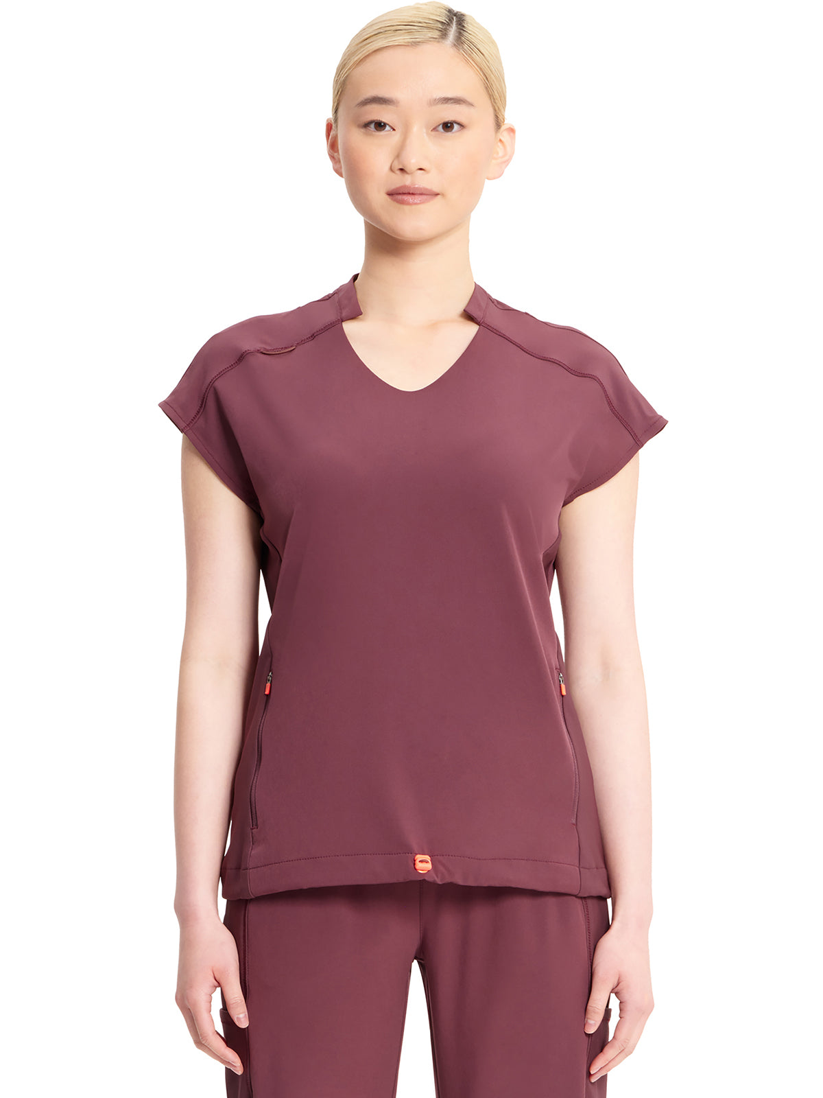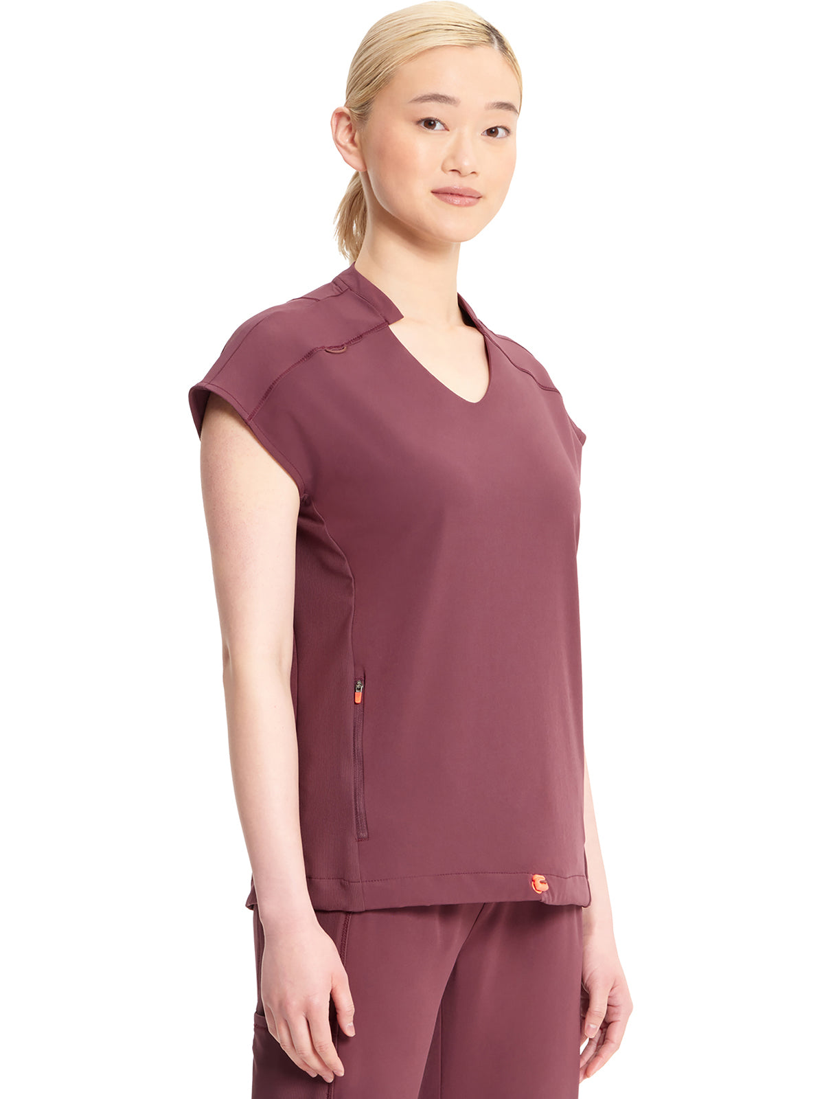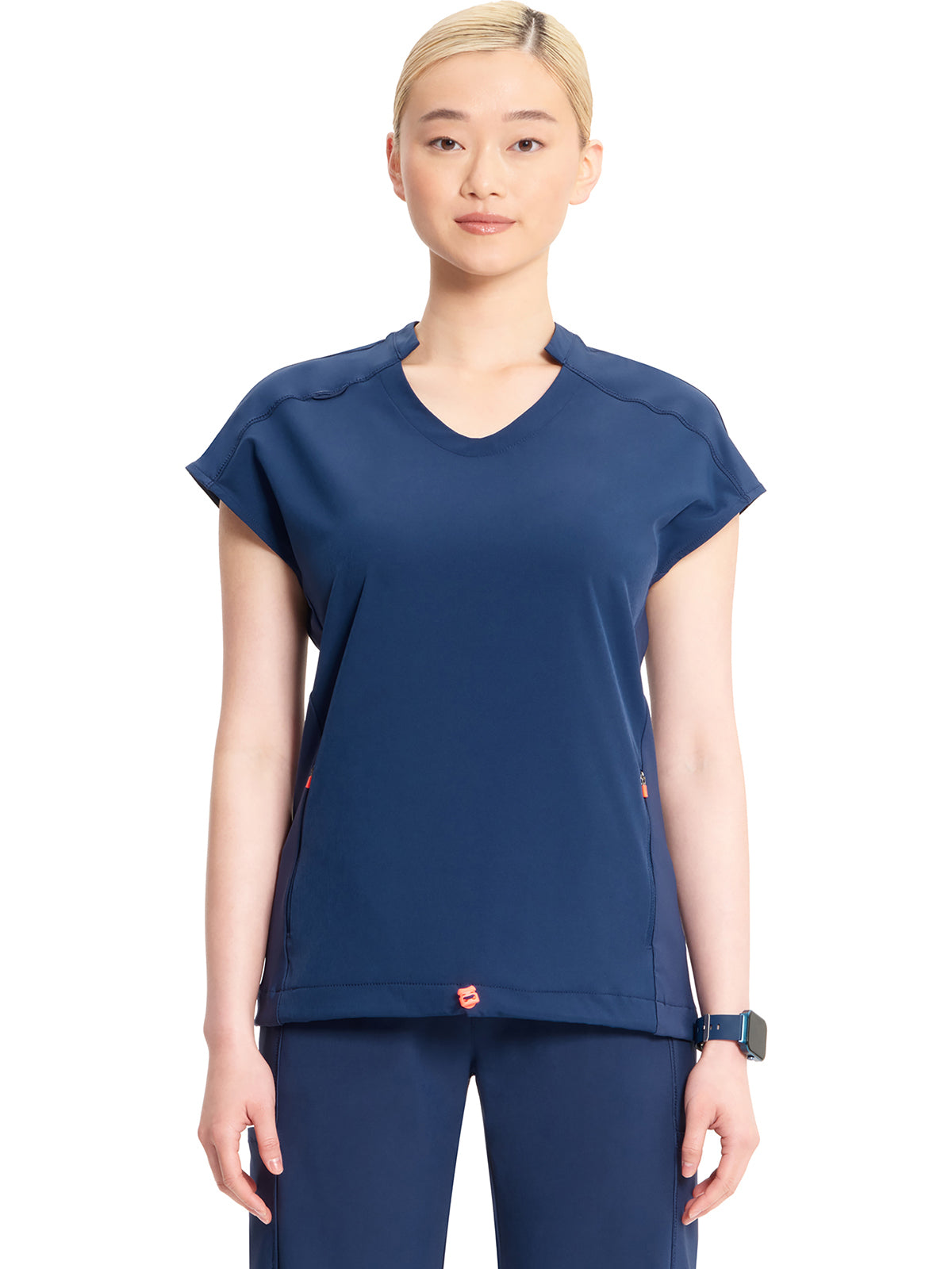 With athletic-inspired fabric, design, and trim, this stylized v-neck scrub top includes dolman sleeves with front seams. There is a bungee ID badge loop on the wearer's right shoulder while two side seam zipper pockets provide secure storage. Tonal rib-knit side panels and center back panel. Pull the bungee cord and secure the contrast colored toggle to create a cinched hem. Contemporary fit. Center back length (size Small): 26"
