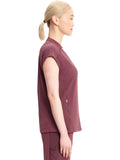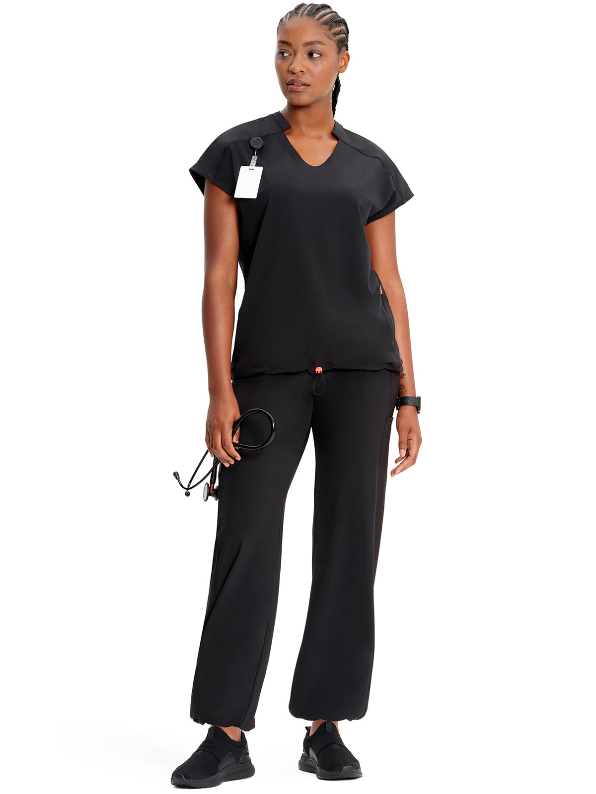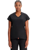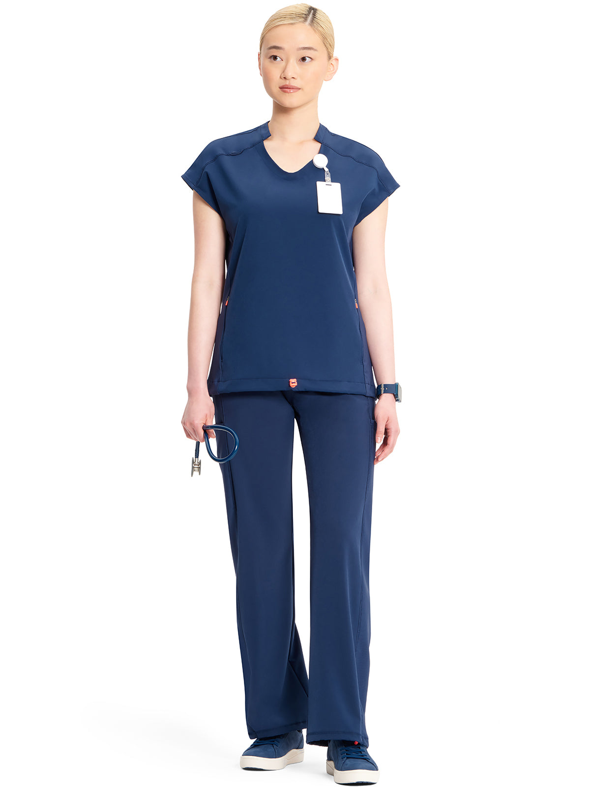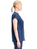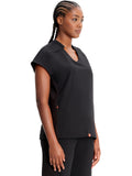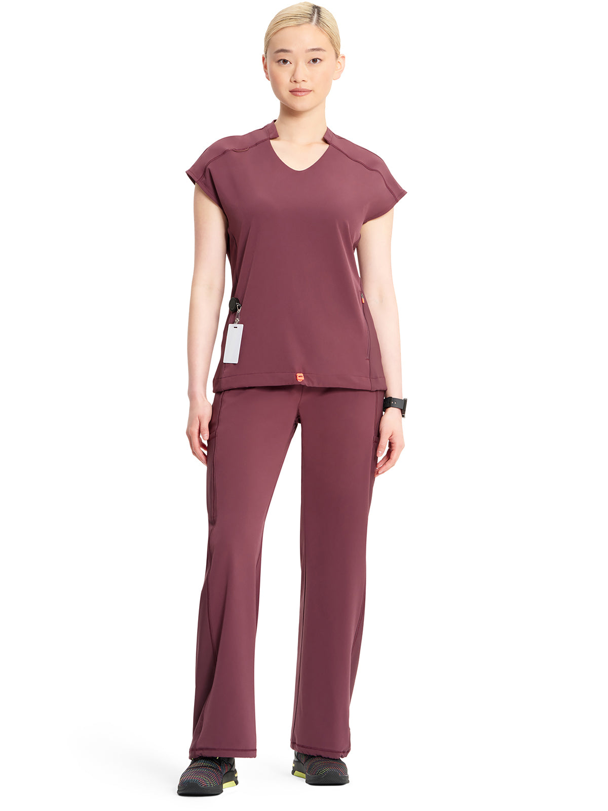 With athletic-inspired fabric, design, and trim, this stylized v-neck scrub top includes dolman sleeves with front seams. There is a bungee ID badge loop on the wearer's right shoulder while two side seam zipper pockets provide secure storage. Tonal rib-knit side panels and center back panel. Pull the bungee cord and secure the contrast colored toggle to create a cinched hem. Contemporary fit. Center back length (size Small): 26"