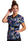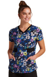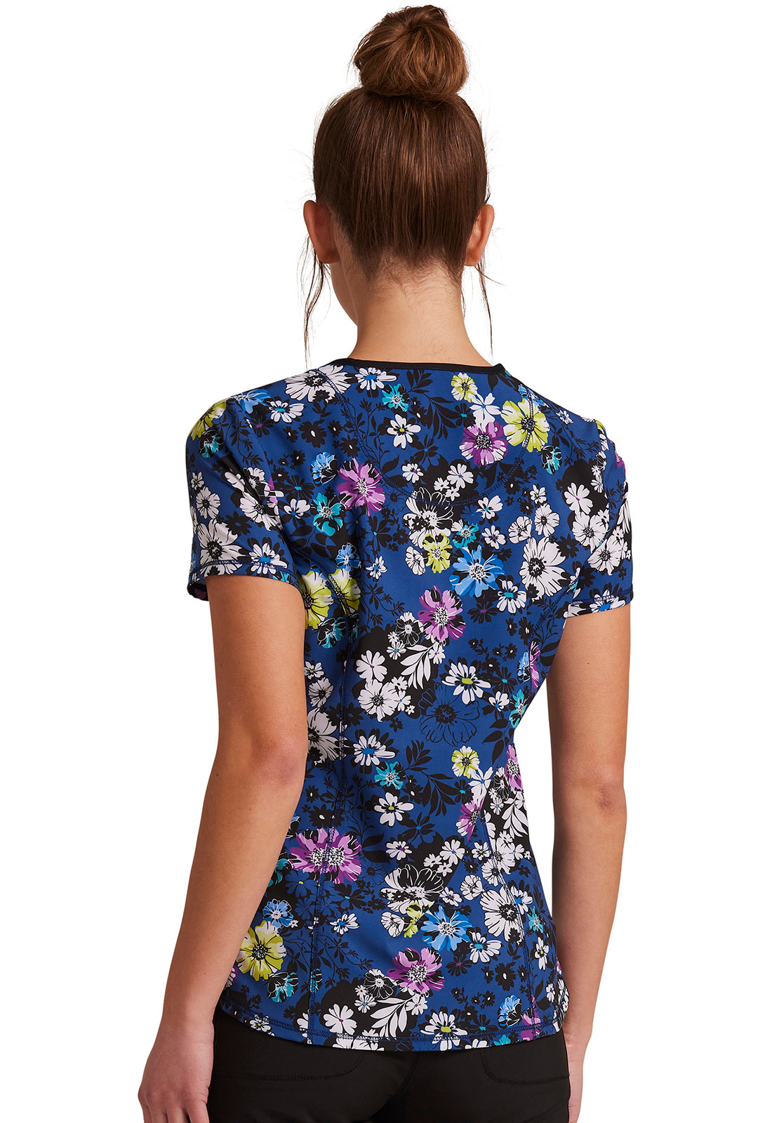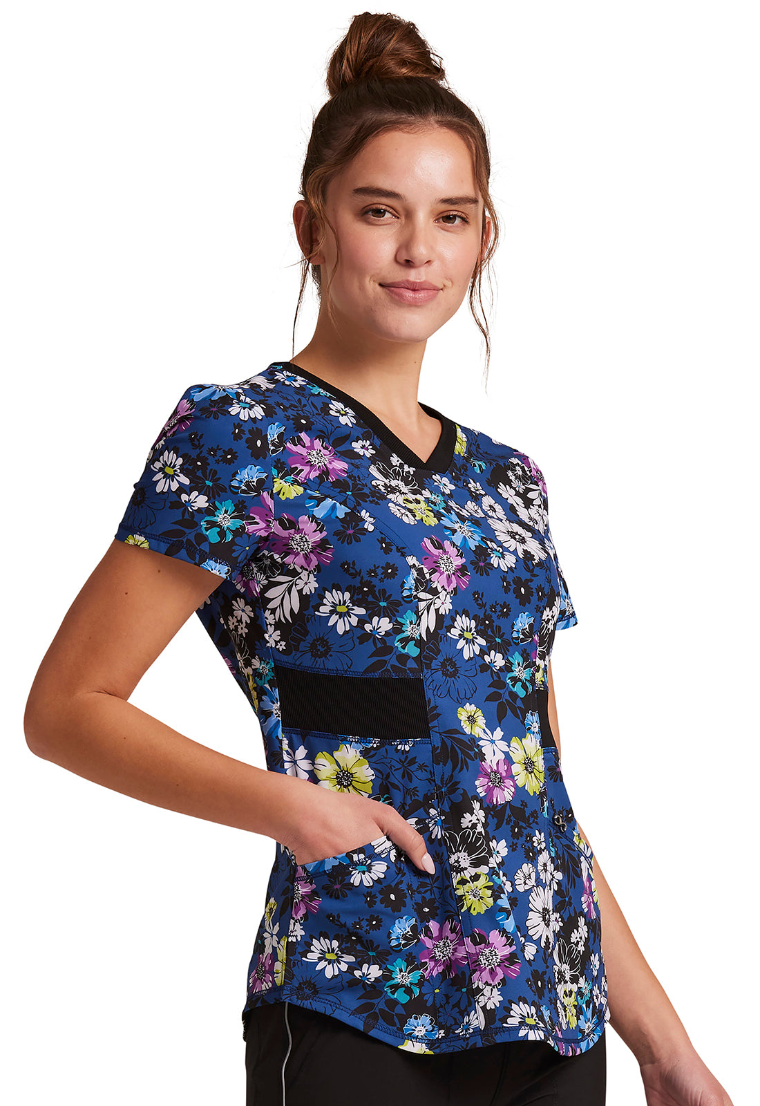 | A Contemporary fit v-neck print top features a rib-knit neckband and waist insets for a slenderizing effect, as well as for extra movement and comfort. Also featured are two patch pockets (right with pen slot), front and back princess seams, a shirttail hem, side vents and coverstitch detail throughout. Center back length: 26". |