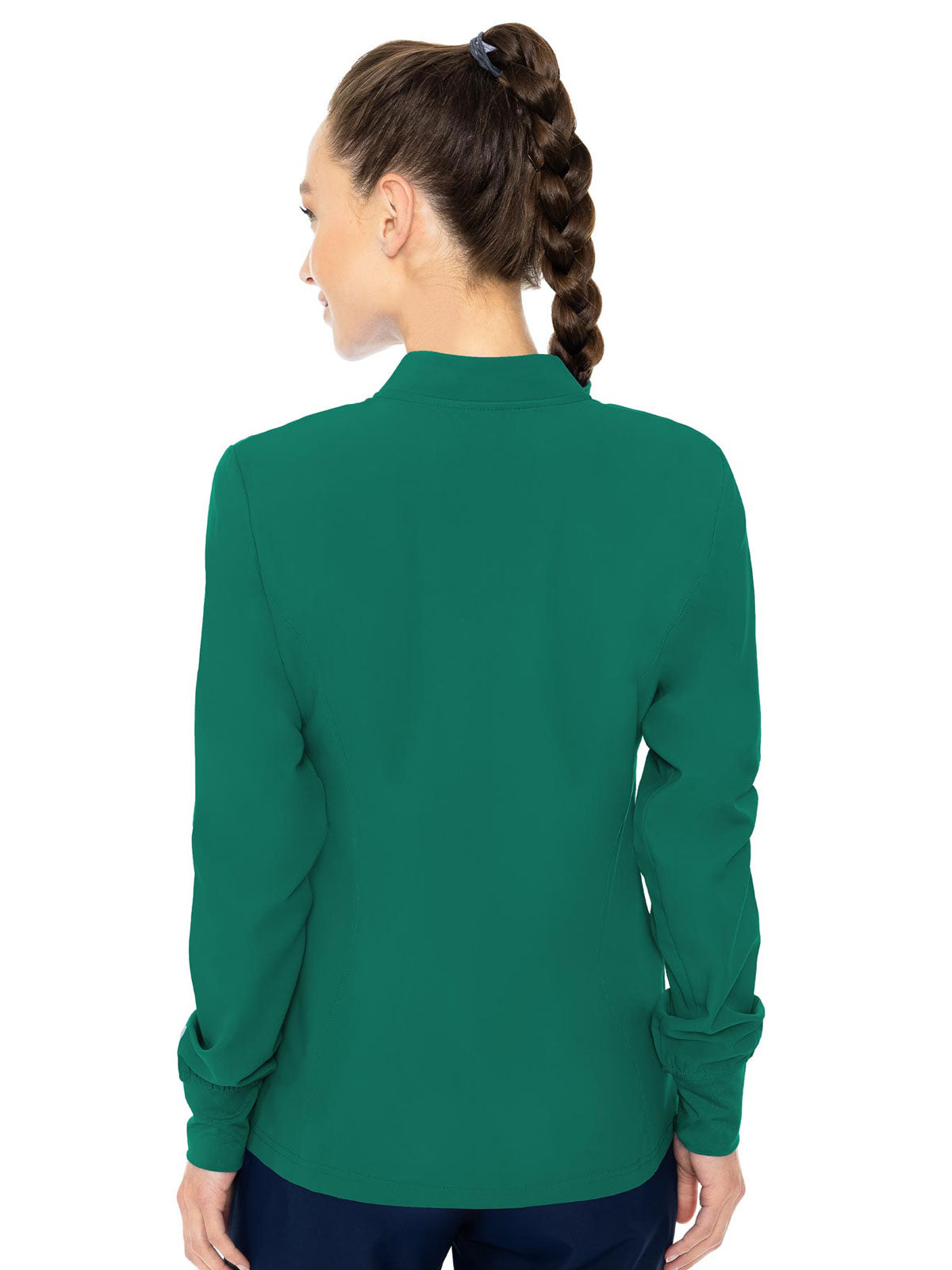 Youre always on. You need a sporty comfy warm up jacket thats not only inspired by activewear-but actively inspiring to wear. The soft knit cuffs and breathable fabric help you keep your cool and the pockets help you keep it all together. | Full zip front| Two patch pockets| One pen pocket| Insight Motion Fabric| R: XS-5X (26in.)