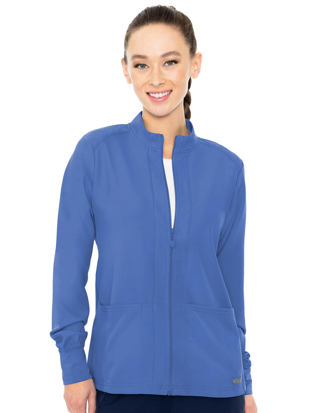 Youre always on. You need a sporty comfy warm up jacket thats not only inspired by activewear-but actively inspiring to wear. The soft knit cuffs and breathable fabric help you keep your cool and the pockets help you keep it all together. | Full zip front| Two patch pockets| One pen pocket| Insight Motion Fabric| R: XS-5X (26in.)
