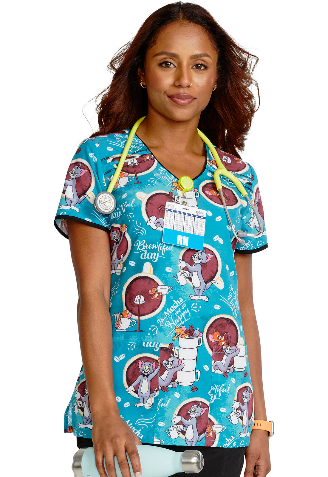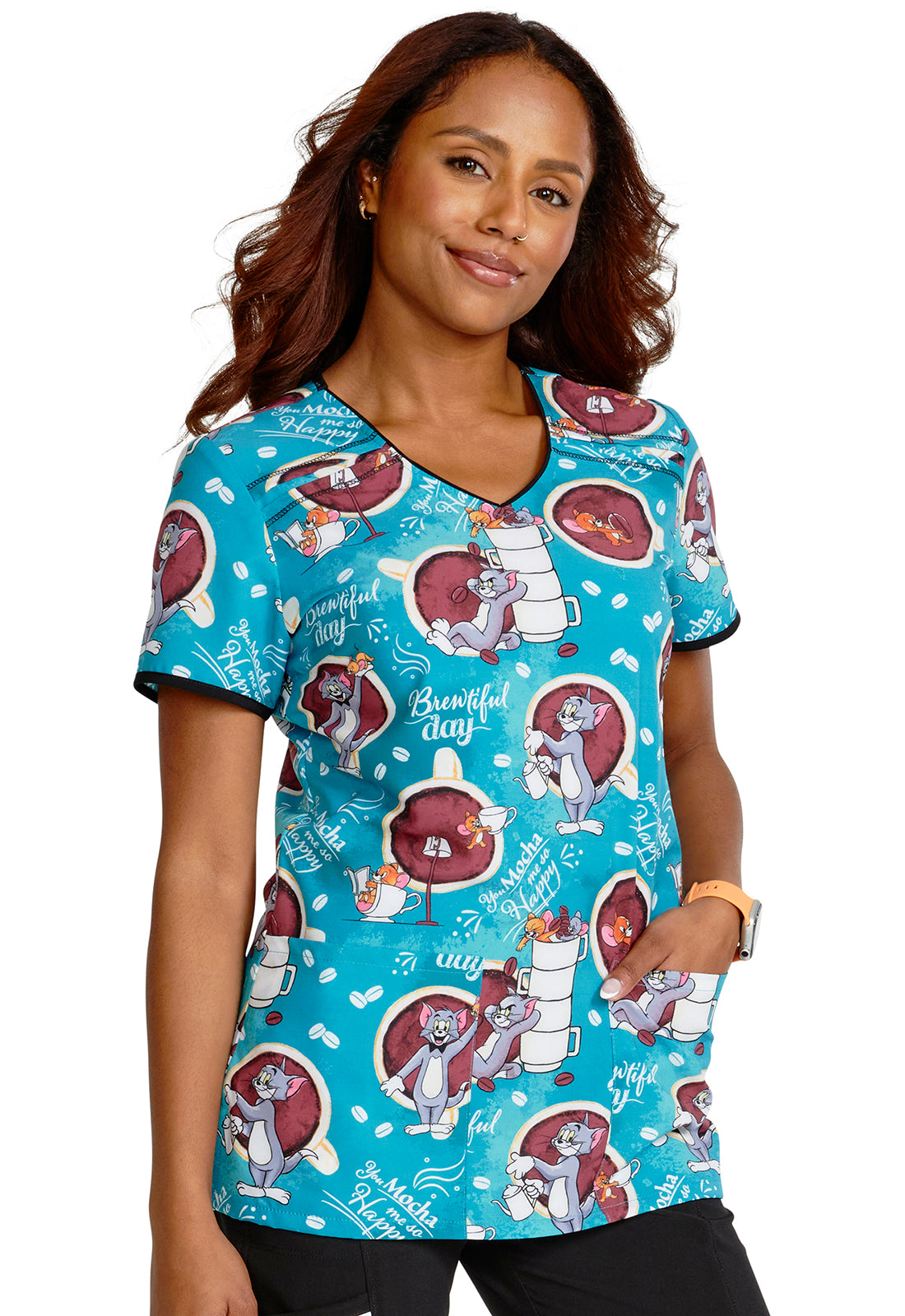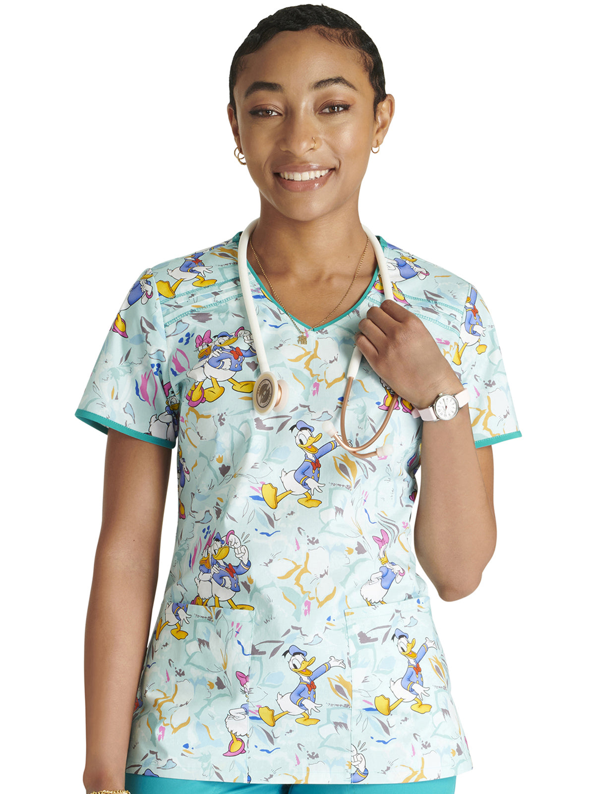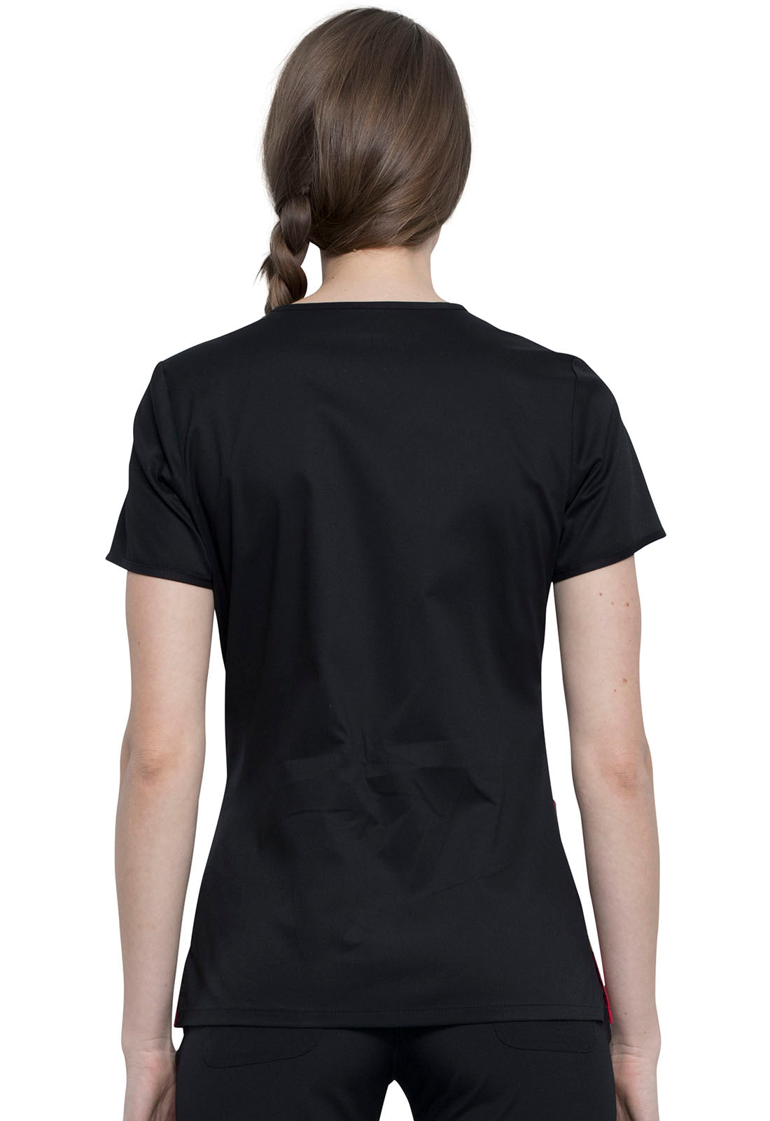 A Modern Classic V-neck top features contrast neck piping, front shoulder yokes and sleeves. Also featured are two front pockets, bust darts, side vents and contrast cover stitch detail. Center back length: 26"