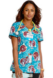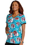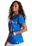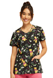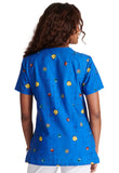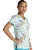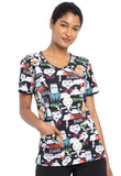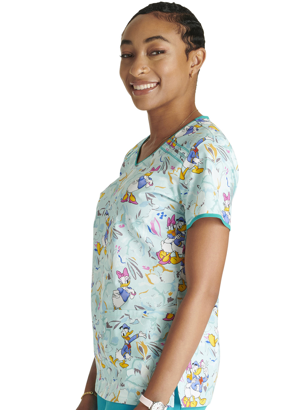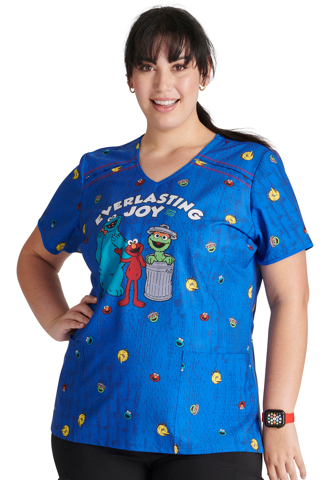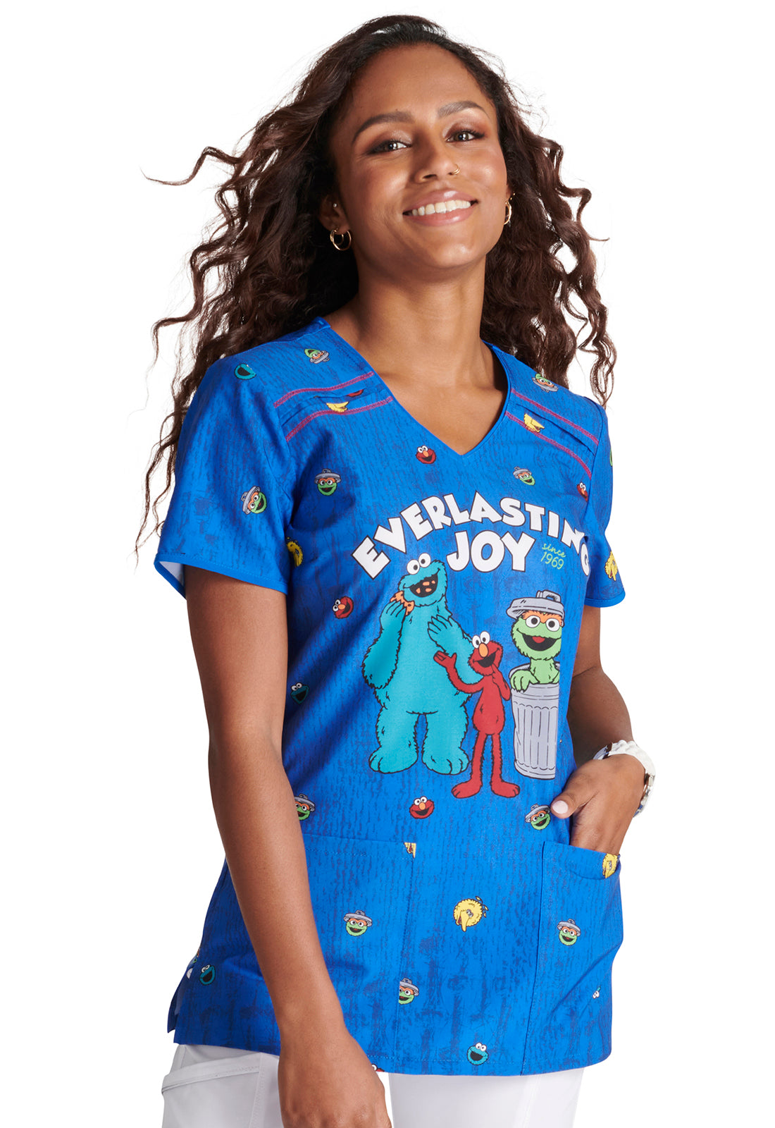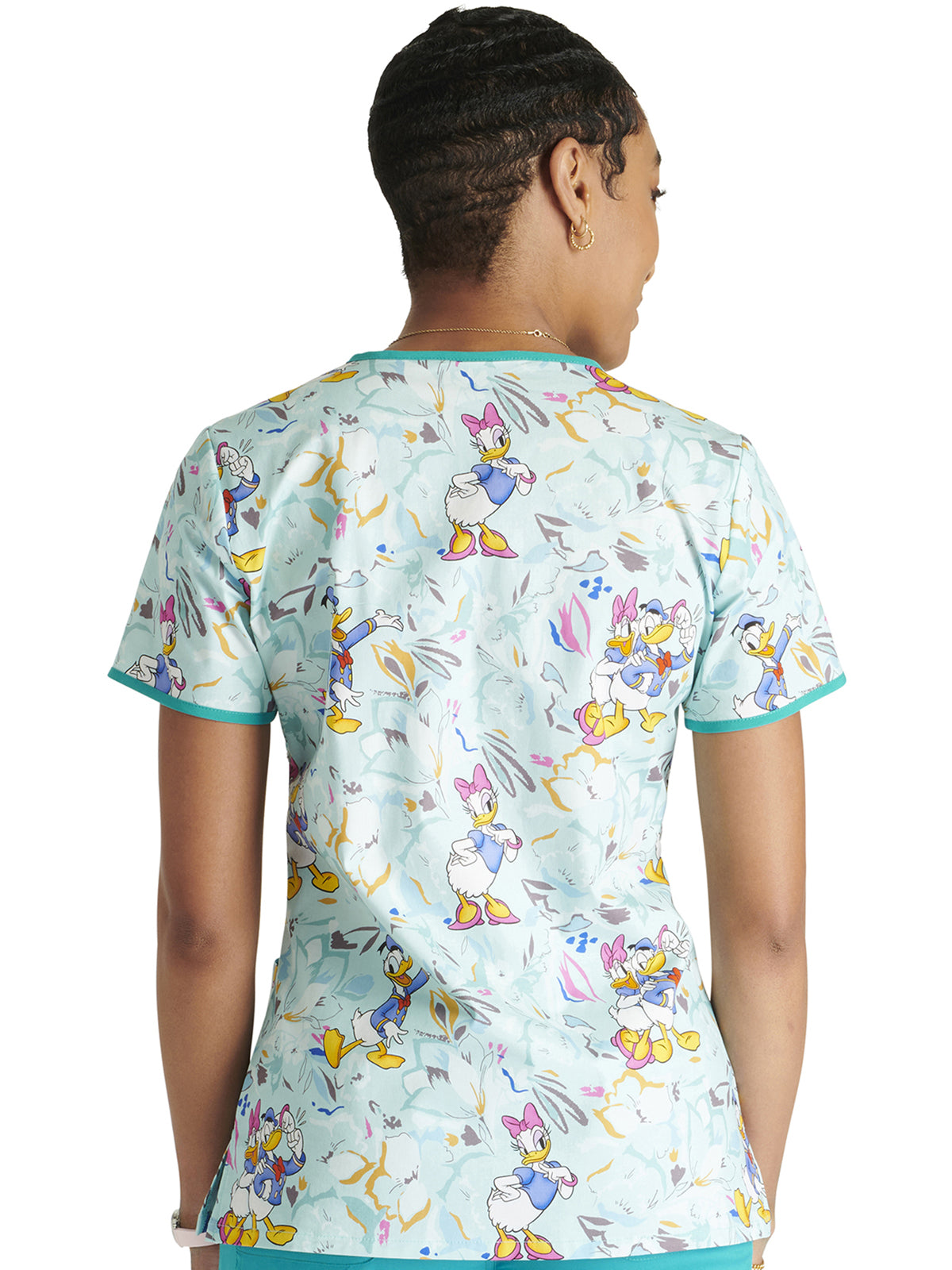 A Modern Classic V-neck top features contrast neck piping, front shoulder yokes and sleeves. Also featured are two front pockets, bust darts, side vents and contrast cover stitch detail. Center back length: 26"