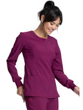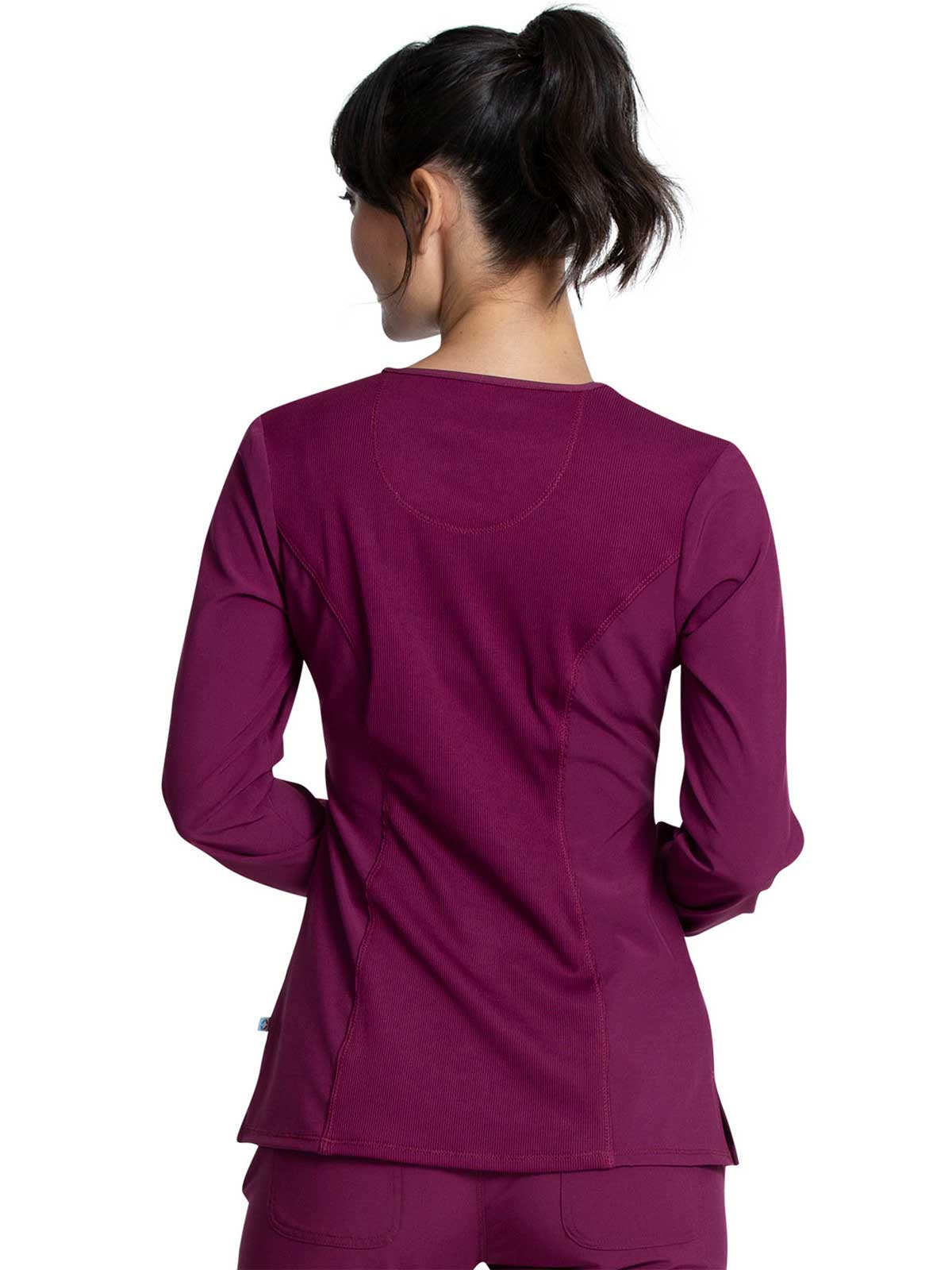 This Contemporary fit, long sleeve V-neck top has front yoke seams and a bungee ID badge loop at the right shoulder. There is rib-knit at the center front neckline inset, center back panel and sleeve cuffs. Other features include front and back princess seams with self strapping along the front seams. There are a total of three pockets: two front patch pockets and one interior cellphone pocket on the right. Side vents complete the look. Center back length: 26"