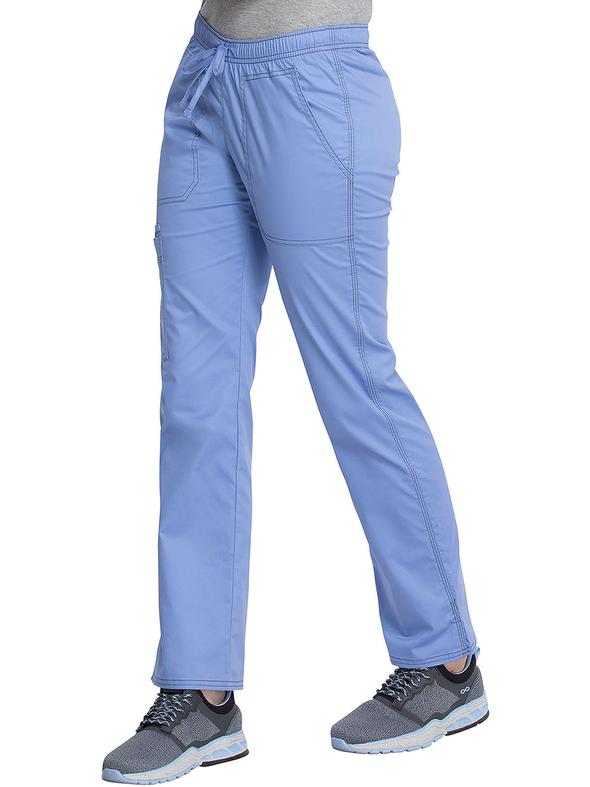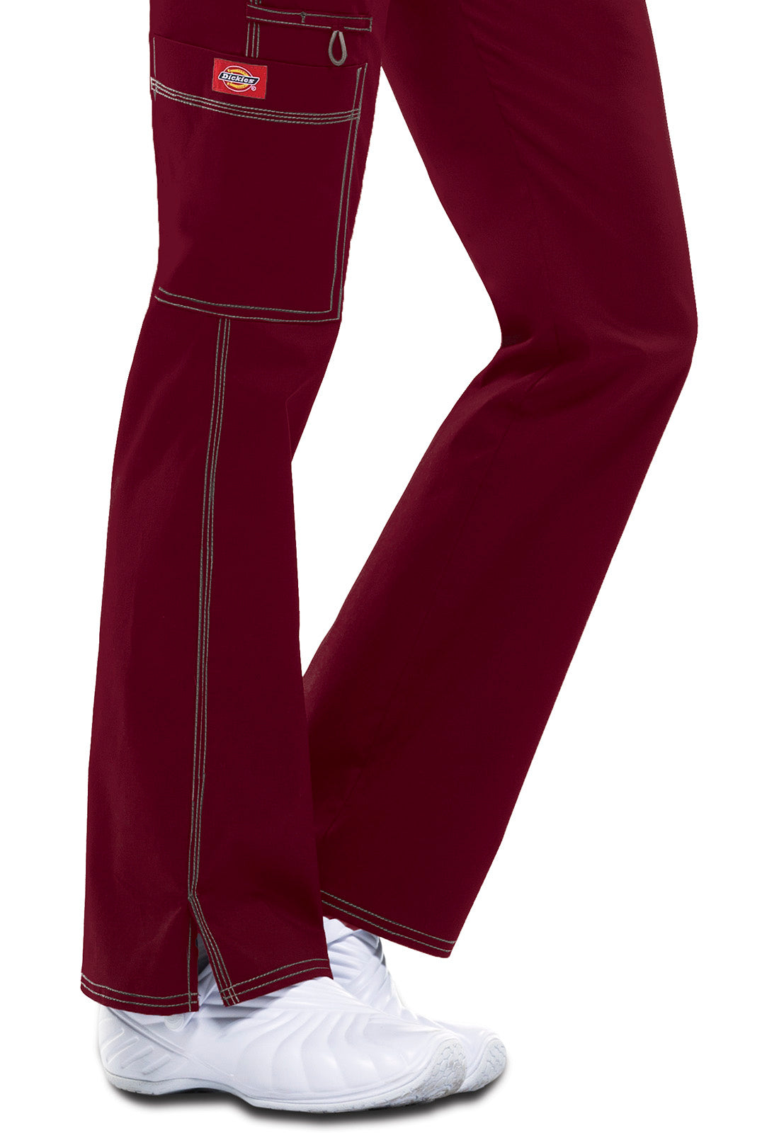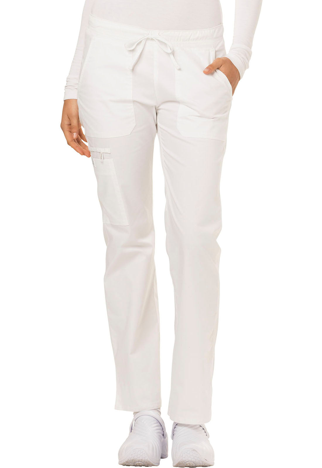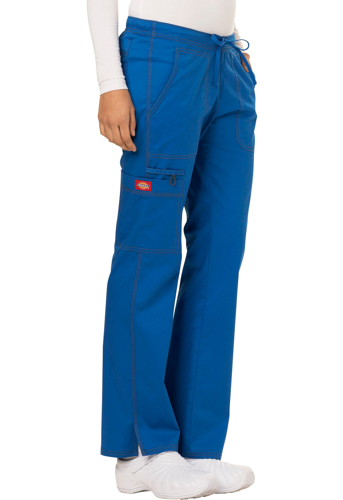 A Contemporary fit, low rise, straight leg pull-on pant features an adjustable drawstring with an all around elastic waistband. Also featured are two front pockets, a back pocket, a cargo pocket, instrument loops, a bungee loop, contrast multi needle topstitching (White takes tonal topstitching) and side vents. Inseam: 30 1/2"