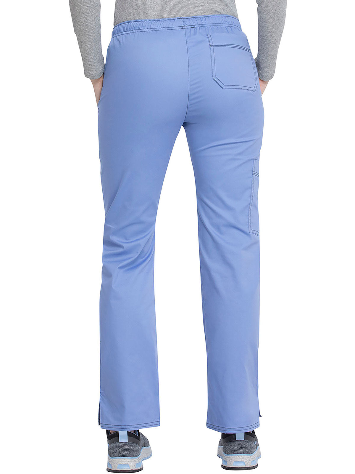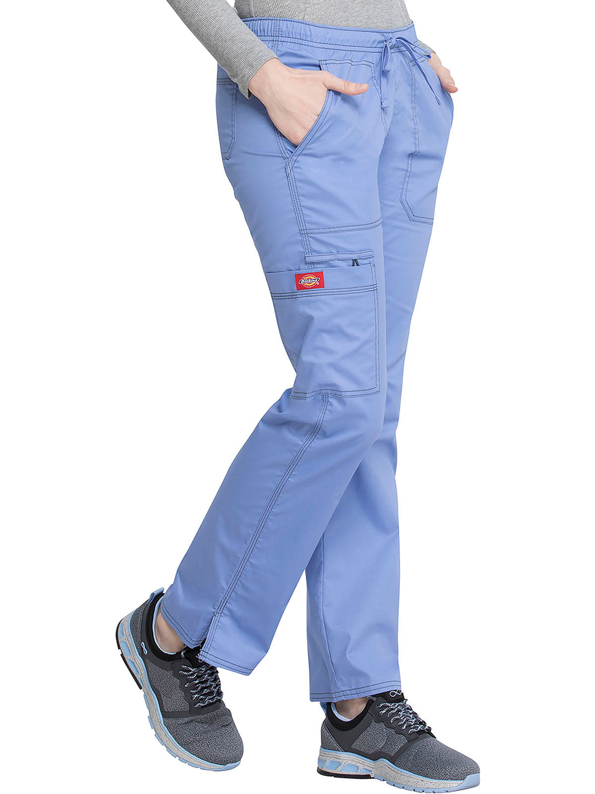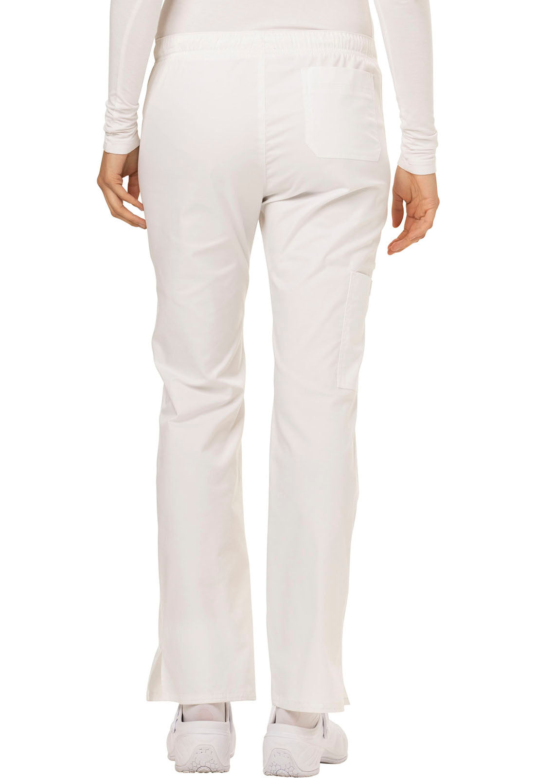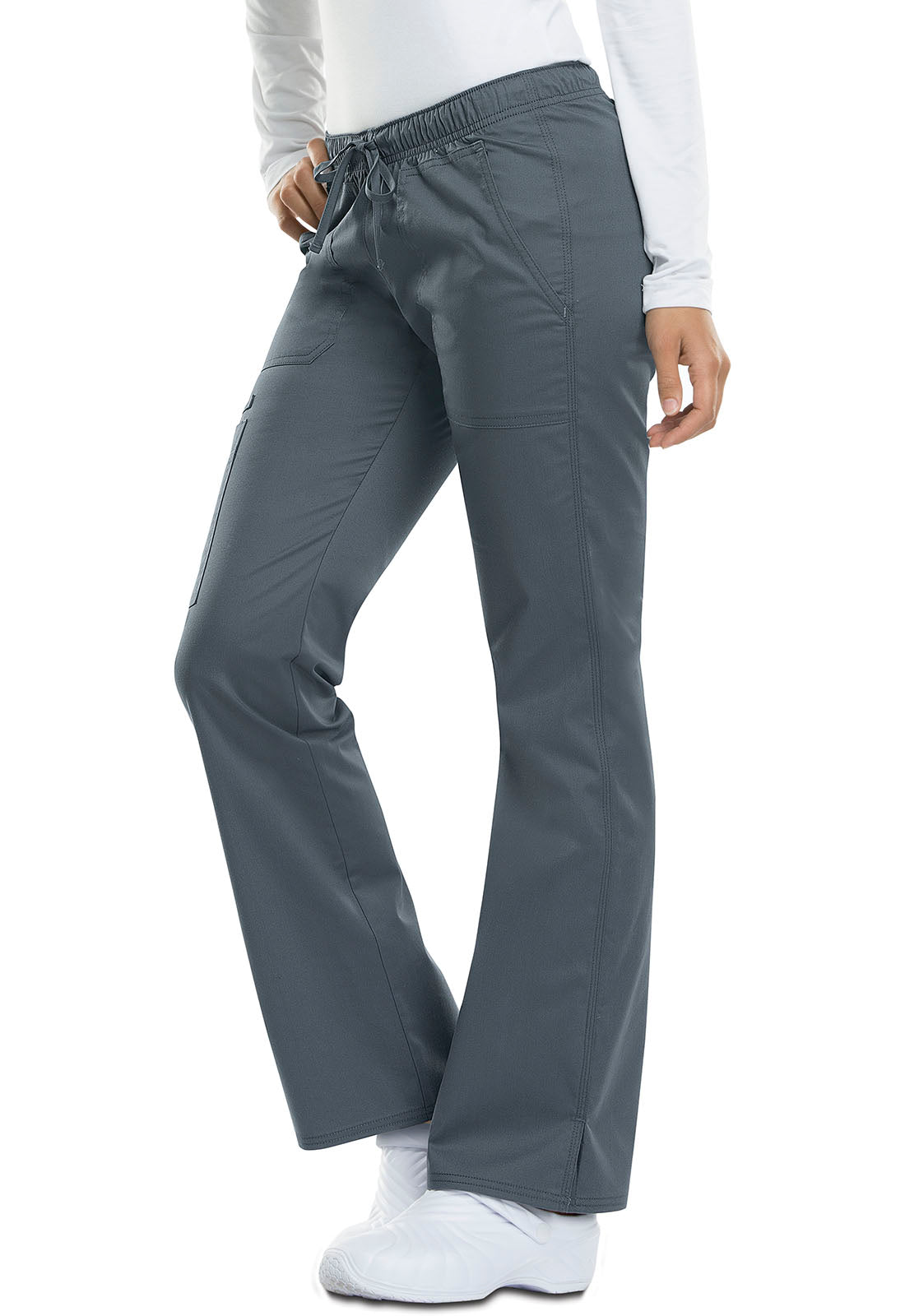 A Contemporary fit, low rise, straight leg pull-on pant features an adjustable drawstring with an all around elastic waistband. Also featured are two front pockets, a back pocket, a cargo pocket, instrument loops, a bungee loop, contrast multi needle topstitching (White takes tonal topstitching) and side vents. Inseam: 30 1/2"