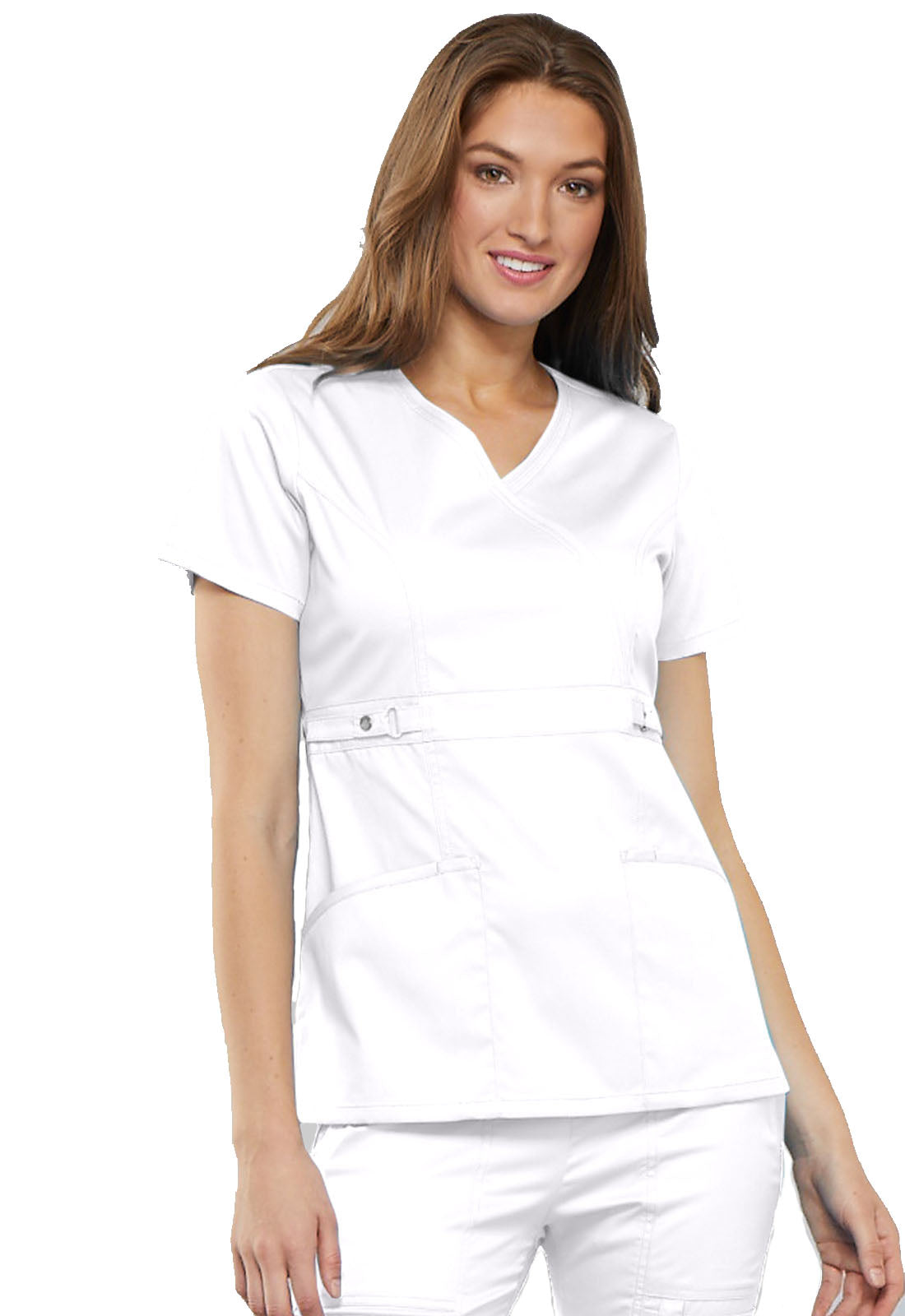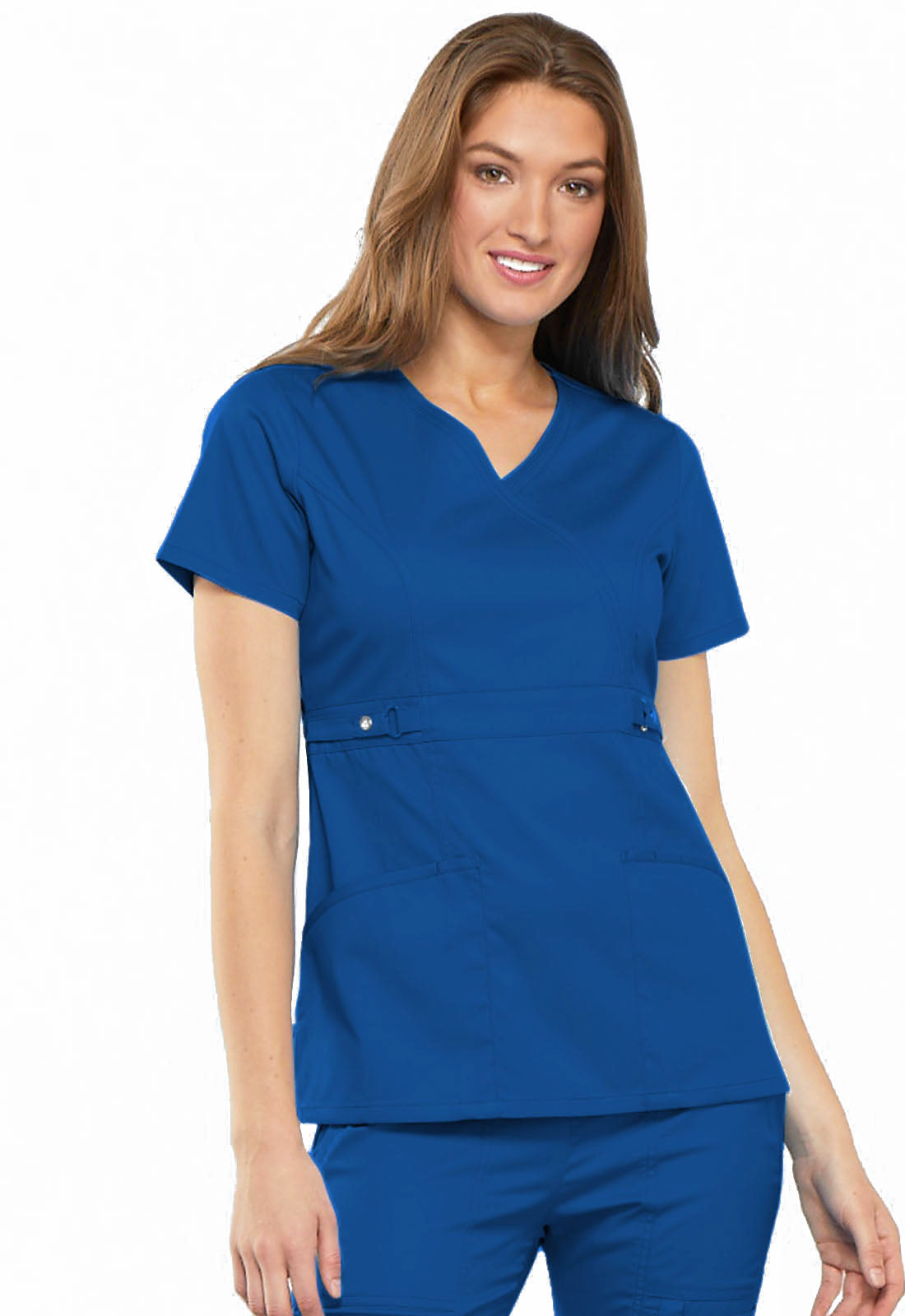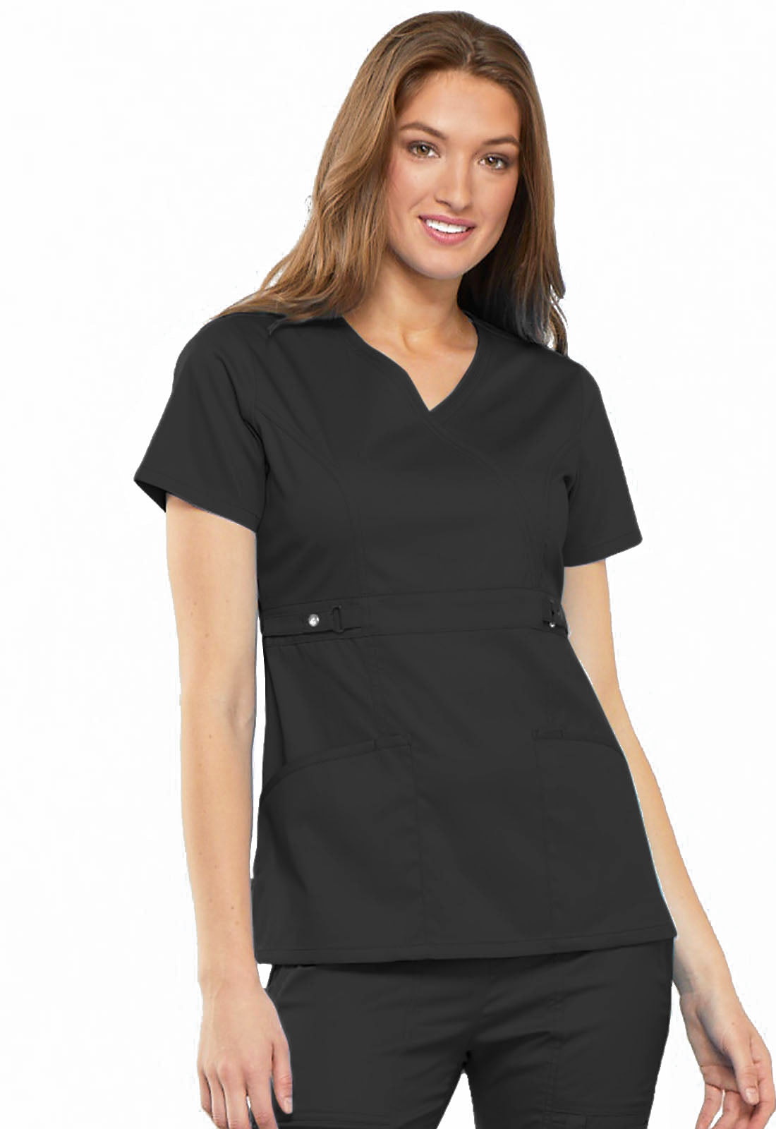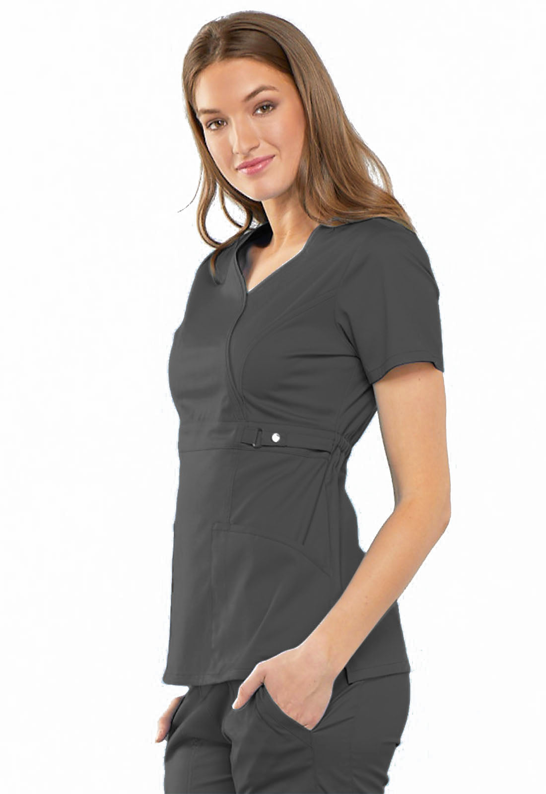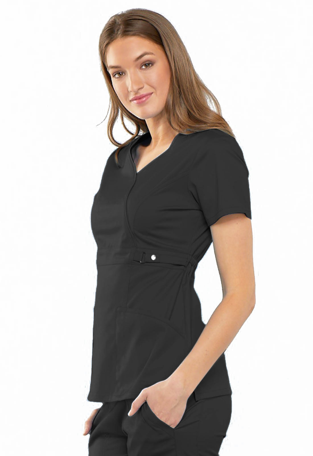 | A Contemporary fit mock wrap top has piping around front neckline, front princess seams, self belt at empire waist with Luxe logo snaps, angled patch pockets, back elastic, and side vents. Center back length: 25 1/2" |