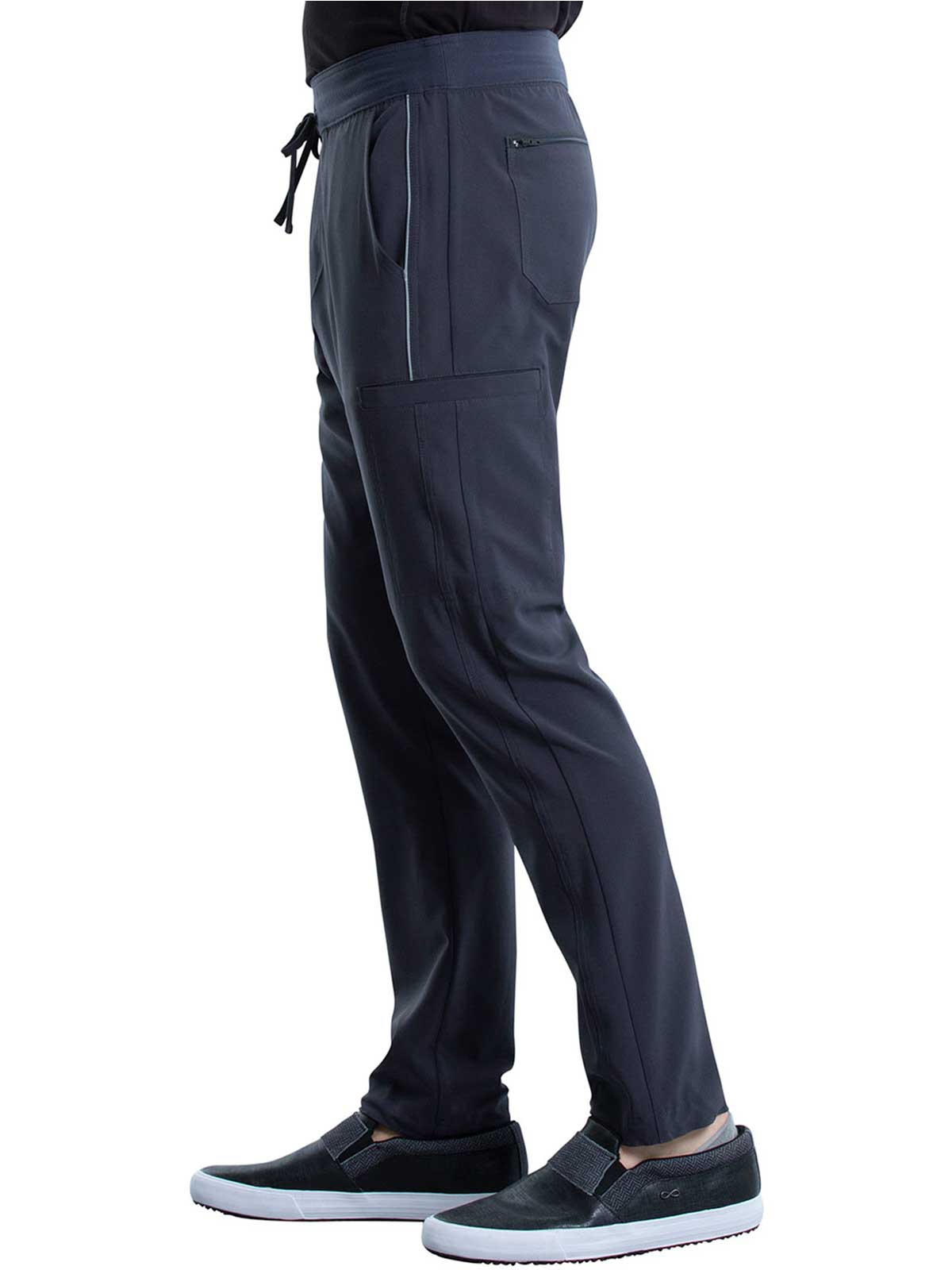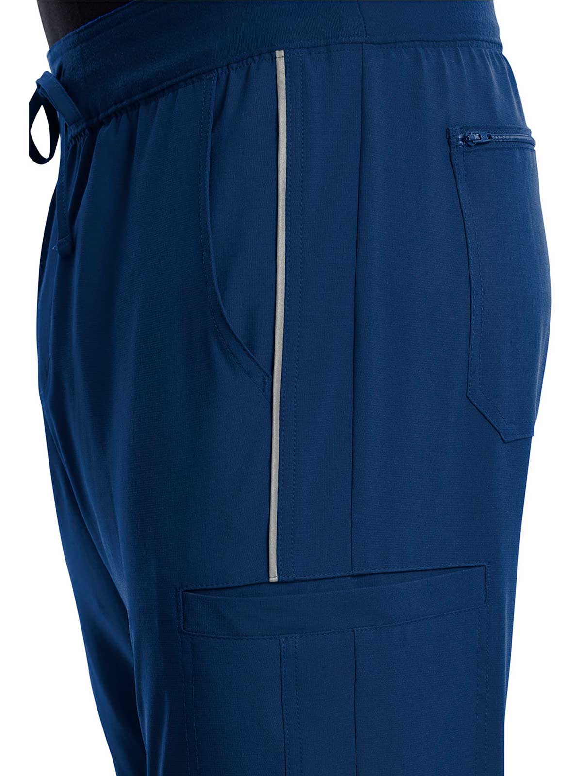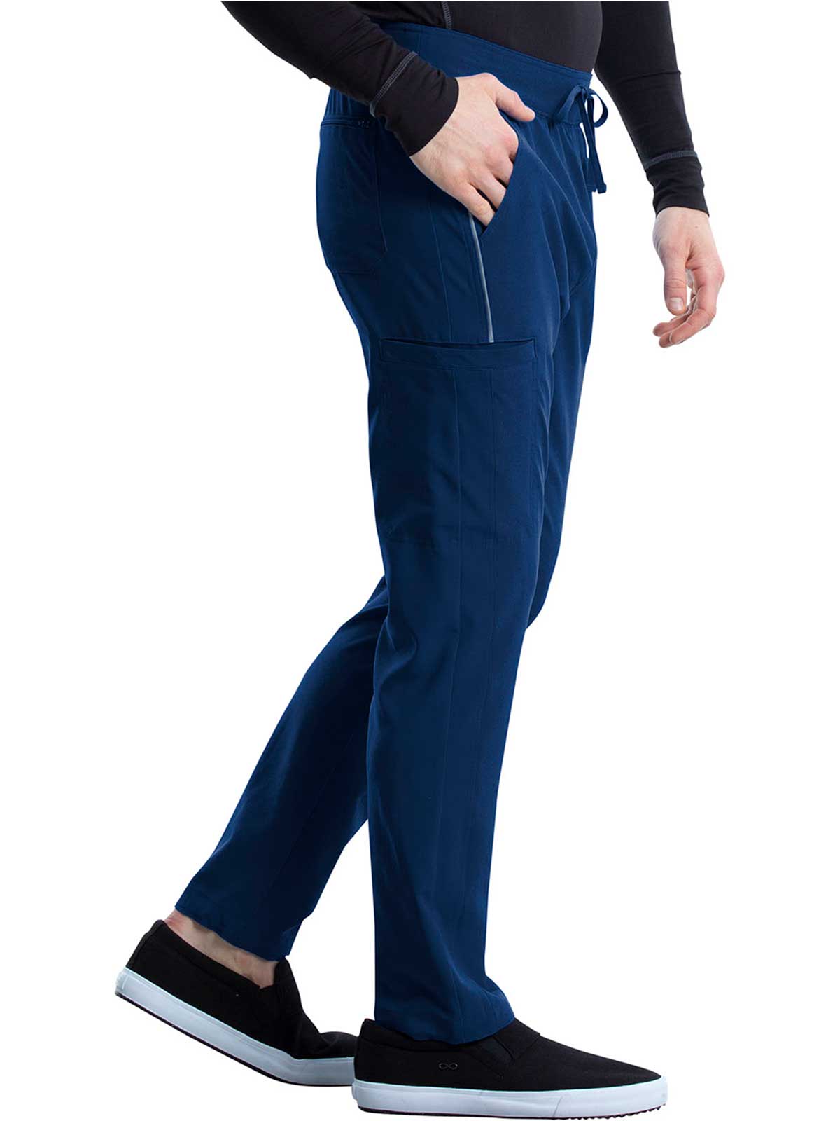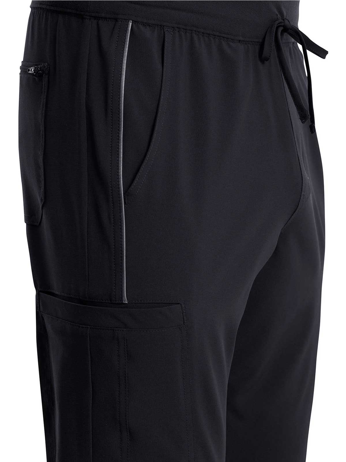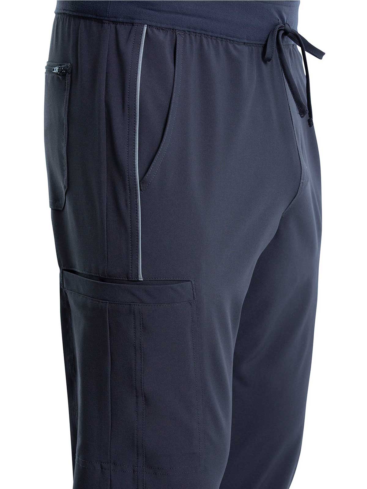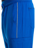 The Iflex by Cherokee Men's Tapered Cargo Scrub Pant. This Men's Modern fit pant has a knit waistband backed with logo elastic and drawstring. Versatile look and takes the guess work out of your morning routine.