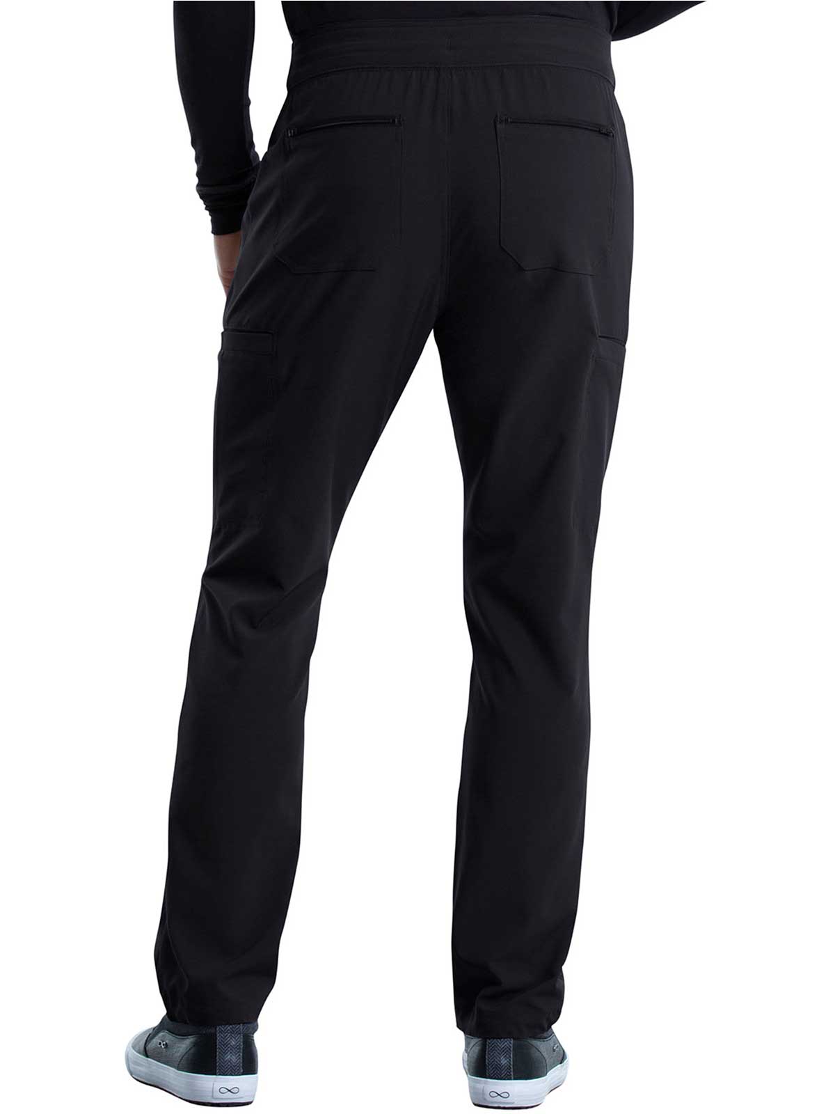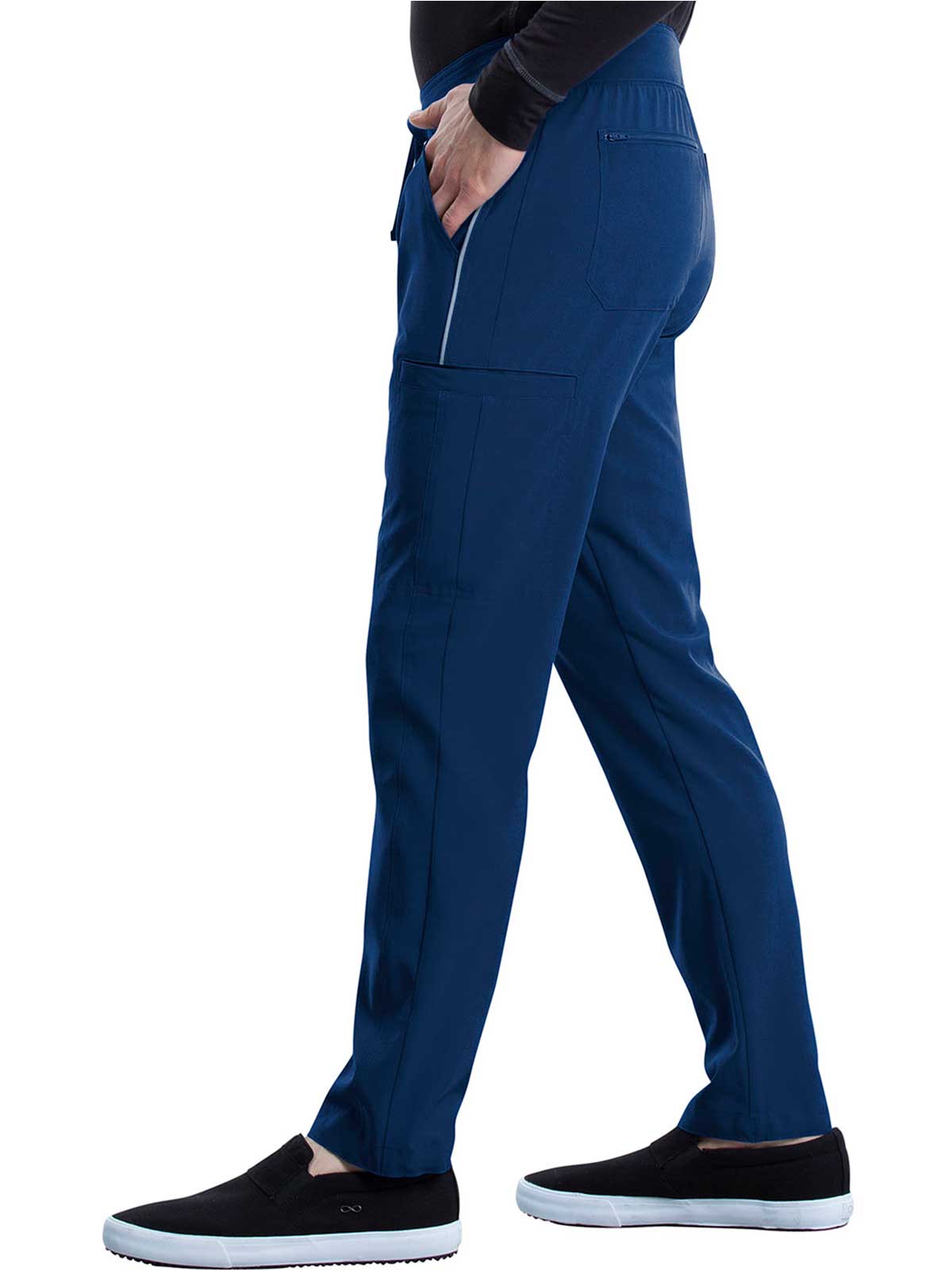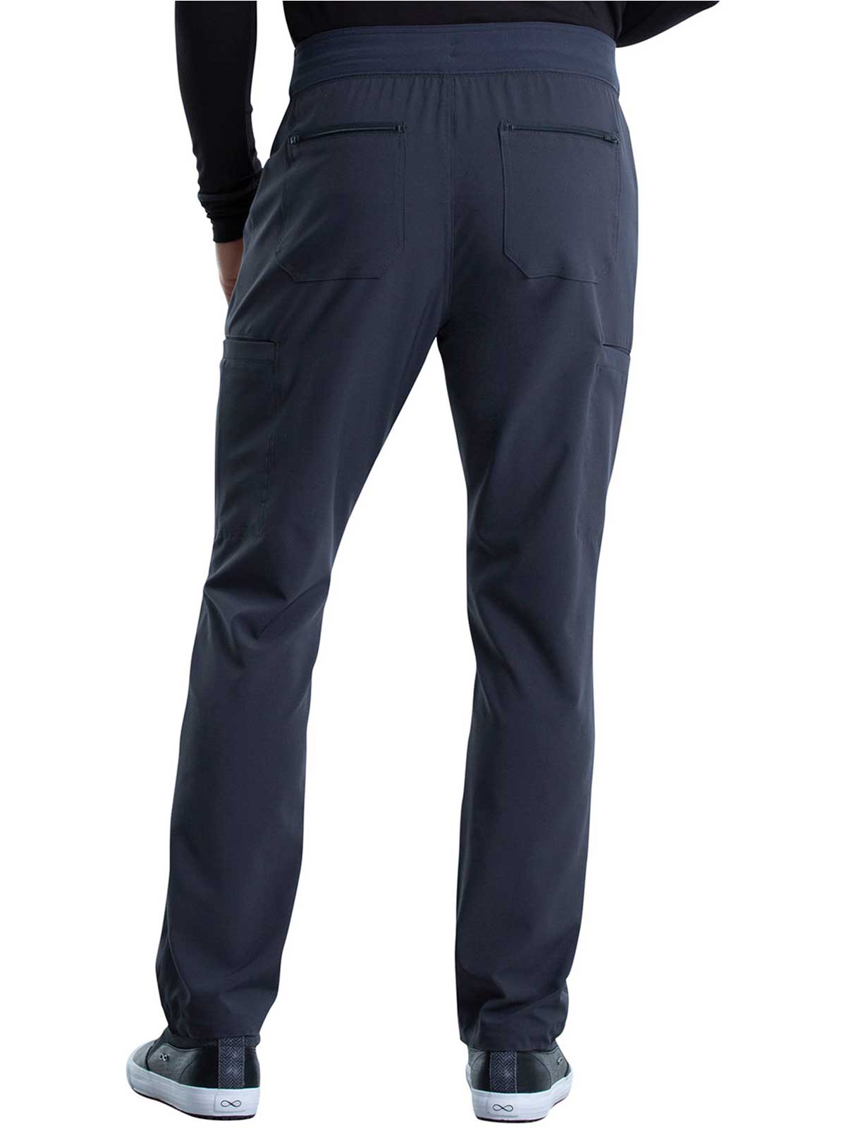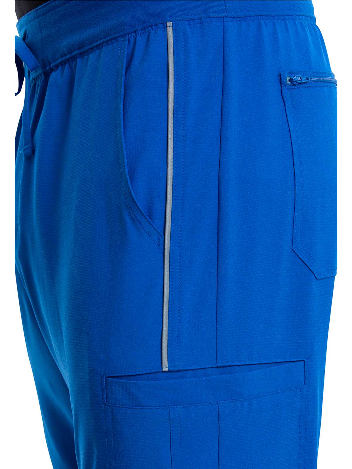 The Iflex by Cherokee Men's Tapered Cargo Scrub Pant. This Men's Modern fit pant has a knit waistband backed with logo elastic and drawstring. Versatile look and takes the guess work out of your morning routine.