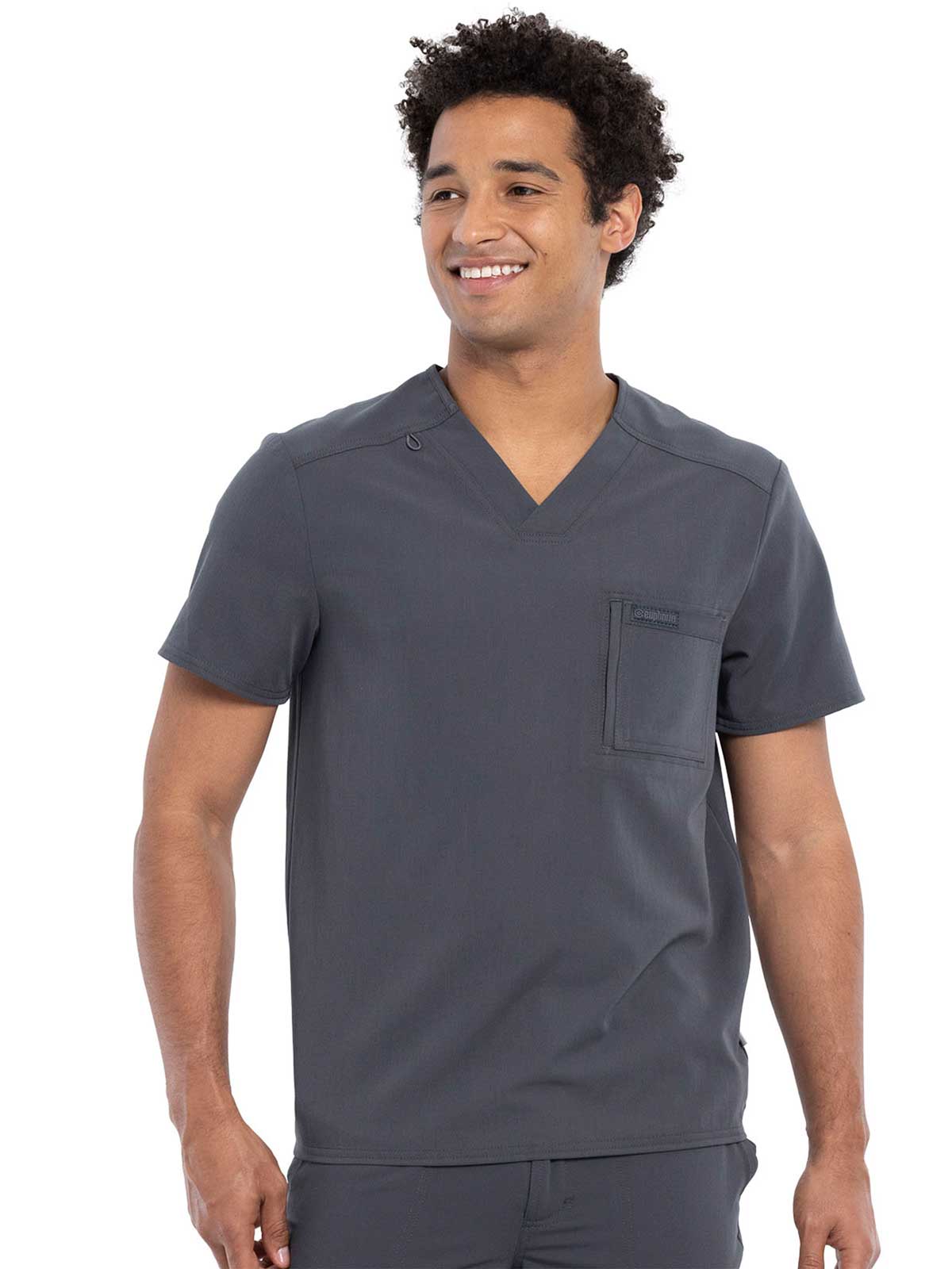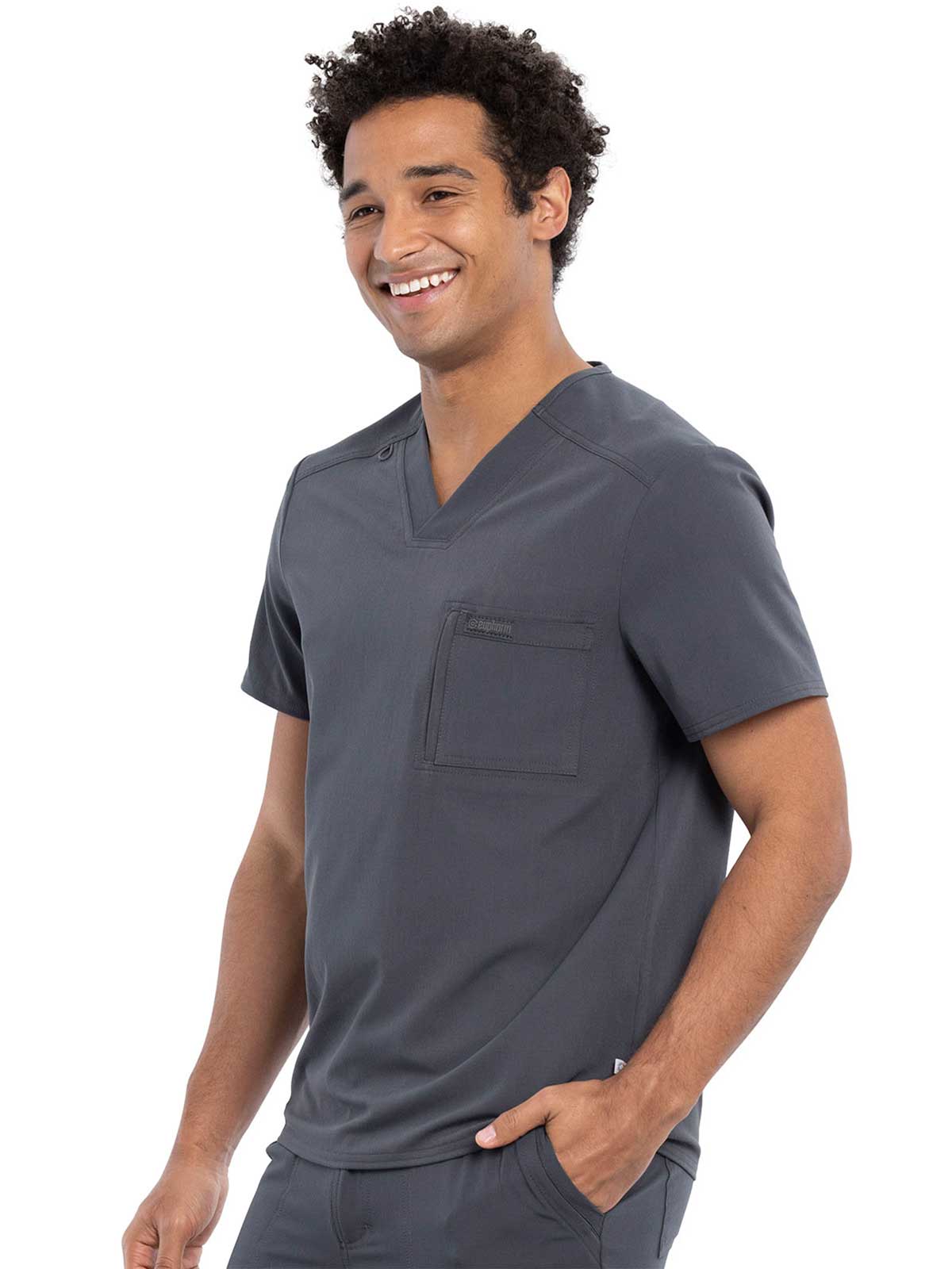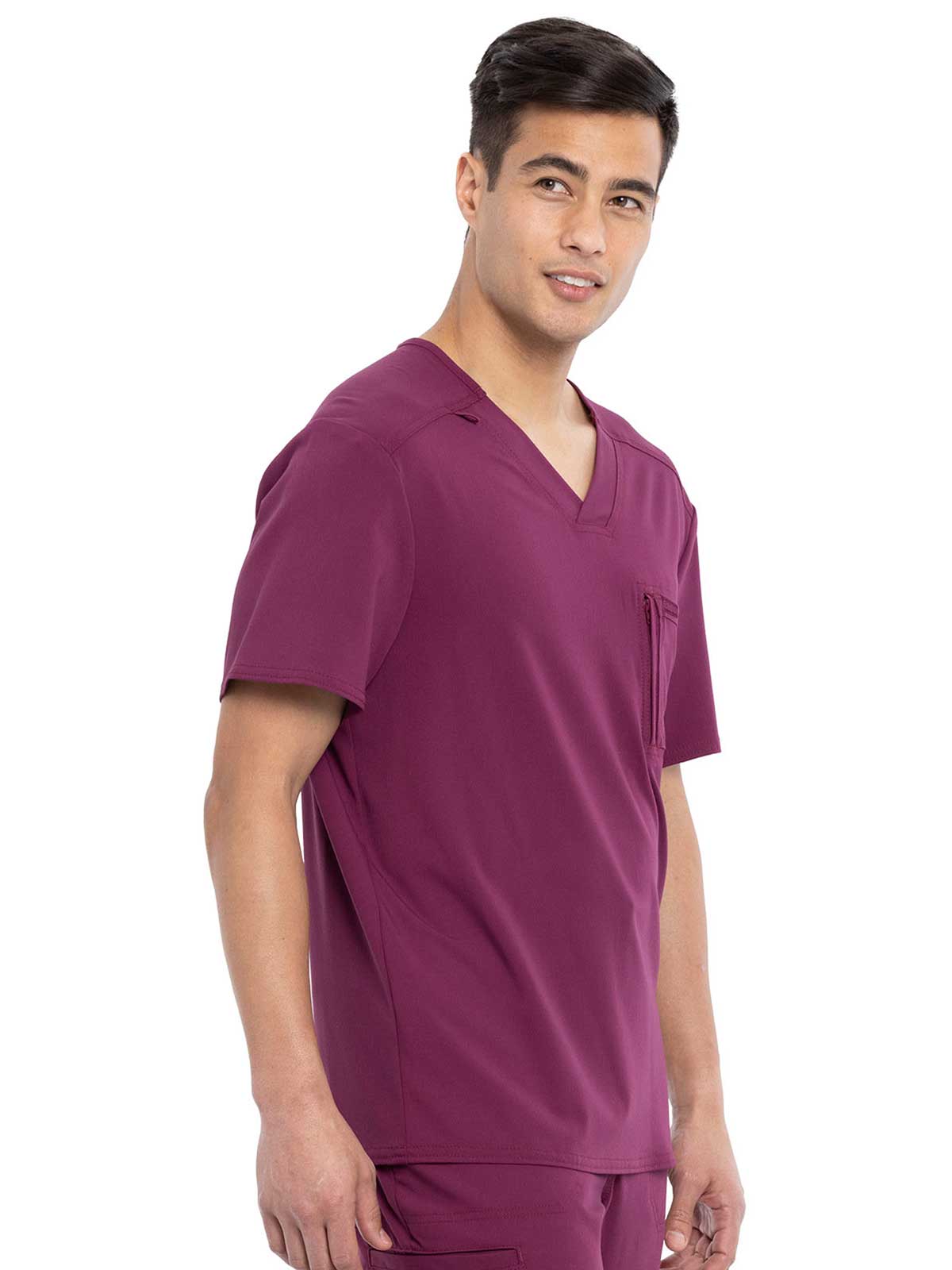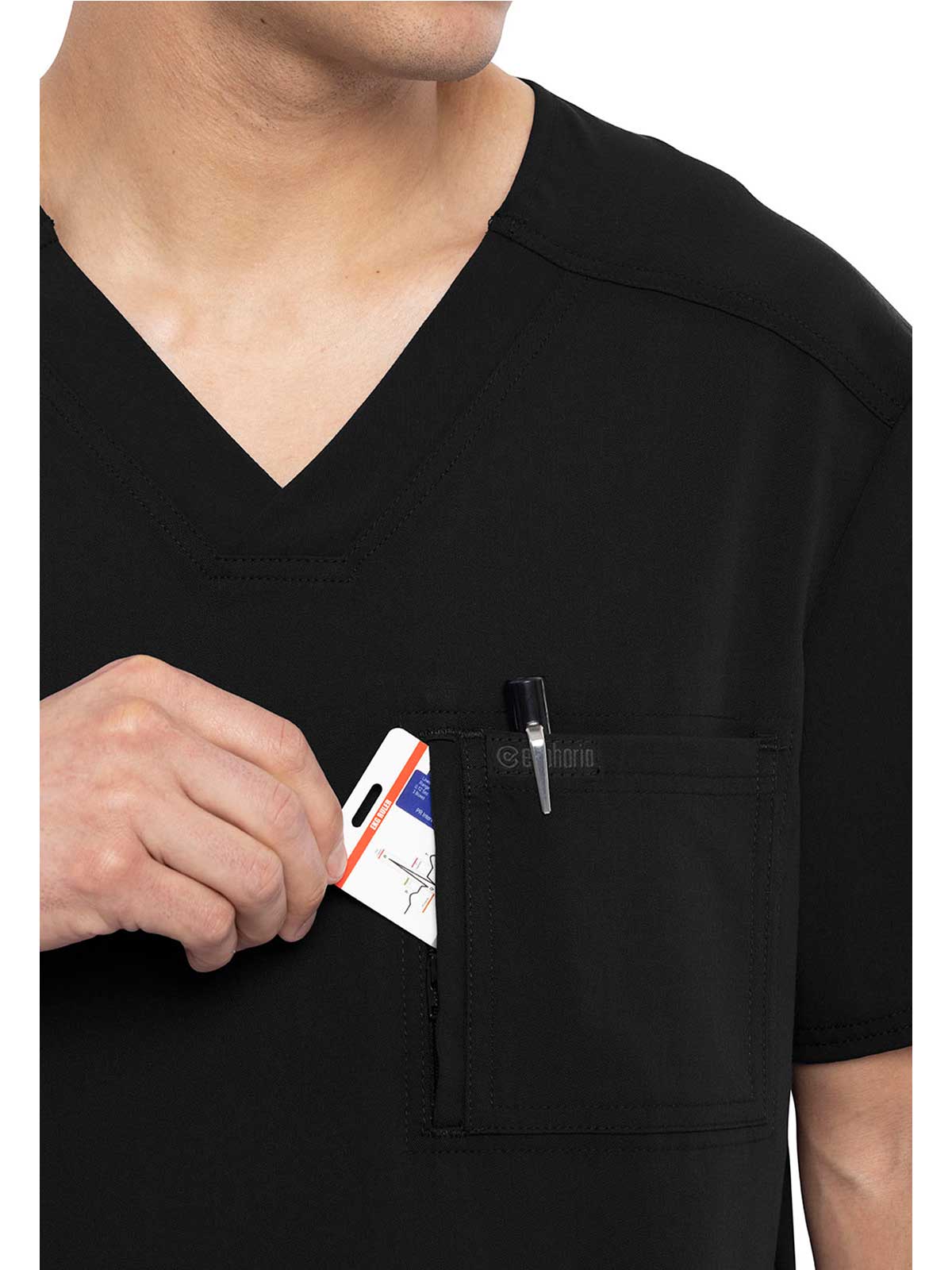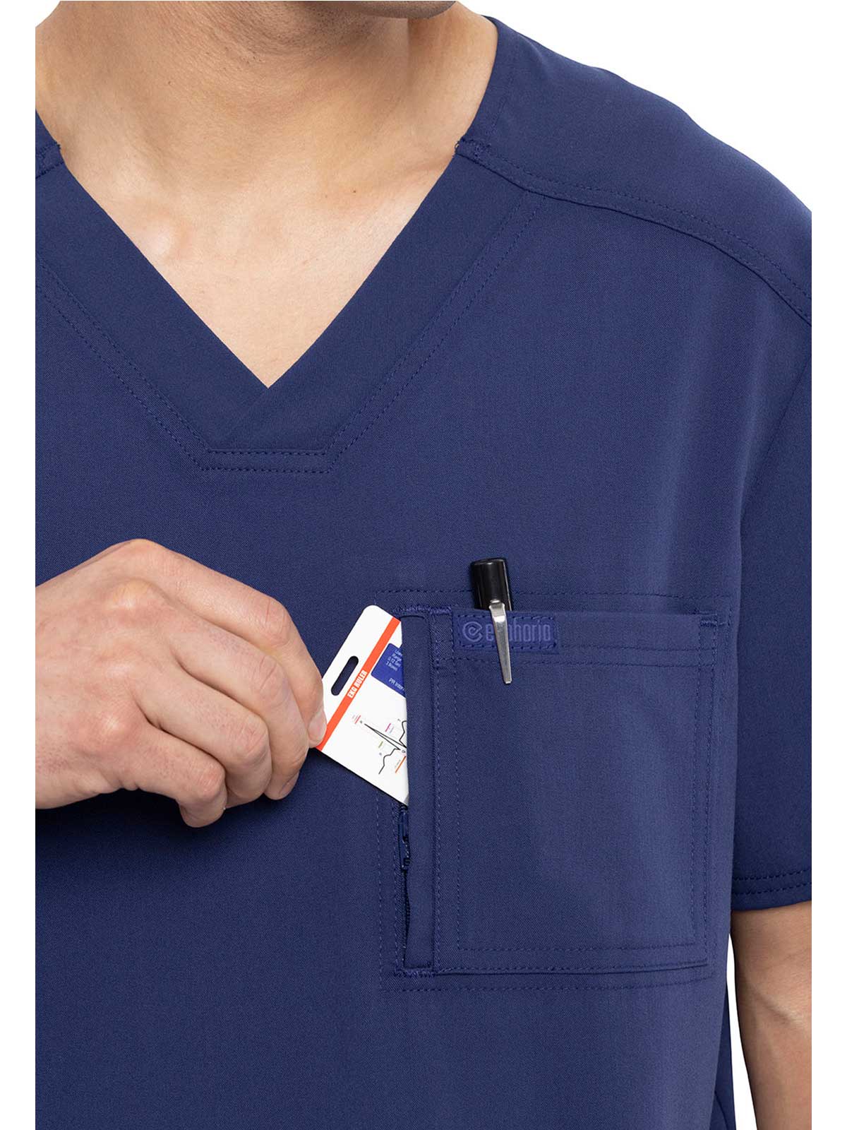 This Men's Modern fit V-neck top features front and back yoke seams plus a bungee ID badge loop on the wearer's right yoke seam. There are two pockets: one welt chest pocket with a zip security pocket. This style looks great tucked in or untucked. Center back length 28"