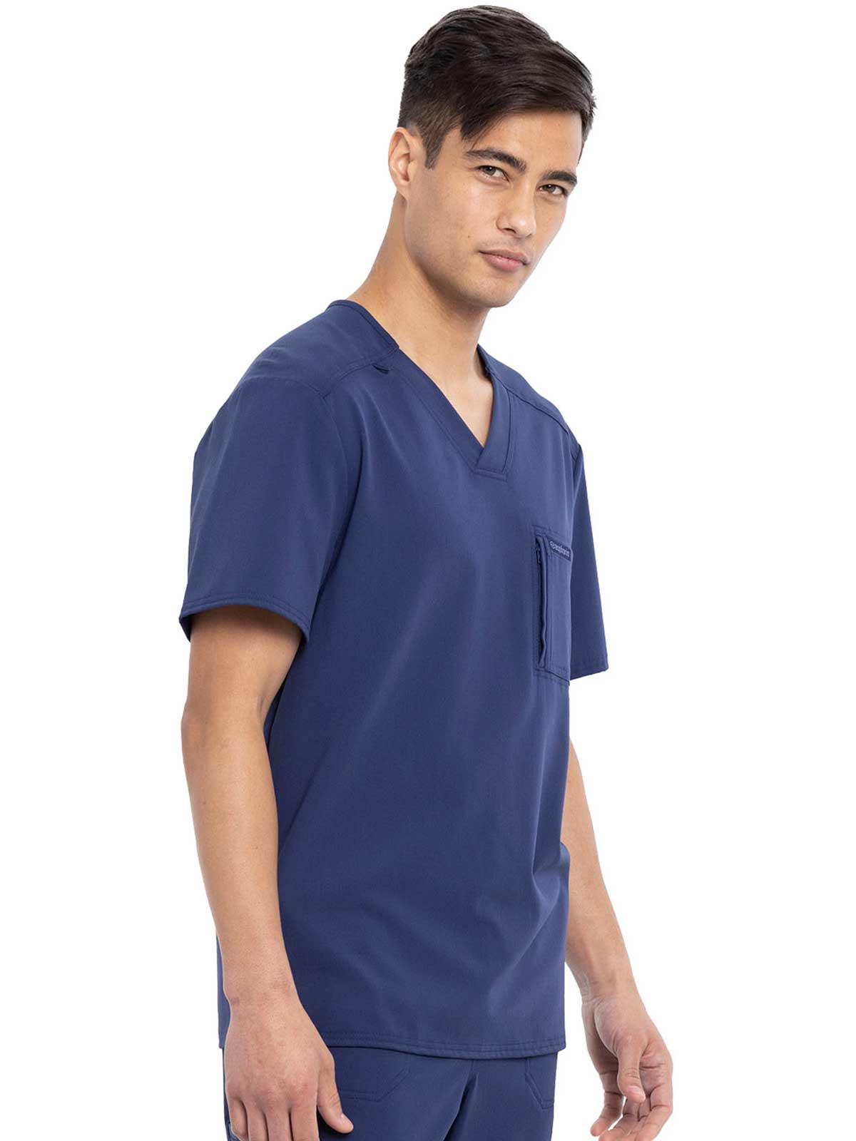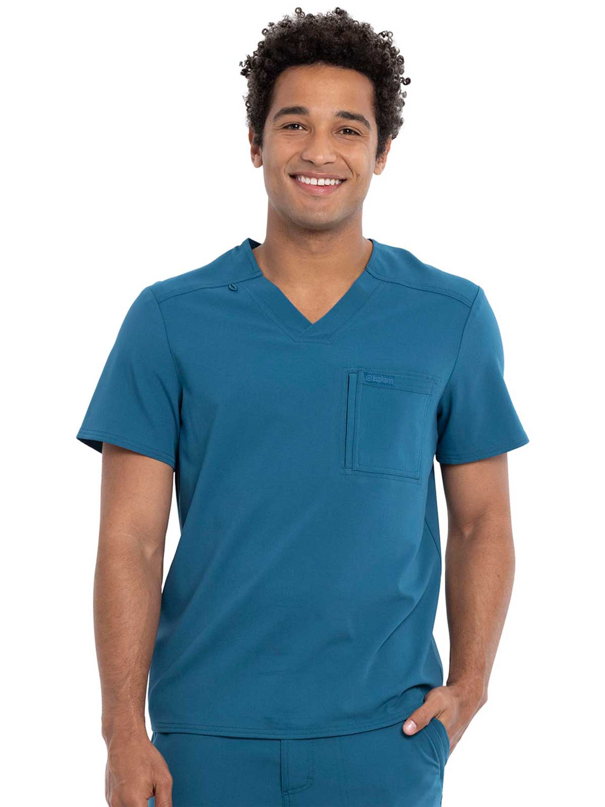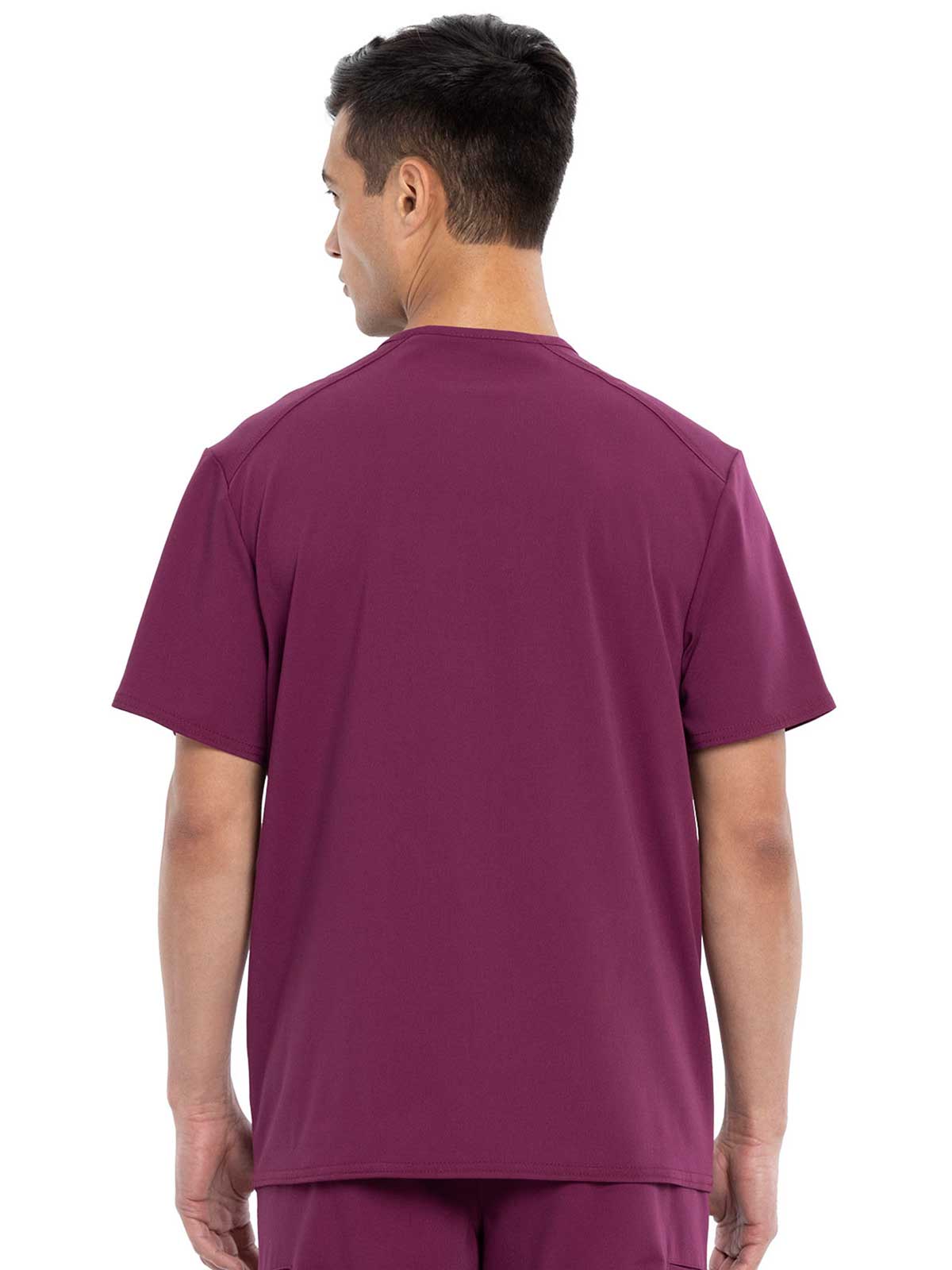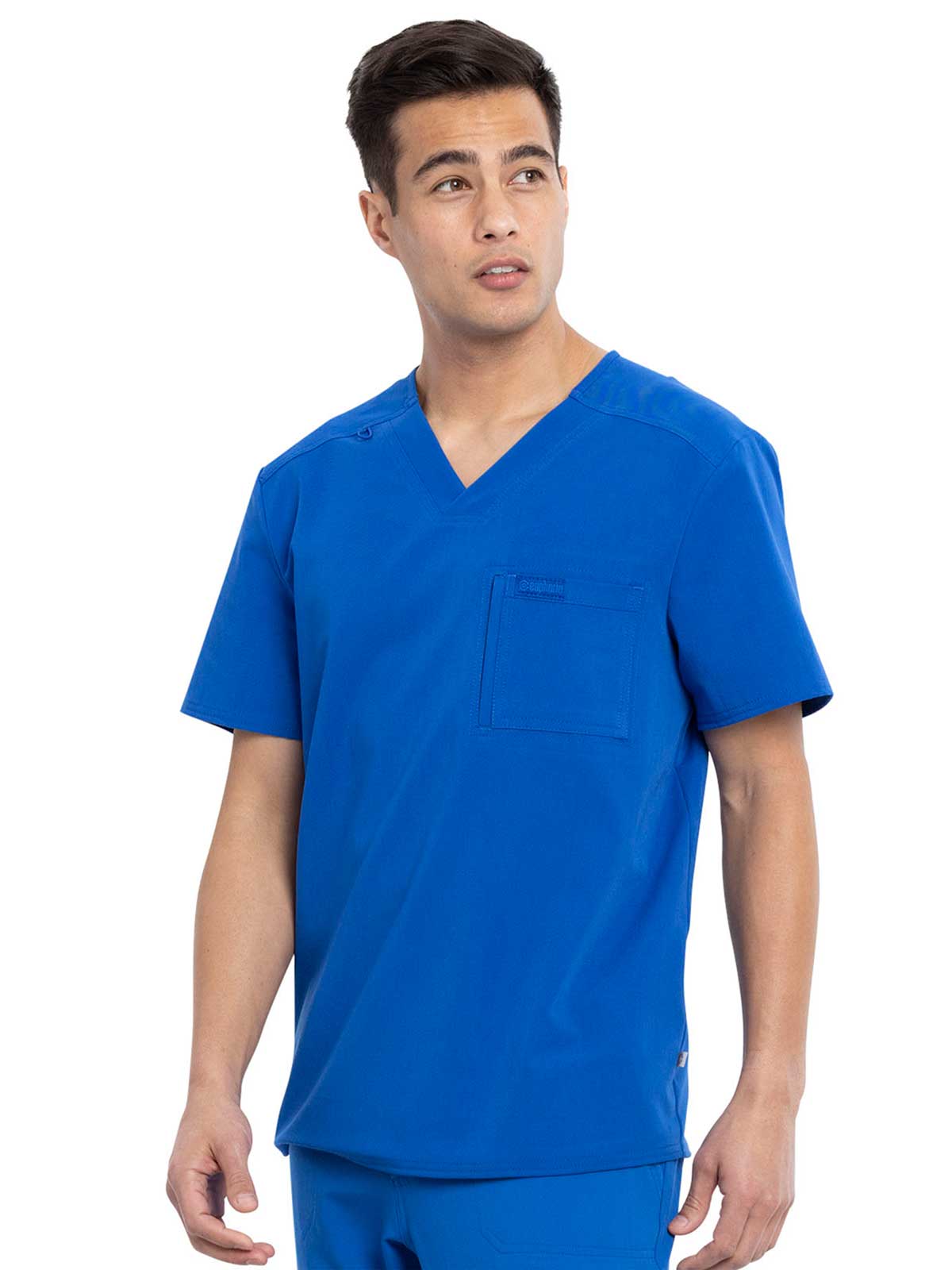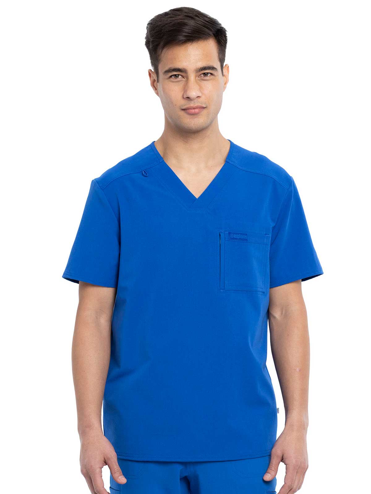 This Men's Modern fit V-neck top features front and back yoke seams plus a bungee ID badge loop on the wearer's right yoke seam. There are two pockets: one welt chest pocket with a zip security pocket. This style looks great tucked in or untucked. Center back length 28"