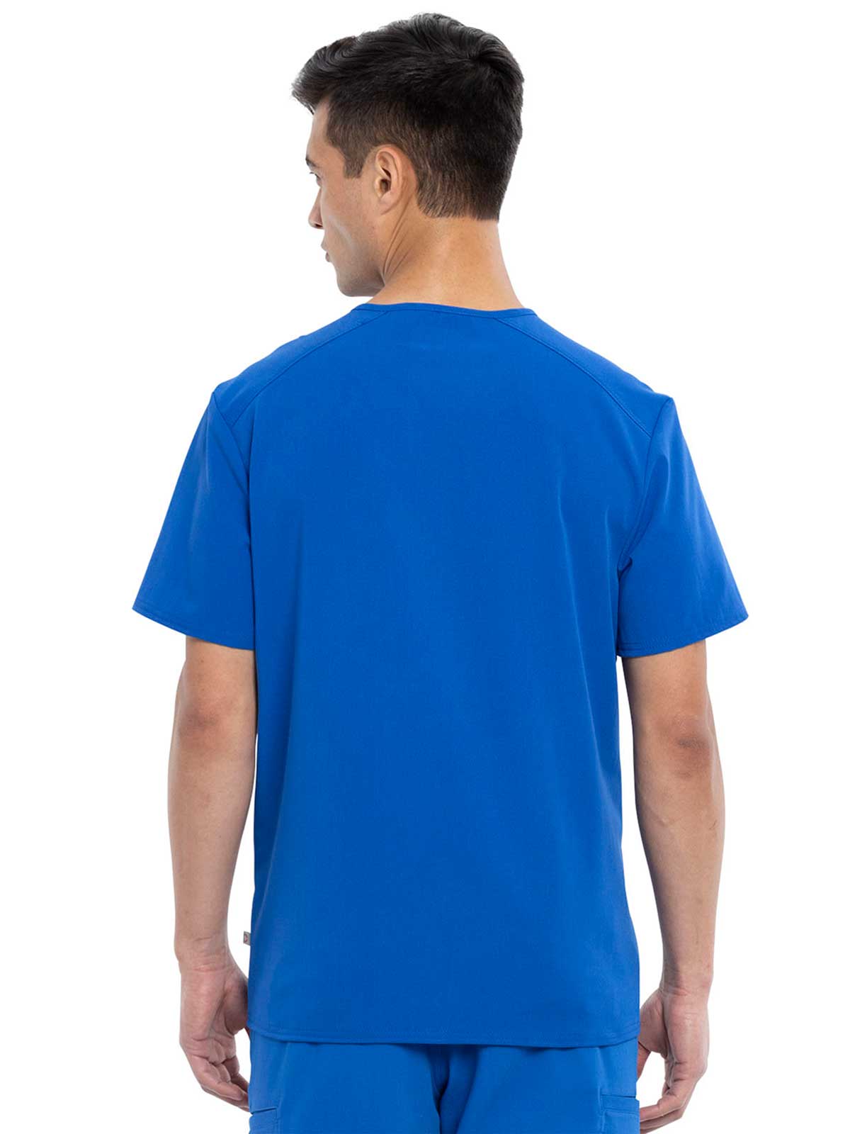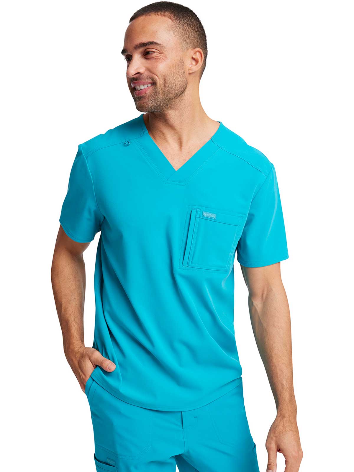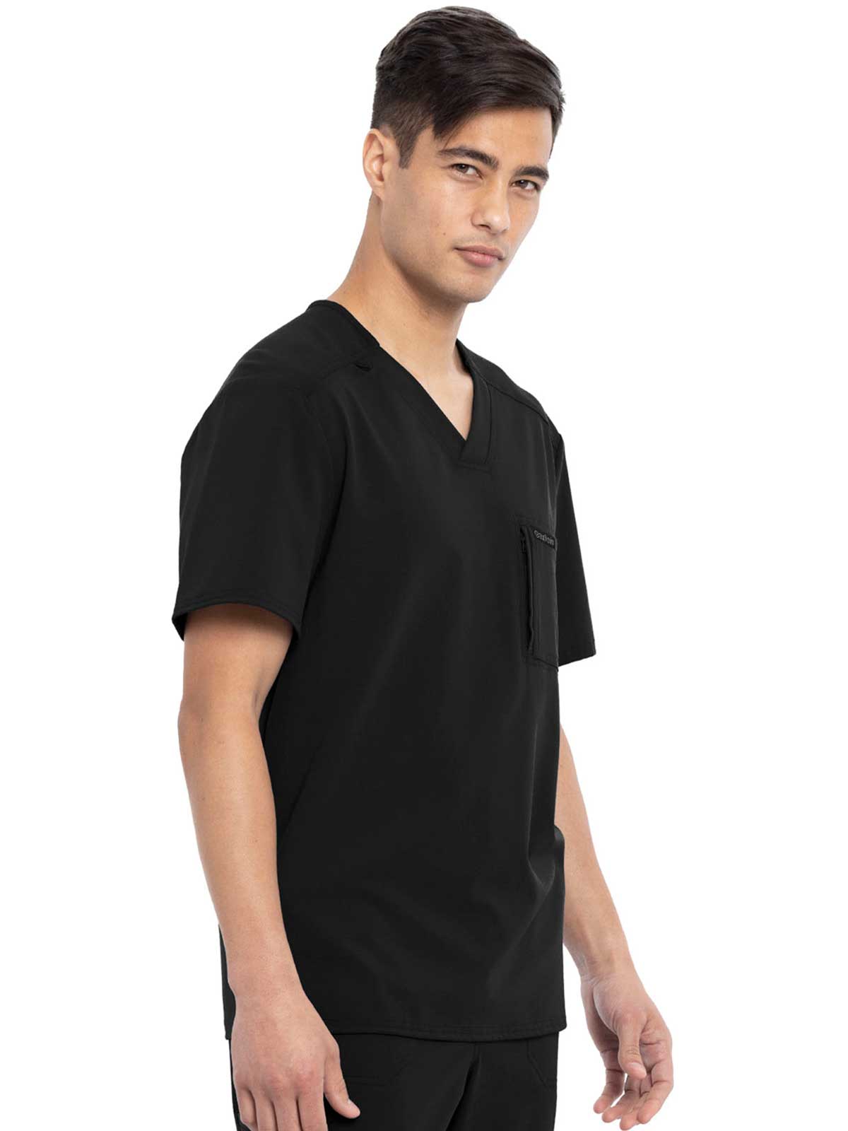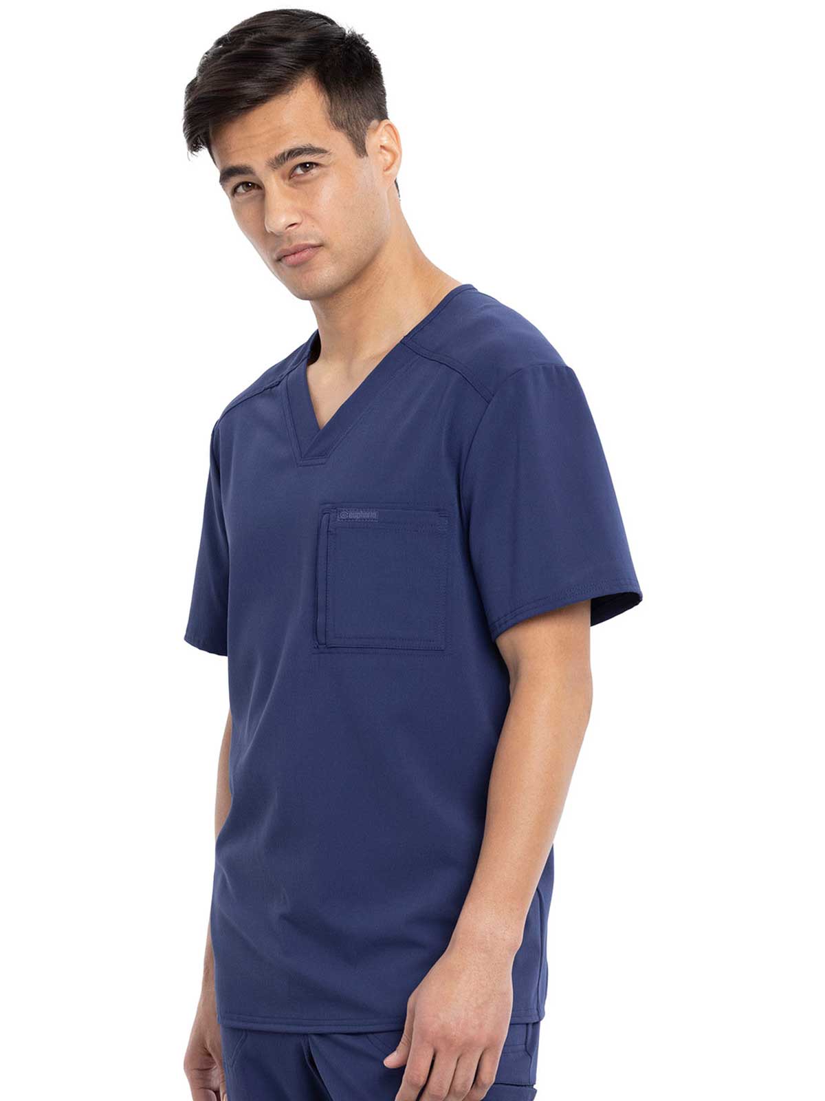 This Men's Modern fit V-neck top features front and back yoke seams plus a bungee ID badge loop on the wearer's right yoke seam. There are two pockets: one welt chest pocket with a zip security pocket. This style looks great tucked in or untucked. Center back length 28"