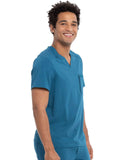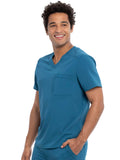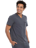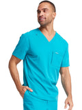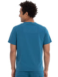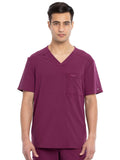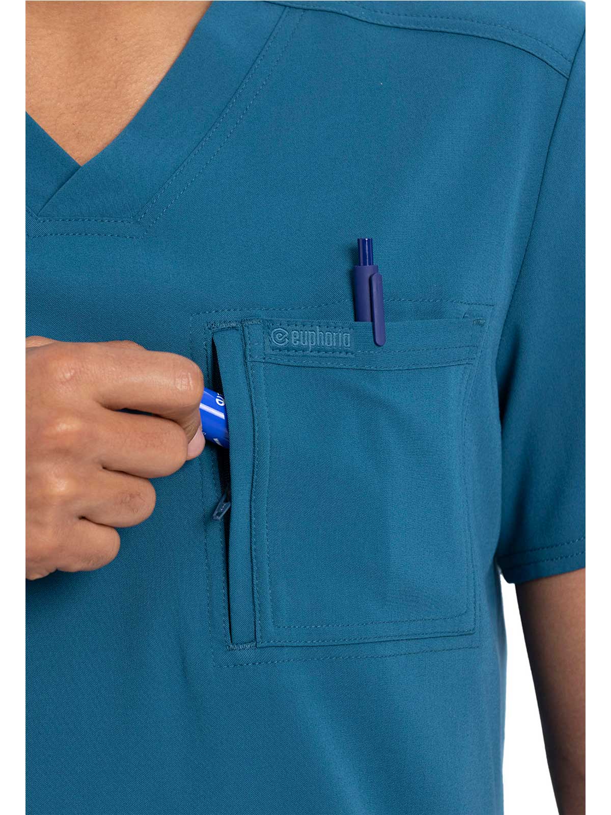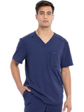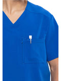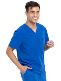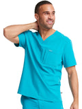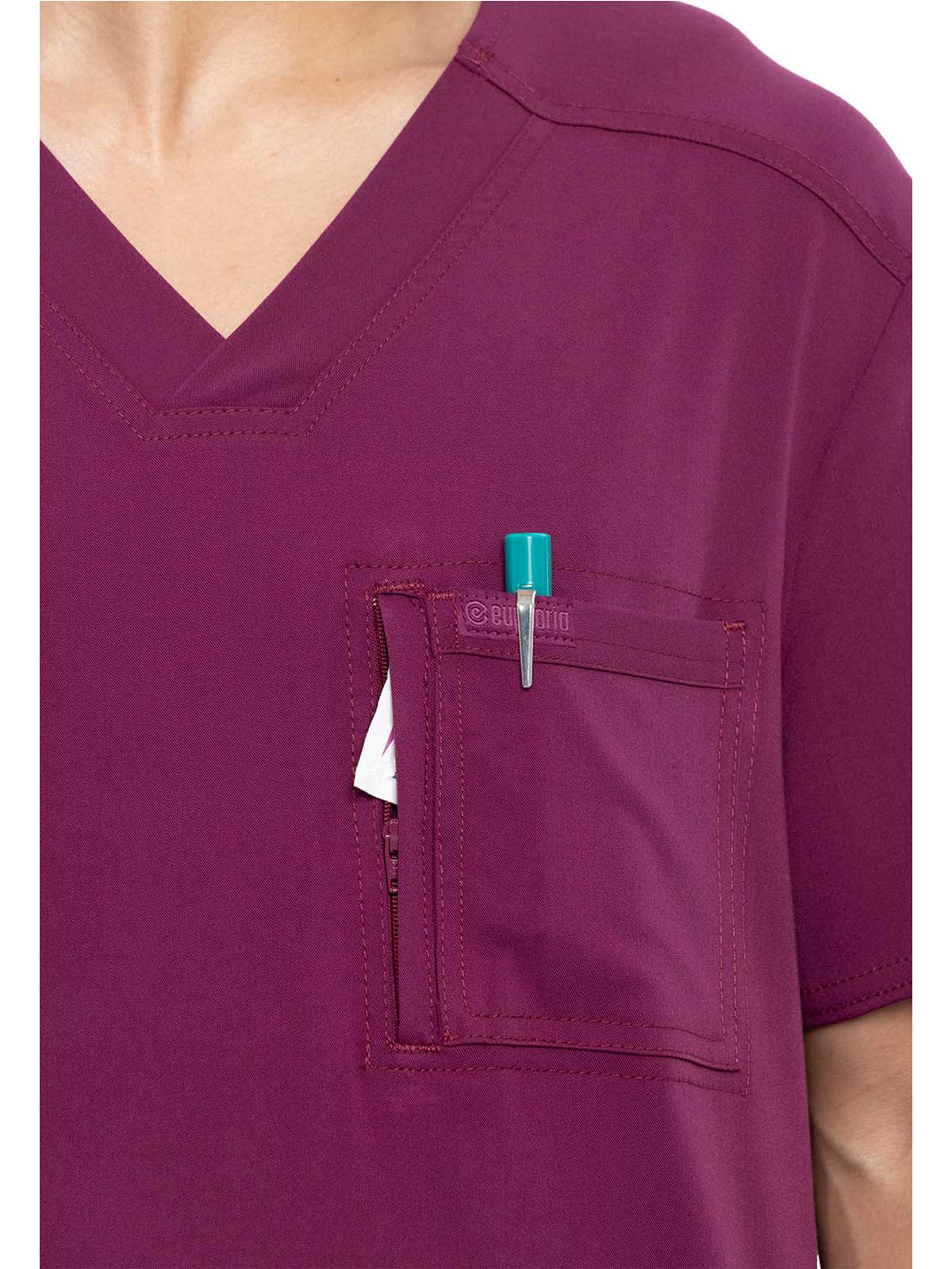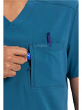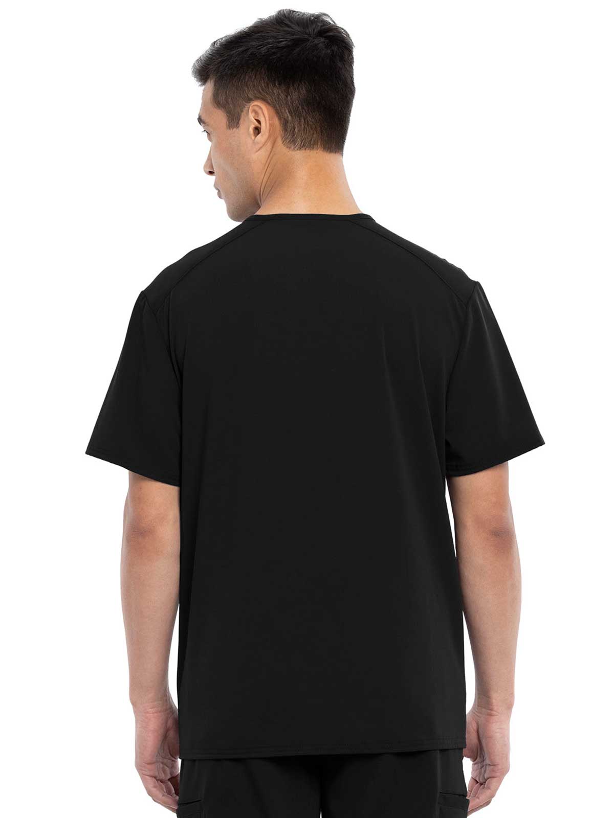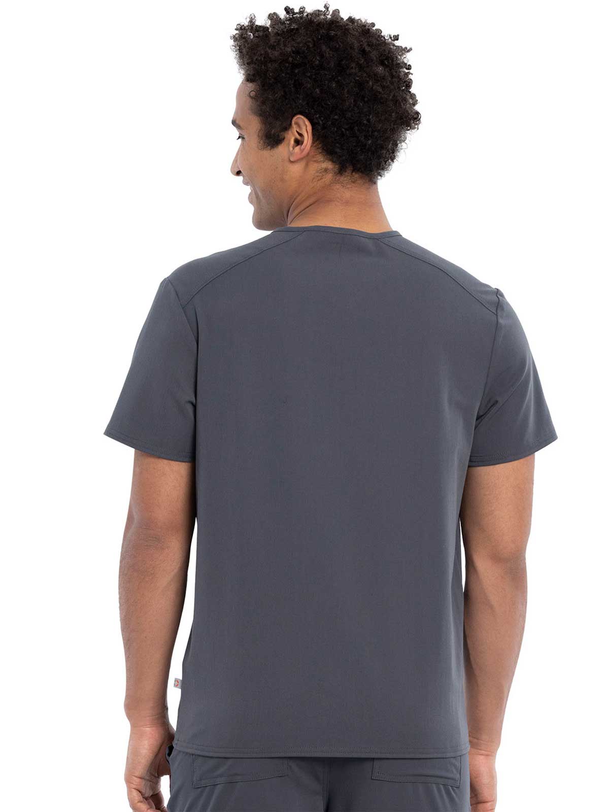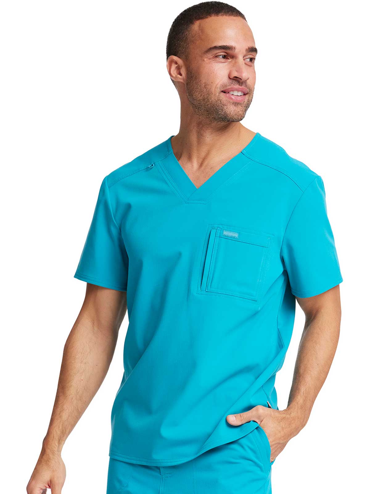 This Men's Modern fit V-neck top features front and back yoke seams plus a bungee ID badge loop on the wearer's right yoke seam. There are two pockets: one welt chest pocket with a zip security pocket. This style looks great tucked in or untucked. Center back length 28"