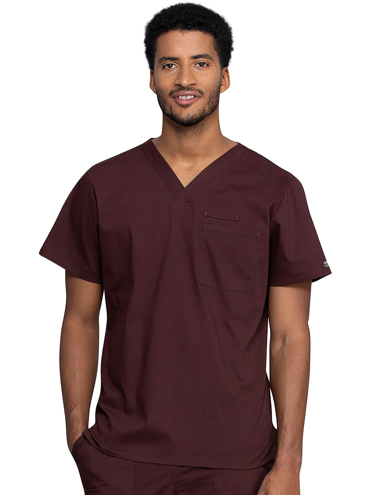 A Men's Traditional fit V-neck top features a chest pocket with instrument loop, a back yoke and side vents. This style looks great tucked in or untucked. Center back length: 28"_x000D_