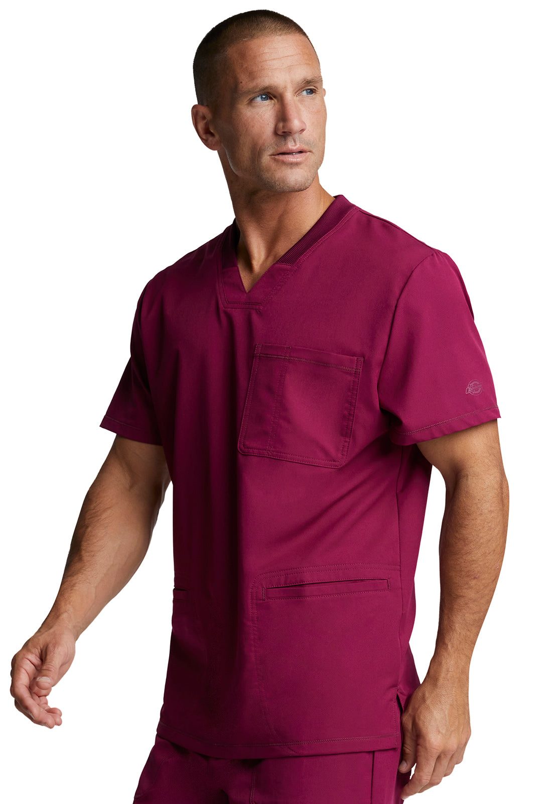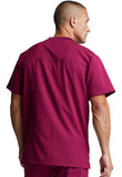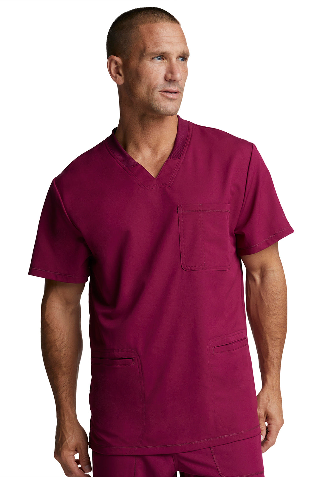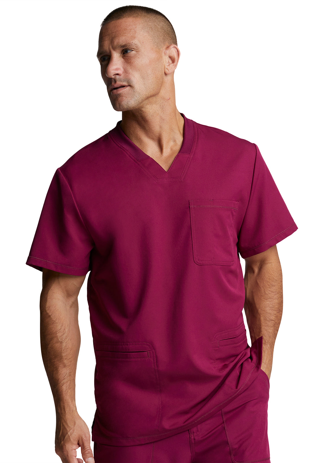 This men's v-neck top features a knit collar, chest patch pocket with pen slot, front welt pockets (the right with a hidden grommet for a headphone cable), and a back shoulder yoke. It also includes a signature tonal heat-transfer logo, side vents, and coverstitch detail throughout, with a 30" center back length.