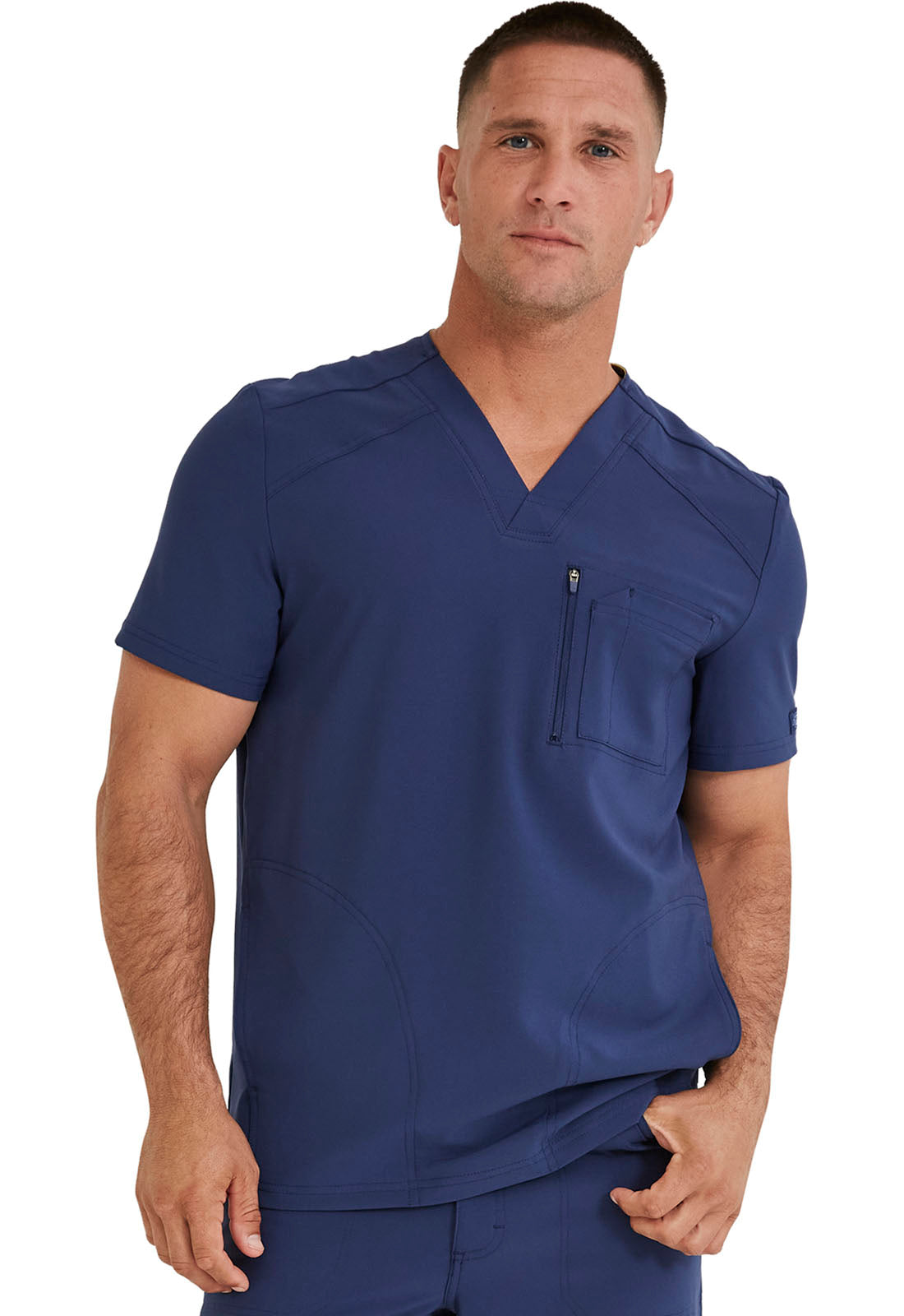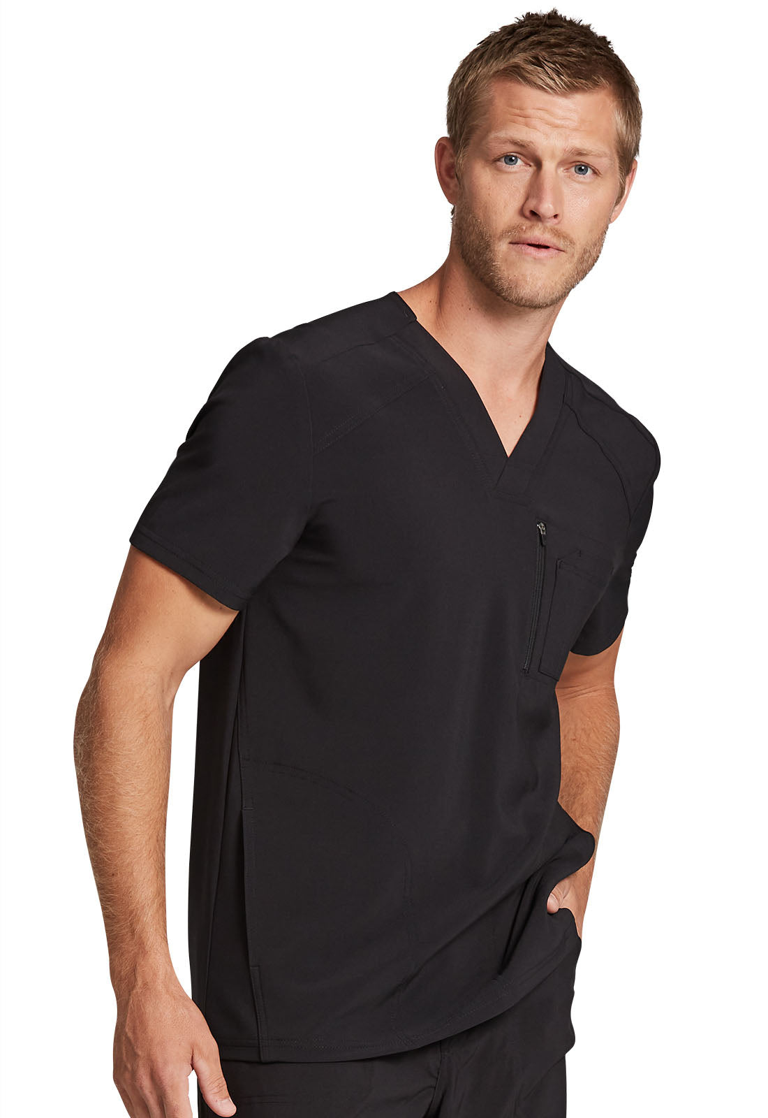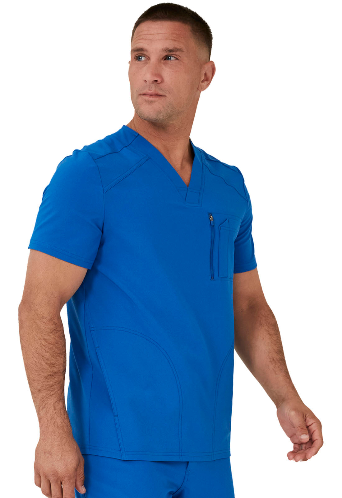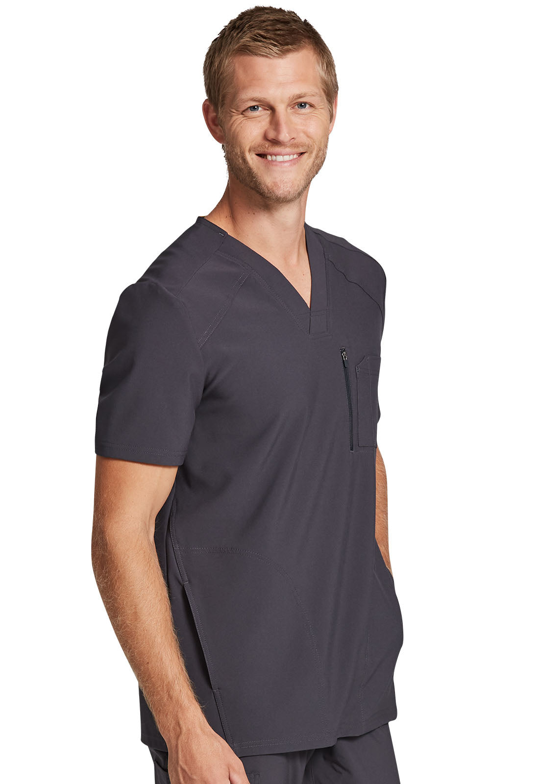 This Men's fit V-neck top has front and back yoke seams plus angled front seams to give it a sporty look. There are four pockets: chest pocket with top entry plus layered pocket with side zipper opening and two in-seam pockets. chest pocket has a pencil titch for additional storage.
