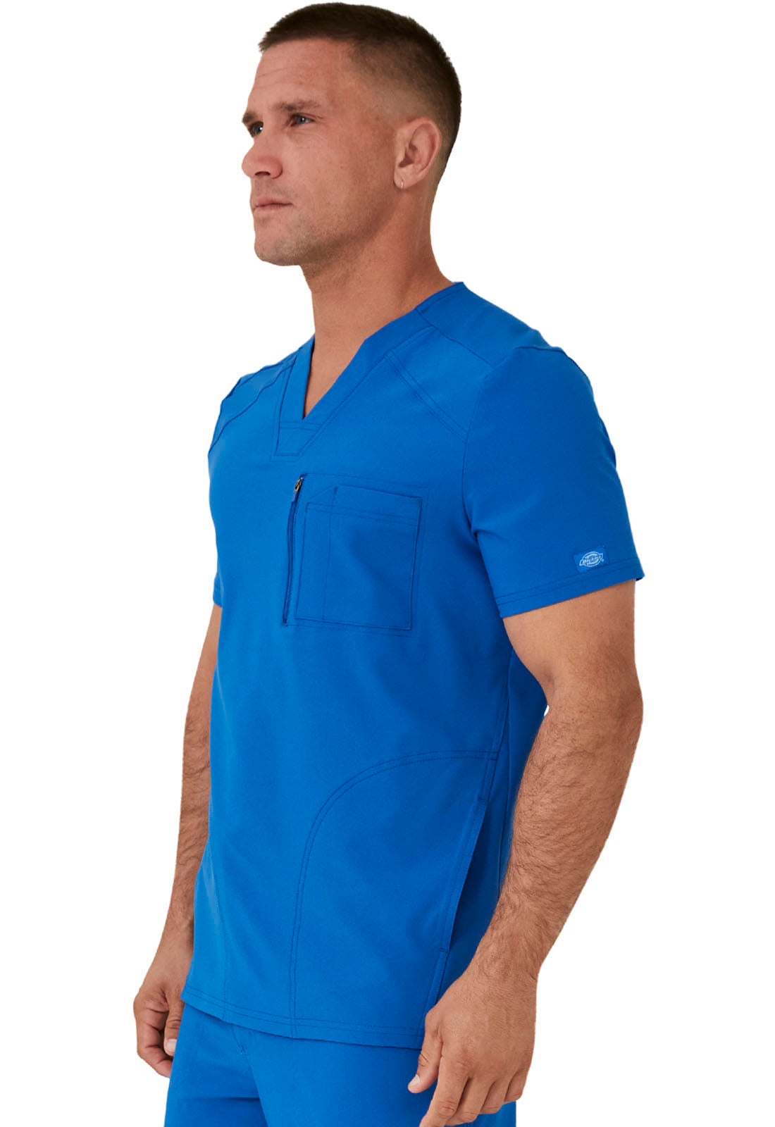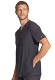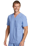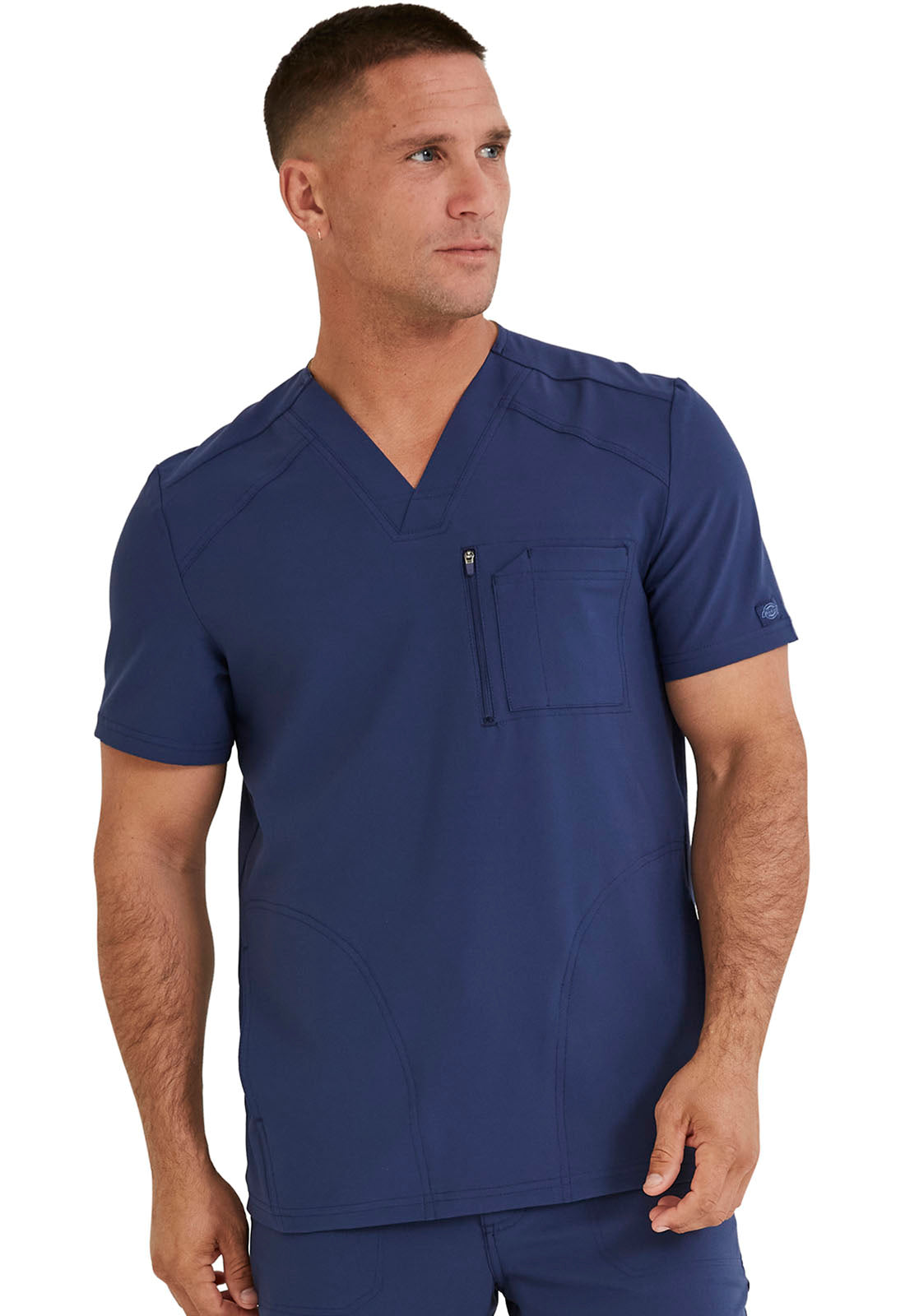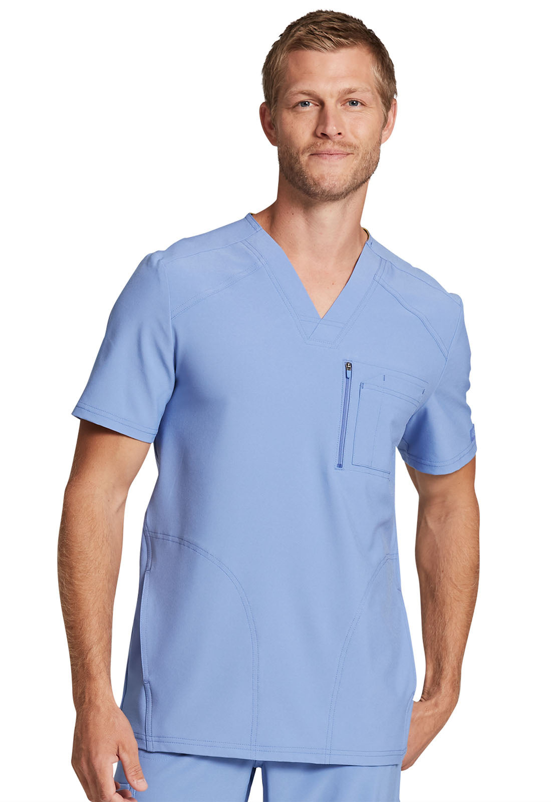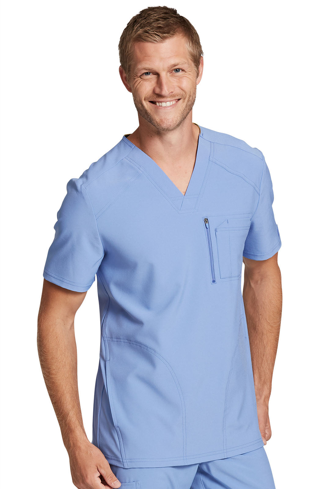 This Men's fit V-neck top has front and back yoke seams plus angled front seams to give it a sporty look. There are four pockets: chest pocket with top entry plus layered pocket with side zipper opening and two in-seam pockets. chest pocket has a pencil titch for additional storage.