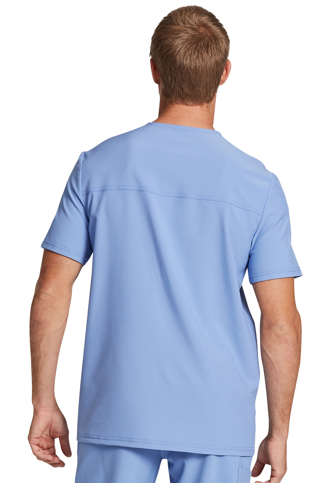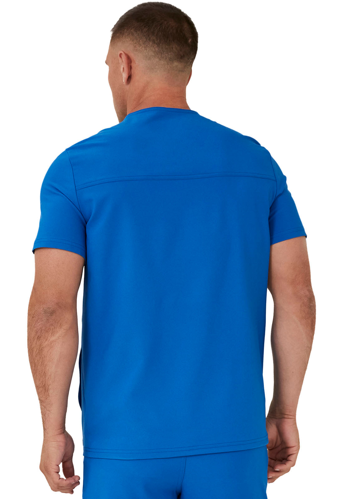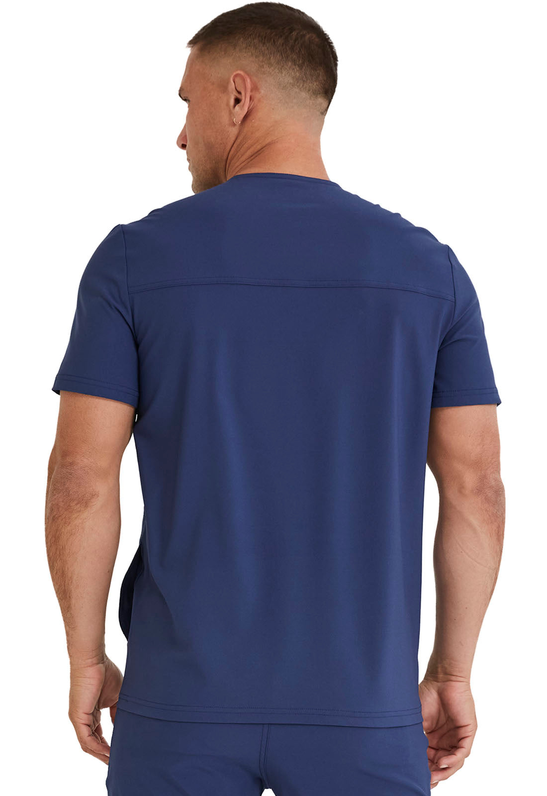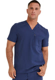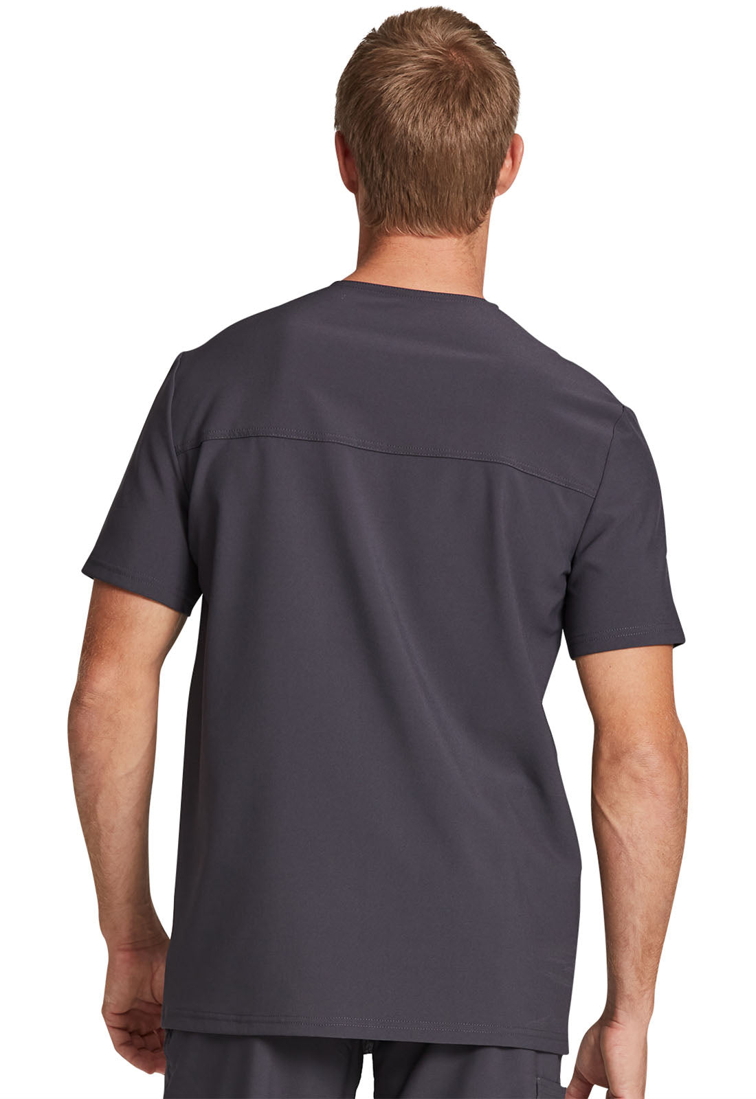 This Men's fit V-neck top has front and back yoke seams plus angled front seams to give it a sporty look. There are four pockets: chest pocket with top entry plus layered pocket with side zipper opening and two in-seam pockets. chest pocket has a pencil titch for additional storage.