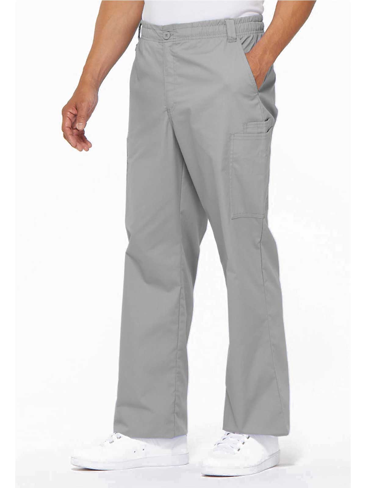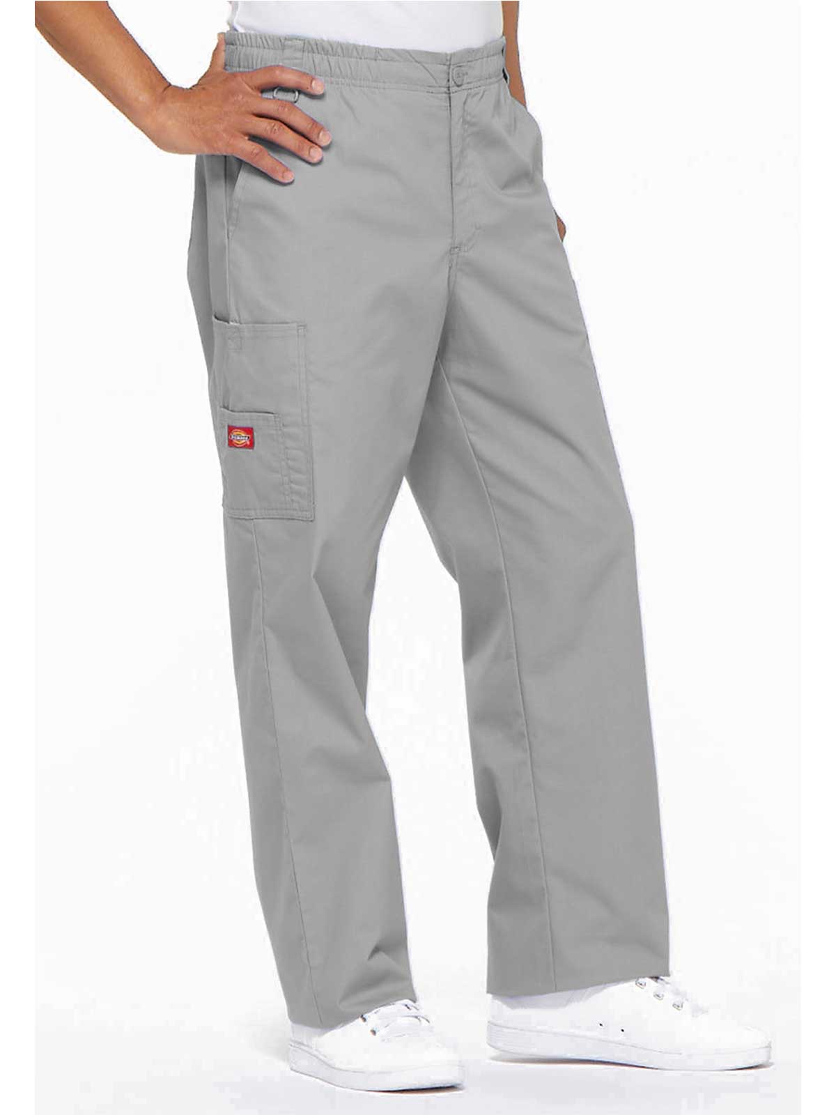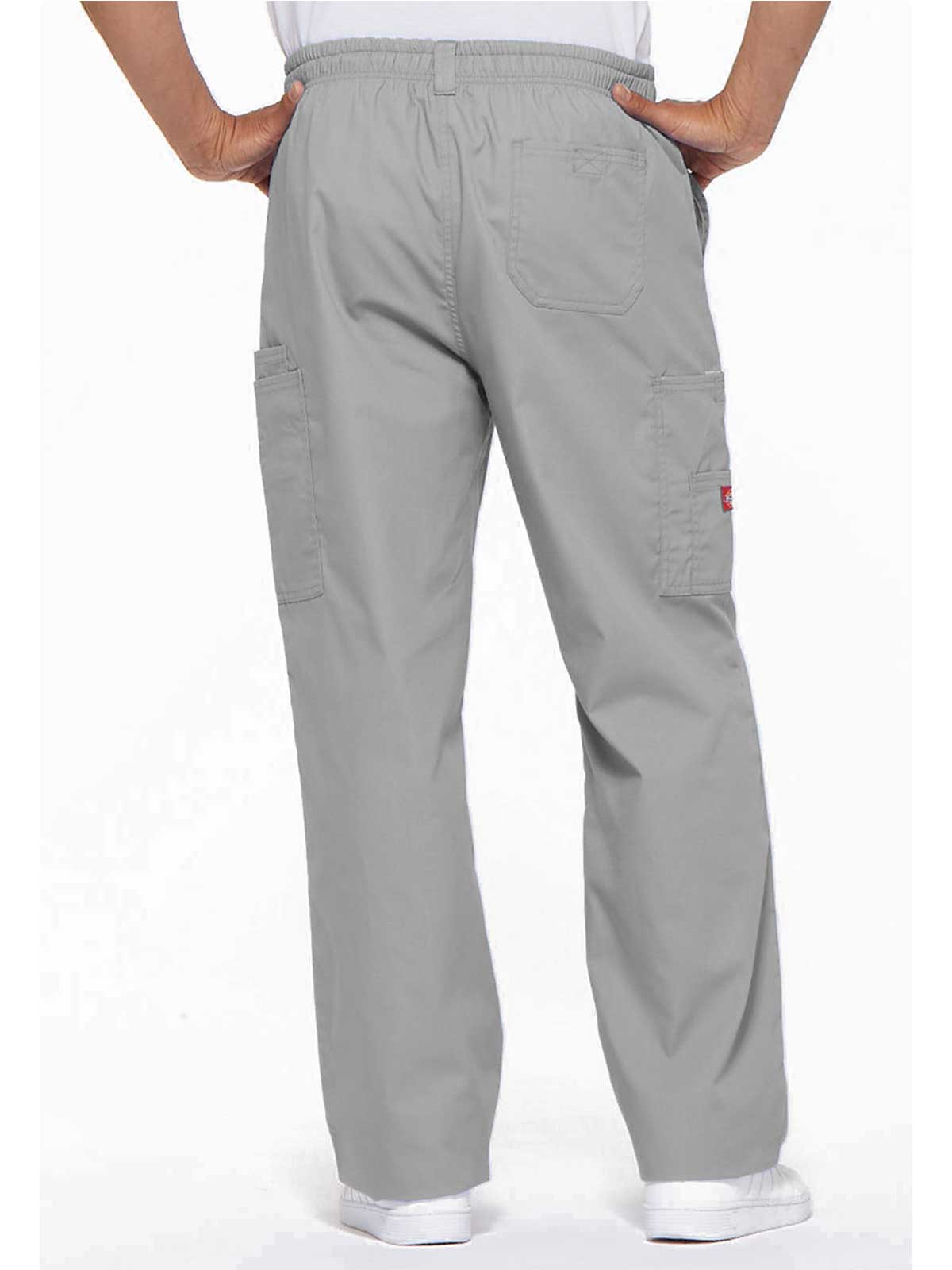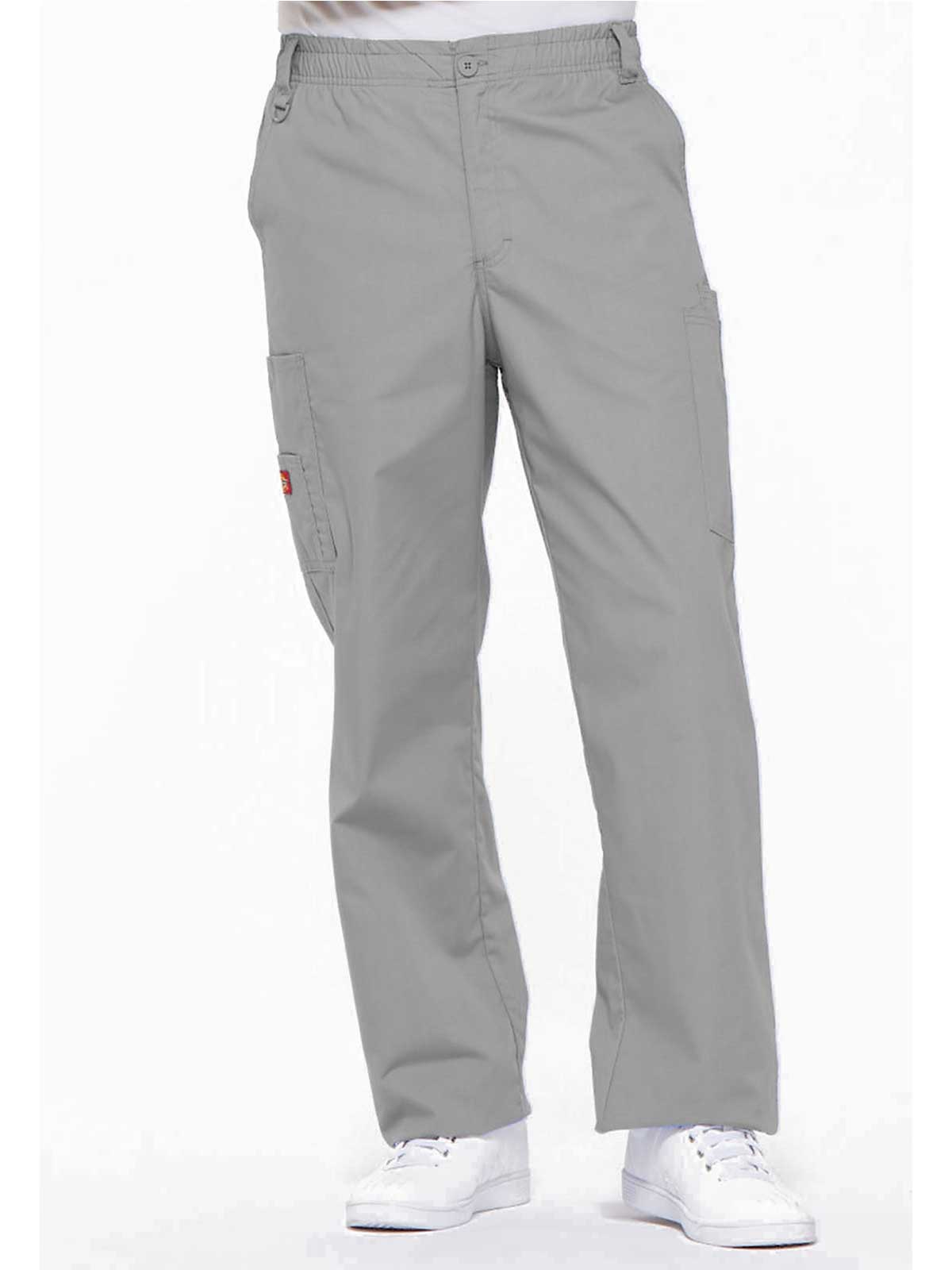 Men's Fit zip fly pull-on pant features an all-around elastic waistband with a button closure, an adjustable interior drawstring, and Dickies logo twill tape on the inside back waistband. Also featured are front-angled pockets, cargo pockets, and a back pocket with a hook and loop fastener for security, a D-ring on the right front belt loop, and double-needle topstitching throughout.