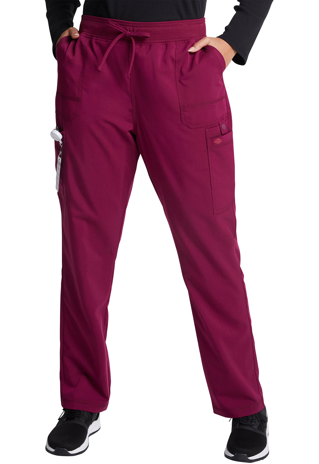 This Contemporary fit mid rise cargo pant features a rib-knit waistband with interior elastic and drawstring. There are eight pockets in total: two front pockets, double cargo pocket with pen/instrument slots on right leg, cargo pocket on left leg, one utility pocket with a snap closure above cargo pocket, and two back pockets. Back leg seams and back vents complete the look. Tapered leg, 14" opening. Inseam: 30 1/2"