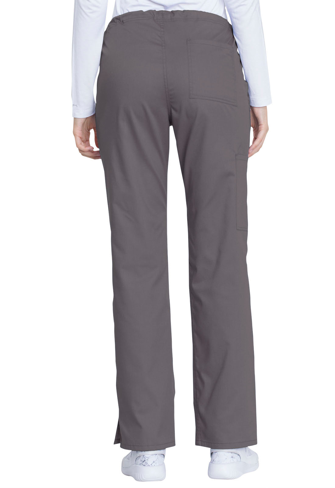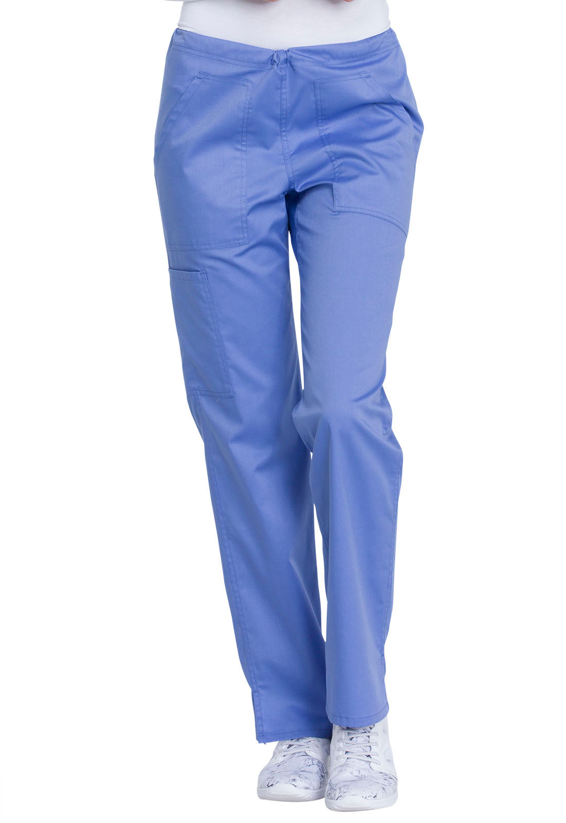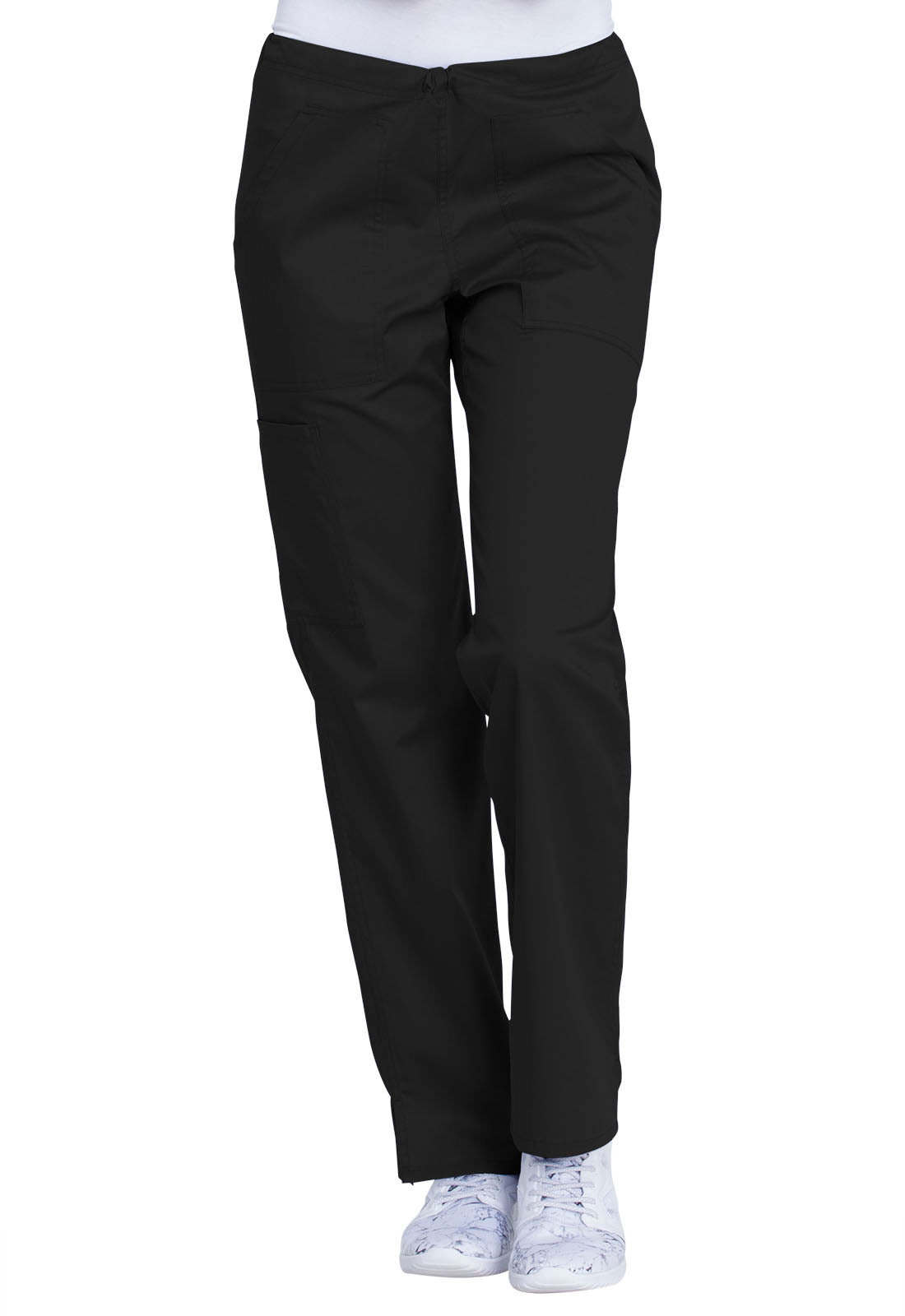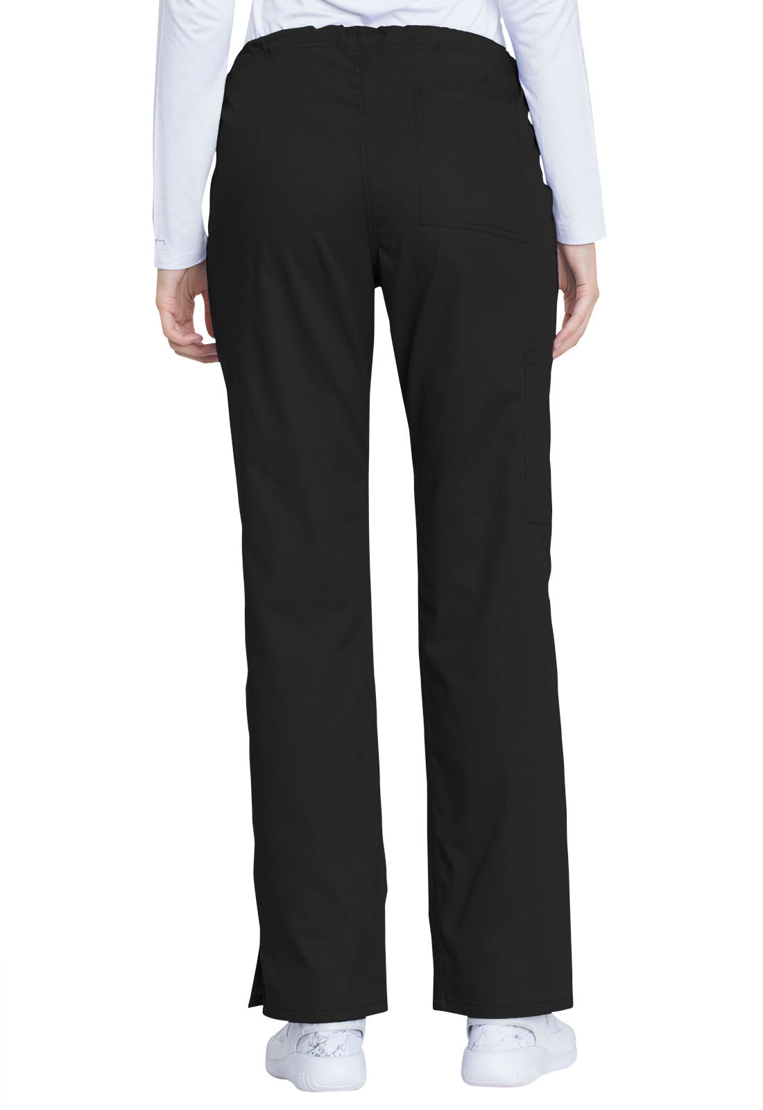 This comfortable mid-rise straight-leg pant features an inside drawstring and multiple pocket options, including front and back patch pockets and one side cargo pocket at the wearer's right. Side vents allow for greater ease of movement