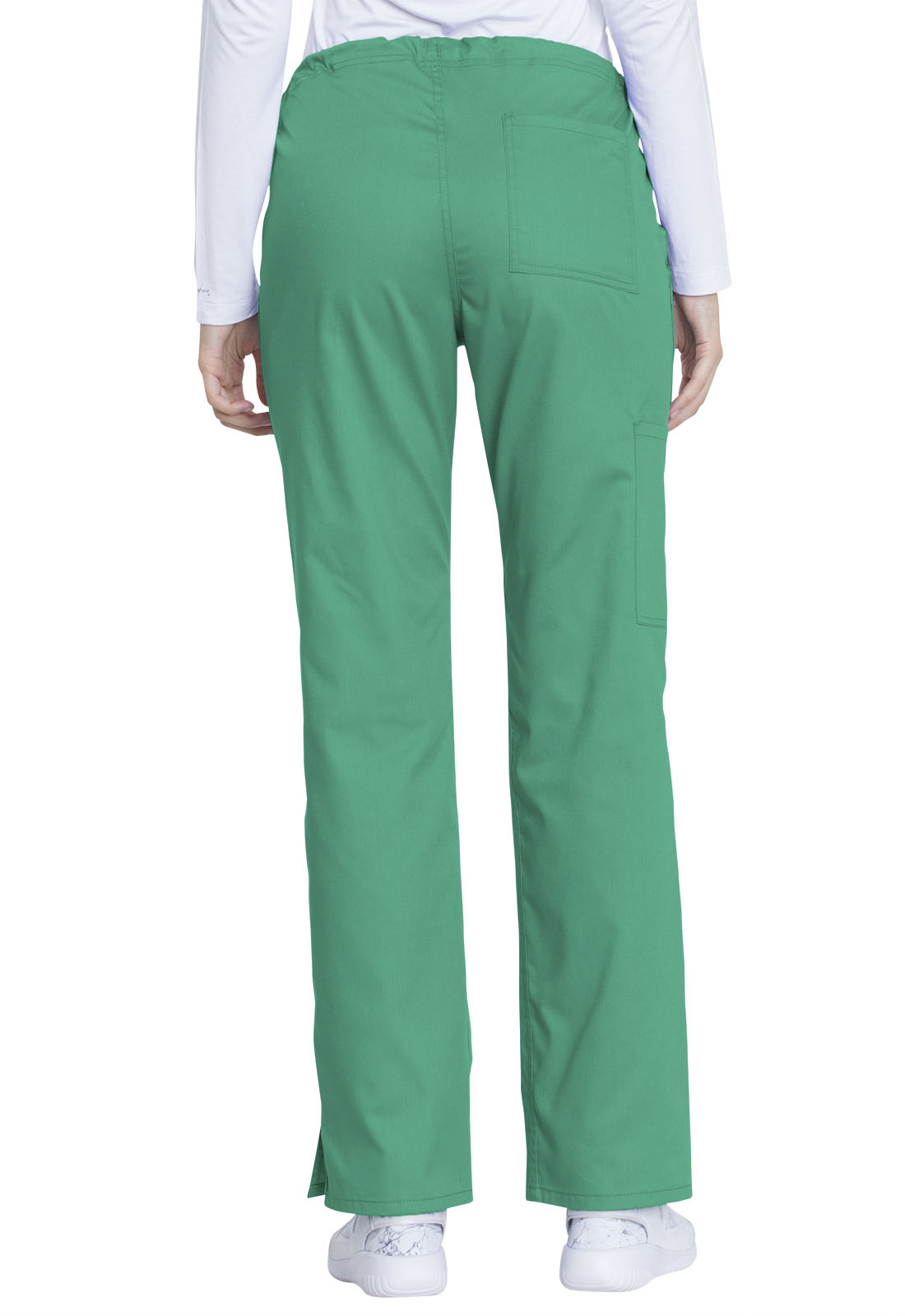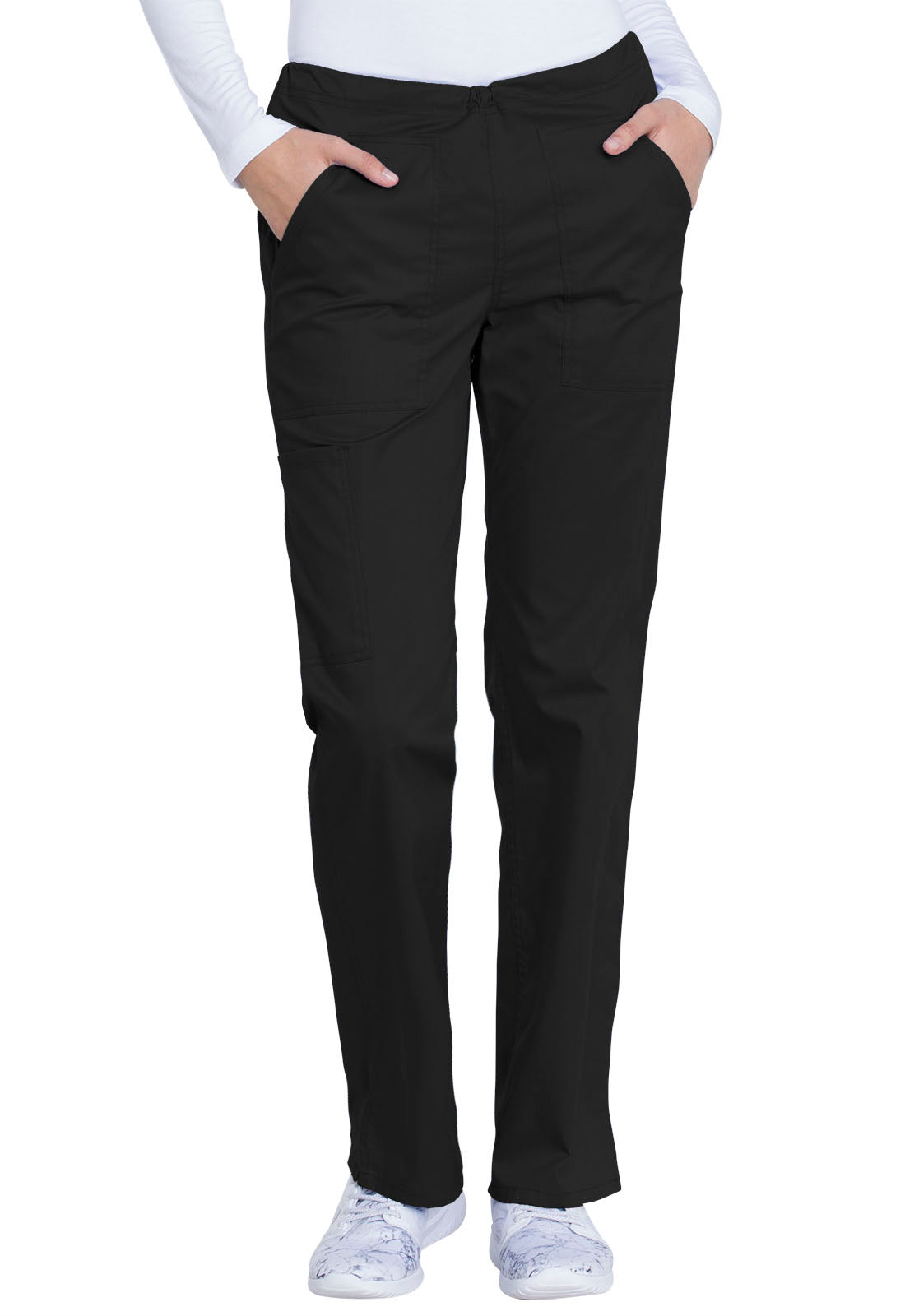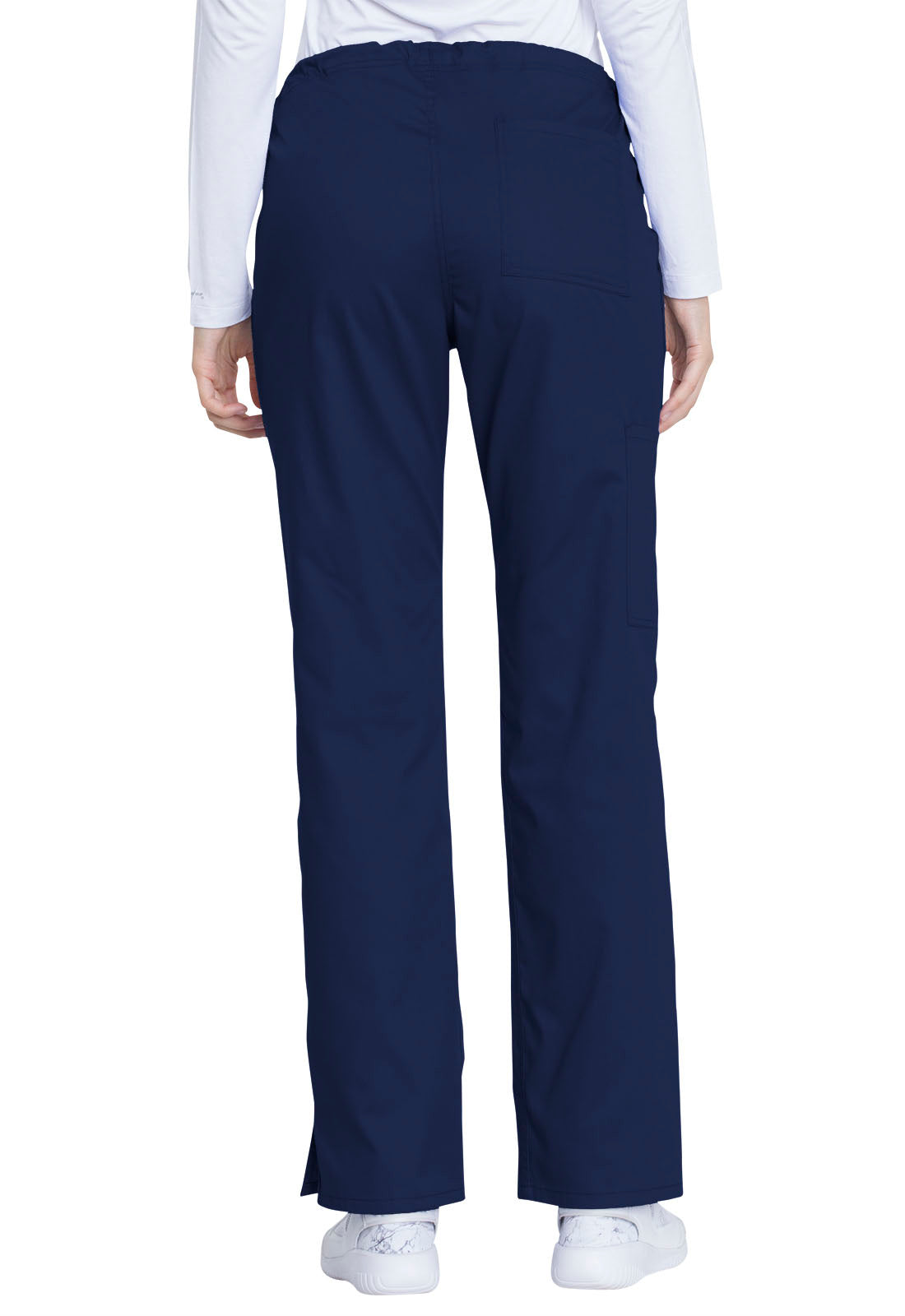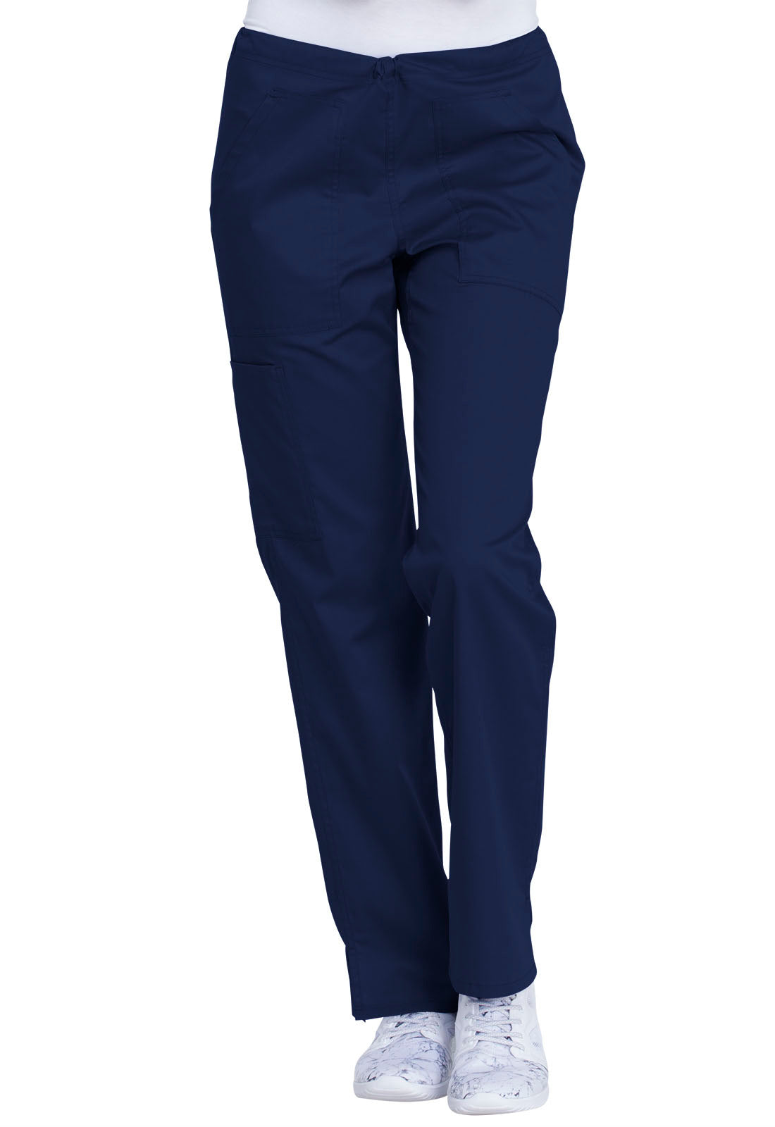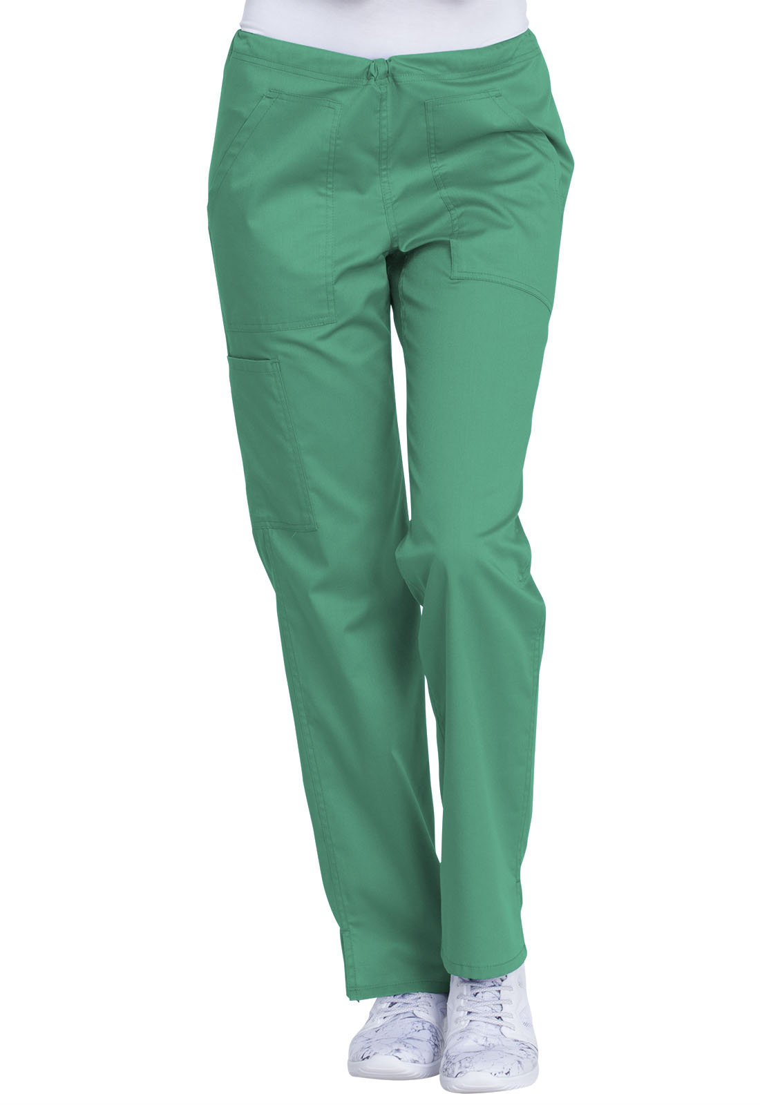 This comfortable mid-rise straight-leg pant features an inside drawstring and multiple pocket options, including front and back patch pockets and one side cargo pocket at the wearer's right. Side vents allow for greater ease of movement