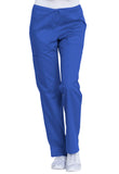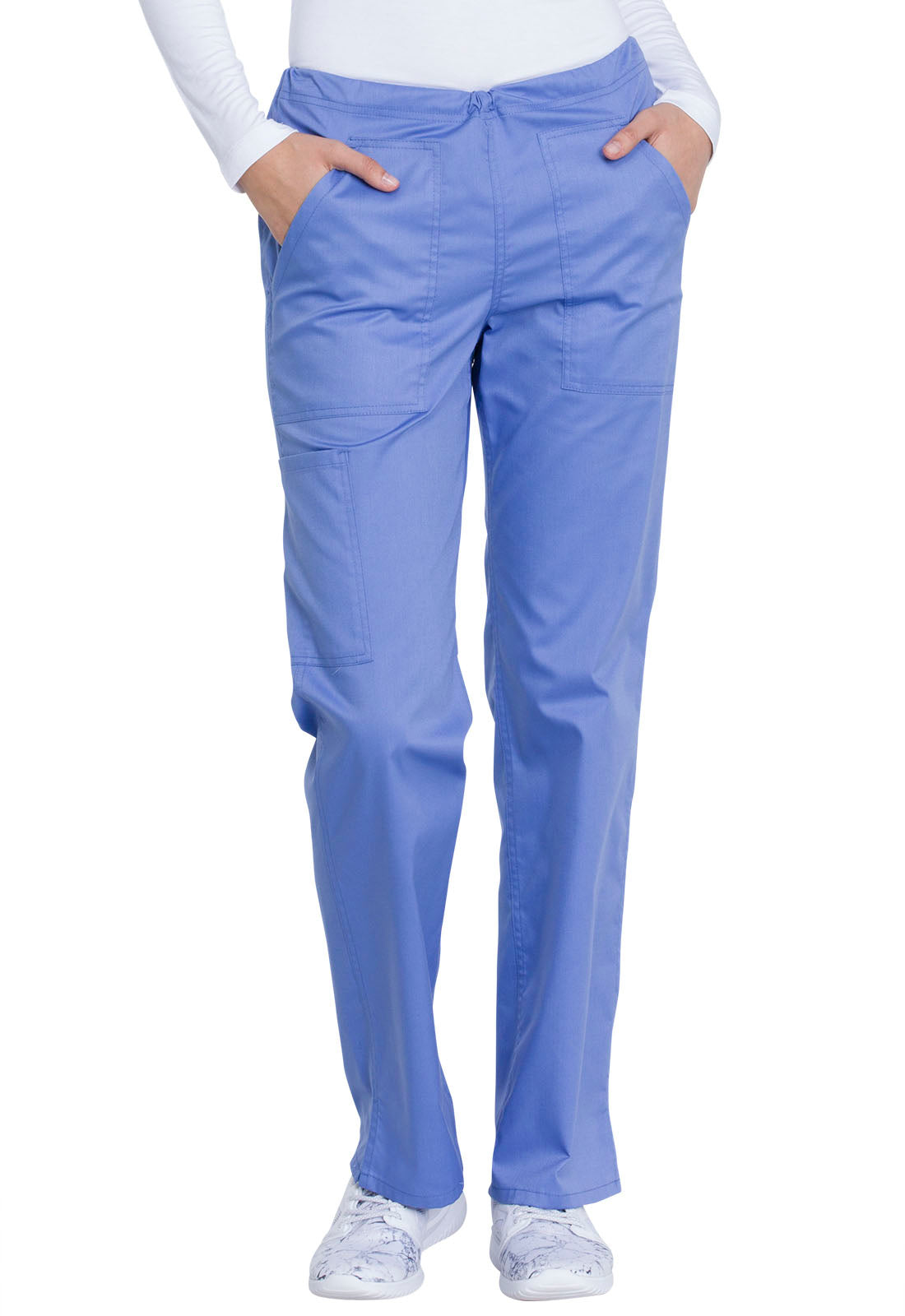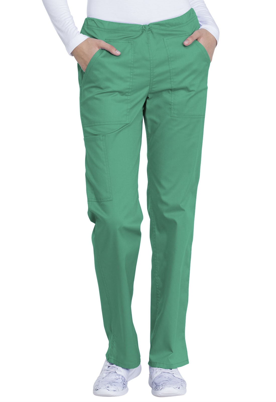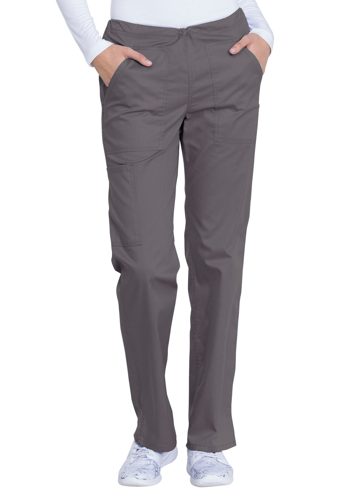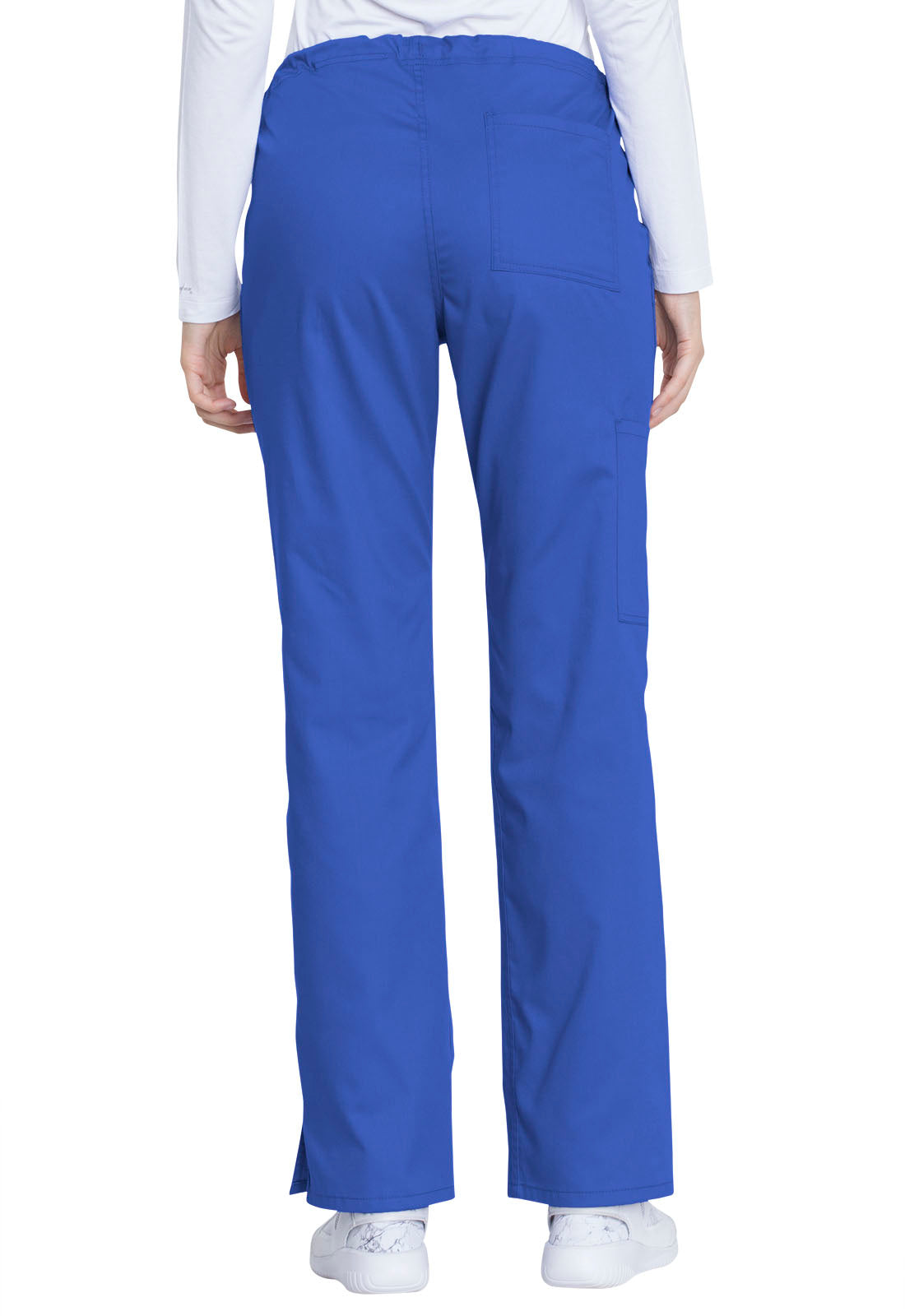 This comfortable mid-rise straight-leg pant features an inside drawstring and multiple pocket options, including front and back patch pockets and one side cargo pocket at the wearer's right. Side vents allow for greater ease of movement