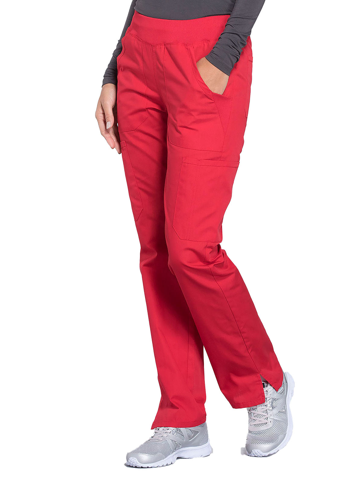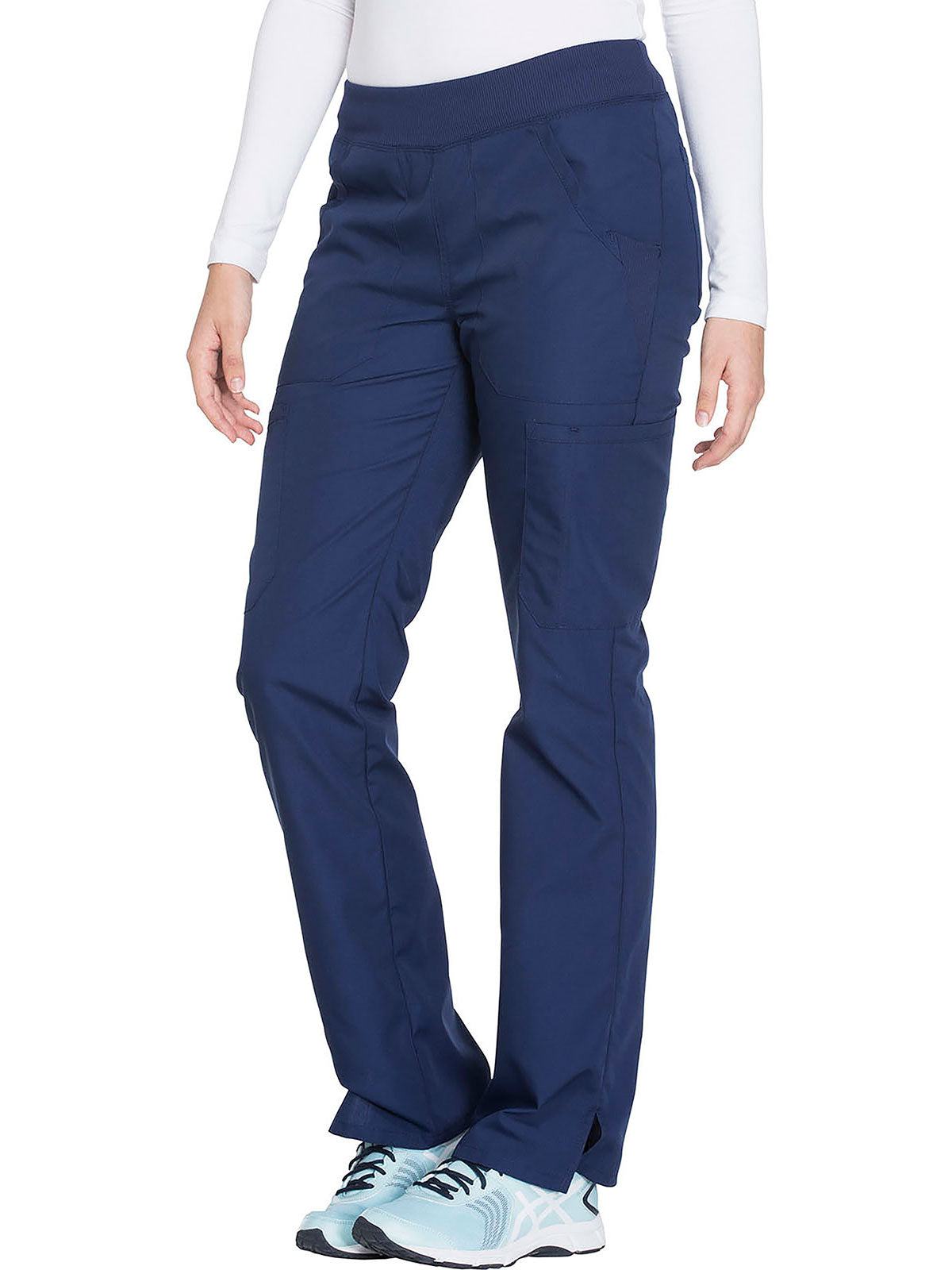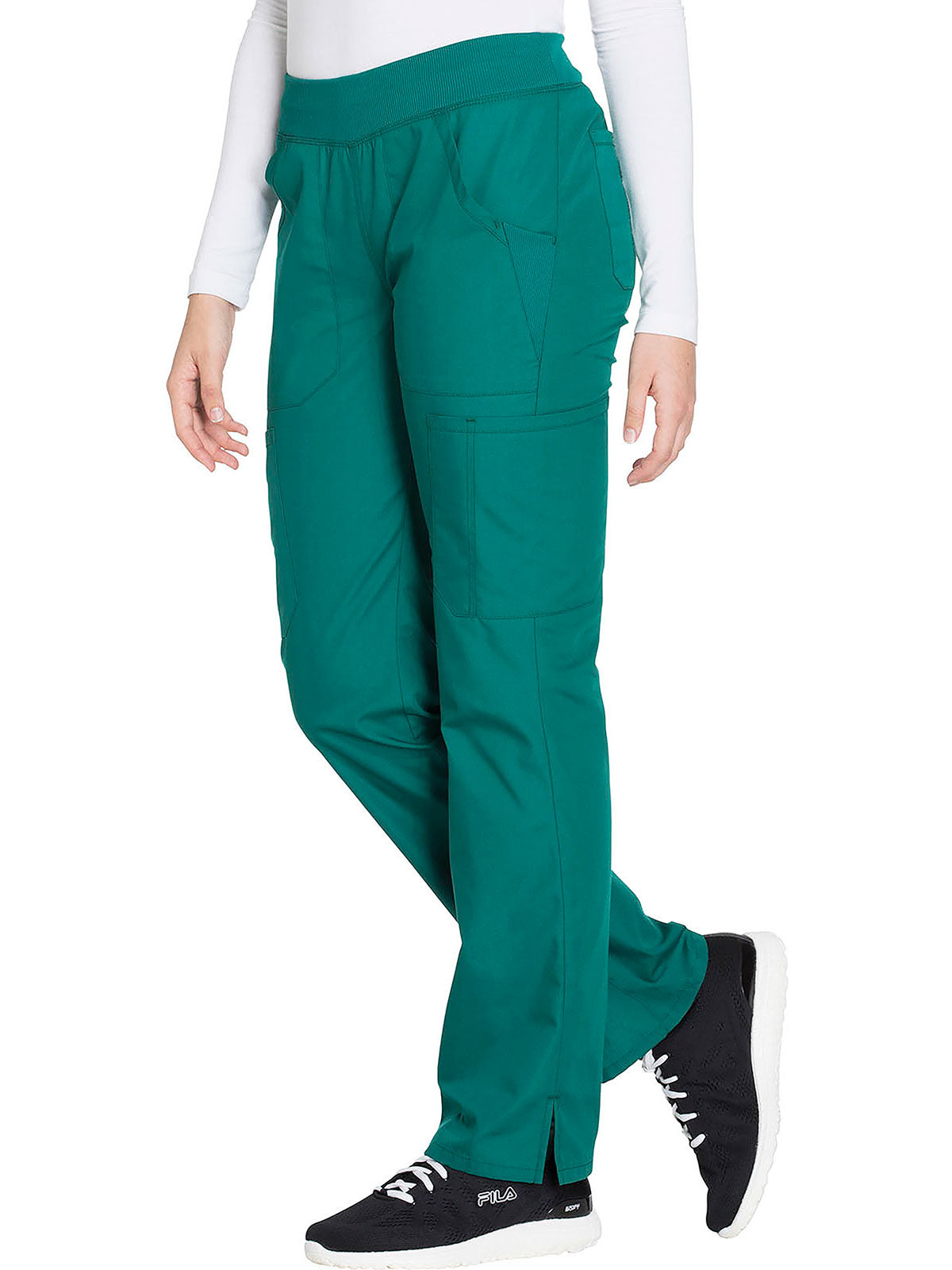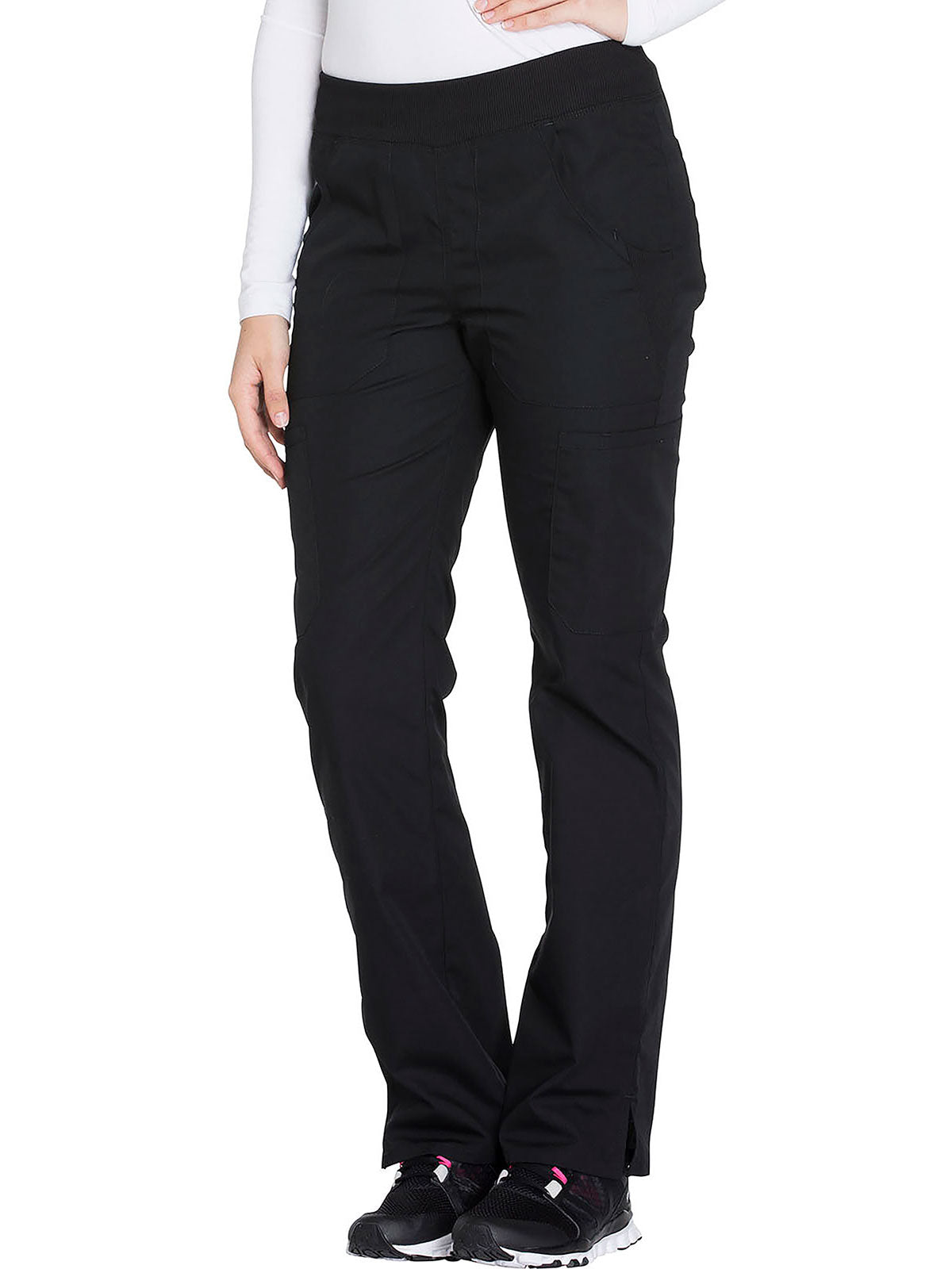 A Contemporary fit, mid rise, straight leg pant features a comfort-fit rib-knit waistband reinforced with inside elastic for extra support, and front patch pockets with rib-knit insets for expandability without sagging. Also featured are two cargo pockets, a pen slot, hidden instrument loop, back pockets and side vents. Inseam: 31”