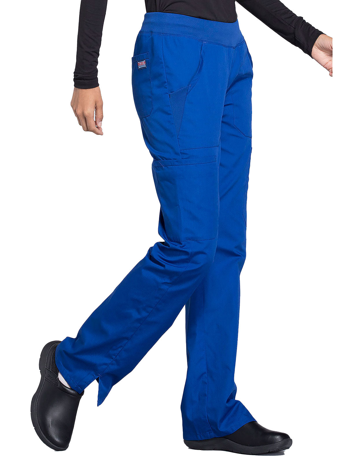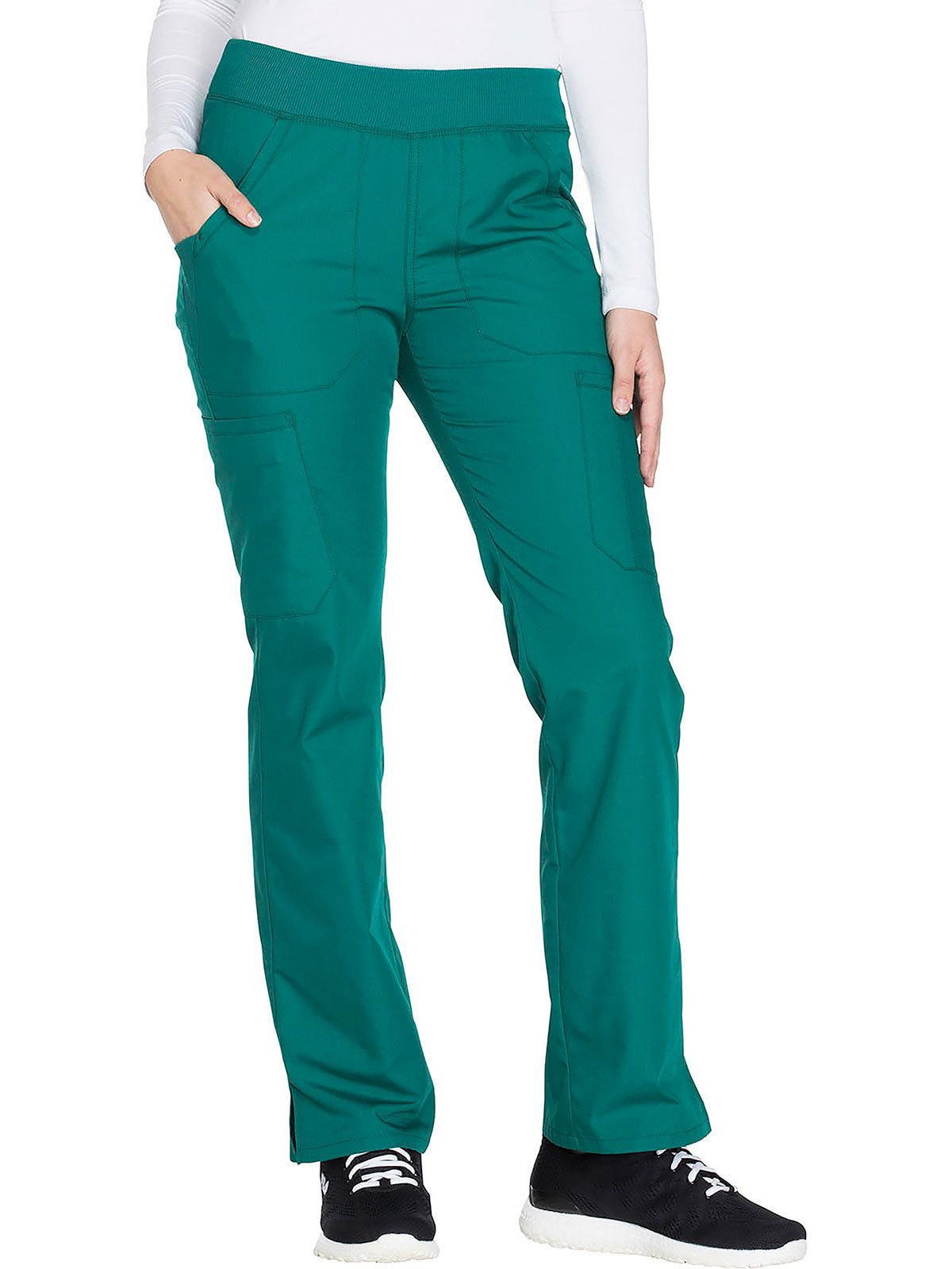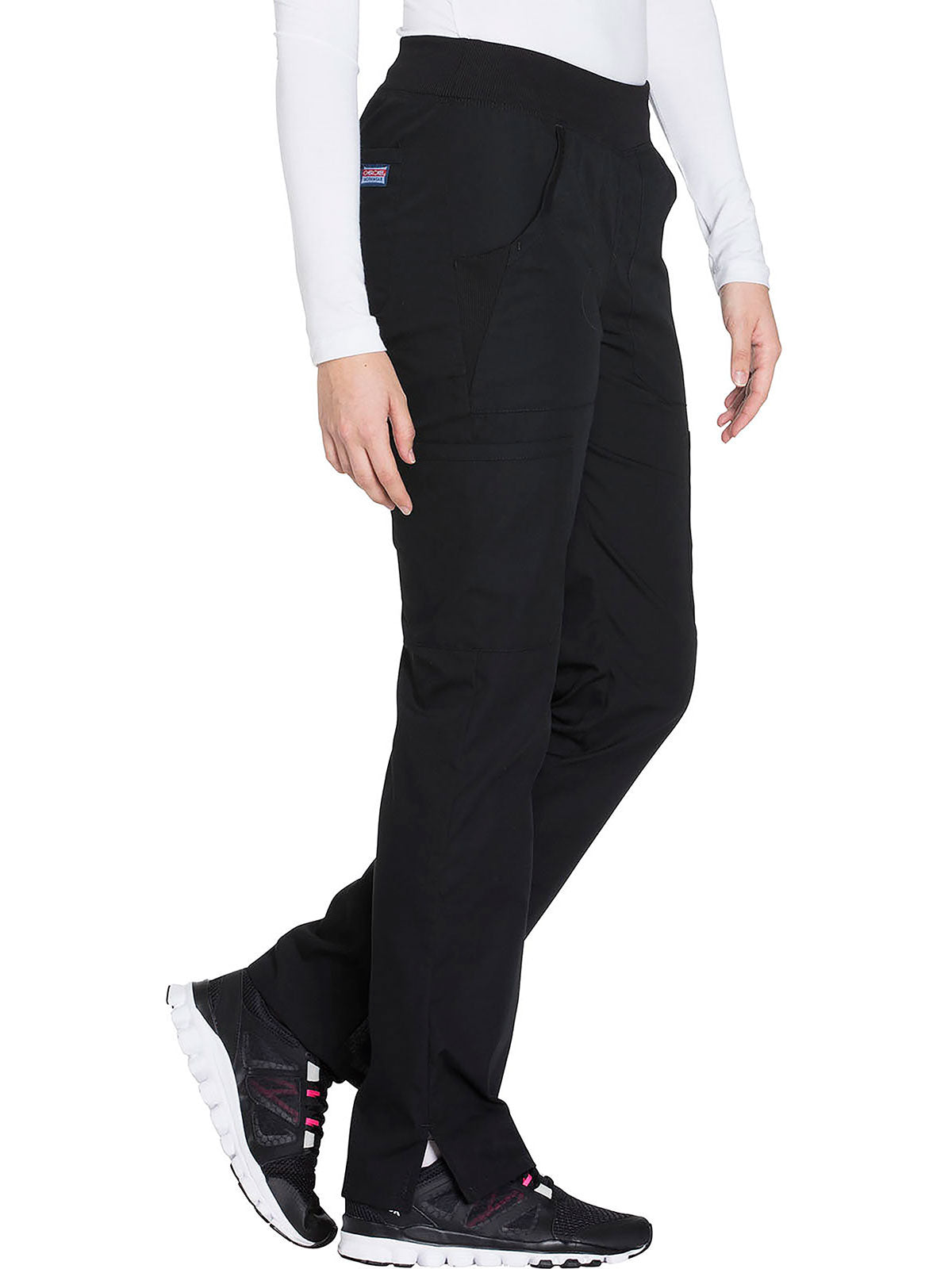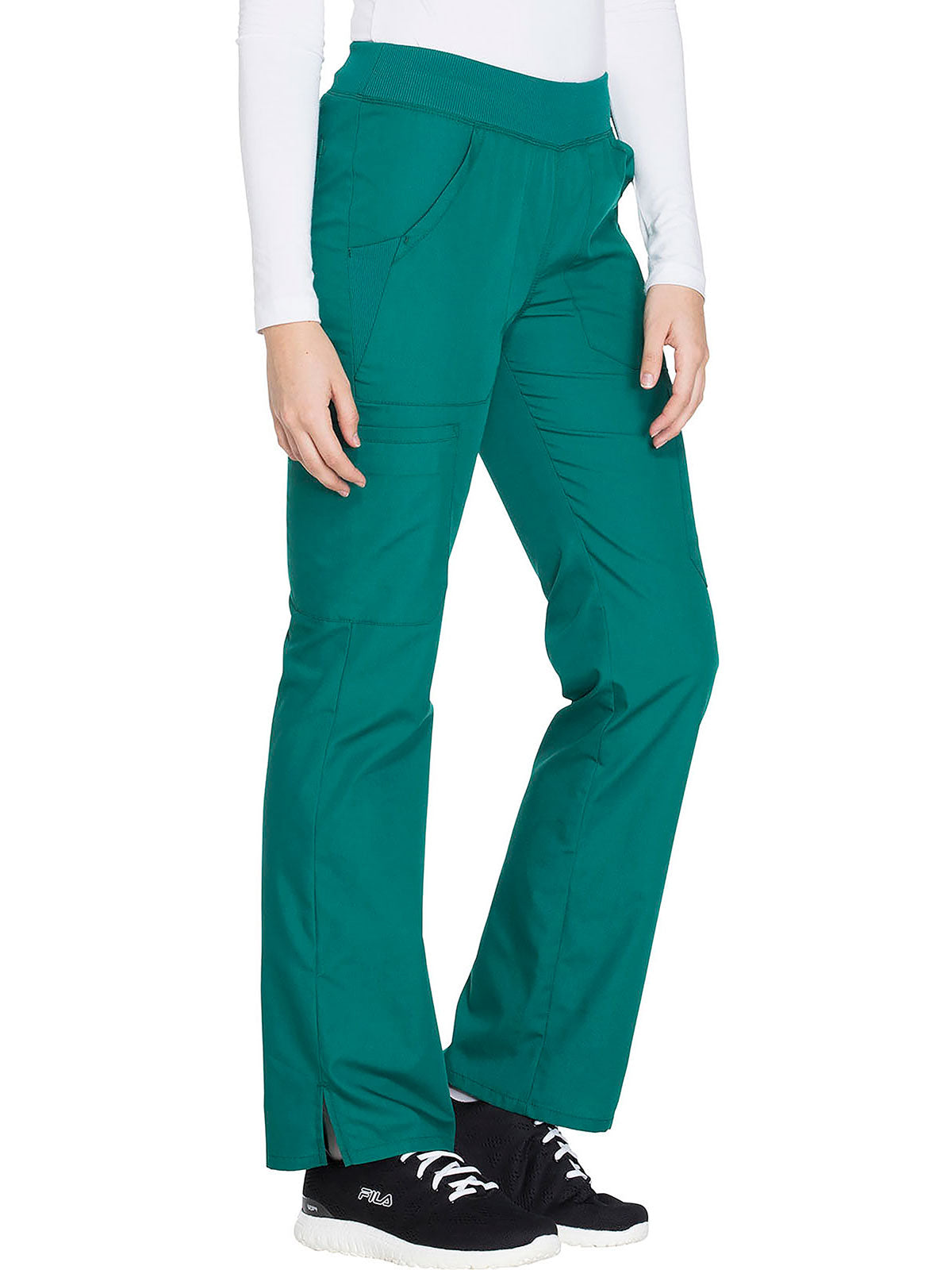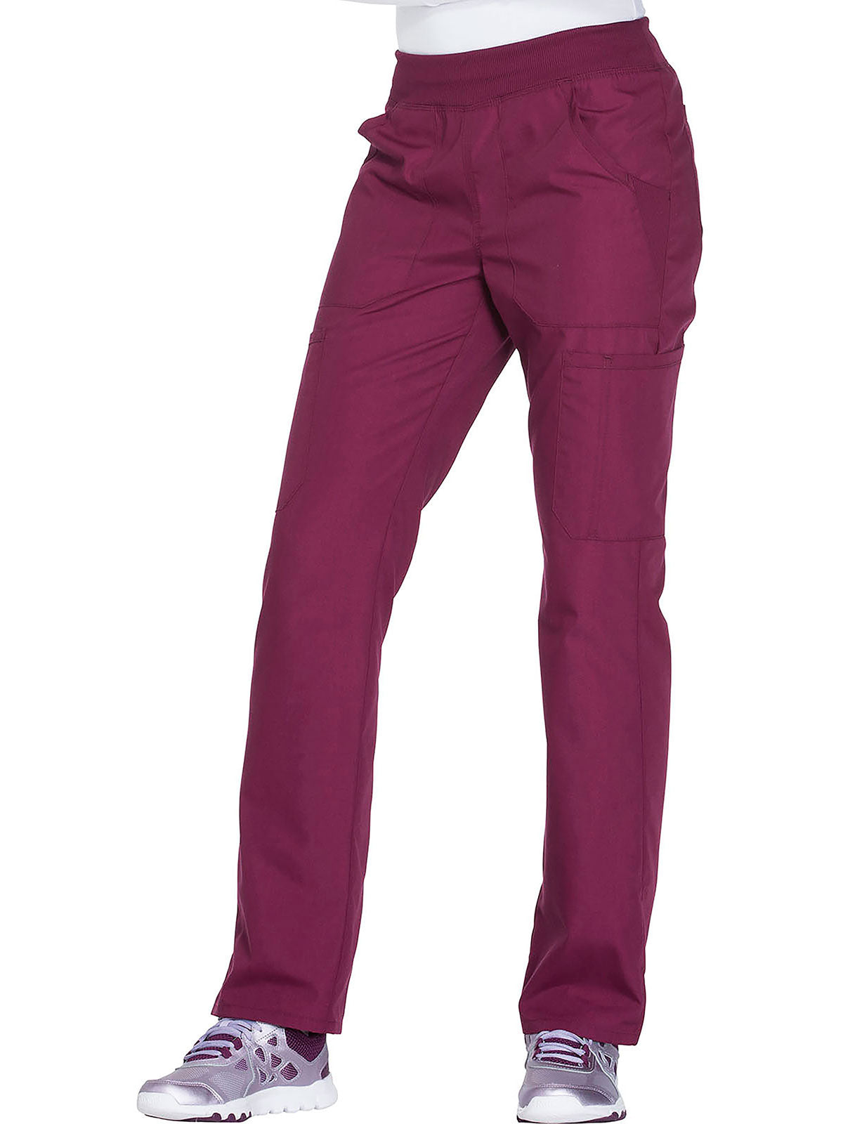A Contemporary fit, mid rise, straight leg pant features a comfort-fit rib-knit waistband reinforced with inside elastic for extra support, and front patch pockets with rib-knit insets for expandability without sagging. Also featured are two cargo pockets, a pen slot, hidden instrument loop, back pockets and side vents. Inseam: 31”